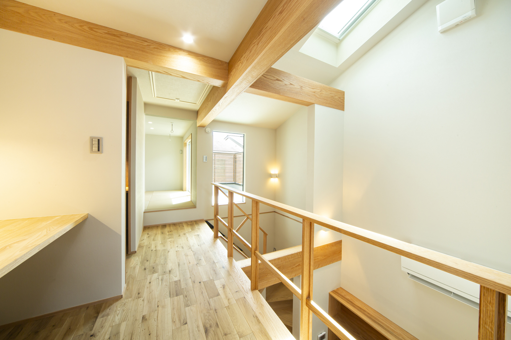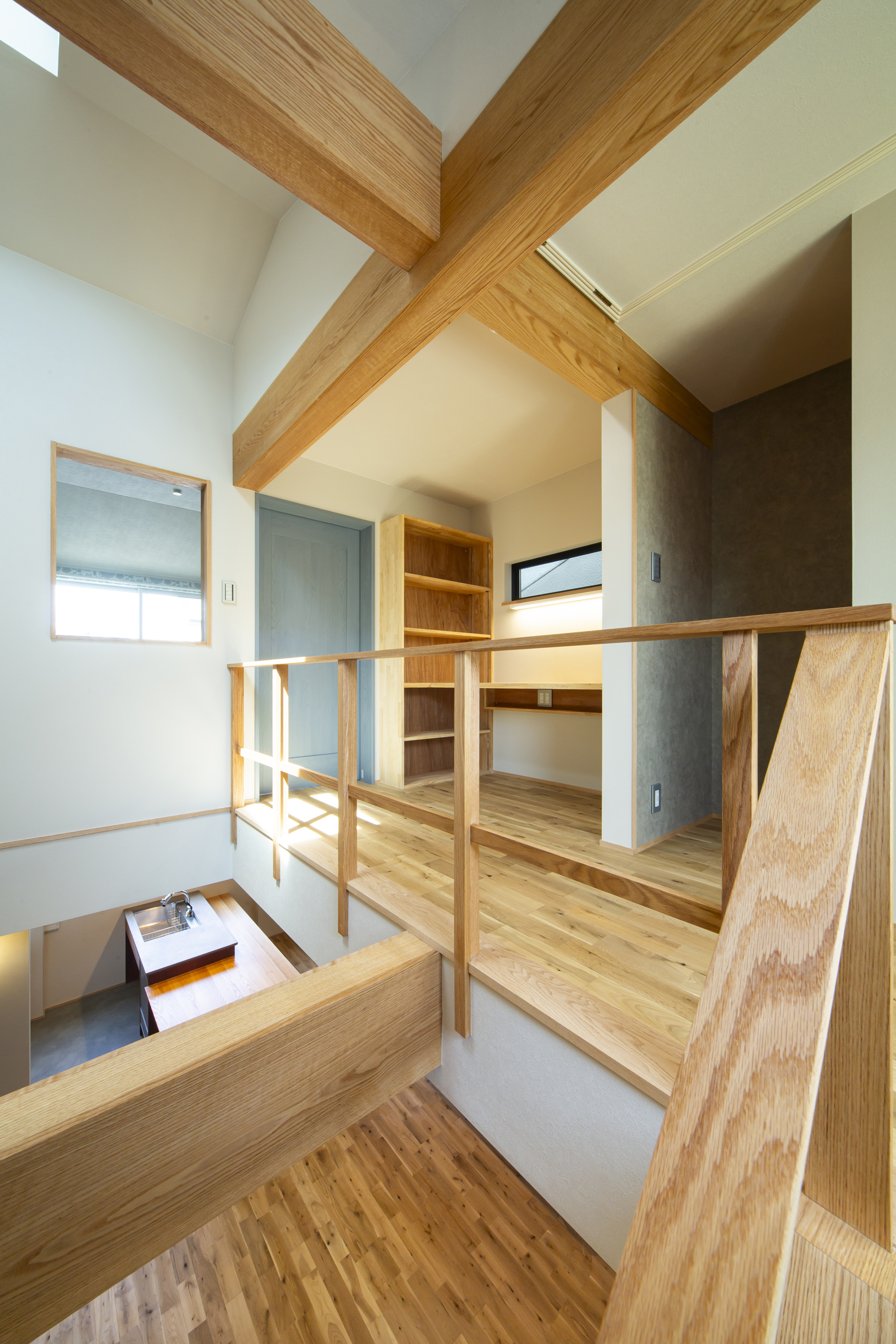 手摺壁ひとつとって見ても、木の温もりと空間の繋がりと陽の光を遮らない計算と工夫が散りばめられています。
