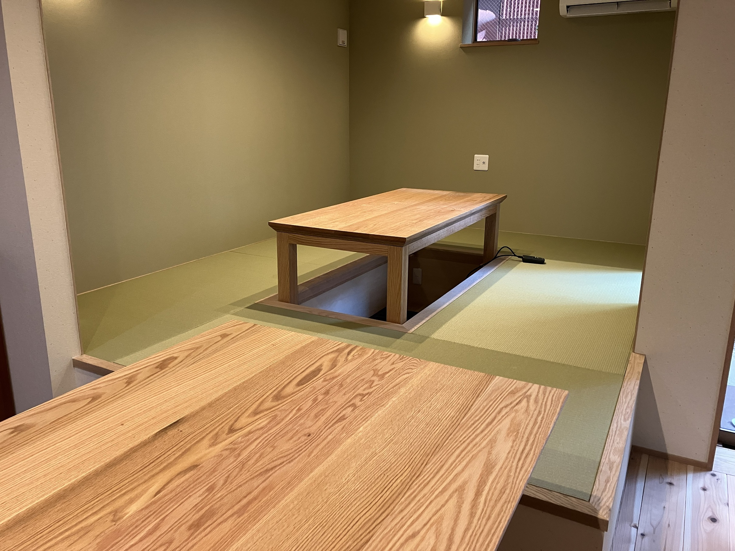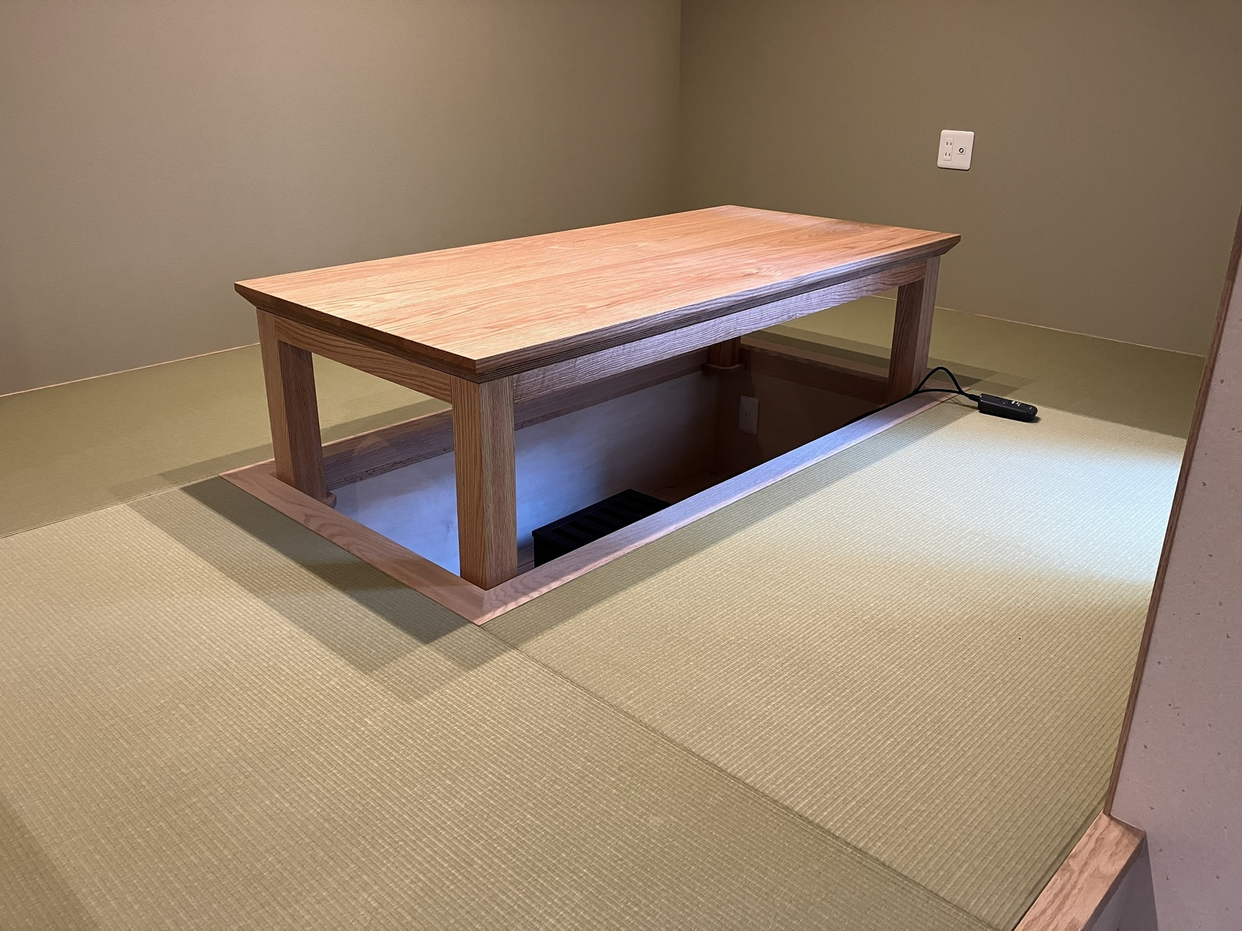 掘りごたつとダイニングテーブルは、ともに美しい木目のオーク材で製作。