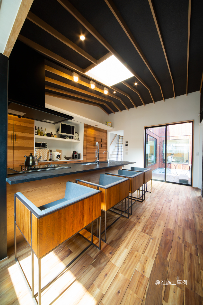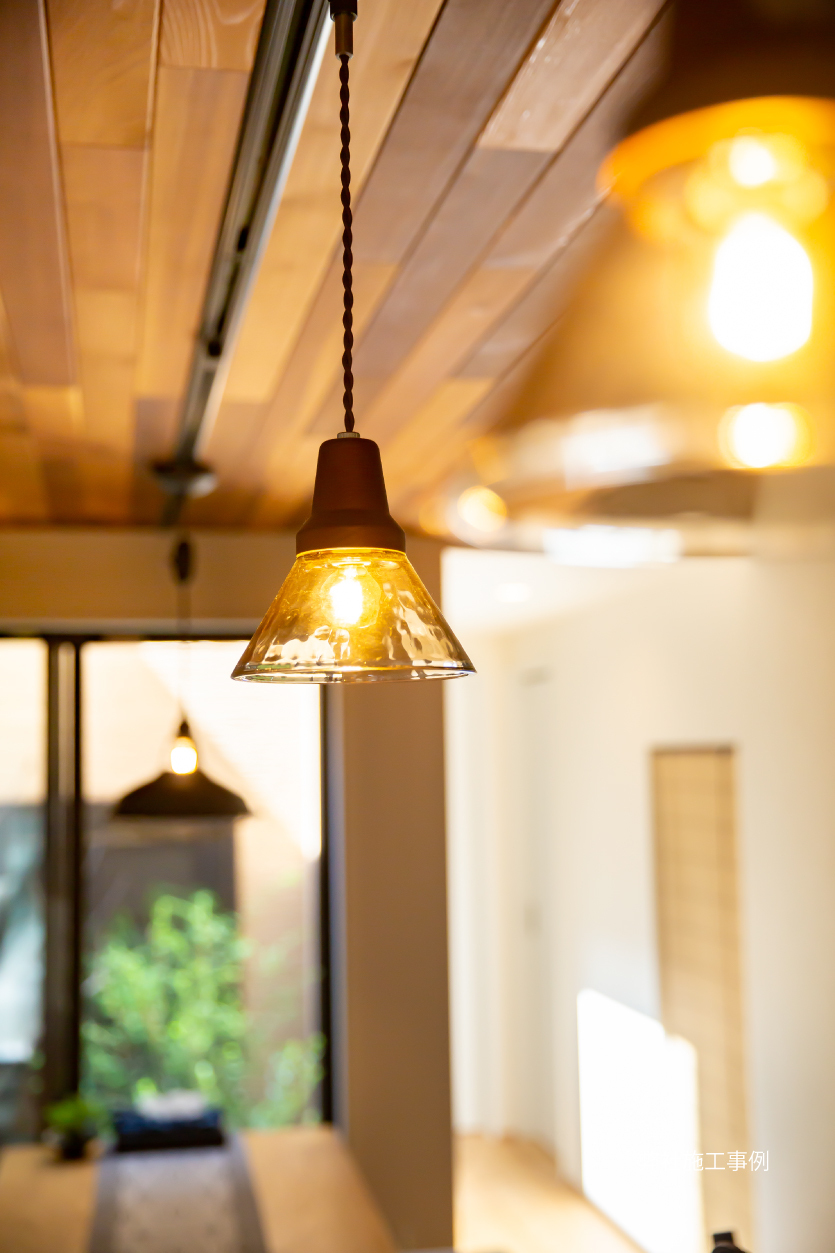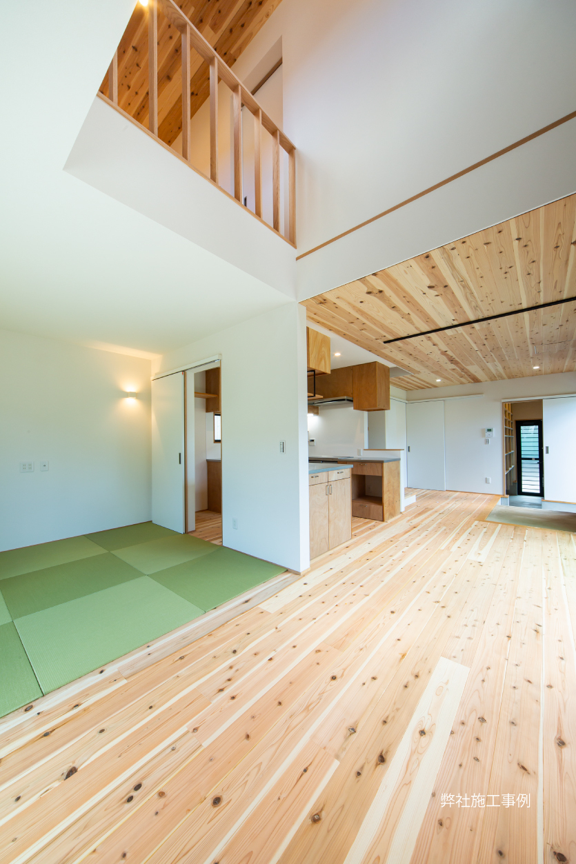 リビング部分は1部平屋となっており、屋根形状を活かした解放感ある勾配天井は見どころです。