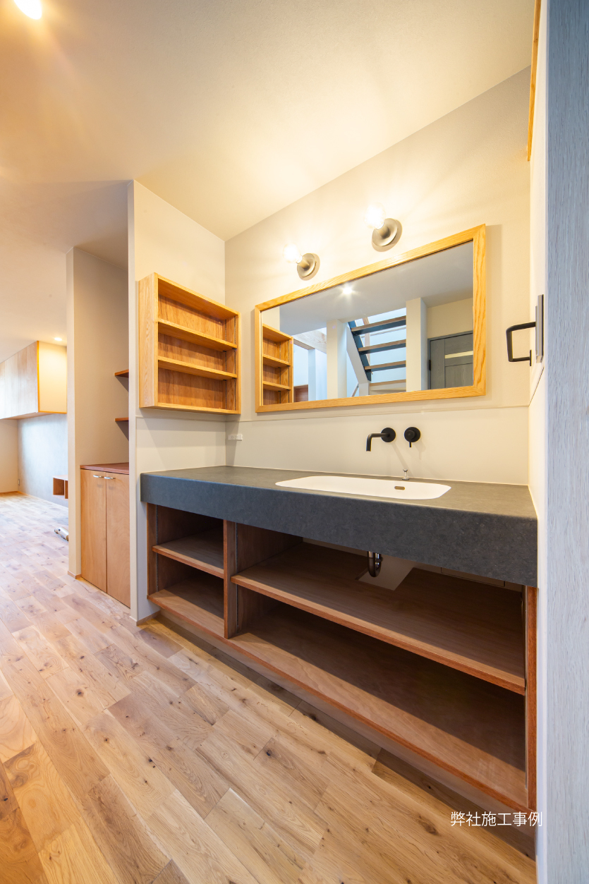 鉄骨のスリット階段のある玄関ホールや、家事や身支度のし易い回遊動線のある間取り。