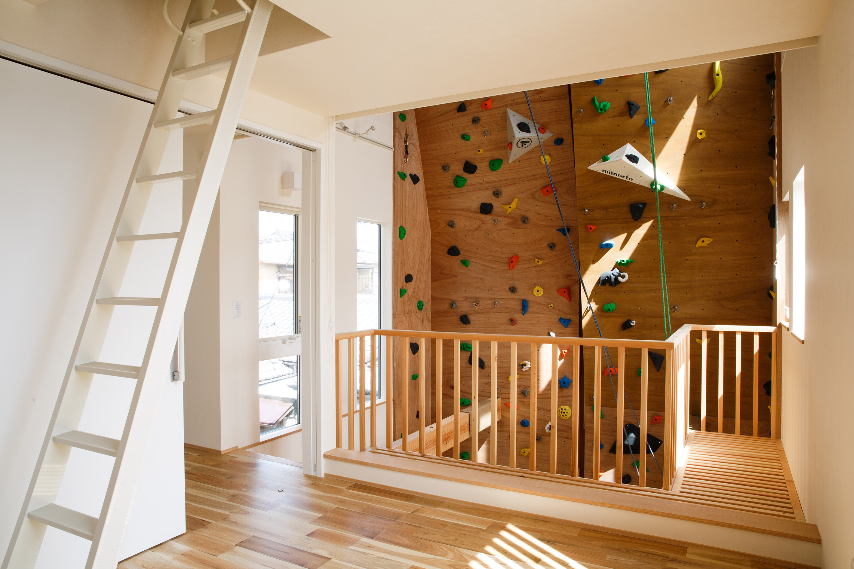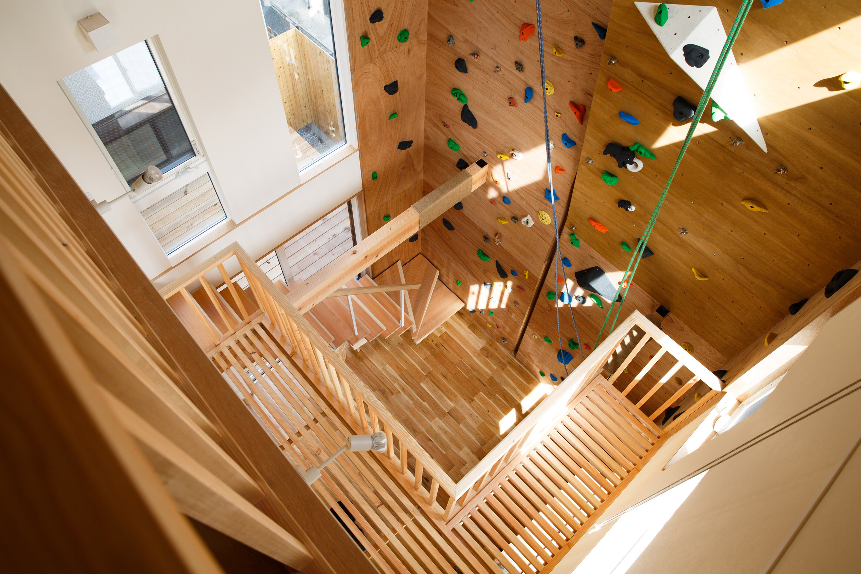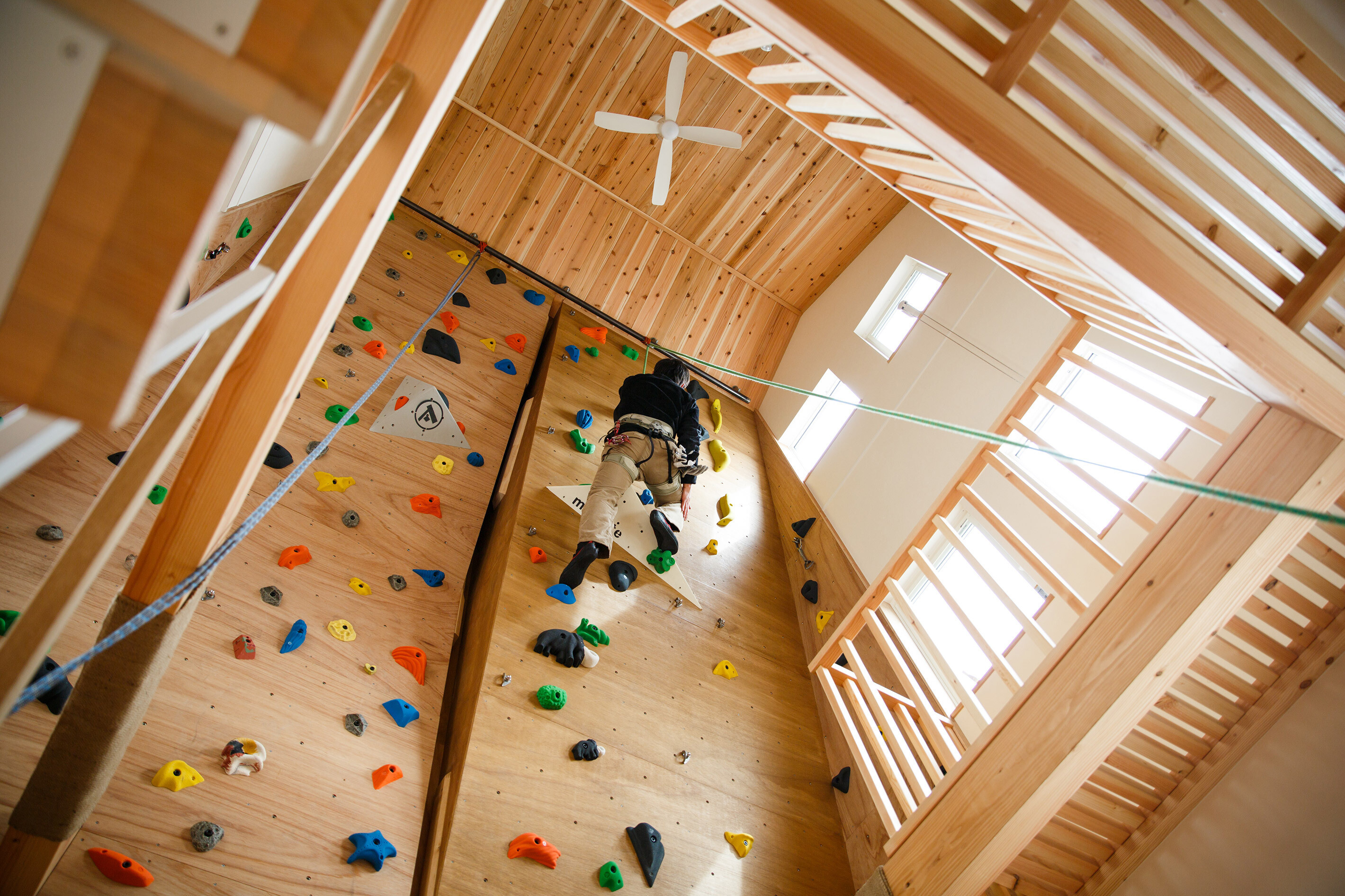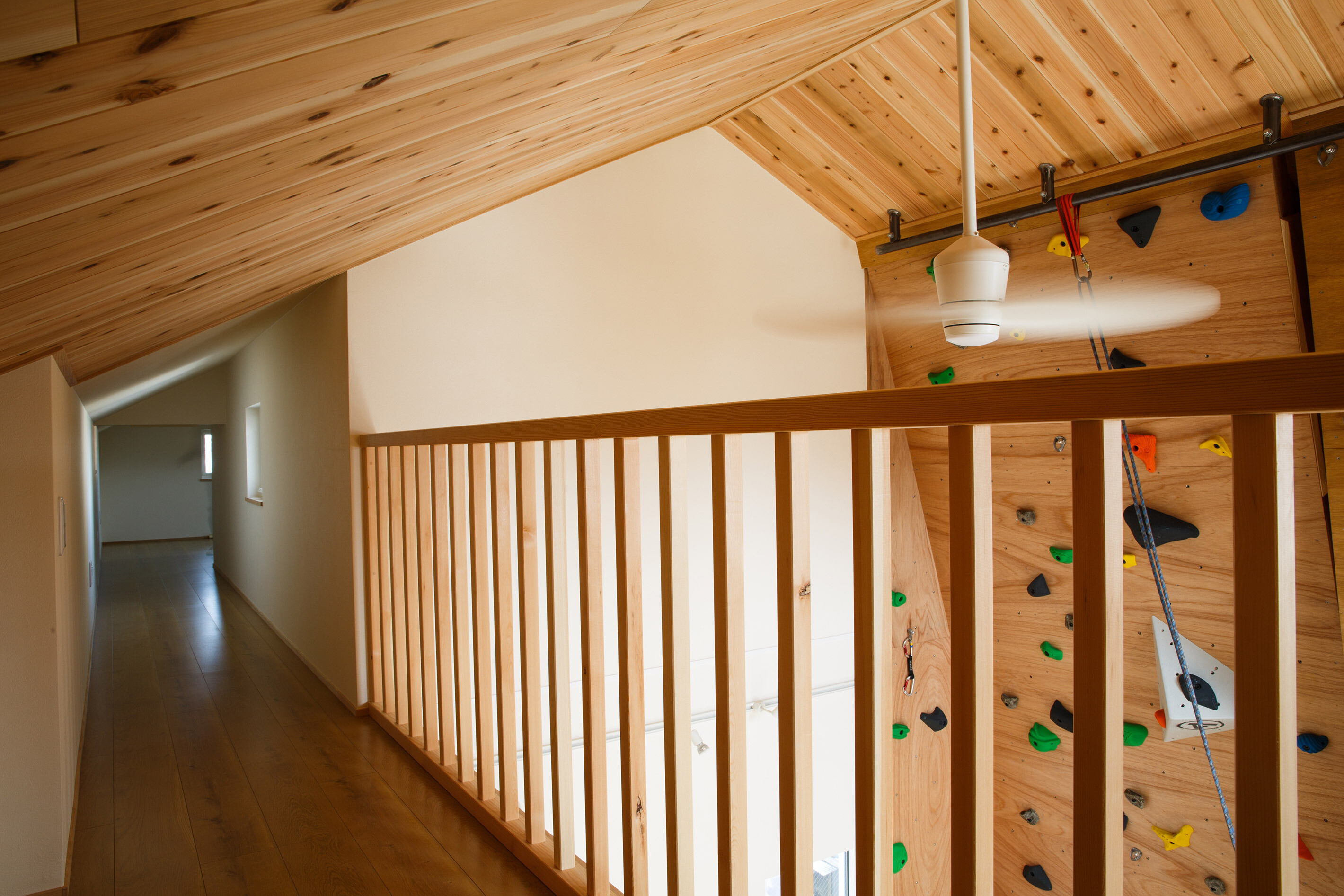 山登りをライフワークにされているご夫婦。お家でも趣味を楽しめる空間づくりをテーマに設計。市内でも指折りの高さのウォールには手を突っ張りながら登るクラックも設け、ペレットストーブや中庭など人の集まる空間に仕上げました。