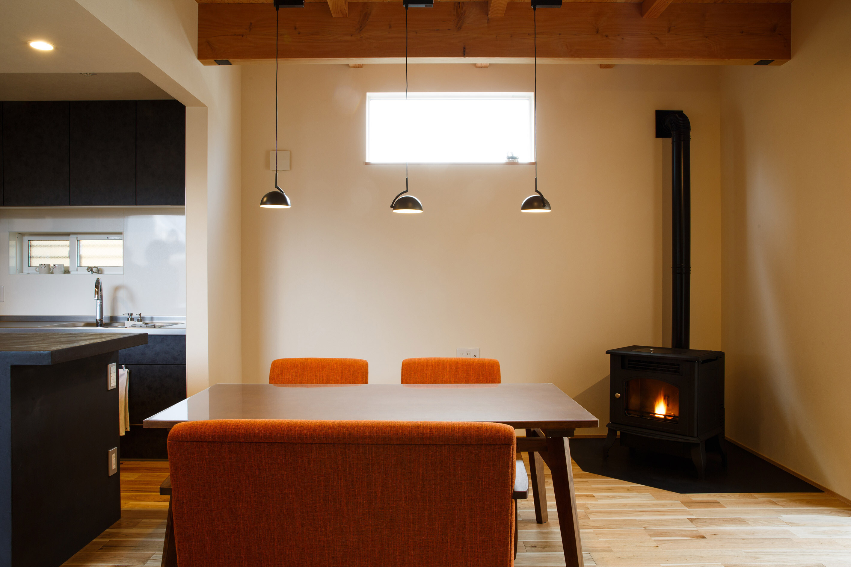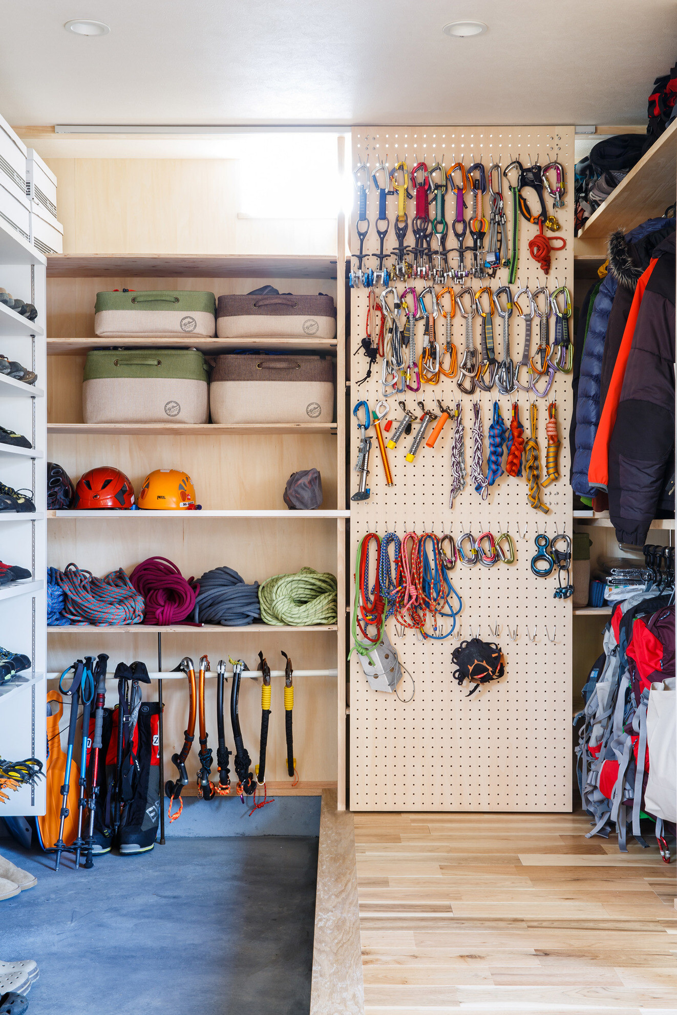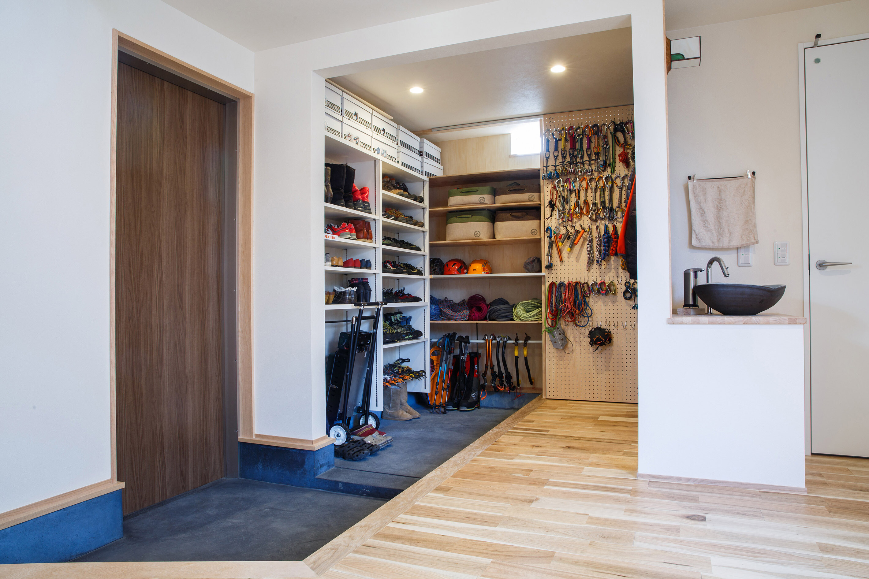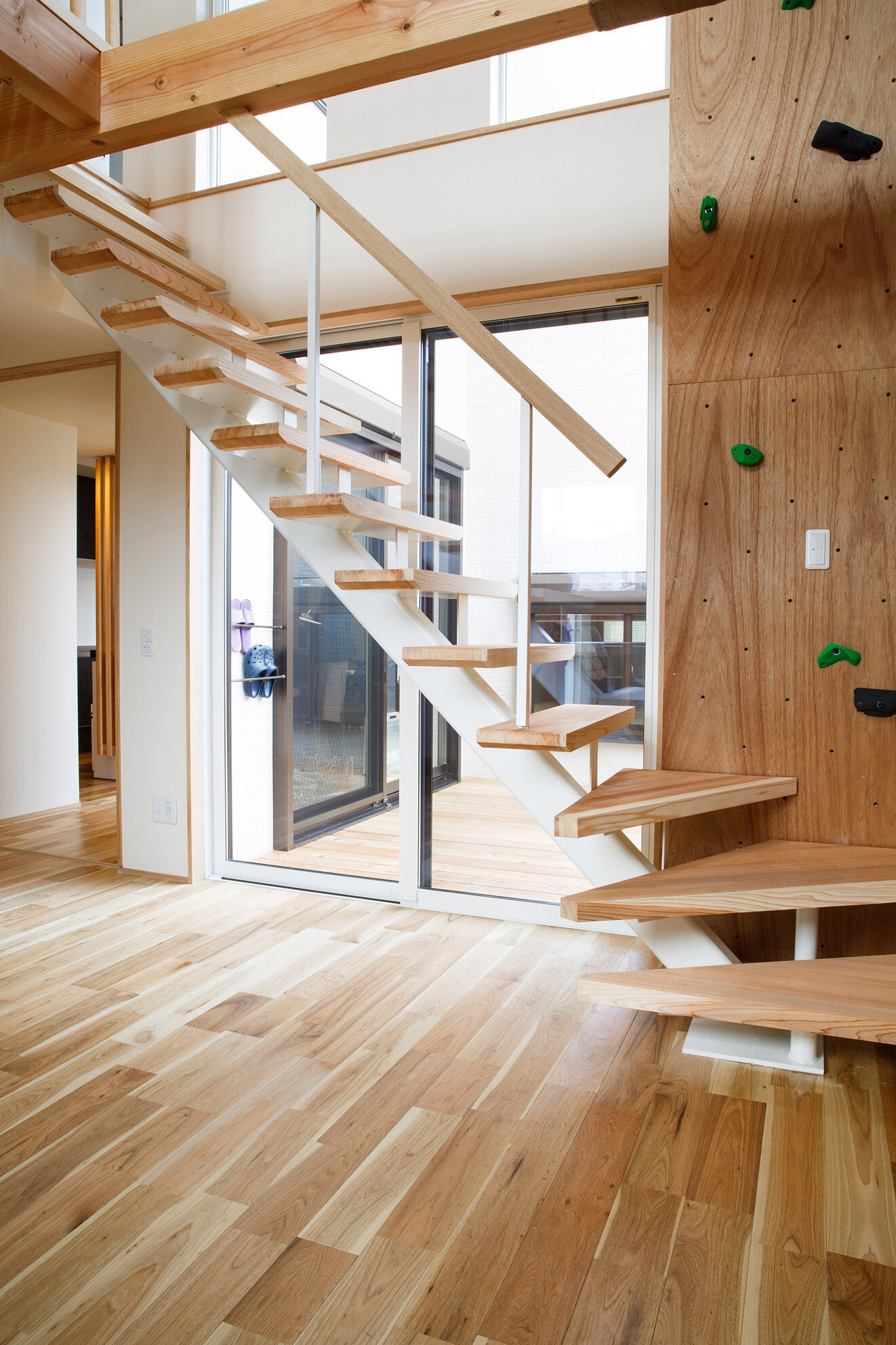 山登りをライフワークにされているご夫婦。お家でも趣味を楽しめる空間づくりをテーマに設計。市内でも指折りの高さのウォールには手を突っ張りながら登るクラックも設け、ペレットストーブや中庭など人の集まる空間に仕上げました。