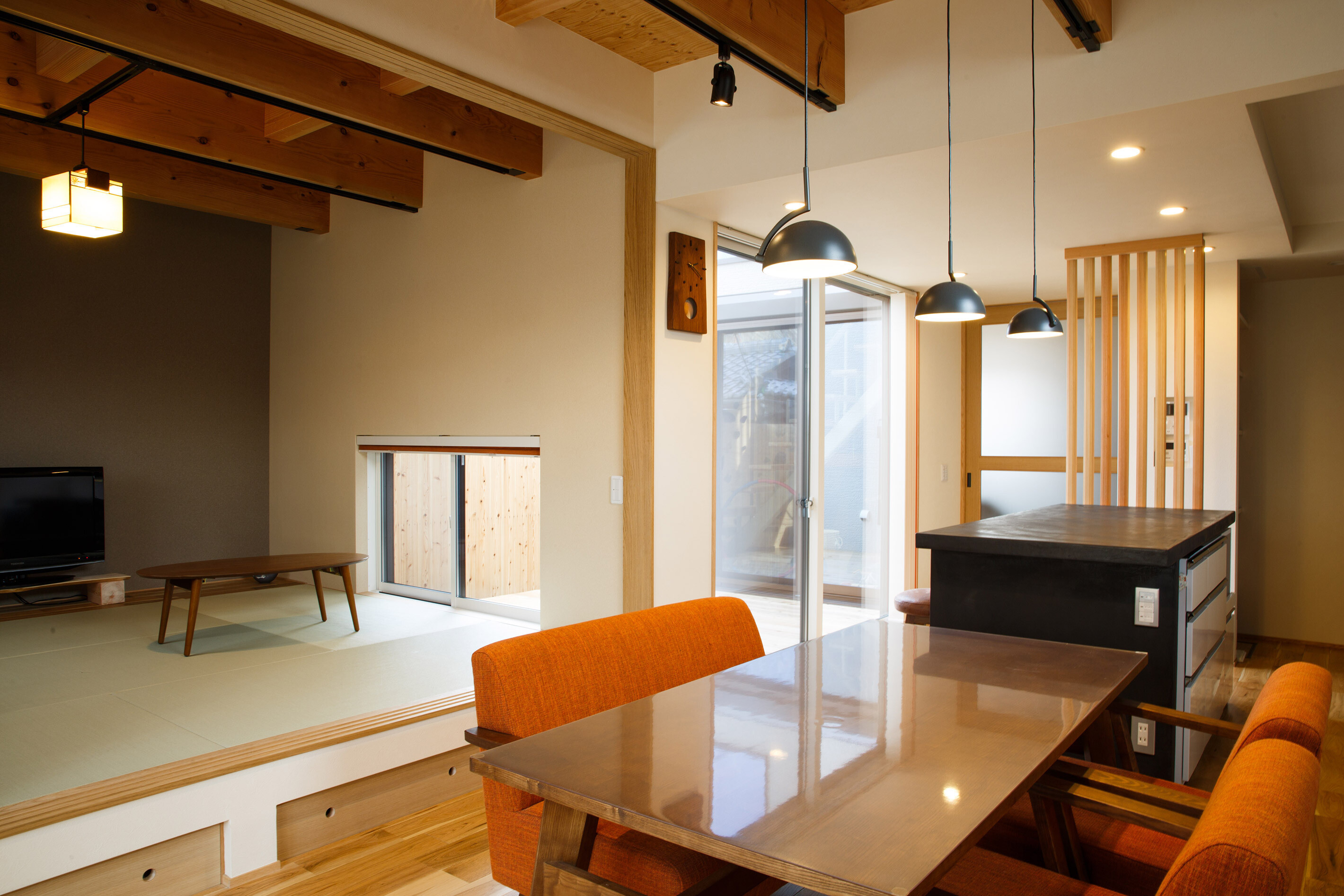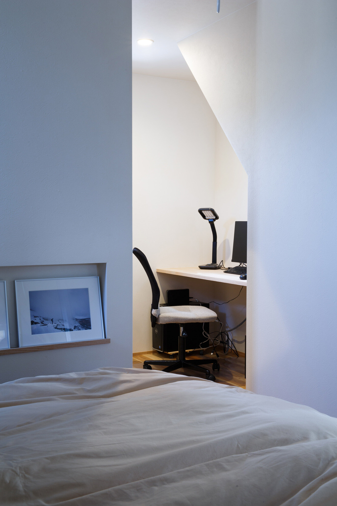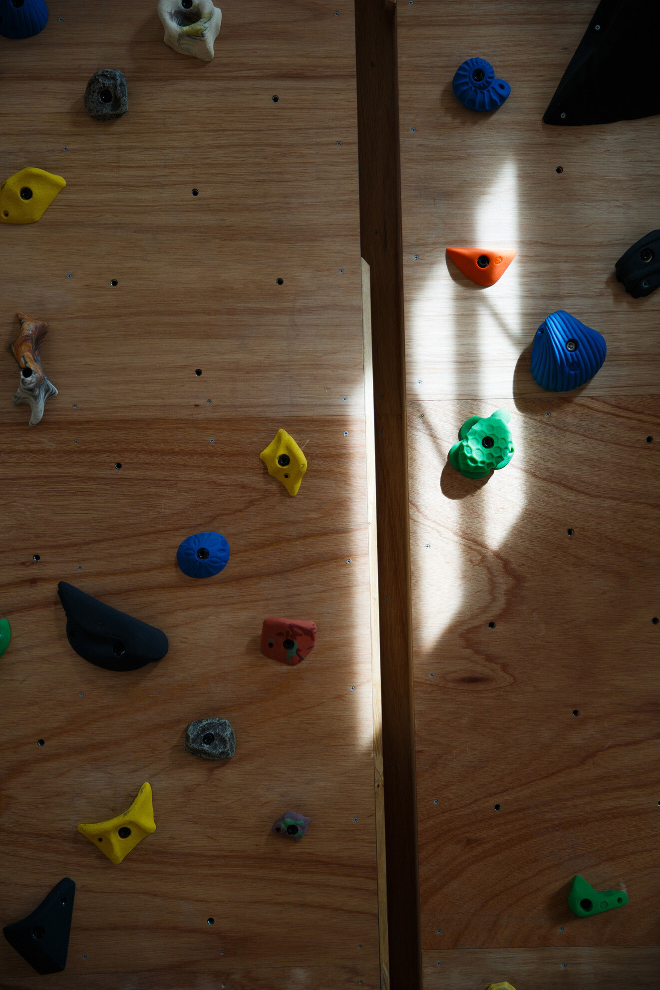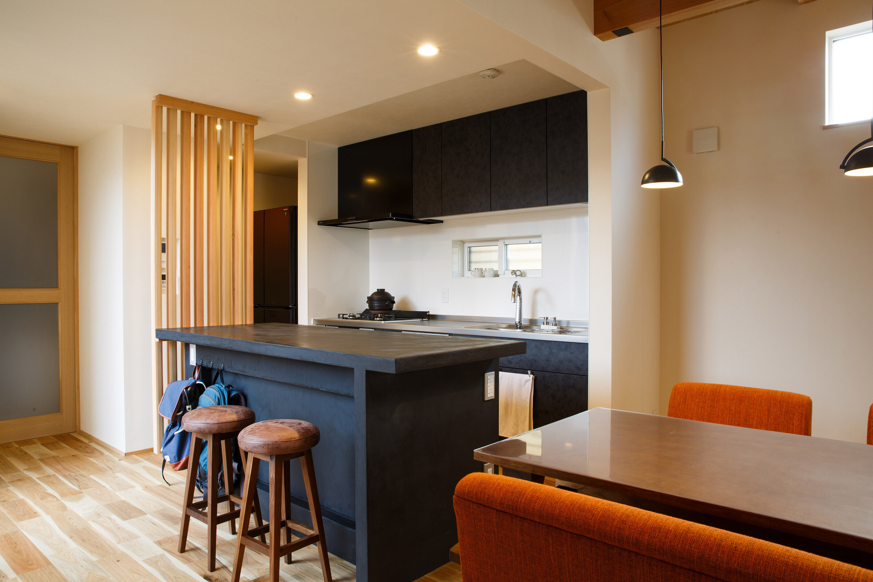 山登りをライフワークにされているご夫婦。お家でも趣味を楽しめる空間づくりをテーマに設計。市内でも指折りの高さのウォールには手を突っ張りながら登るクラックも設け、ペレットストーブや中庭など人の集まる空間に仕上げました。
