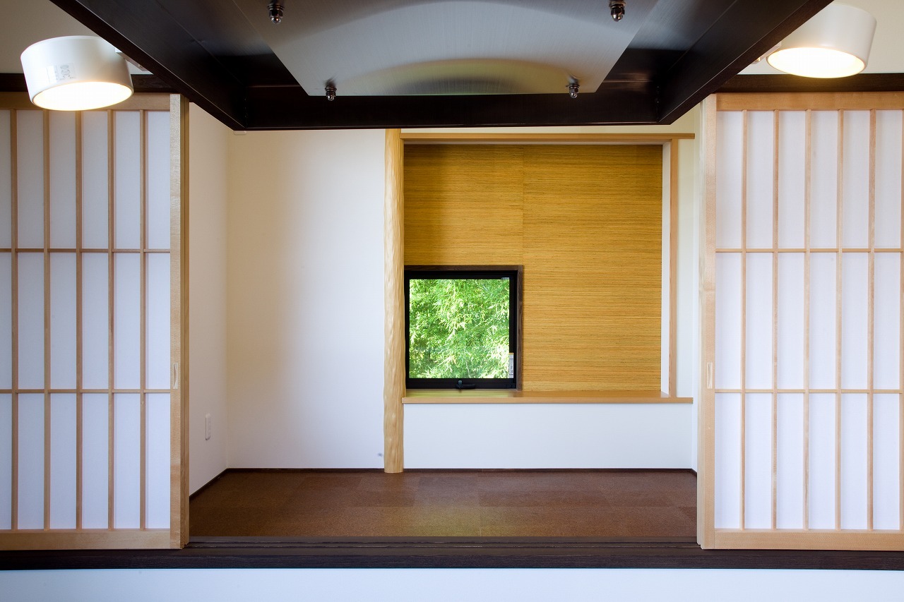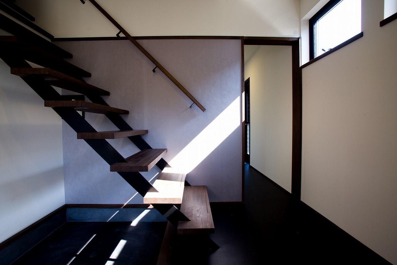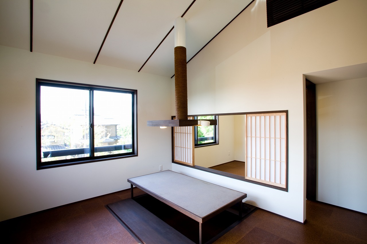 緑多く閑静な地域に建つモダンな和風住宅、屋根は瓦と板金を併用して軒を深くとりつつ軽やかに仕上げました。内装は鉄、木、和紙、コルクなど天然素材とソリッドな素材を融和させて凛とした上質な空間に仕上げています。空間構成はスキップフロアーで各階を繋ぎ、どこにいても視線の変化が楽しめます。