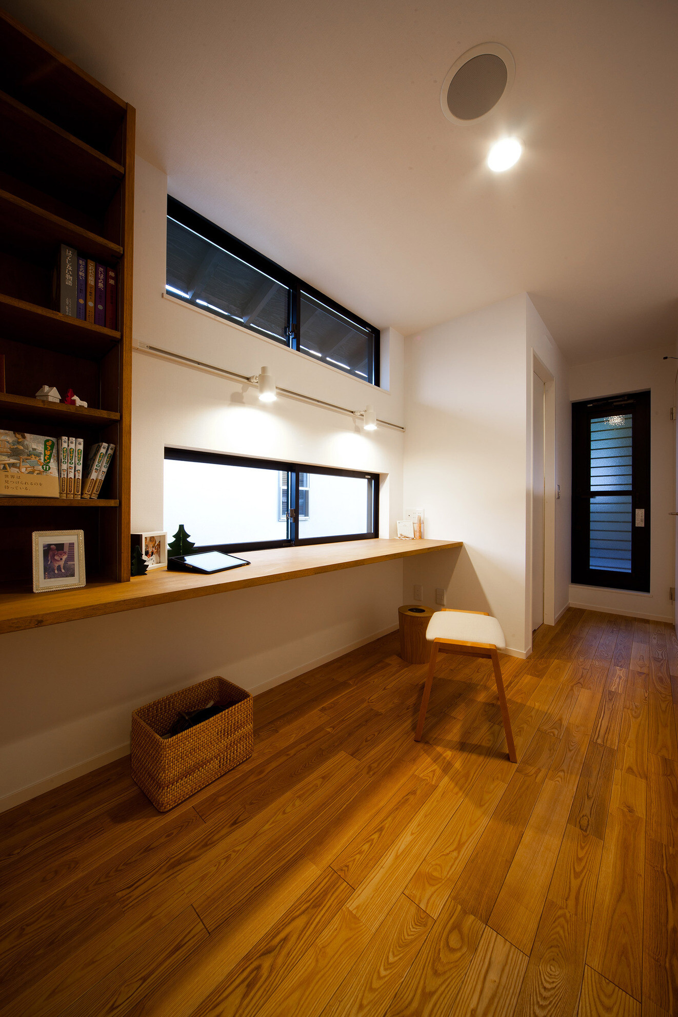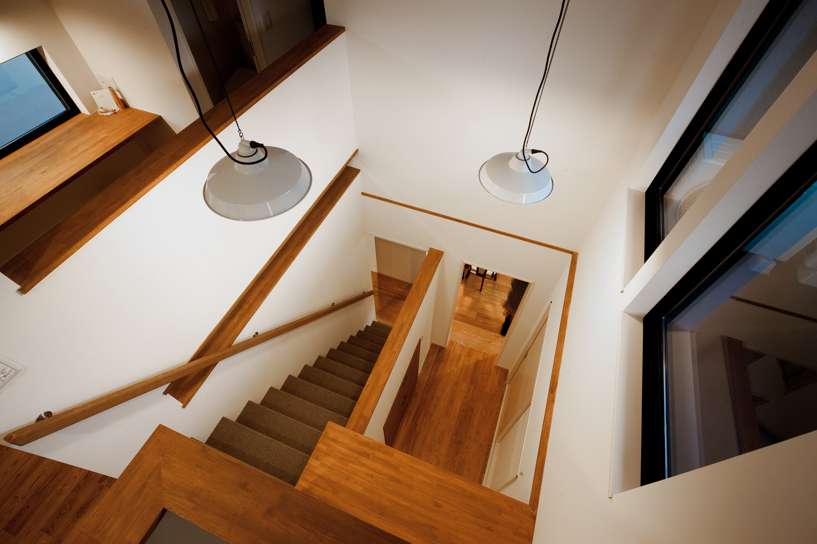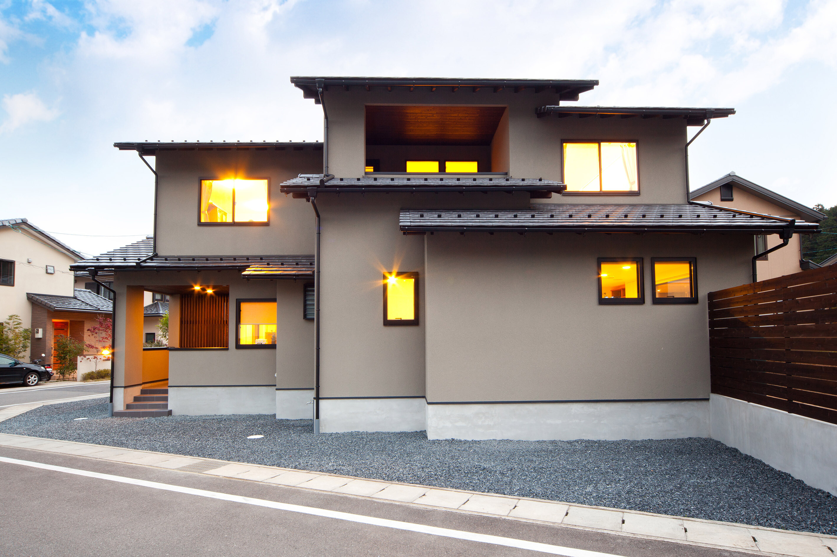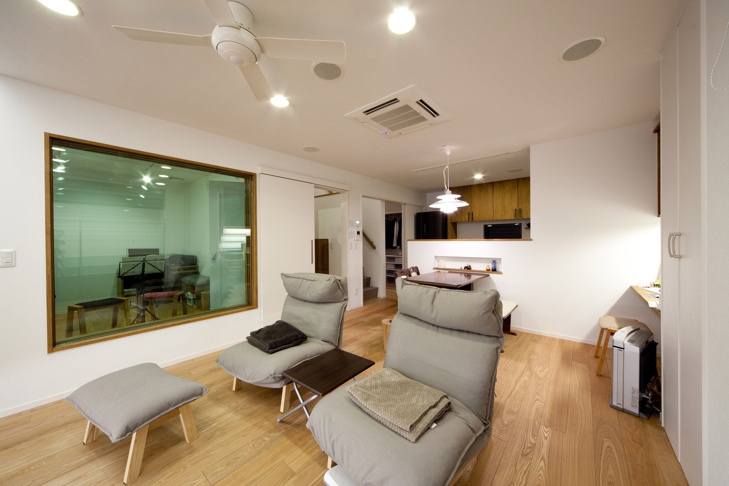 風致地区に立つ和風外観の住宅。インテリアは白を基調としたデザイン、家事動線と機能美を重視した設計になっています。家族の趣味の音楽を楽しむ開放的な音楽室(防音室)を軸にシンプルながら、ダイナミックな空間に仕上げました。