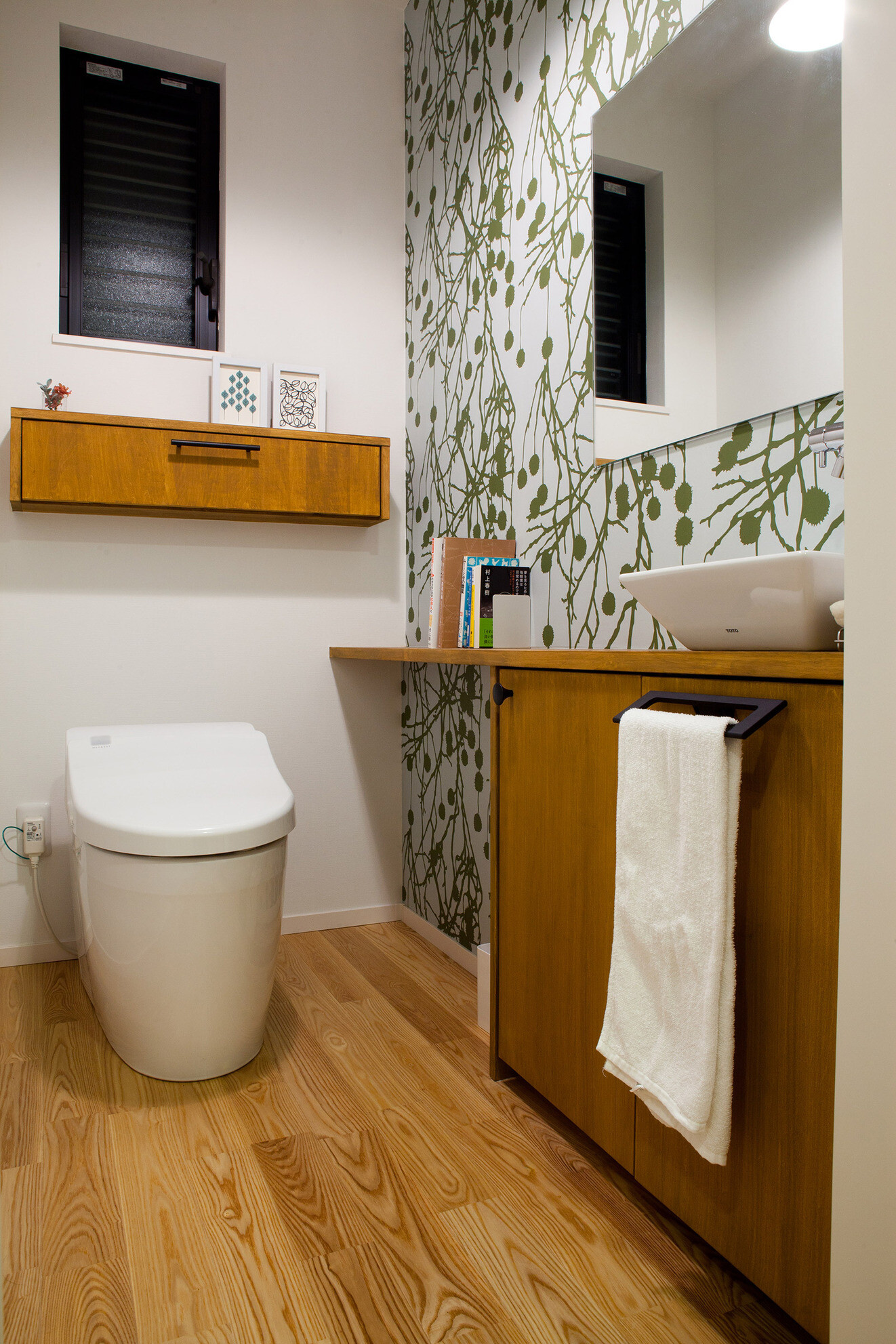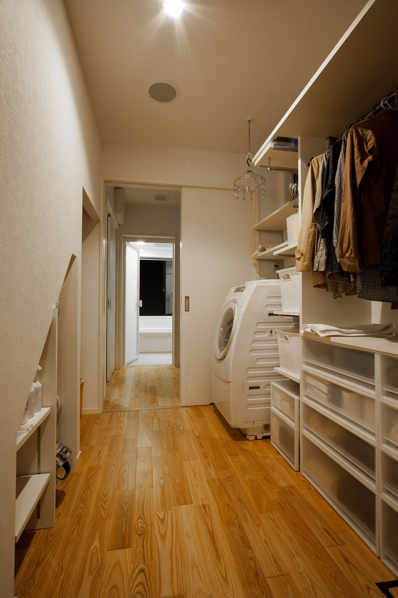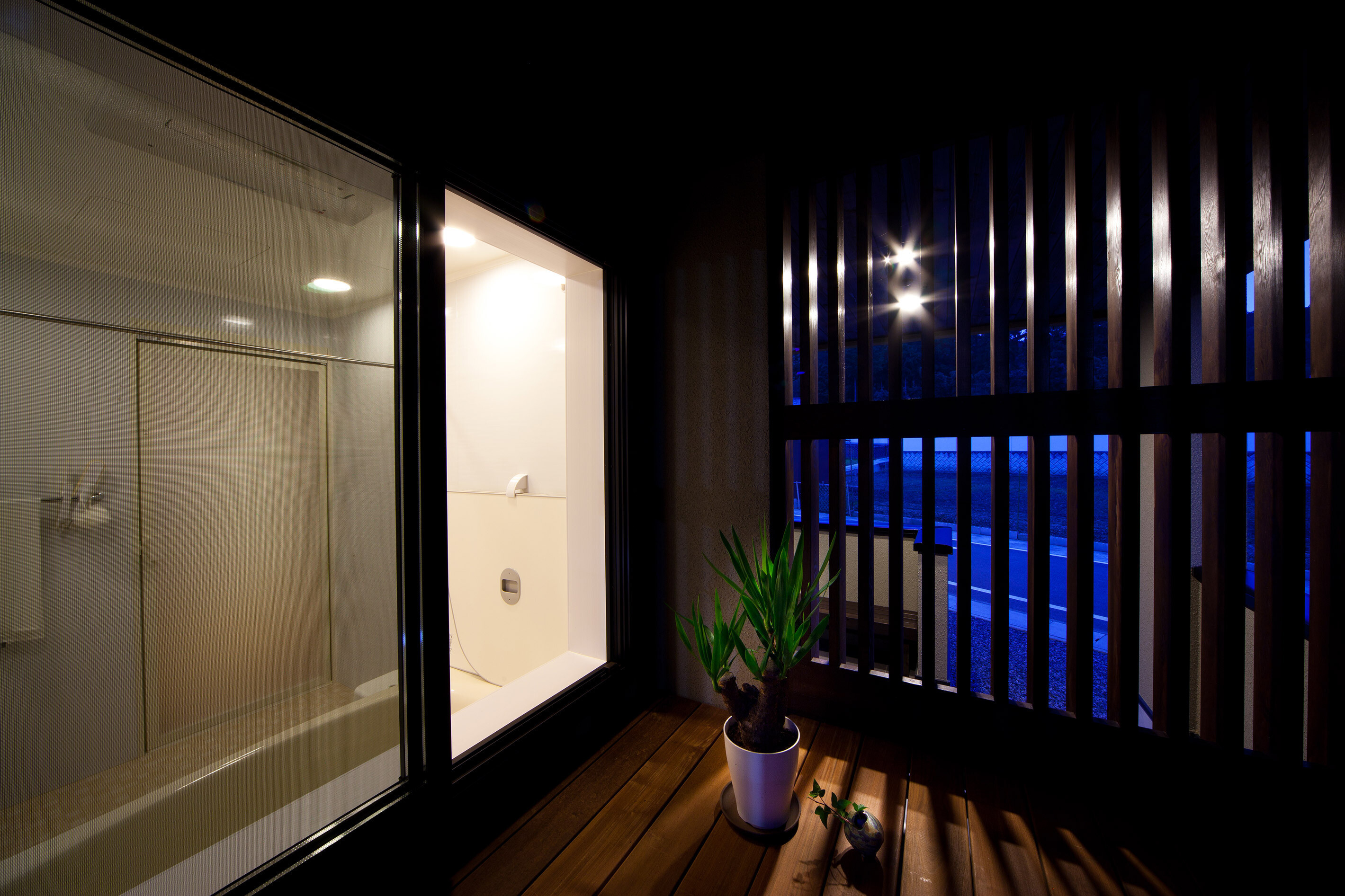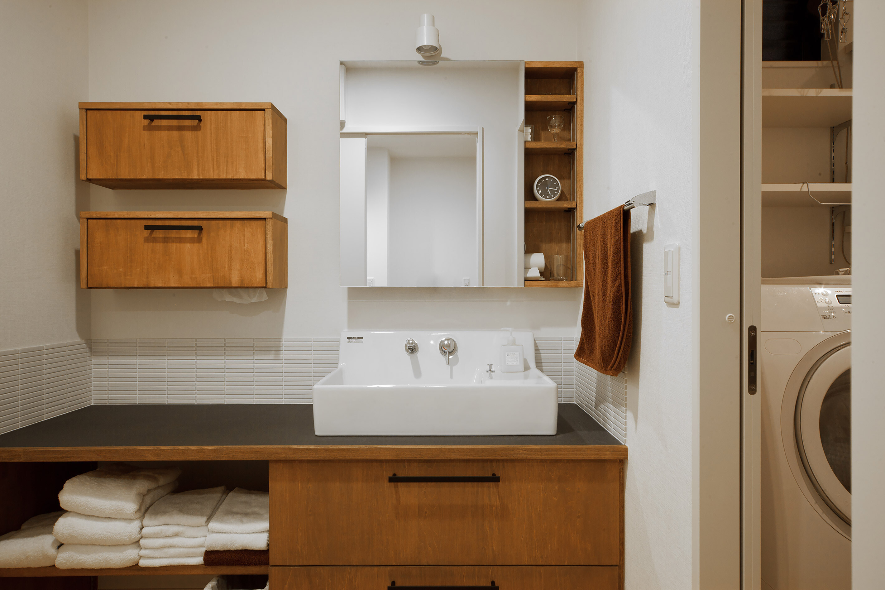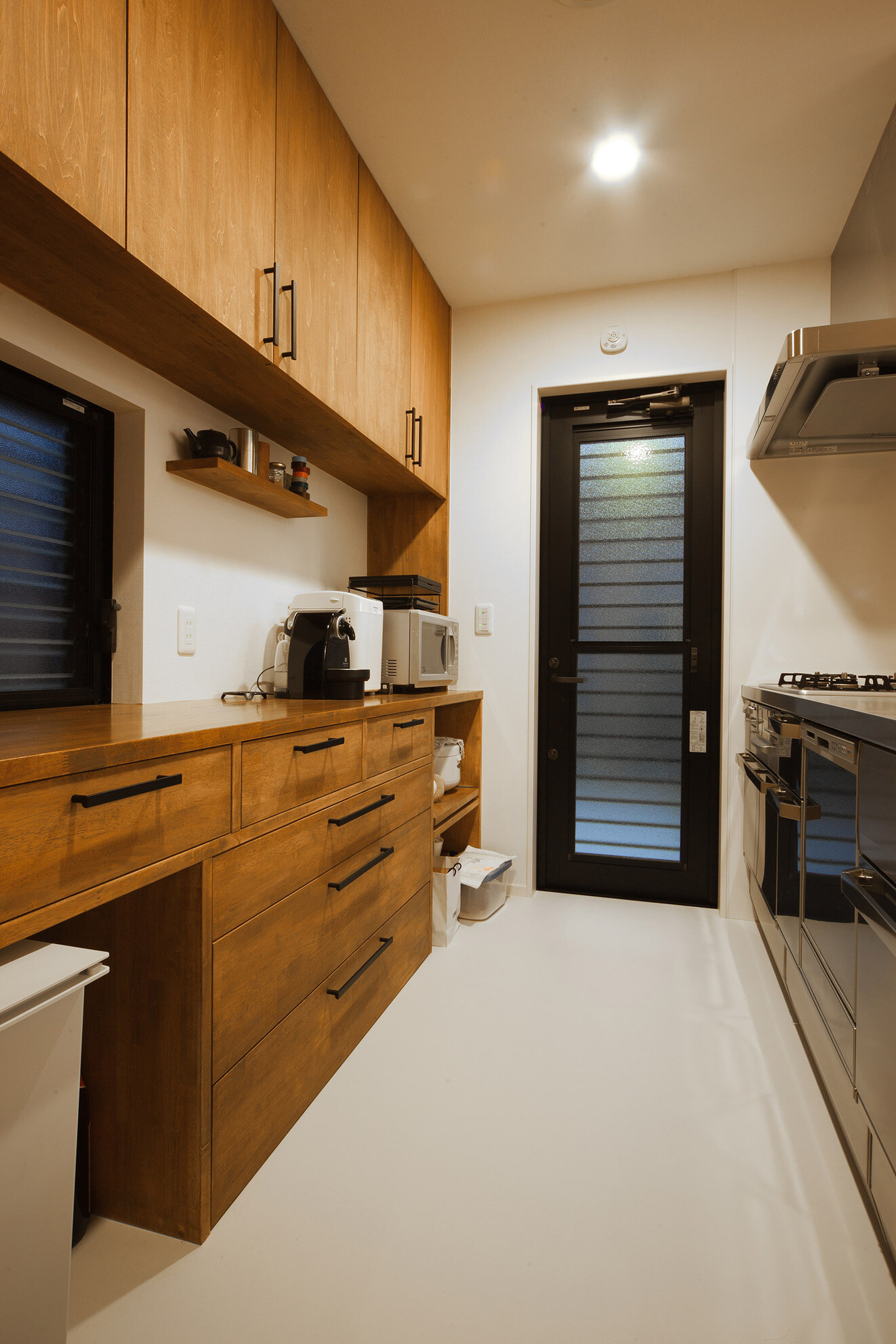 風致地区に立つ和風外観の住宅。インテリアは白を基調としたデザイン、家事動線と機能美を重視した設計になっています。家族の趣味の音楽を楽しむ開放的な音楽室(防音室)を軸にシンプルながら、ダイナミックな空間に仕上げました。