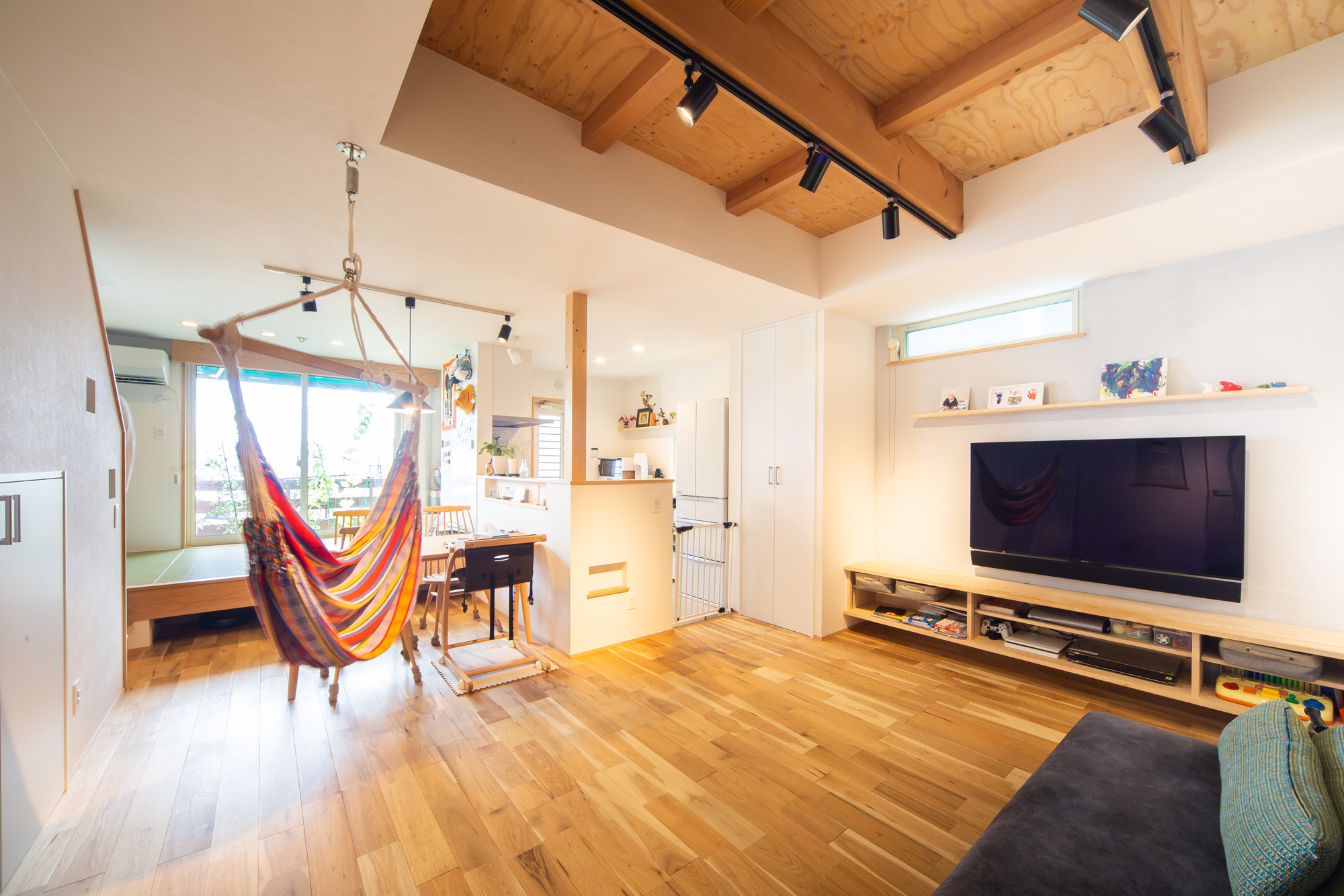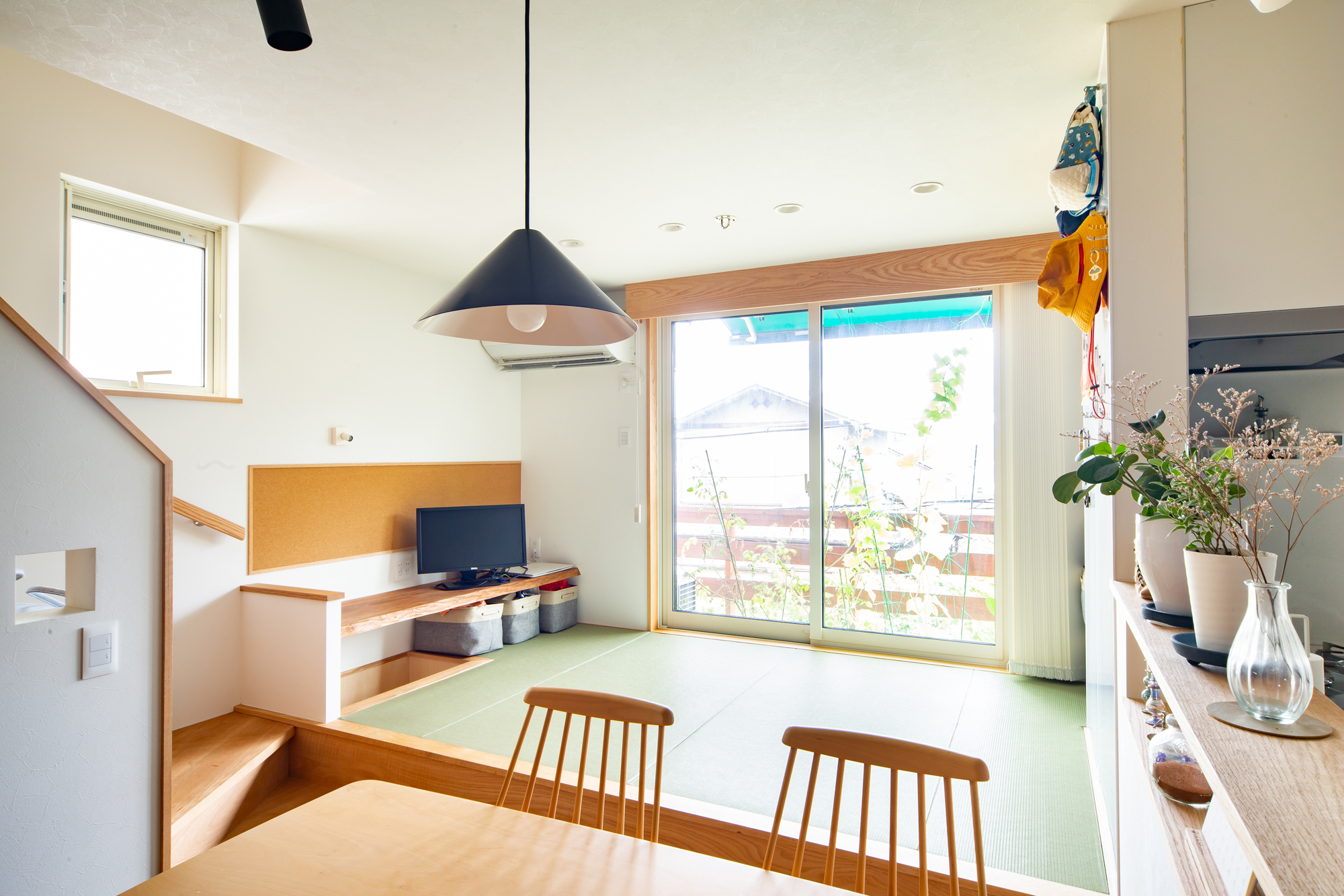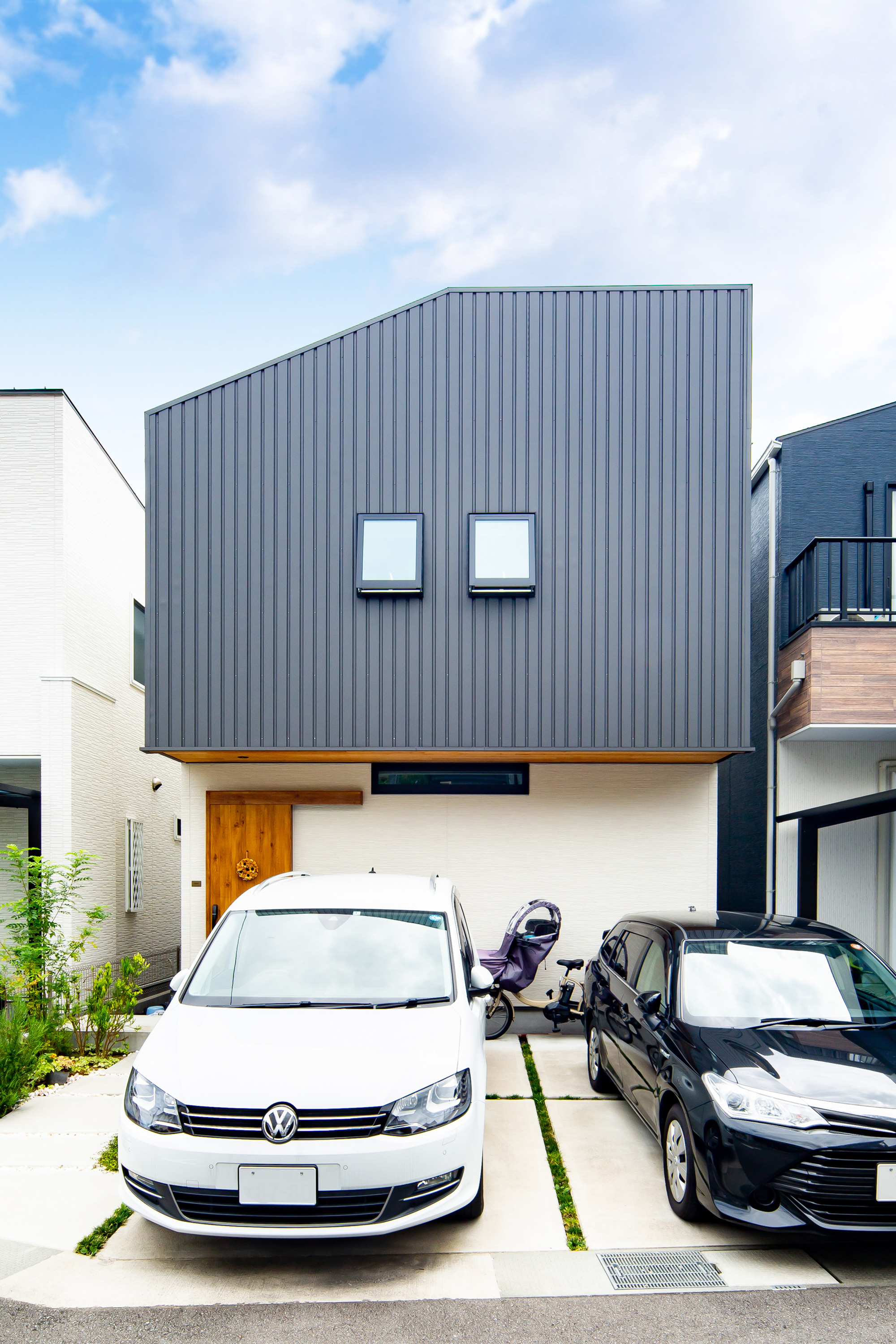 小高い丘陵地にあるガルバリム鋼板が目を惹くシンプルでスタイリッシュな外観。眺めの良い敷地の奥に面してリビングの小上がりとウッドデッキを計画。住宅街でありながら視線が抜け解放感のあるリビング空間となっています。