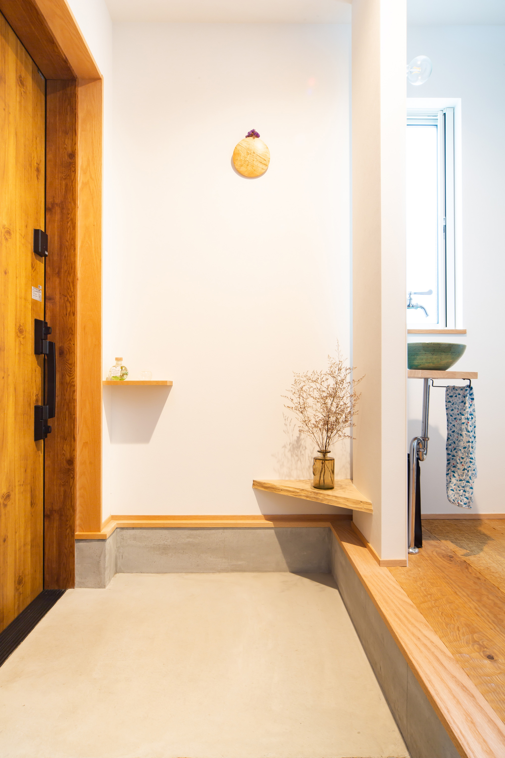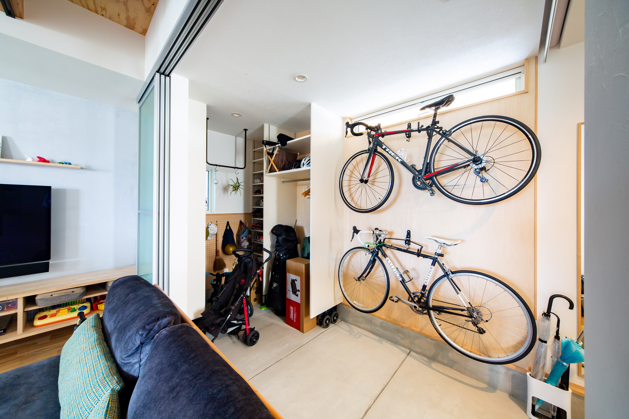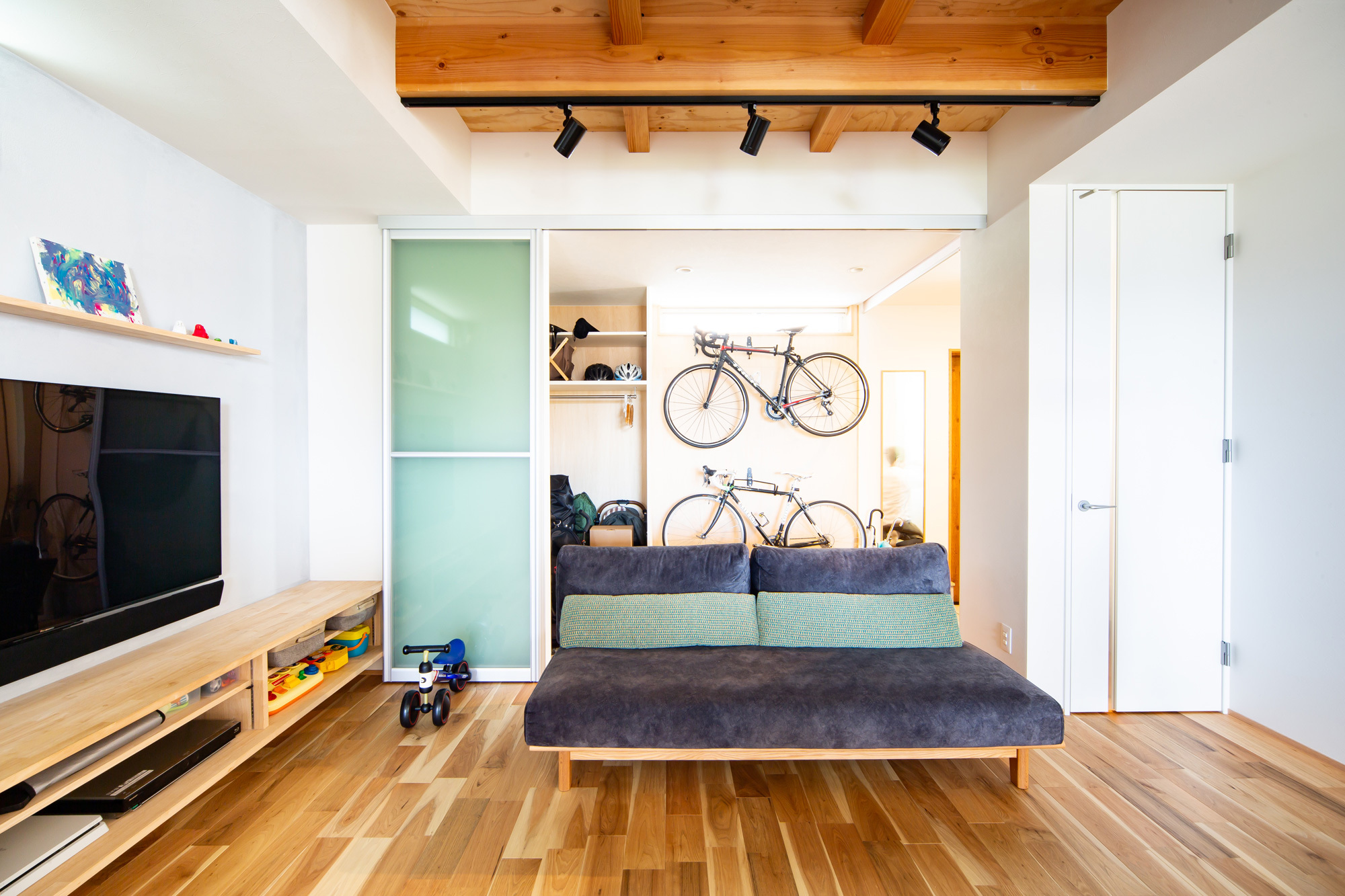 小高い丘陵地にあるガルバリム鋼板が目を惹くシンプルでスタイリッシュな外観。眺めの良い敷地の奥に面してリビングの小上がりとウッドデッキを計画。住宅街でありながら視線が抜け解放感のあるリビング空間となっています。