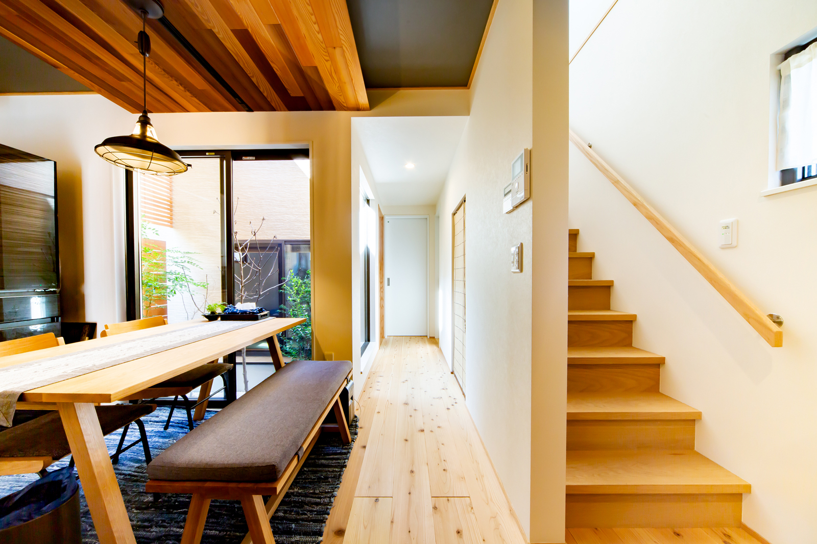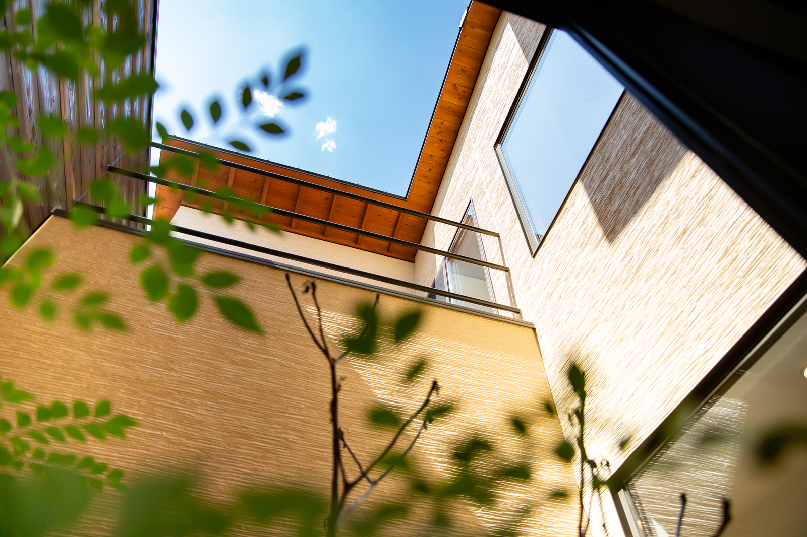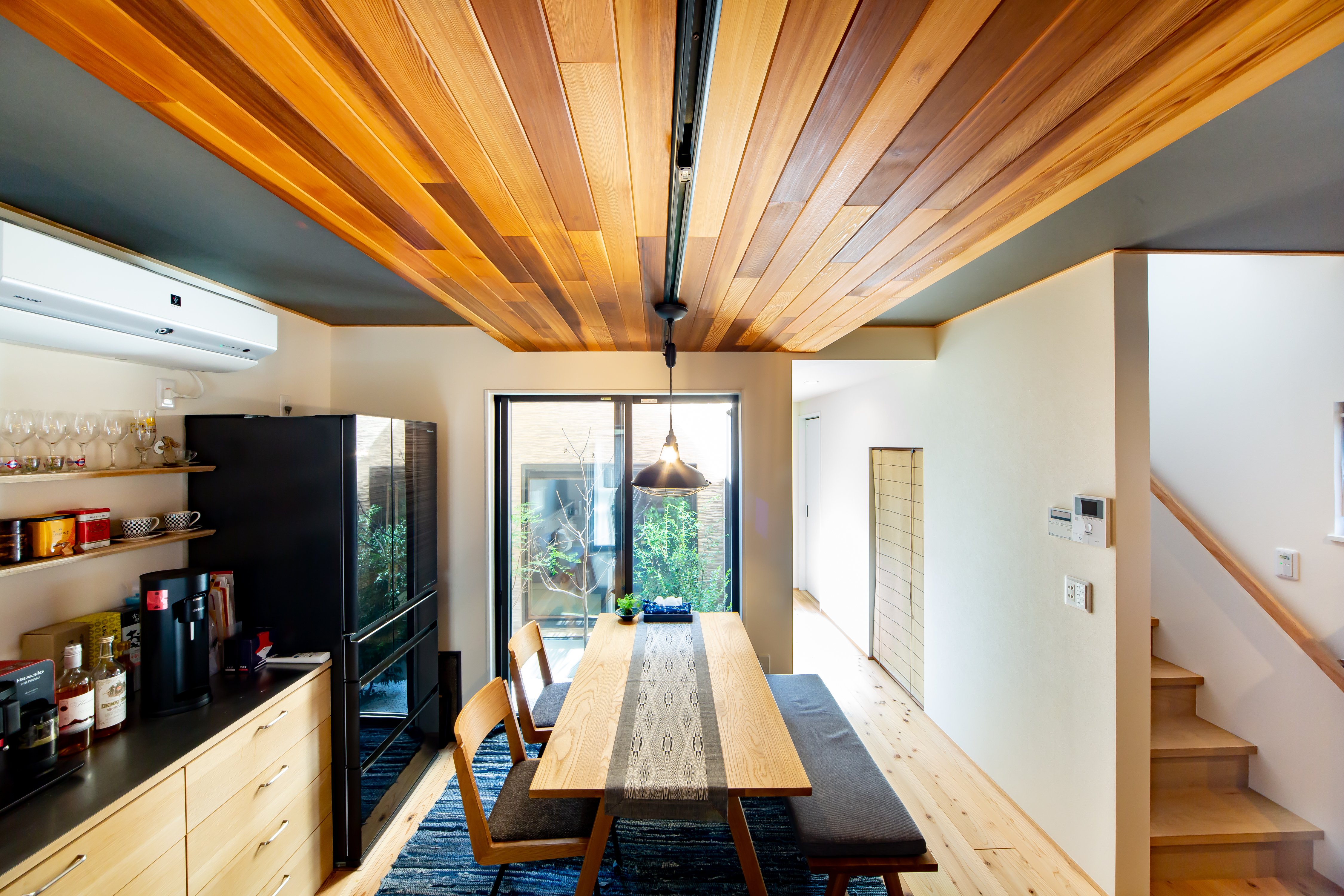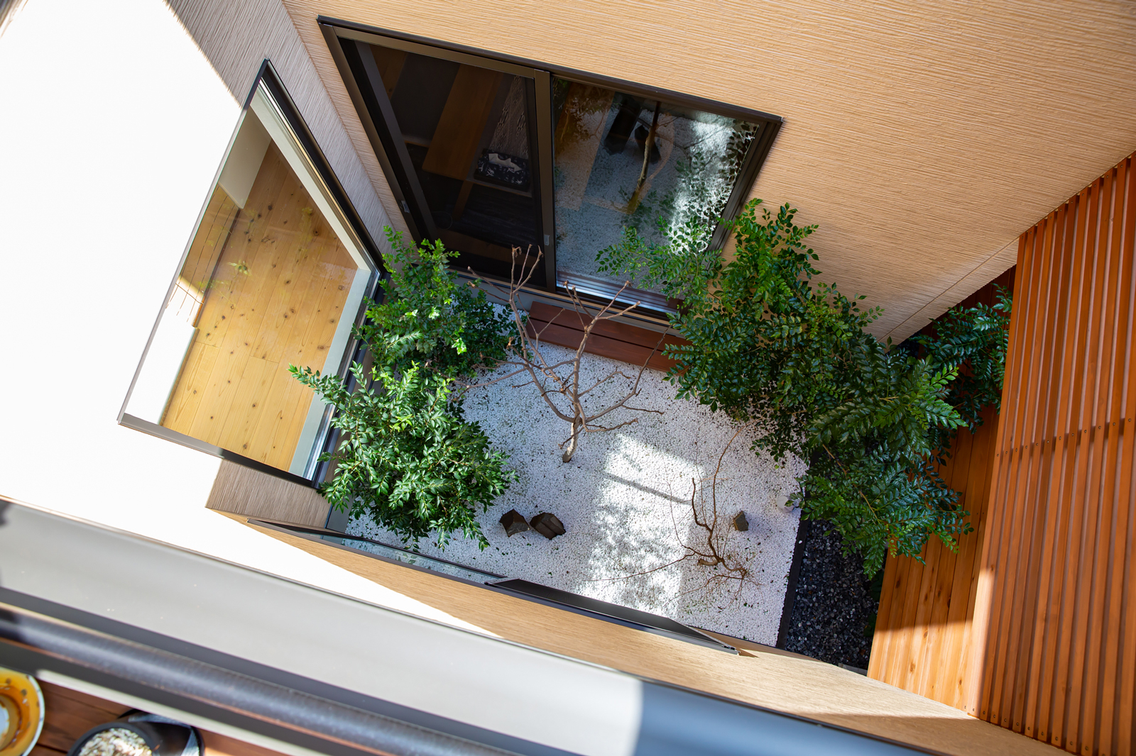 嵐山の旗竿地に建つ住宅。四方を住宅に囲まれた周辺環境でプライバシーと採光を確保するために中庭を設けました。中庭は1階では3帖ほどのコンパクトな空間ですが、2階ではバルコニーと隣接させることでまとまりのある開放的な中庭空間としました。造作キッチンは食器棚と一体化させてインテリアデザインの軸とするとともにコンパクトで機能的なデザインとしました。またプライバシー性の高い中庭に面して各階に大開口の窓を設けることで、どの時間帯でも、どの部屋でも明るく快適な空間になるように設計されています。