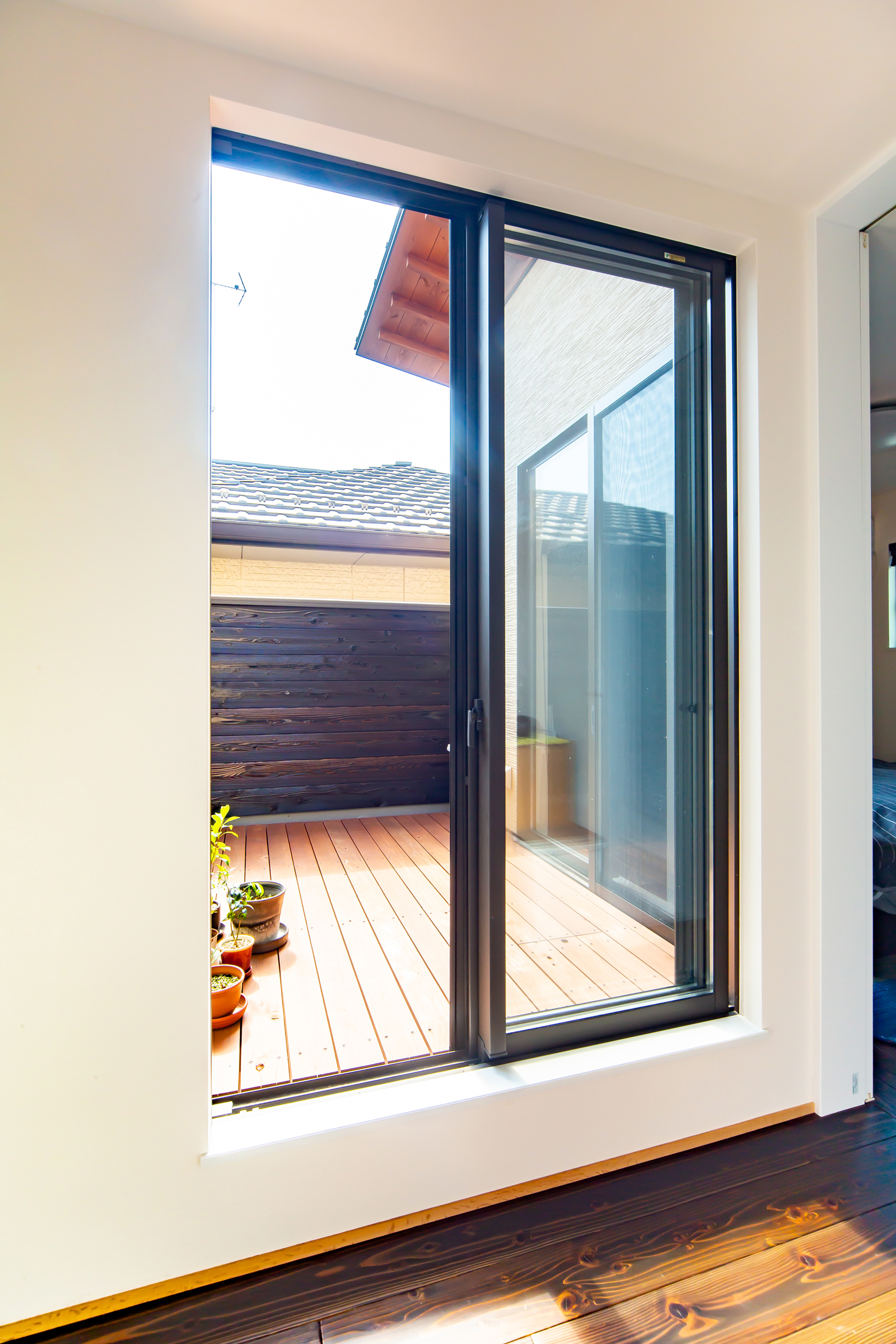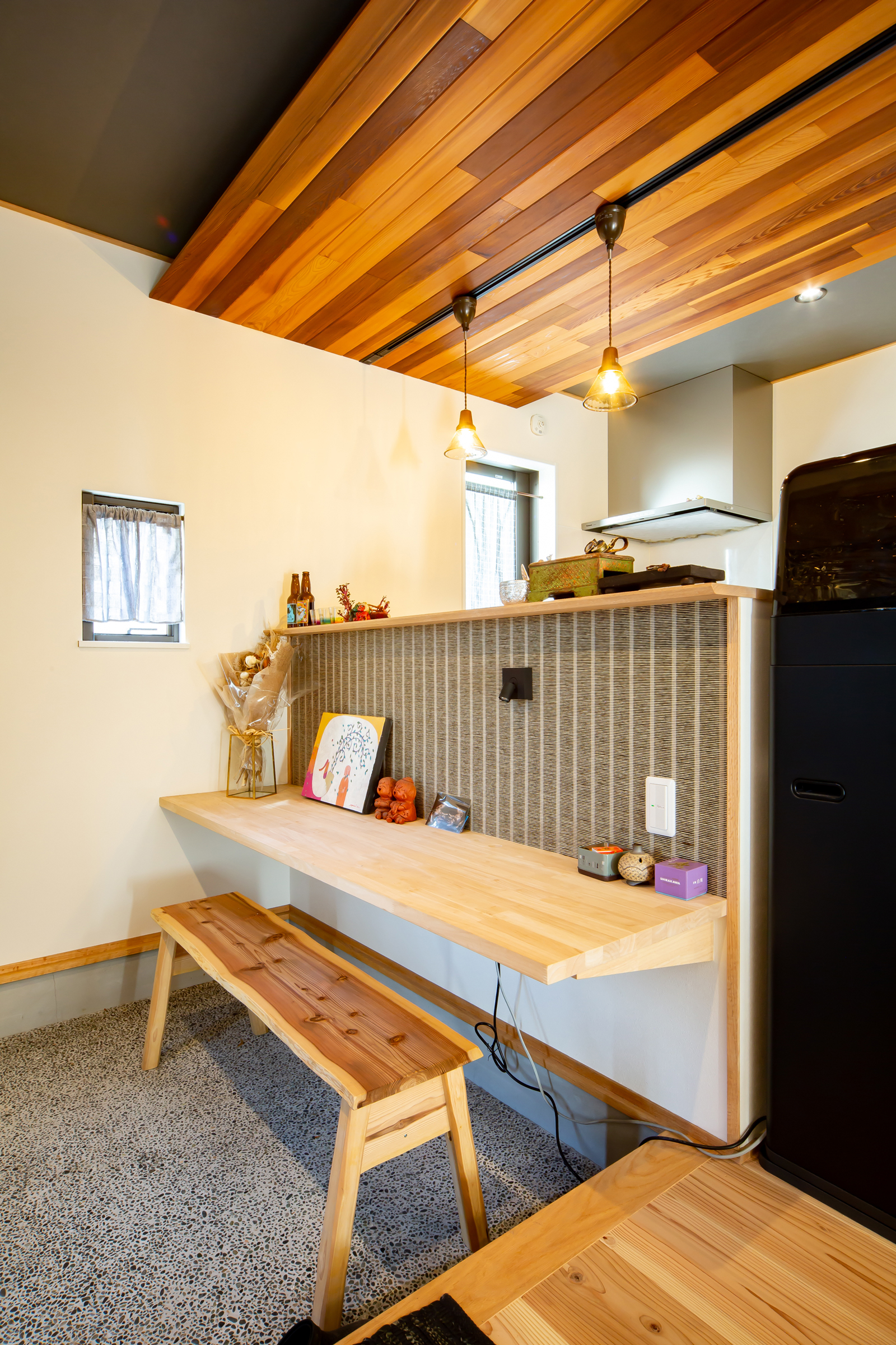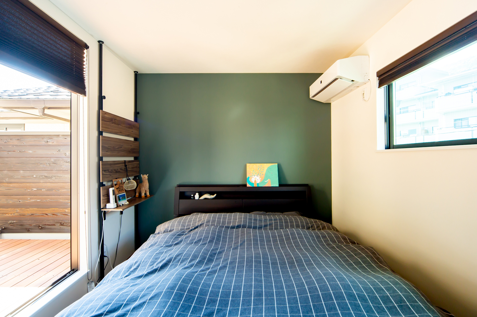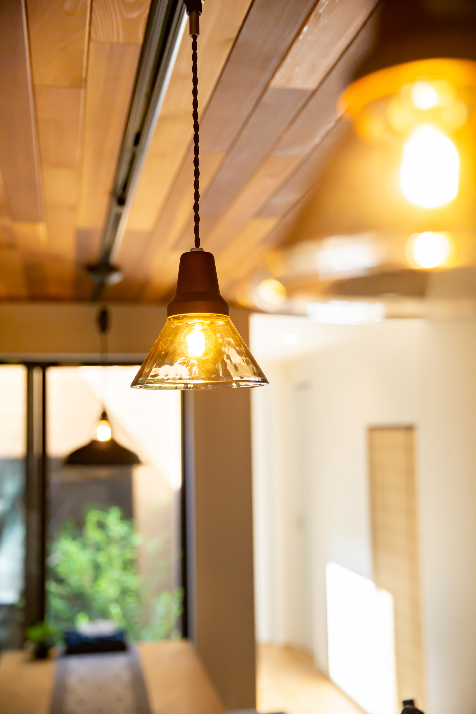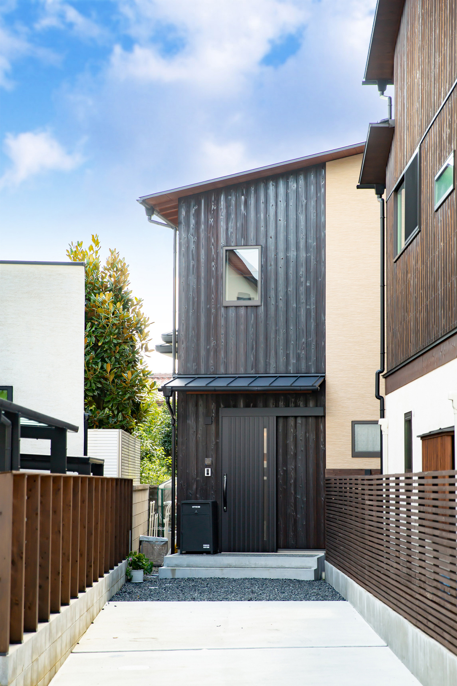 嵐山の旗竿地に建つ住宅。四方を住宅に囲まれた周辺環境でプライバシーと採光を確保するために中庭を設けました。中庭は1階では3帖ほどのコンパクトな空間ですが、2階ではバルコニーと隣接させることでまとまりのある開放的な中庭空間としました。造作キッチンは食器棚と一体化させてインテリアデザインの軸とするとともにコンパクトで機能的なデザインとしました。またプライバシー性の高い中庭に面して各階に大開口の窓を設けることで、どの時間帯でも、どの部屋でも明るく快適な空間になるように設計されています。