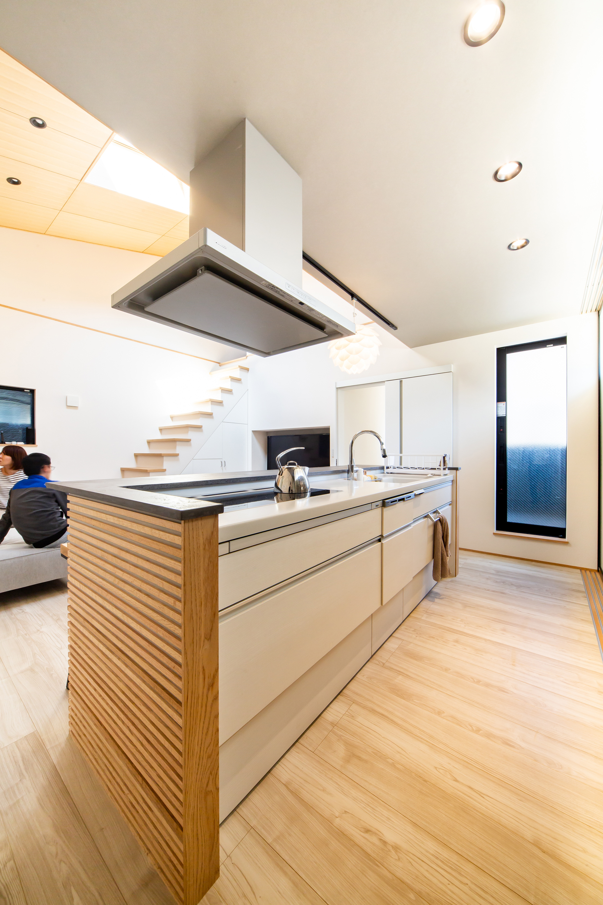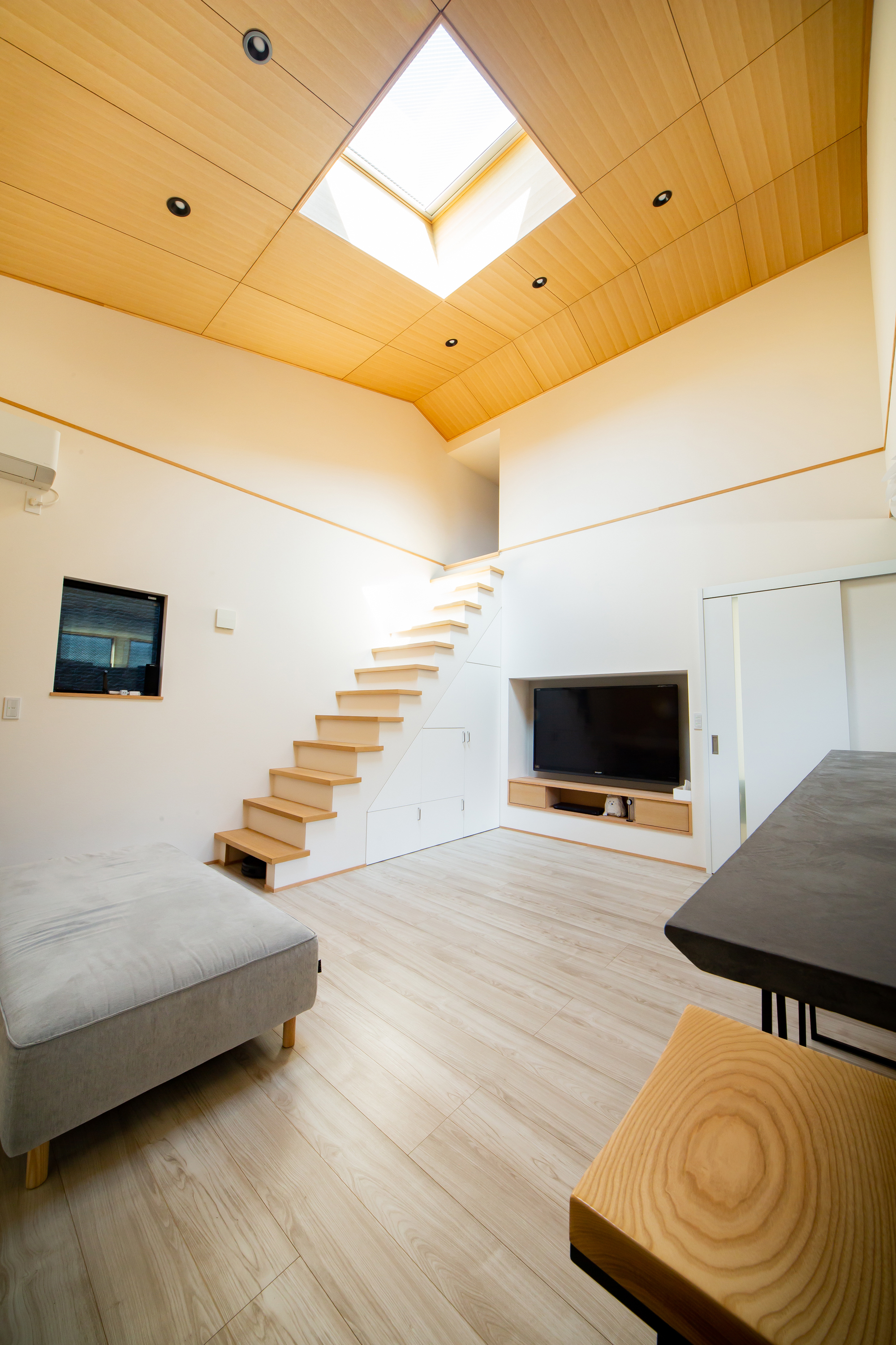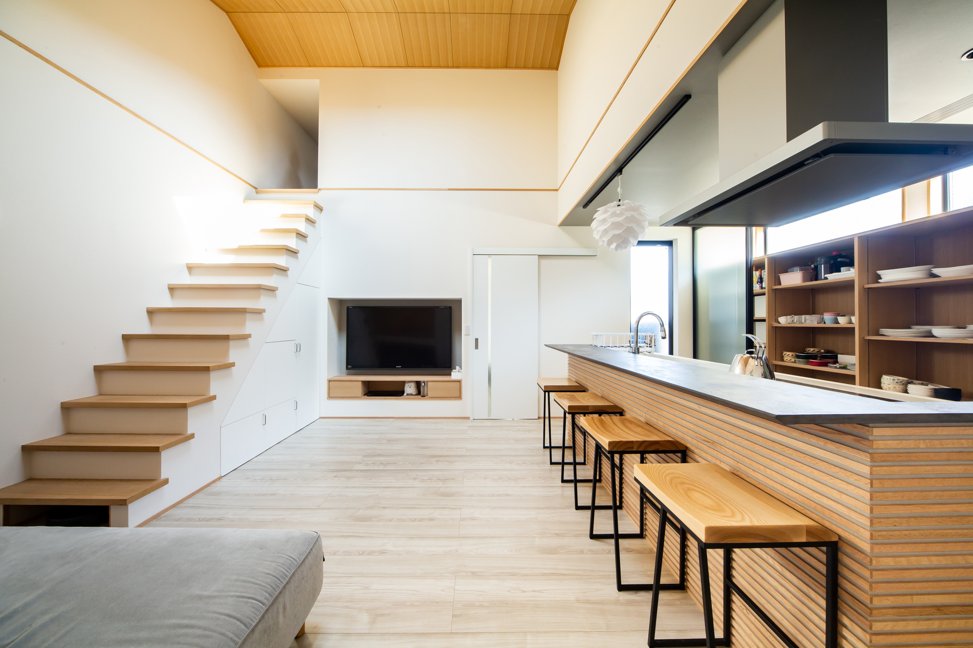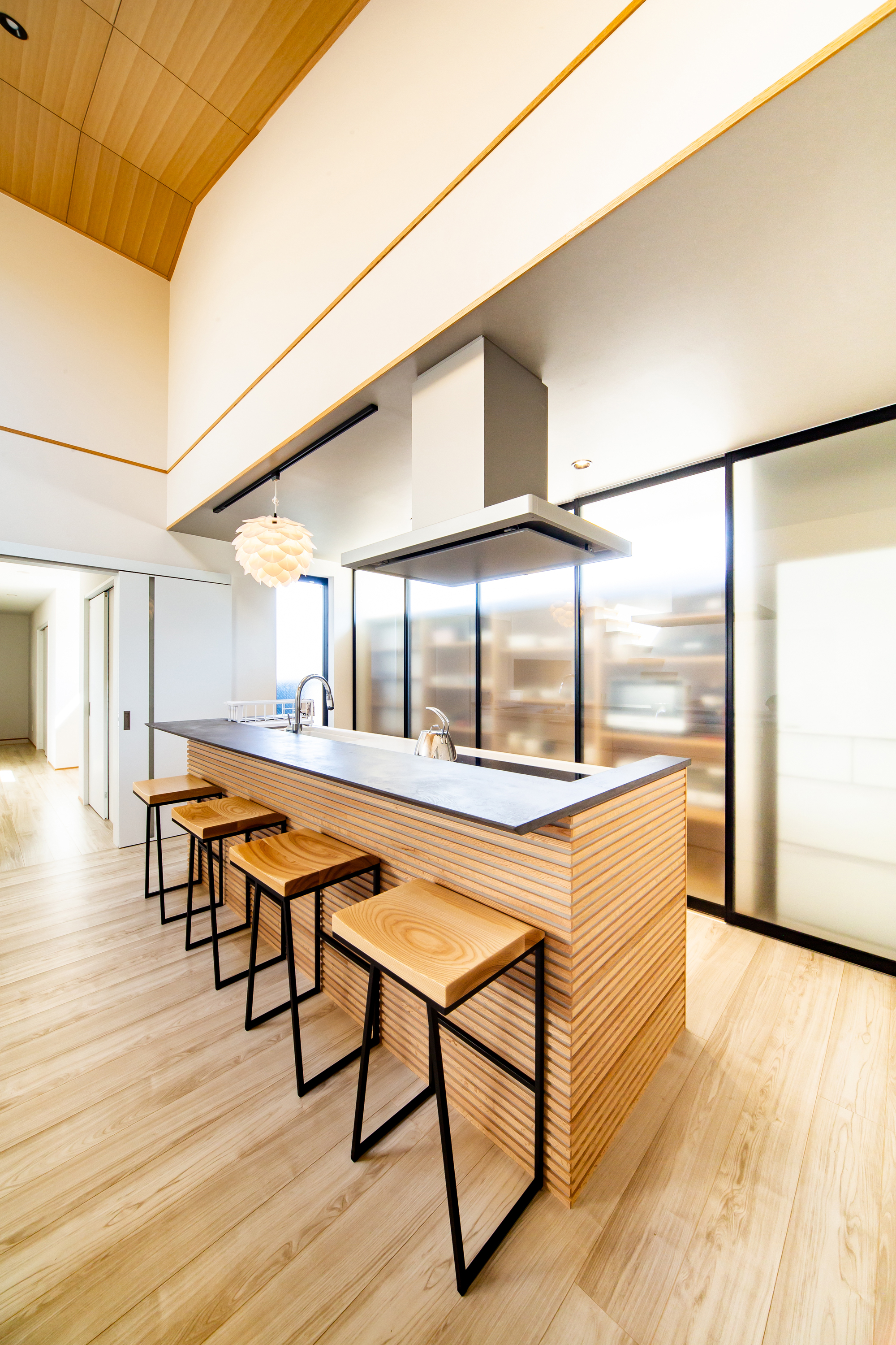 伏見区に建つ二世帯住宅。二世帯住宅で特に大切なことは各世帯の距離感をどのようにデザインするかということです。世帯専用の部分をどこにするのか、二世帯で共有の部分をどこにするのか。今回は玄関と和室は共有で、それ以外のLDKや水廻りは各世帯それぞれに専用のものがあります。生活リズムの違いを考慮し、自分たちにとって程よい距離感の二世帯住宅をじっくり話し合って決めていきました。もちろん親世帯の空間も子世帯の空間も両方とも明るく快適に設計されています。1階の親世帯のスペースはリビングに天窓を設け1階ながら一日中安定的に採光を得られます。またサンルームやファミリークローゼットなどの家事動線に十分配慮した構成です。2階の子世帯のスペースはモールテックスで仕上げたダイニングカウンターや全面ガラス扉のキッチン収納スペースなど、お料理好きの奥様がもっとお料理をしやすく、家事がスムーズになるように考え抜かれた構成となっています。またワンちゃんの為にオリジナルでゲートを製作したり、階段の勾配を緩くして人もワンちゃんも暮らしやすいスペースになっています。LDKは小屋裏空間を活かした吹抜けにすることで天井高さ4.5m超の大空間を実現しています。その頂部に大開口の天窓を設けることでLDKを最も明るく開放的な空間にデザインしました。