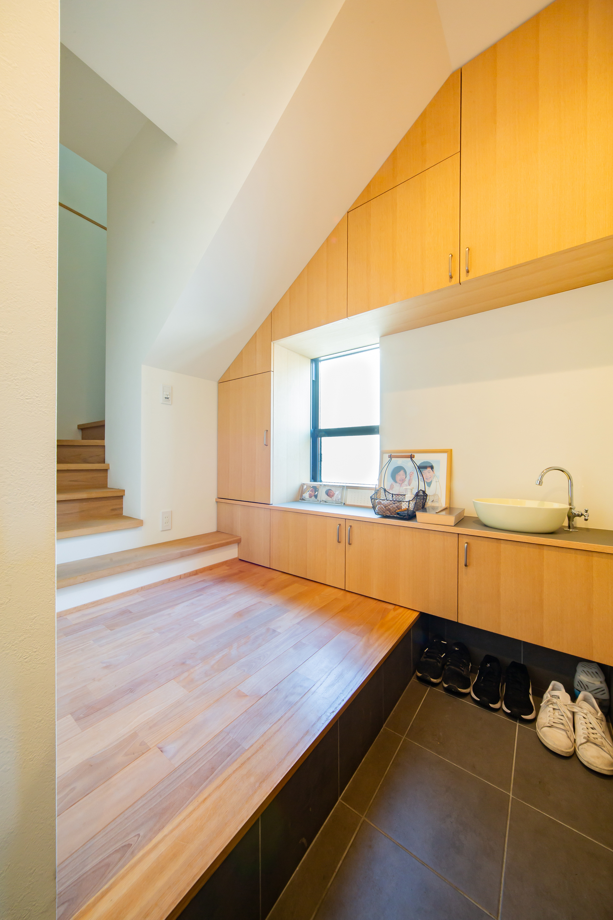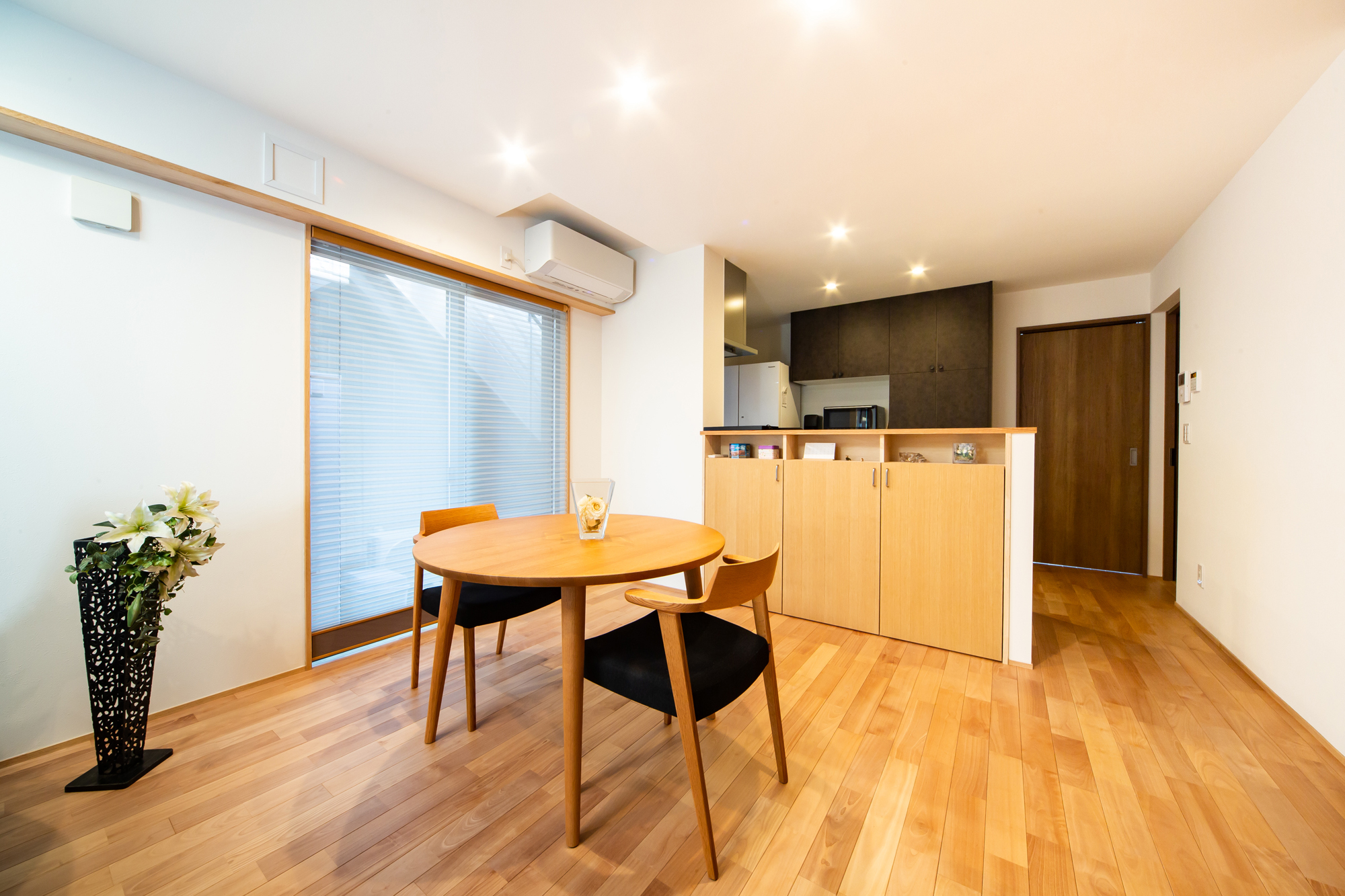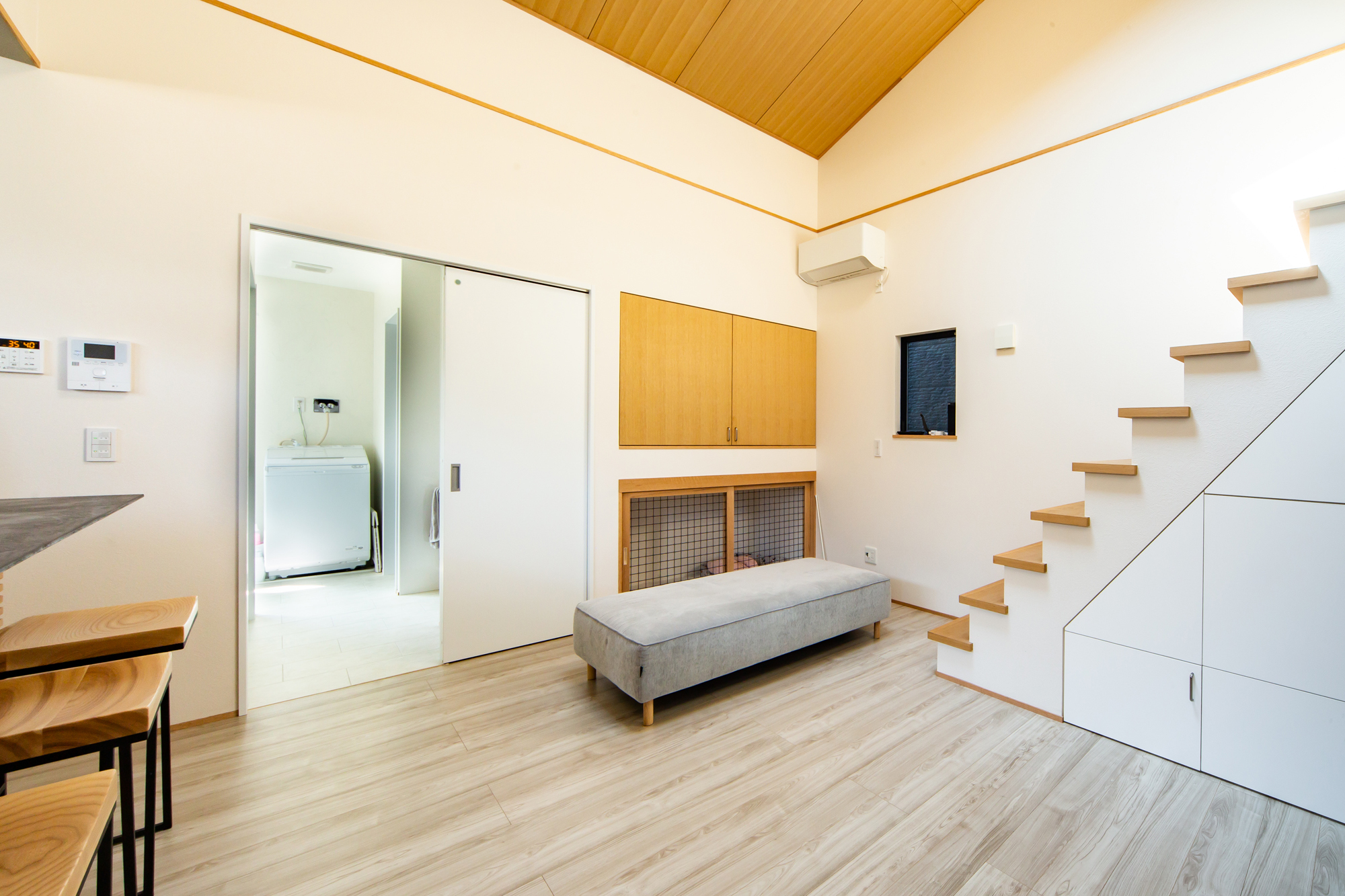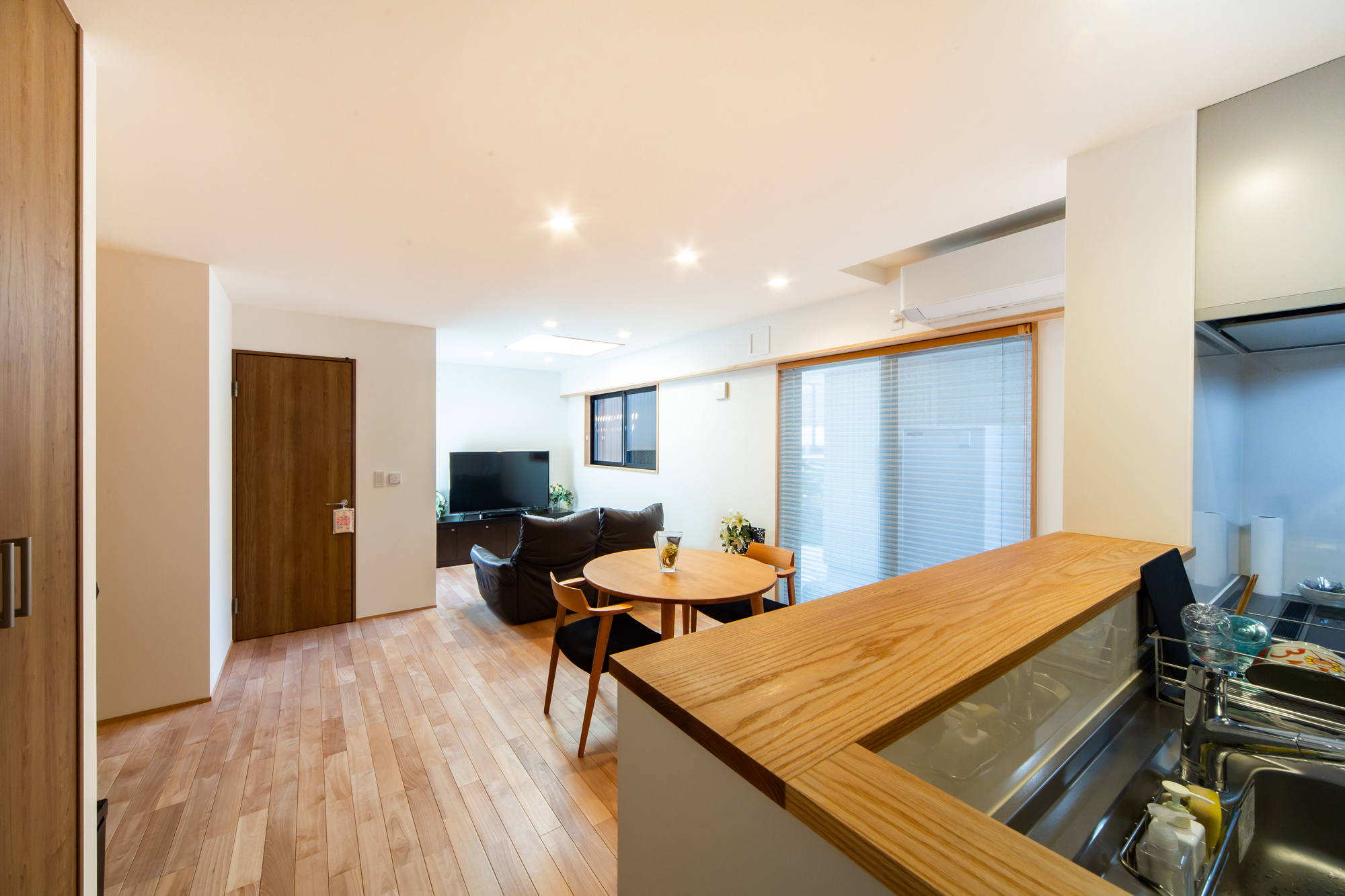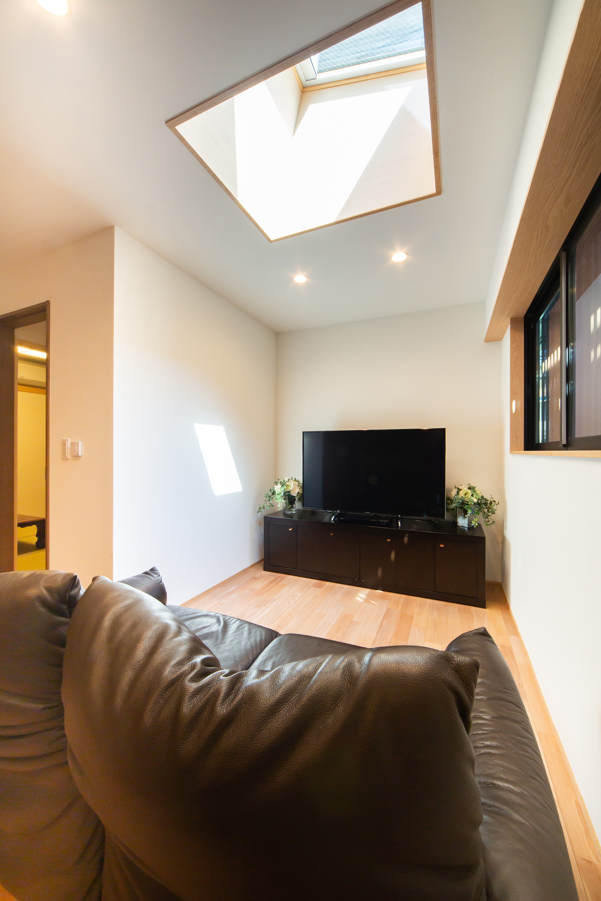 伏見区に建つ二世帯住宅。二世帯住宅で特に大切なことは各世帯の距離感をどのようにデザインするかということです。世帯専用の部分をどこにするのか、二世帯で共有の部分をどこにするのか。今回は玄関と和室は共有で、それ以外のLDKや水廻りは各世帯それぞれに専用のものがあります。生活リズムの違いを考慮し、自分たちにとって程よい距離感の二世帯住宅をじっくり話し合って決めていきました。もちろん親世帯の空間も子世帯の空間も両方とも明るく快適に設計されています。1階の親世帯のスペースはリビングに天窓を設け1階ながら一日中安定的に採光を得られます。またサンルームやファミリークローゼットなどの家事動線に十分配慮した構成です。2階の子世帯のスペースはモールテックスで仕上げたダイニングカウンターや全面ガラス扉のキッチン収納スペースなど、お料理好きの奥様がもっとお料理をしやすく、家事がスムーズになるように考え抜かれた構成となっています。またワンちゃんの為にオリジナルでゲートを製作したり、階段の勾配を緩くして人もワンちゃんも暮らしやすいスペースになっています。LDKは小屋裏空間を活かした吹抜けにすることで天井高さ4.5m超の大空間を実現しています。その頂部に大開口の天窓を設けることでLDKを最も明るく開放的な空間にデザインしました。