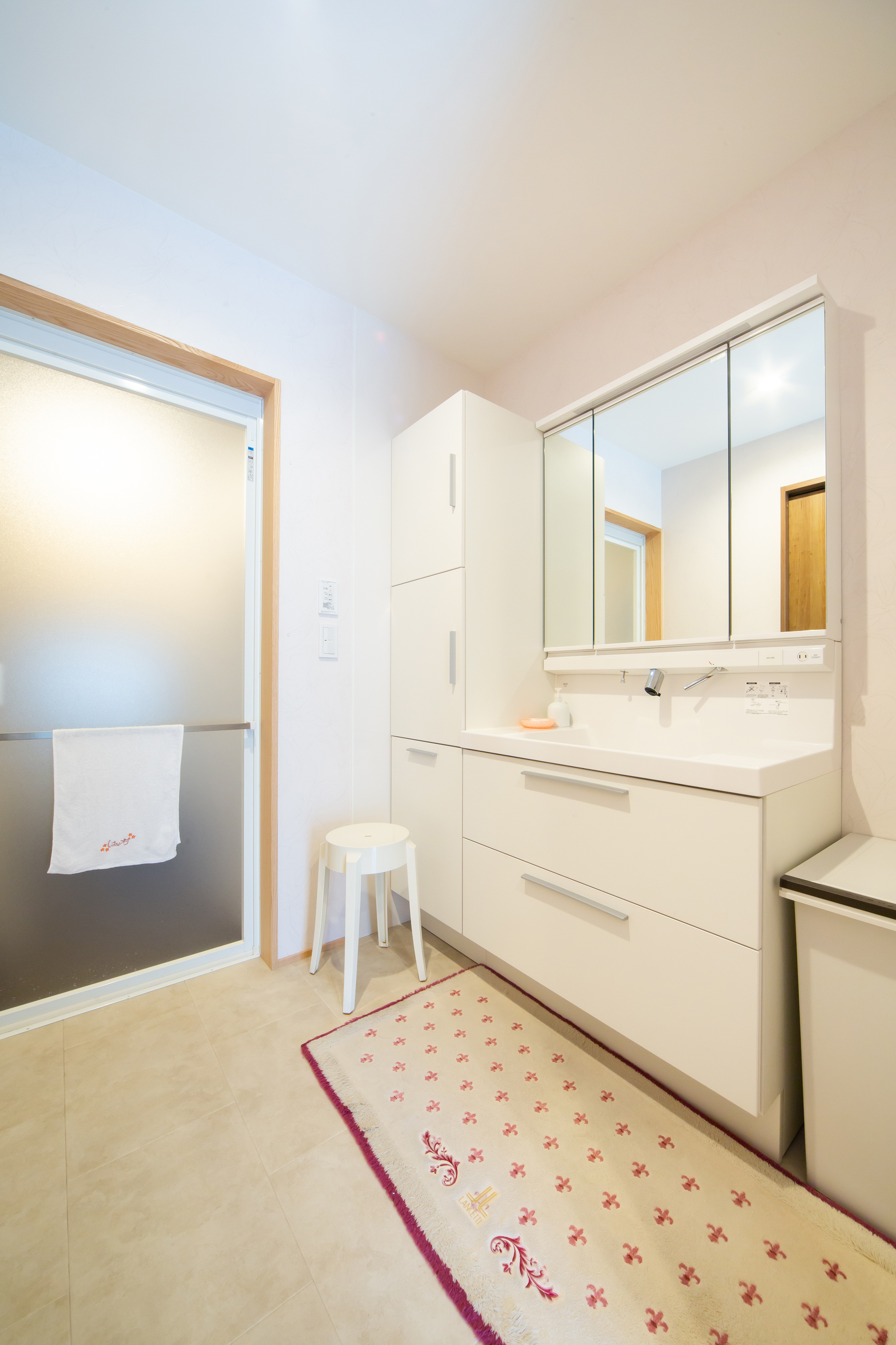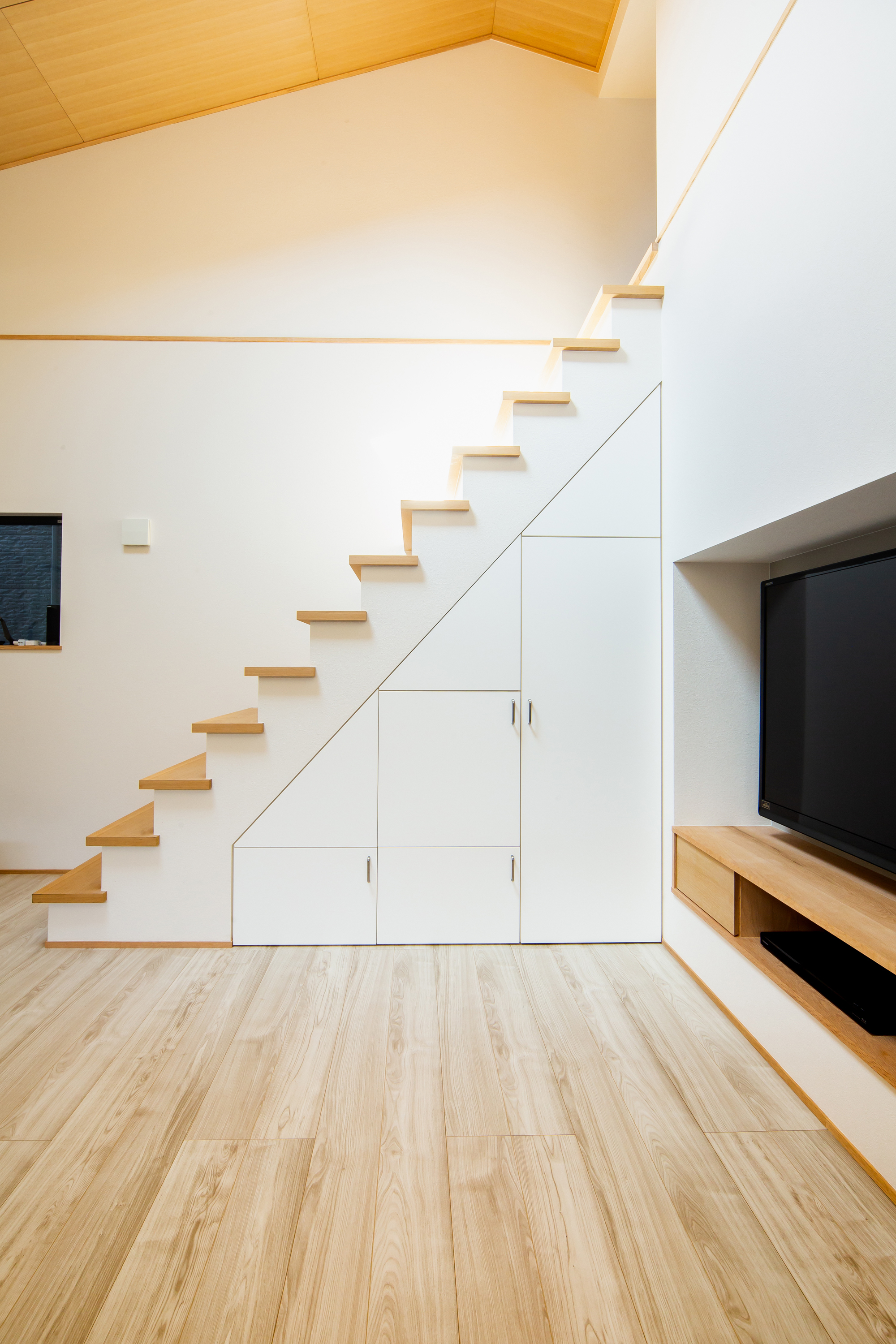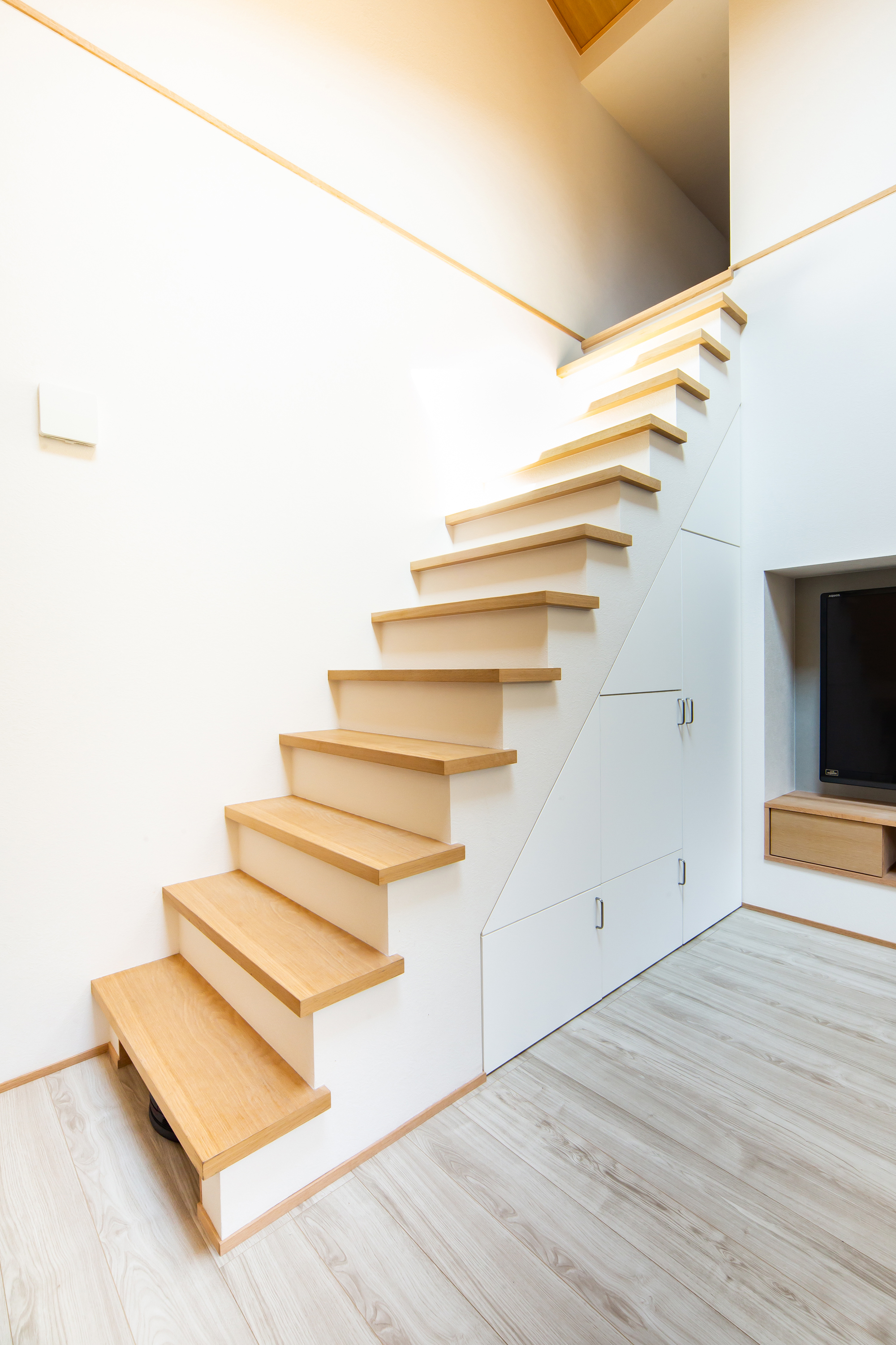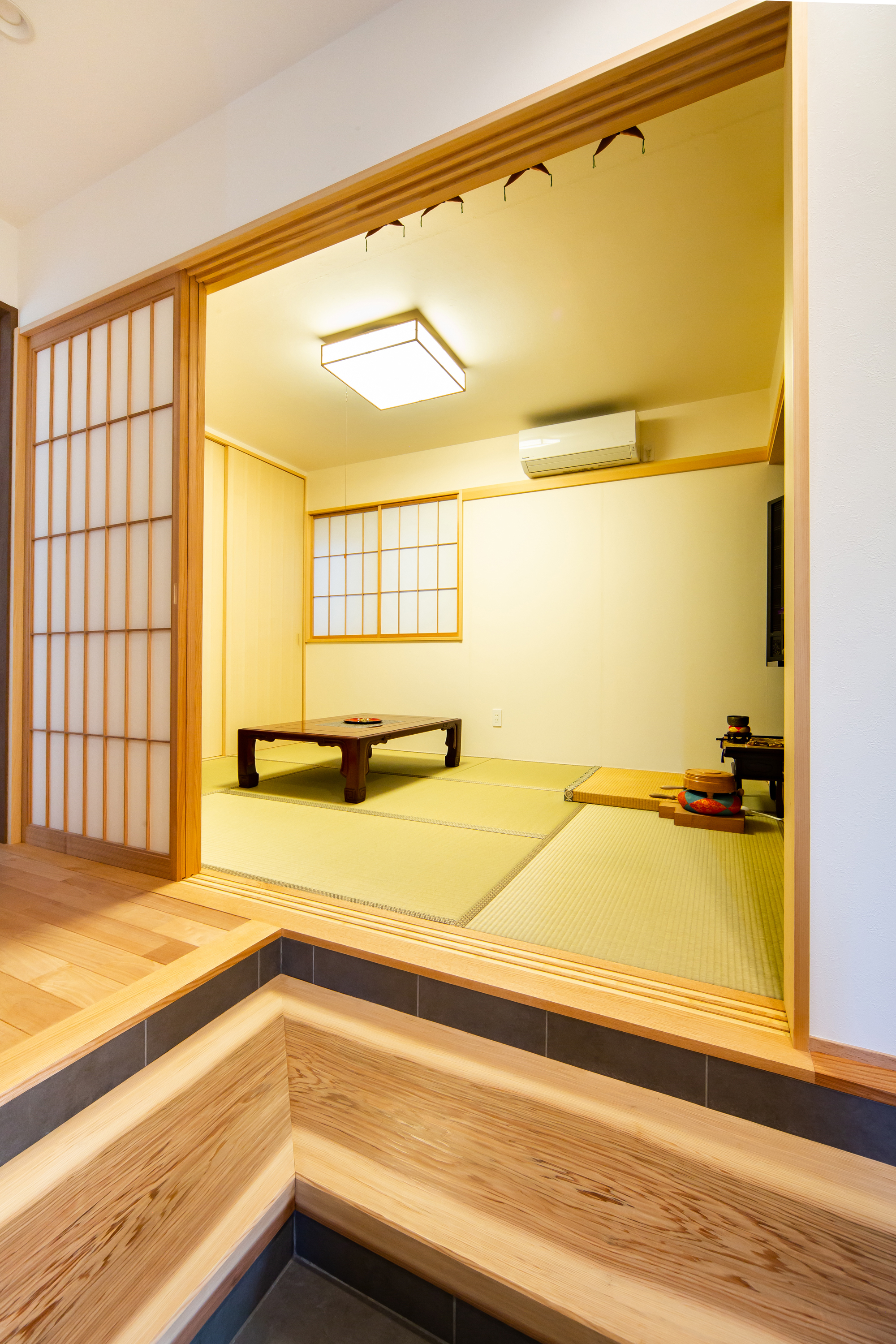 伏見区に建つ二世帯住宅。二世帯住宅で特に大切なことは各世帯の距離感をどのようにデザインするかということです。世帯専用の部分をどこにするのか、二世帯で共有の部分をどこにするのか。今回は玄関と和室は共有で、それ以外のLDKや水廻りは各世帯それぞれに専用のものがあります。生活リズムの違いを考慮し、自分たちにとって程よい距離感の二世帯住宅をじっくり話し合って決めていきました。もちろん親世帯の空間も子世帯の空間も両方とも明るく快適に設計されています。1階の親世帯のスペースはリビングに天窓を設け1階ながら一日中安定的に採光を得られます。またサンルームやファミリークローゼットなどの家事動線に十分配慮した構成です。2階の子世帯のスペースはモールテックスで仕上げたダイニングカウンターや全面ガラス扉のキッチン収納スペースなど、お料理好きの奥様がもっとお料理をしやすく、家事がスムーズになるように考え抜かれた構成となっています。またワンちゃんの為にオリジナルでゲートを製作したり、階段の勾配を緩くして人もワンちゃんも暮らしやすいスペースになっています。LDKは小屋裏空間を活かした吹抜けにすることで天井高さ4.5m超の大空間を実現しています。その頂部に大開口の天窓を設けることでLDKを最も明るく開放的な空間にデザインしました。