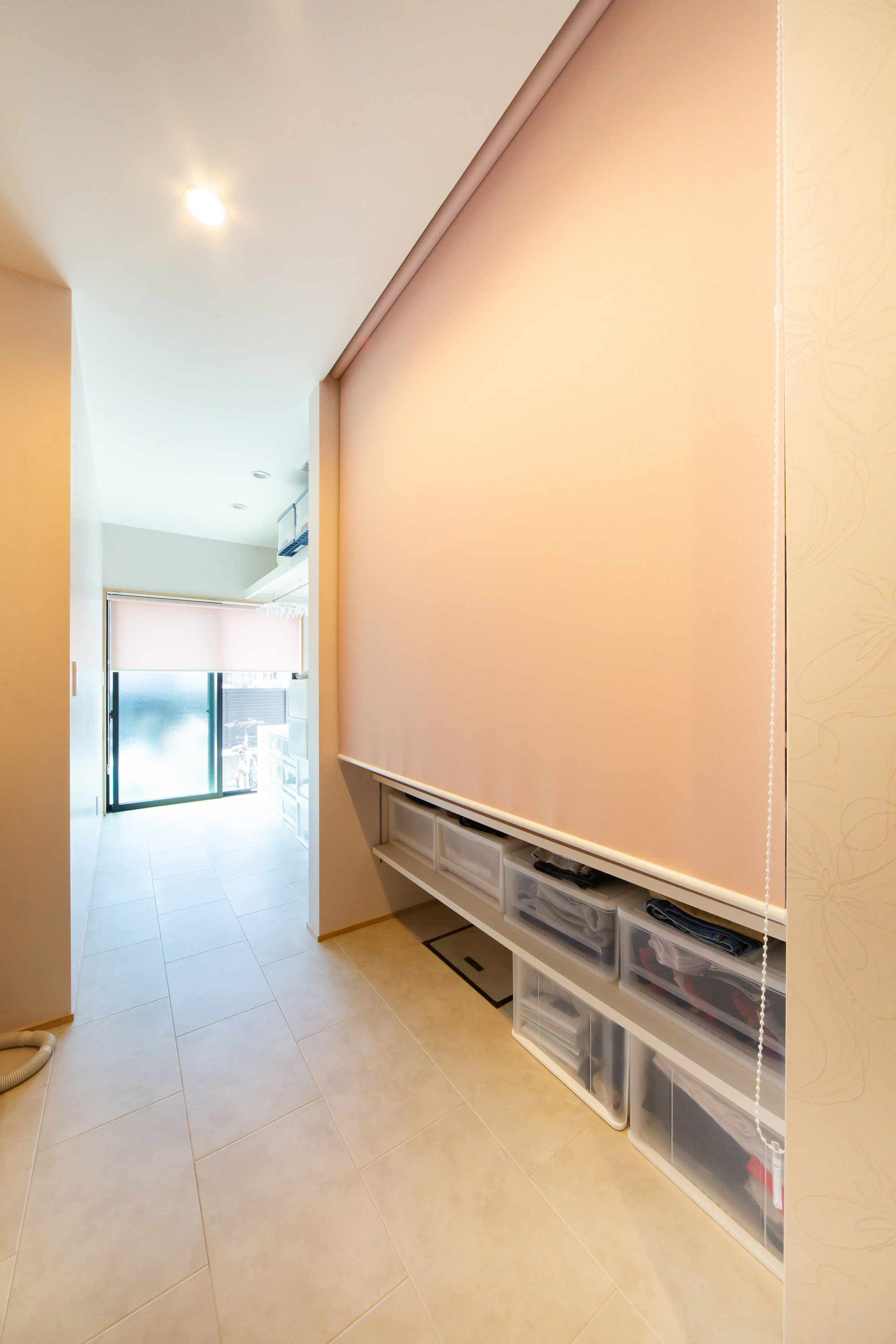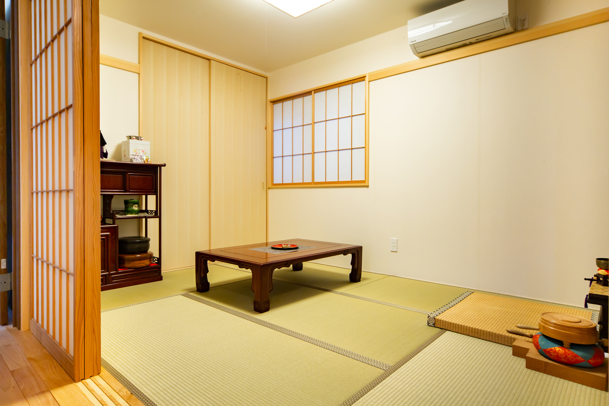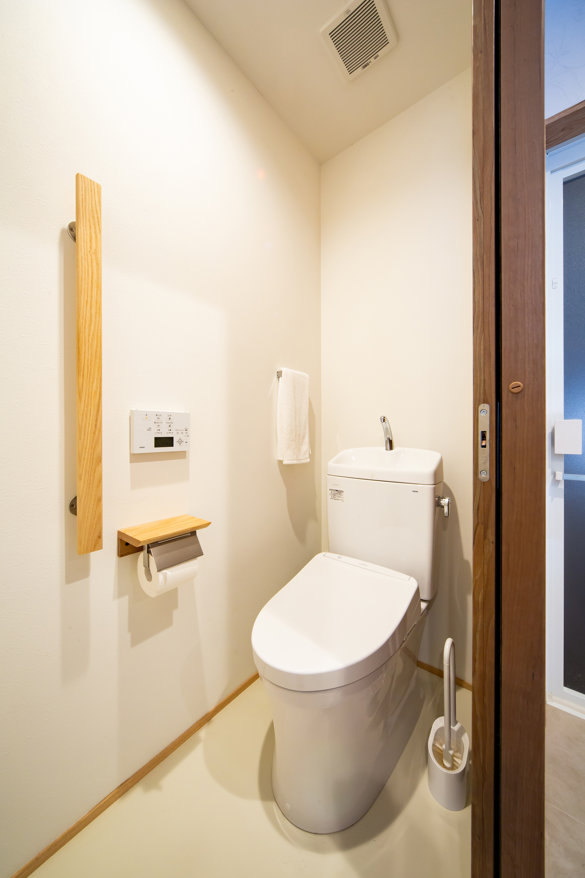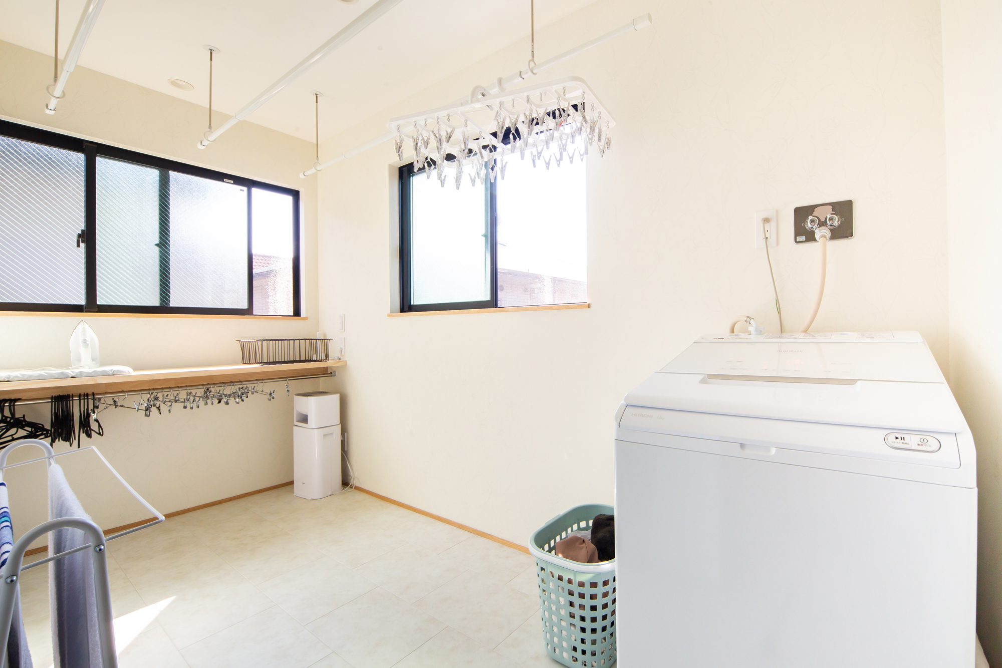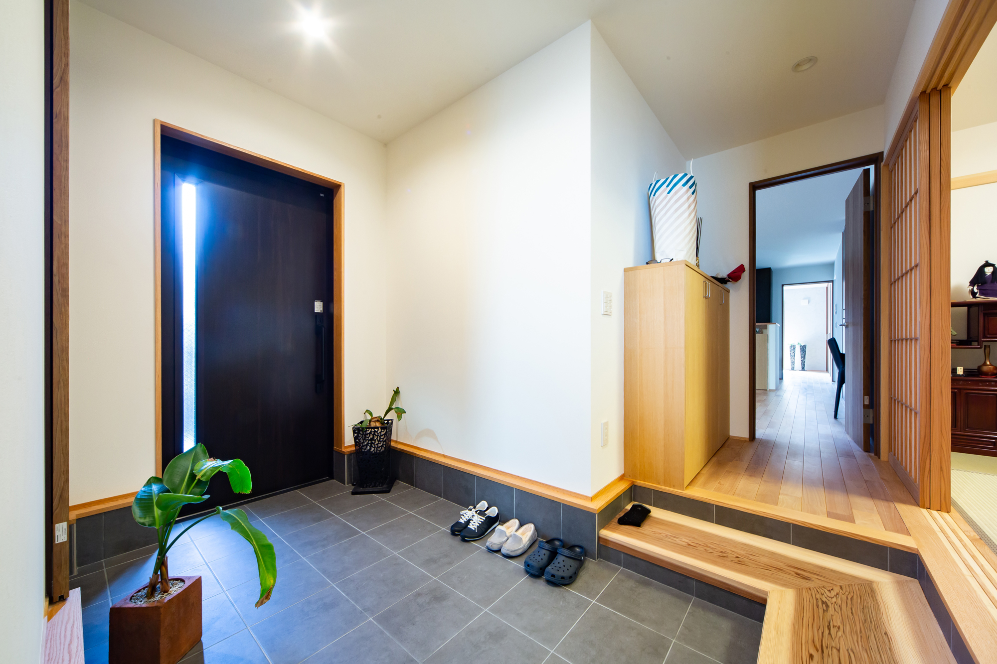 伏見区に建つ二世帯住宅。二世帯住宅で特に大切なことは各世帯の距離感をどのようにデザインするかということです。世帯専用の部分をどこにするのか、二世帯で共有の部分をどこにするのか。今回は玄関と和室は共有で、それ以外のLDKや水廻りは各世帯それぞれに専用のものがあります。生活リズムの違いを考慮し、自分たちにとって程よい距離感の二世帯住宅をじっくり話し合って決めていきました。もちろん親世帯の空間も子世帯の空間も両方とも明るく快適に設計されています。1階の親世帯のスペースはリビングに天窓を設け1階ながら一日中安定的に採光を得られます。またサンルームやファミリークローゼットなどの家事動線に十分配慮した構成です。2階の子世帯のスペースはモールテックスで仕上げたダイニングカウンターや全面ガラス扉のキッチン収納スペースなど、お料理好きの奥様がもっとお料理をしやすく、家事がスムーズになるように考え抜かれた構成となっています。またワンちゃんの為にオリジナルでゲートを製作したり、階段の勾配を緩くして人もワンちゃんも暮らしやすいスペースになっています。LDKは小屋裏空間を活かした吹抜けにすることで天井高さ4.5m超の大空間を実現しています。その頂部に大開口の天窓を設けることでLDKを最も明るく開放的な空間にデザインしました。