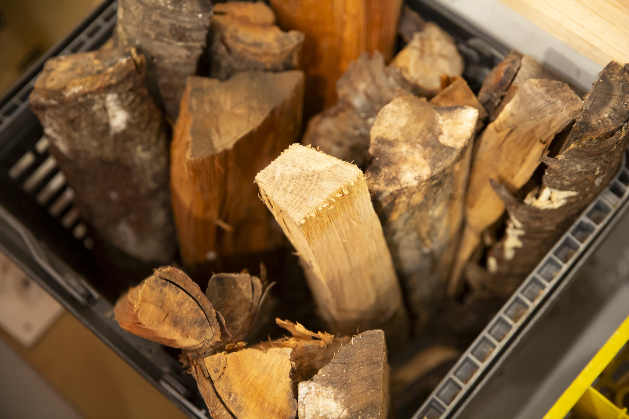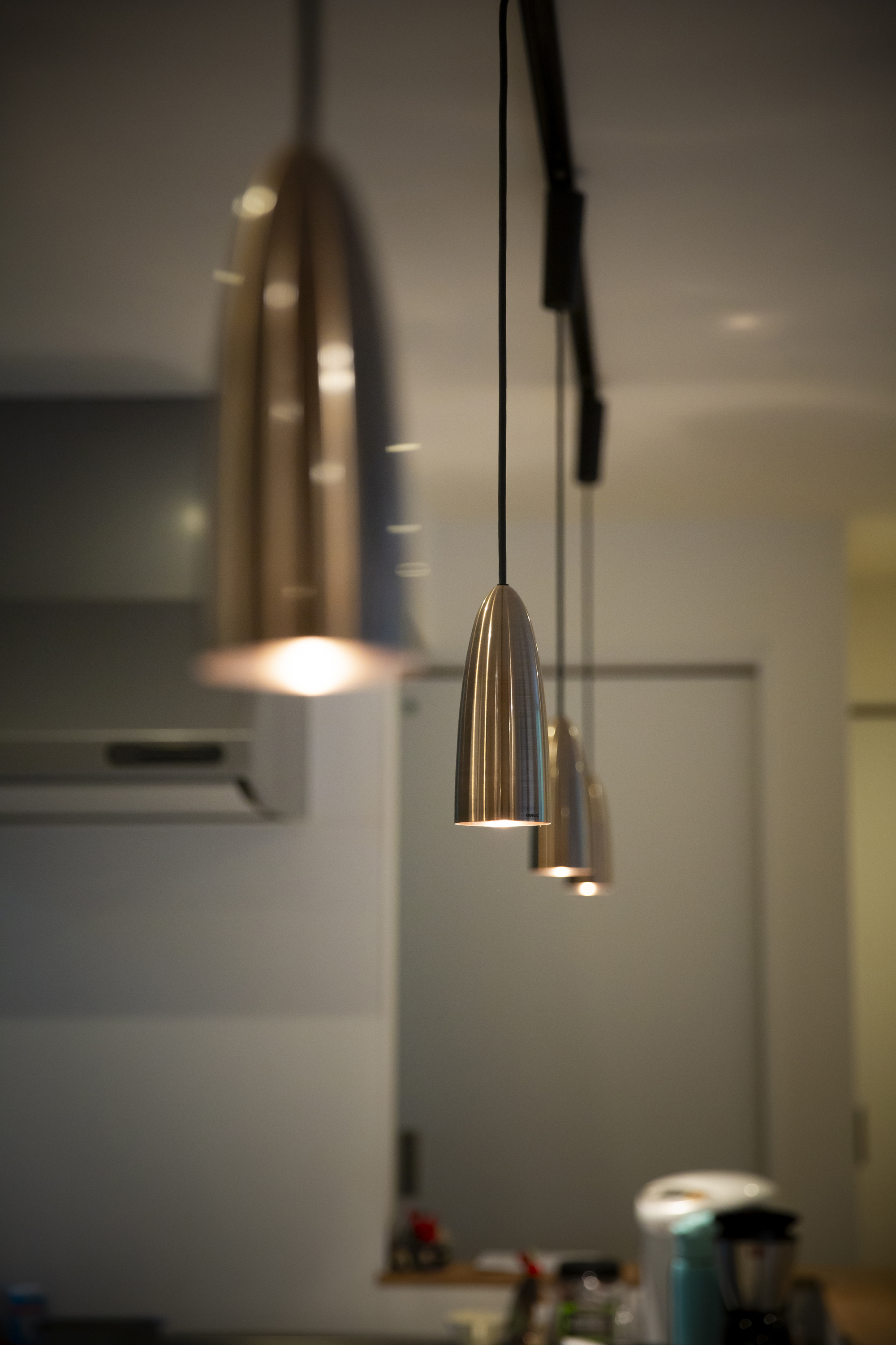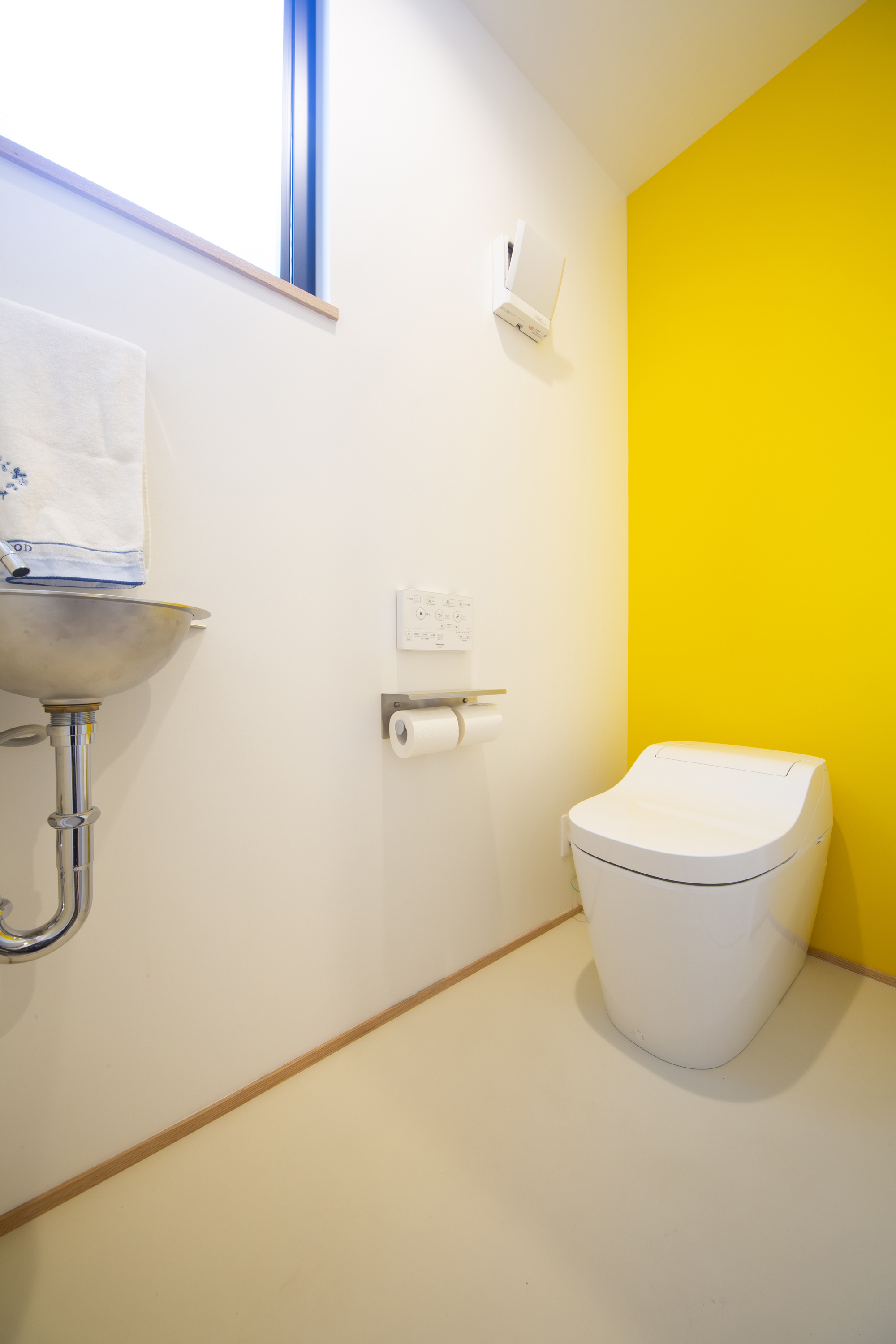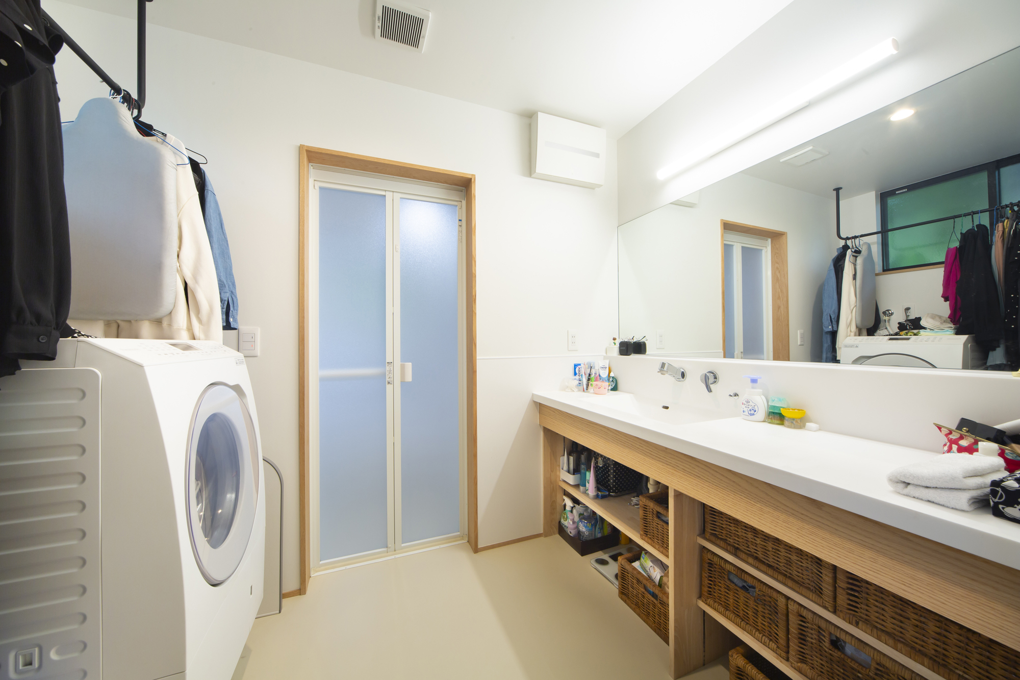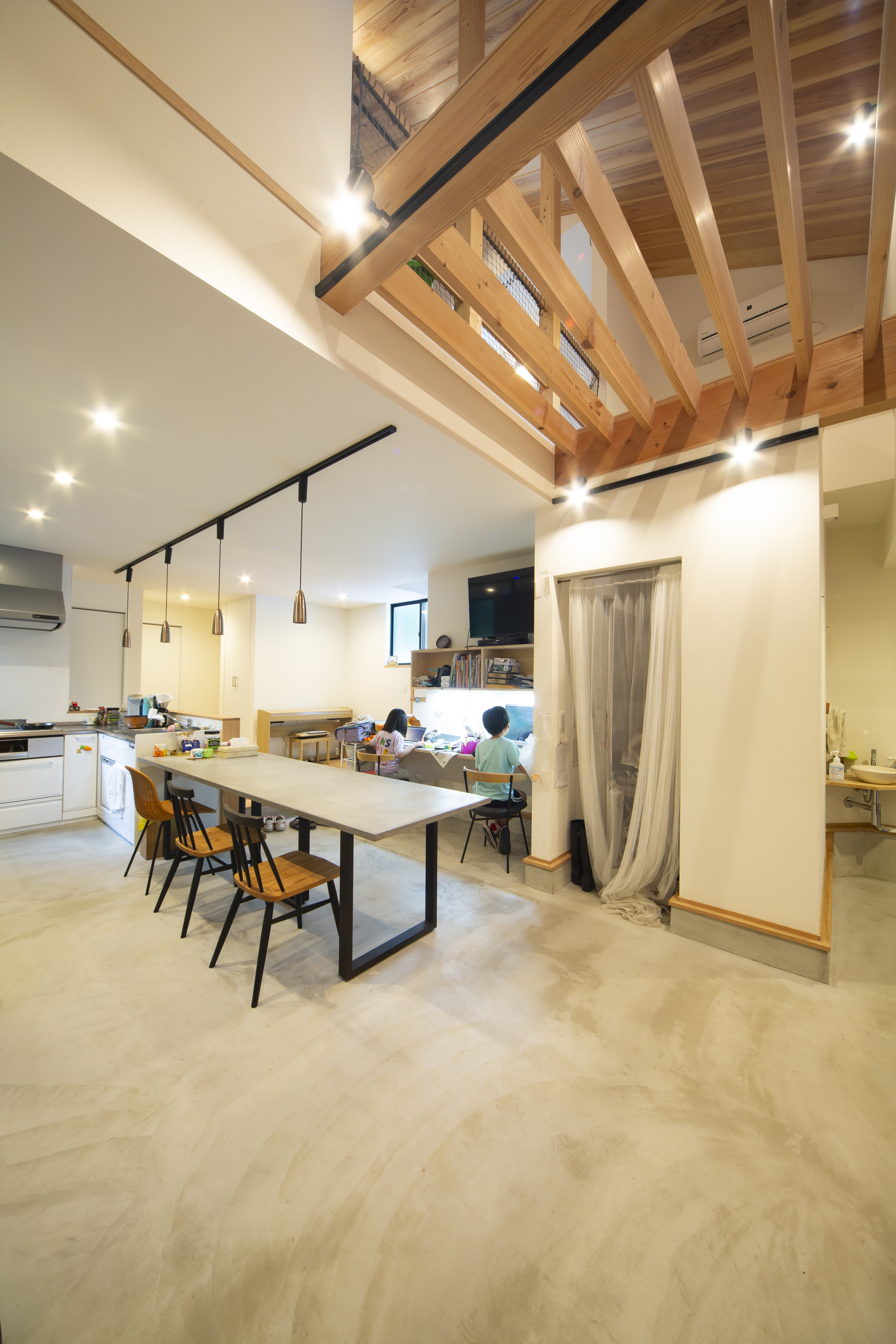 室内は玄関からリビングまで広い土間空間となっており、寒い冬も家中温かい薪ストーブを囲む配置となっています。リビングに併設したワークスペースでお子さんが勉強をしたり、薪ストーブでピザを焼いて愉しい食卓を囲んだりと自然と家族の集う空間です。モールテックスのZENオリジナルダイニングテーブルや吹抜けの化粧格子、お気に入りのペンダント照明など、外観からは想像がつかないモダンなインテリアデザインに遊び心とライフスタイルを感じる住まいとなっています。