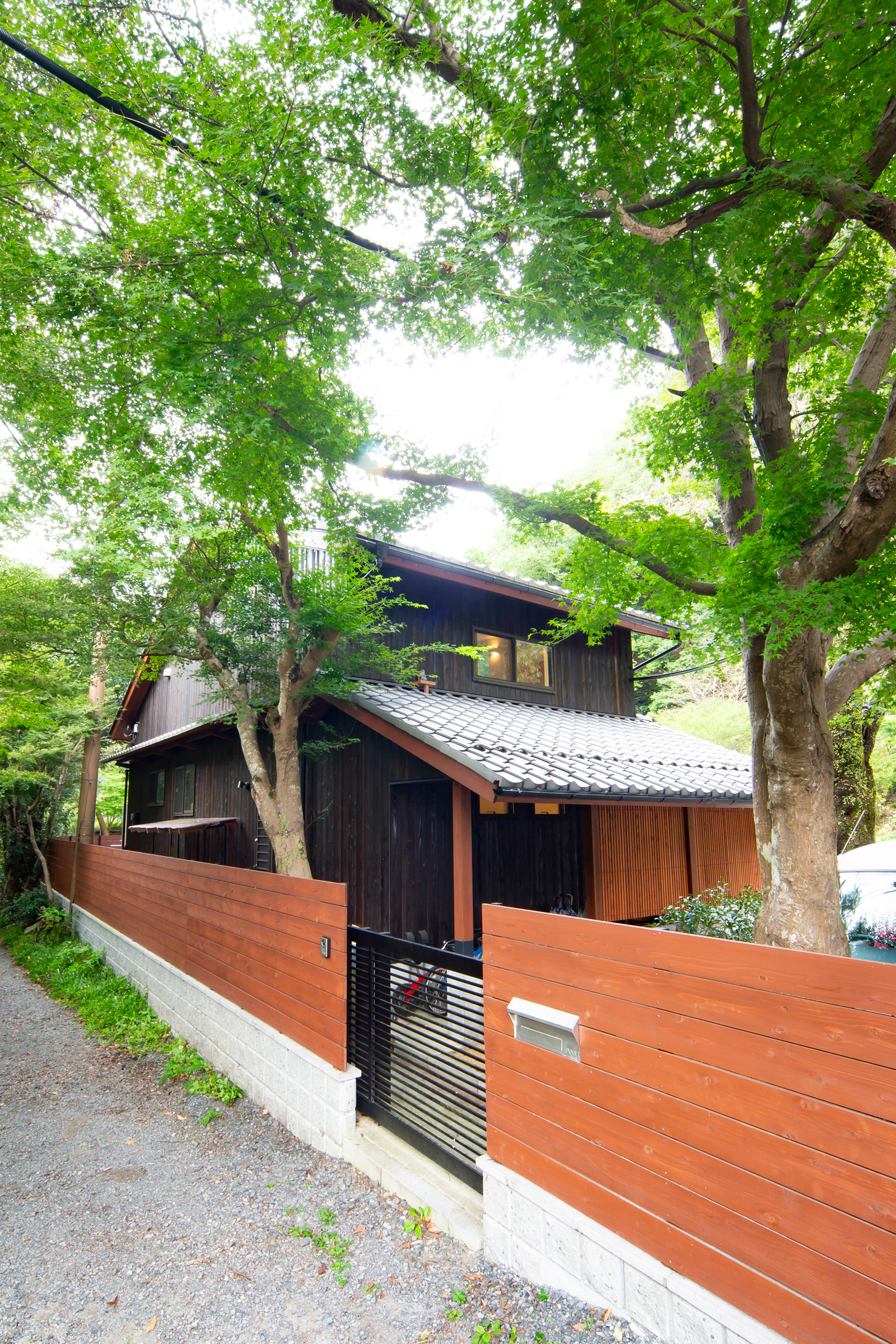昔からそこにある樹木を活かし枝木の間から瓦屋根と焼杉の外壁が控えめに佇んでいます。
