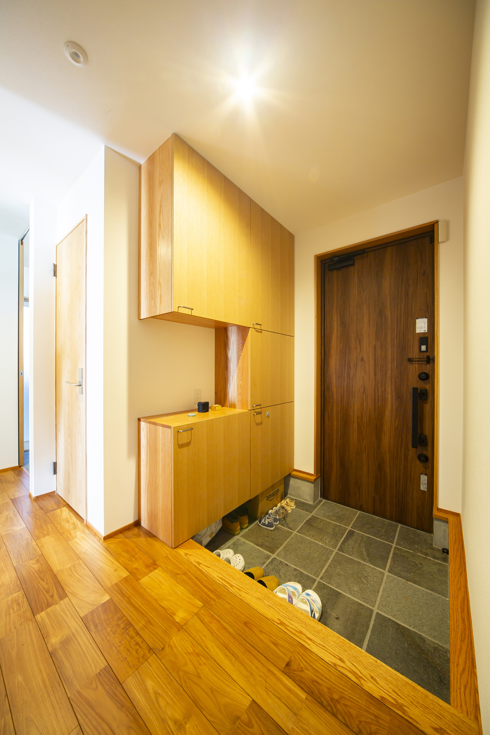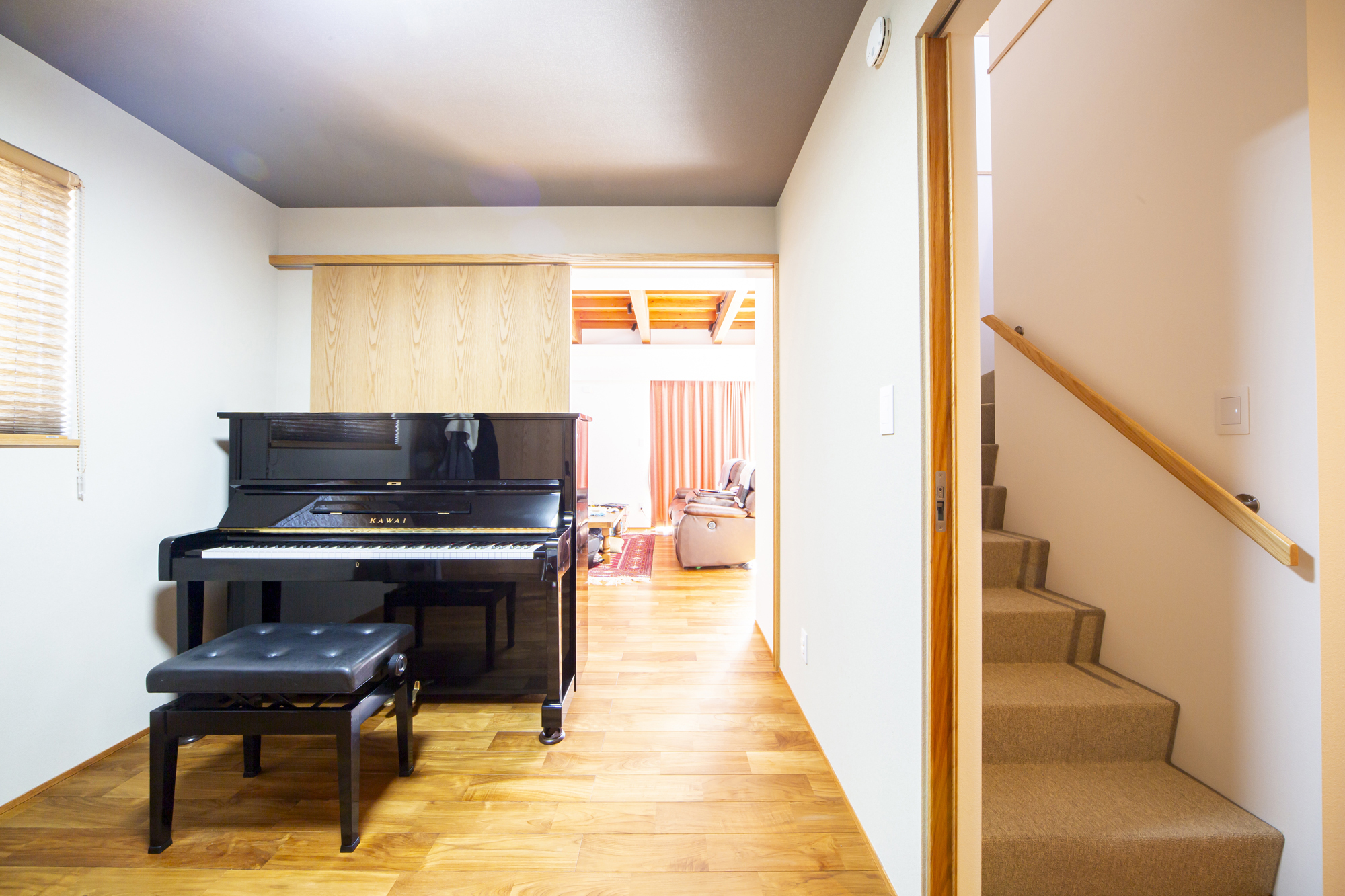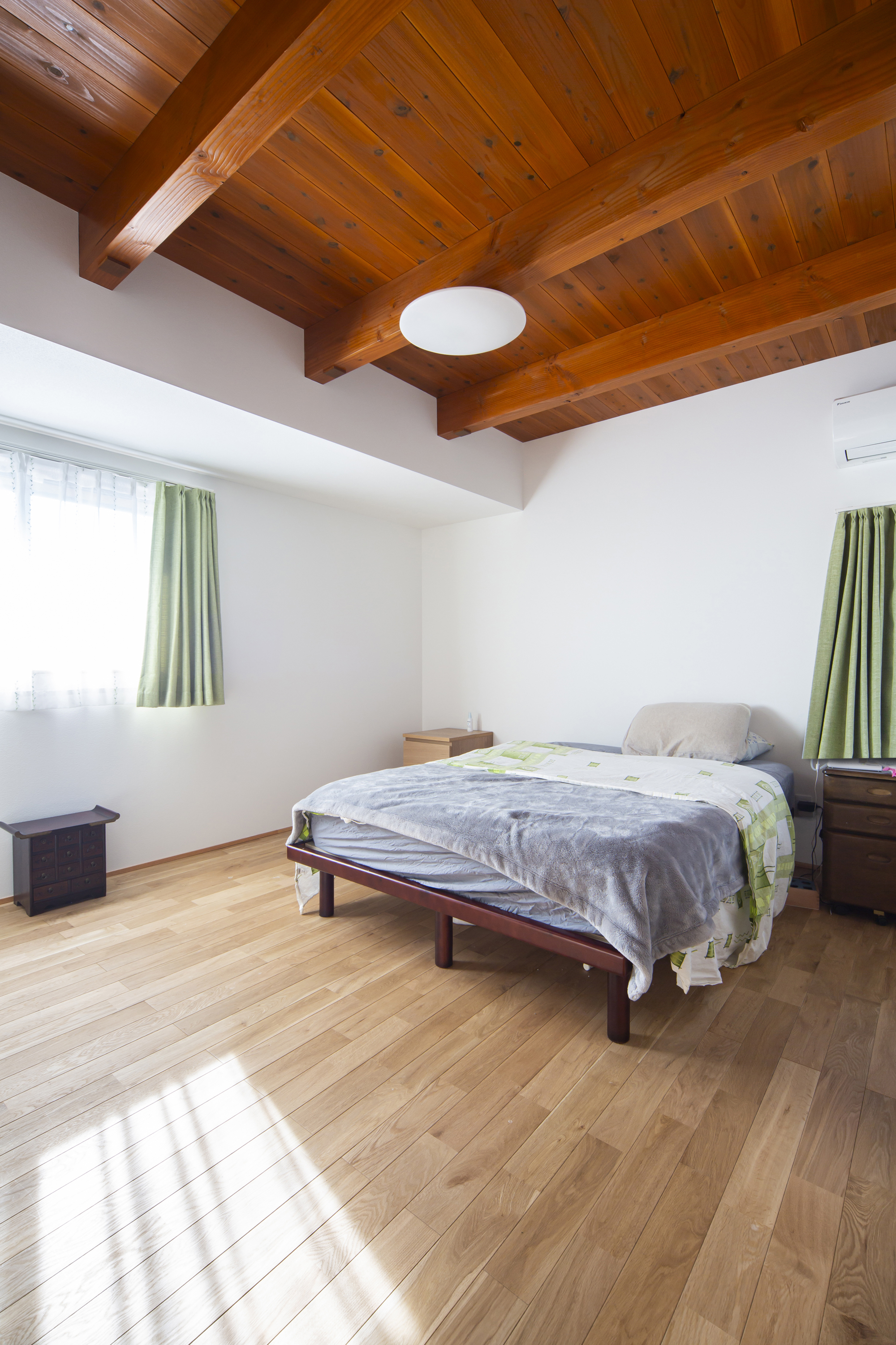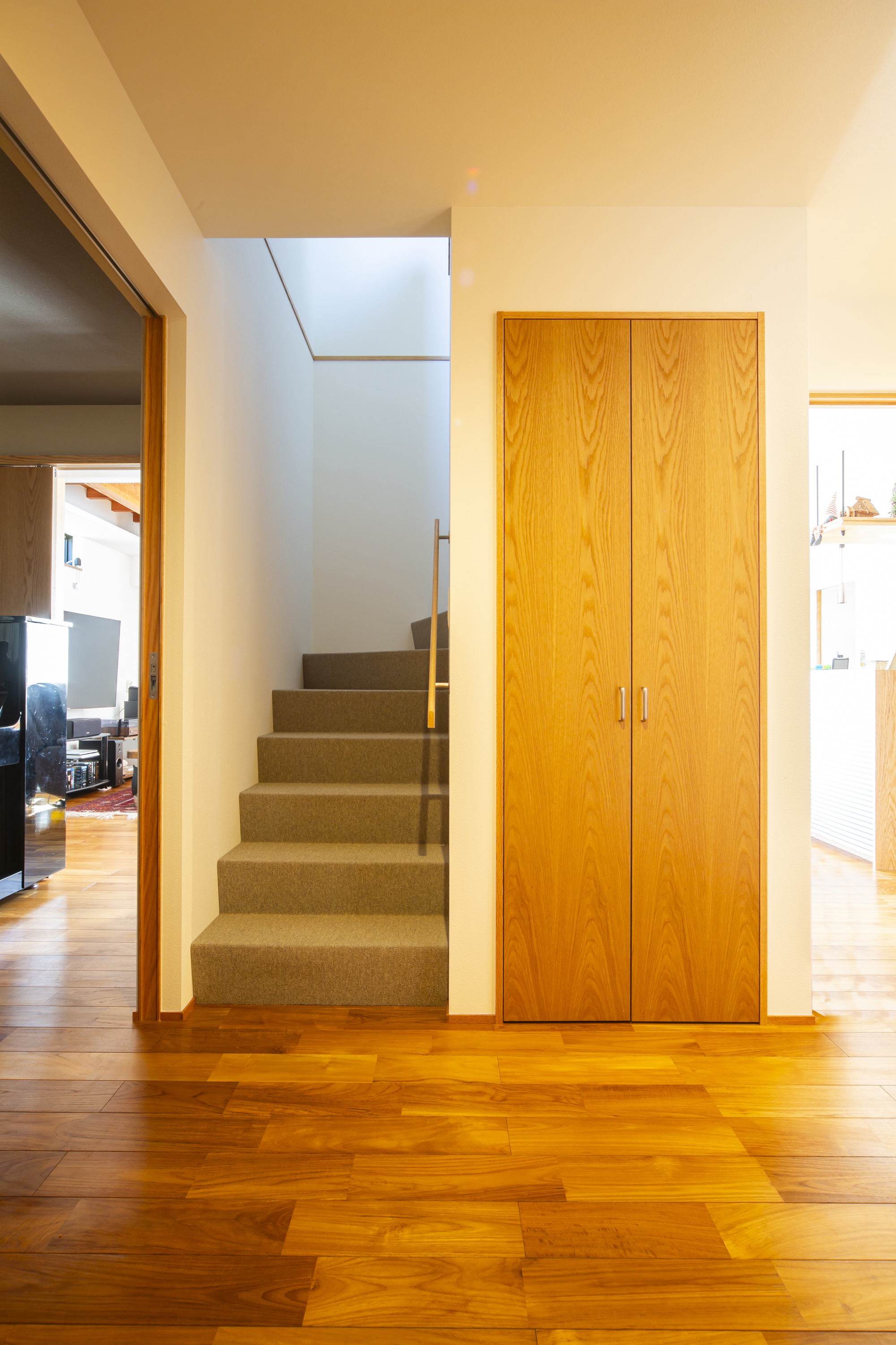 チークフローリングや杉板天井、カーペット敷などで仕上げた上質な空間は、シンプルながらも経年変化を愉しみながら暮らせる住まいに仕上がっています。