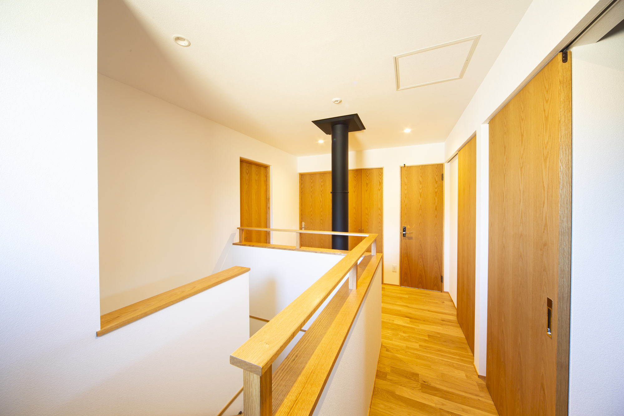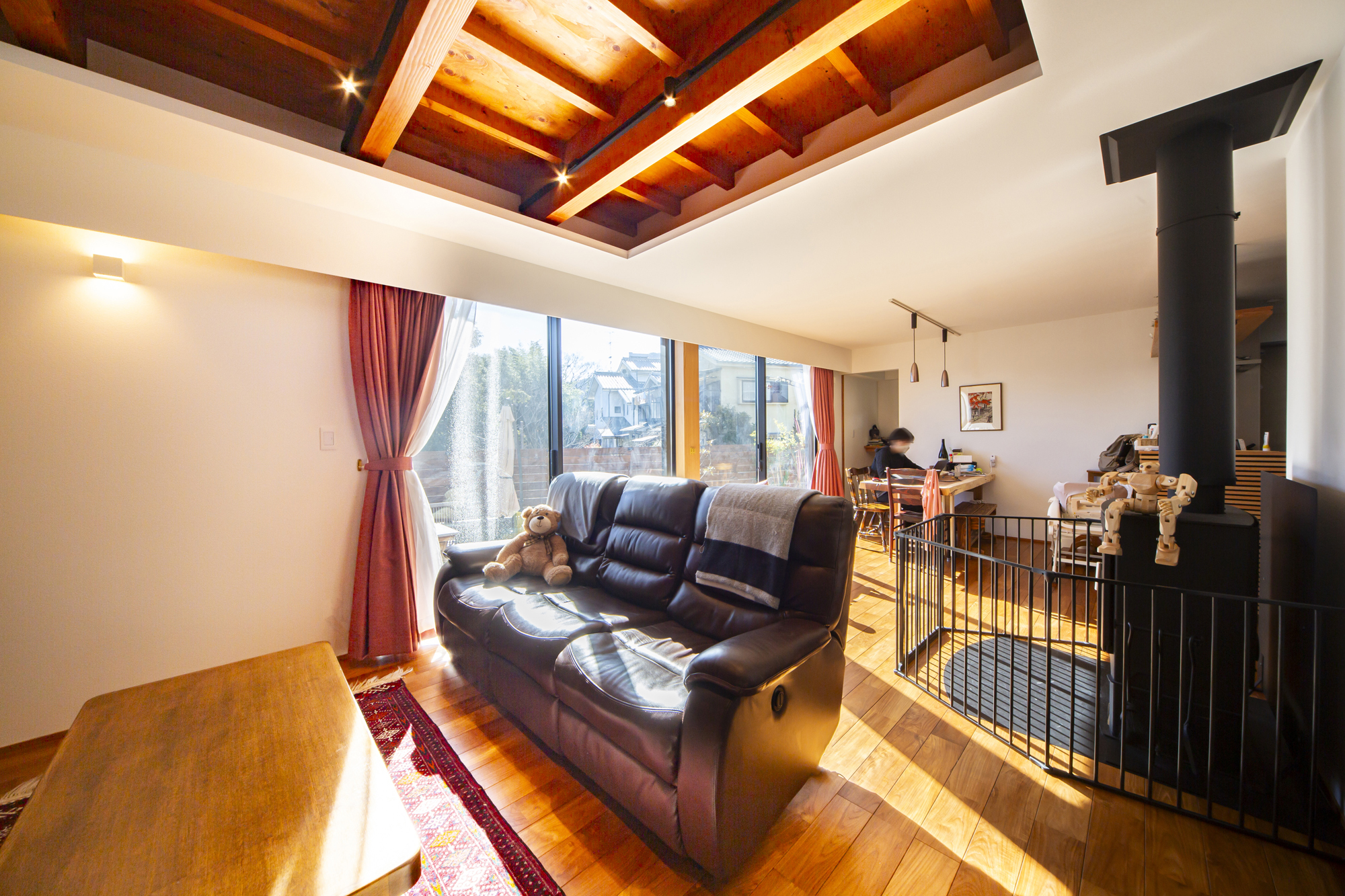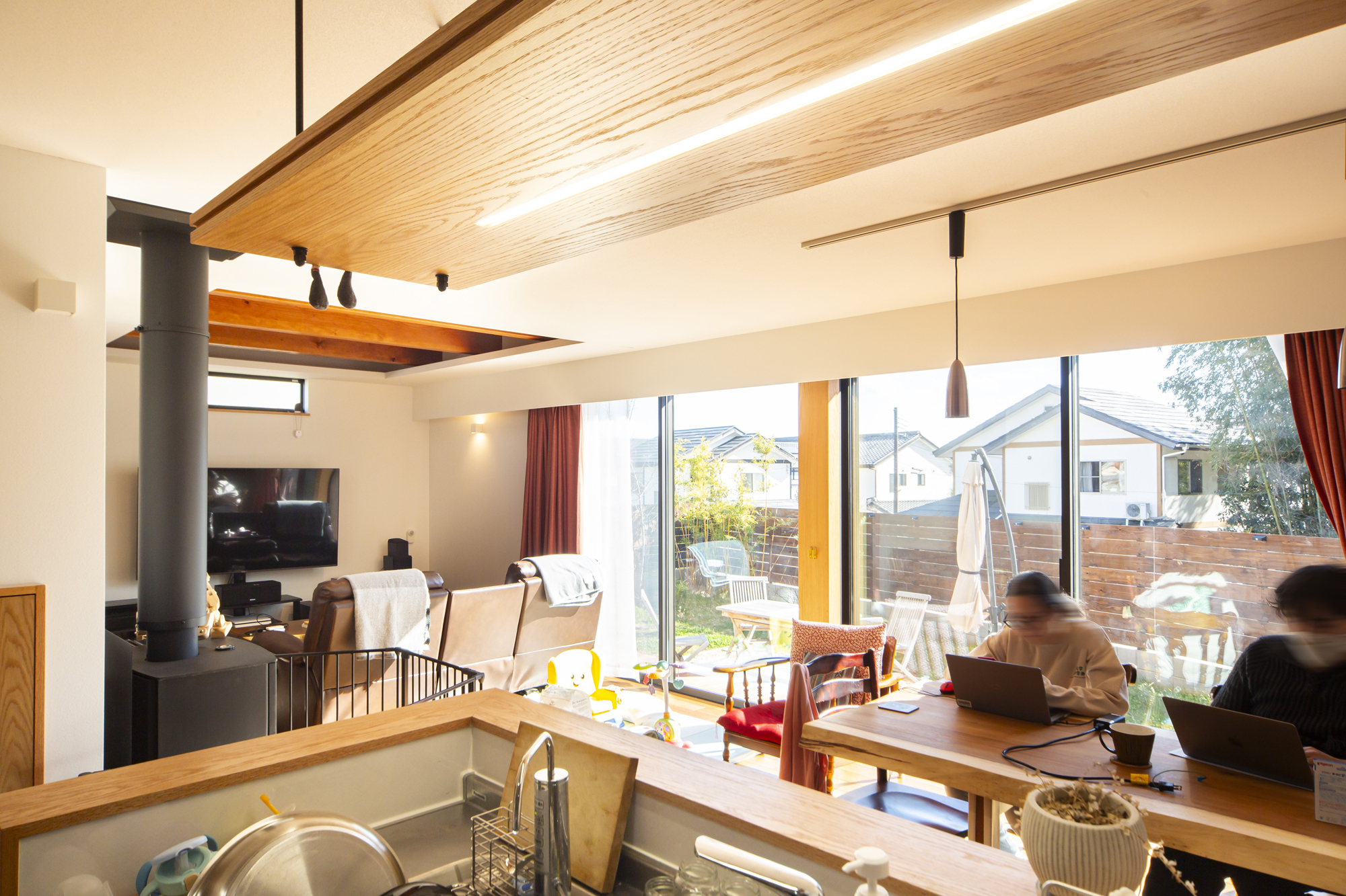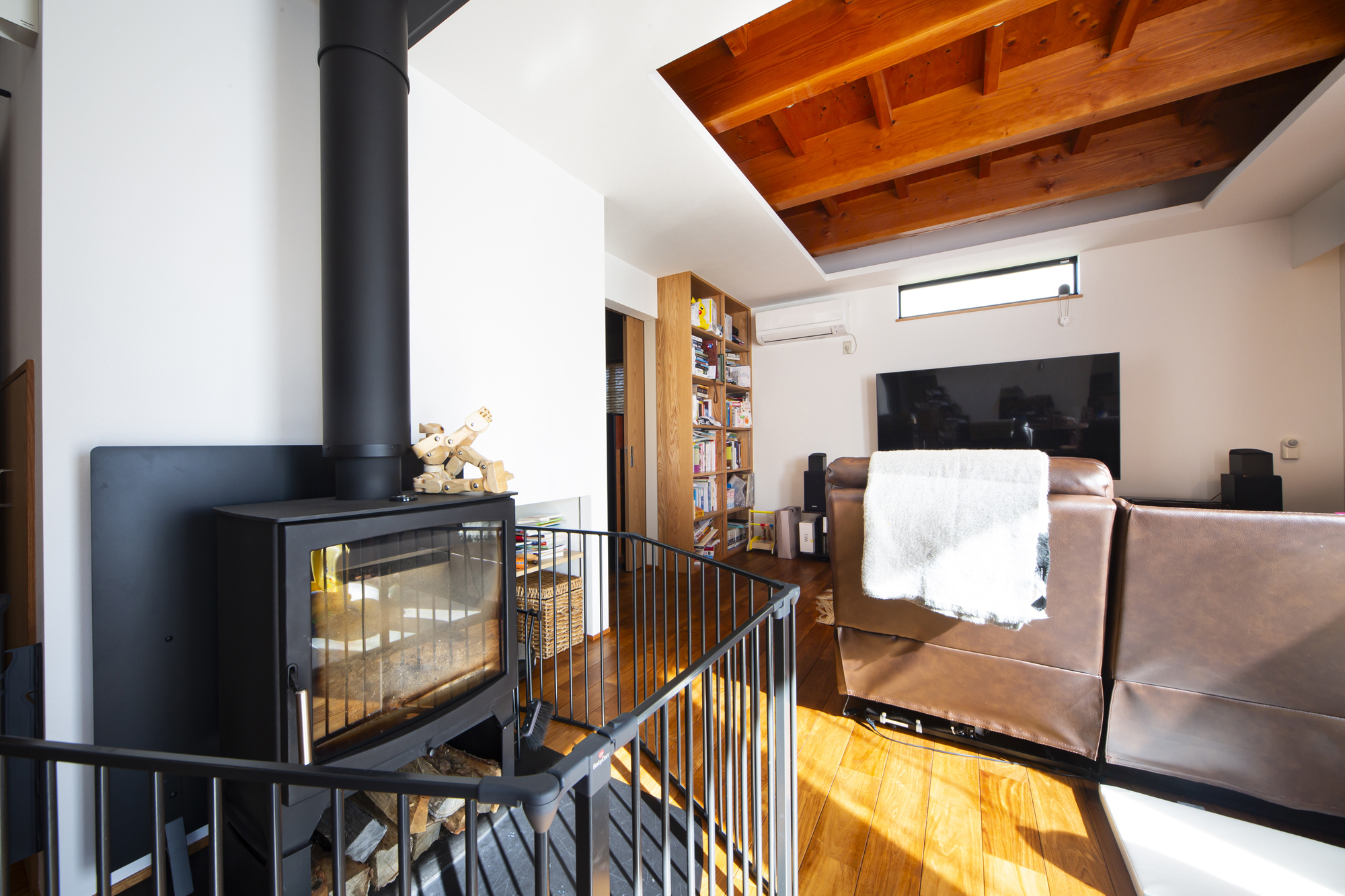 薪ストーブを中心に回遊動線のある1階リビングスペースは、構造の梁を現しにした折り上げ天井や、外壁面に連続するデザインカーテンBOXなど細かな工夫で空間にメリハリをつけています。