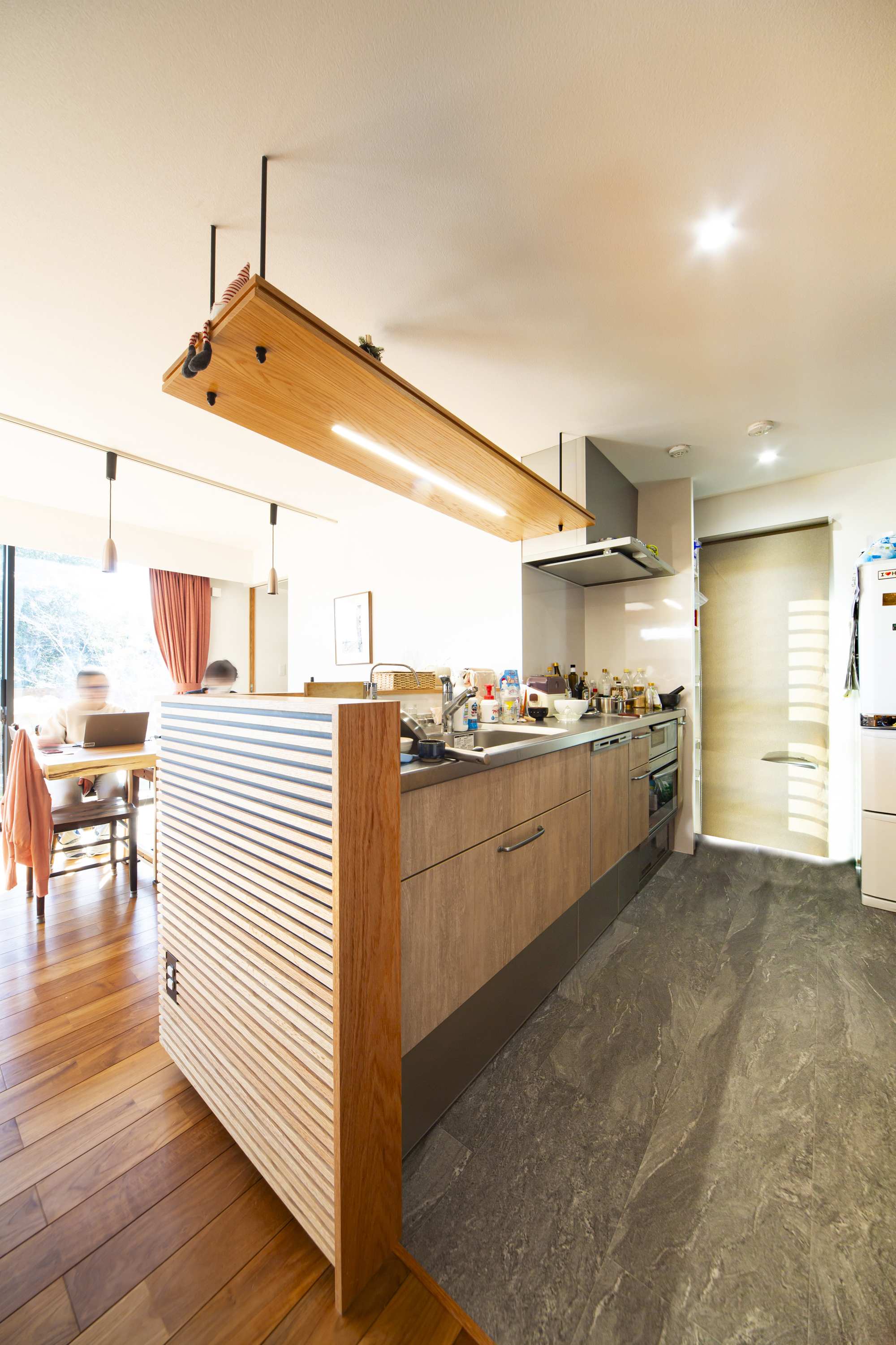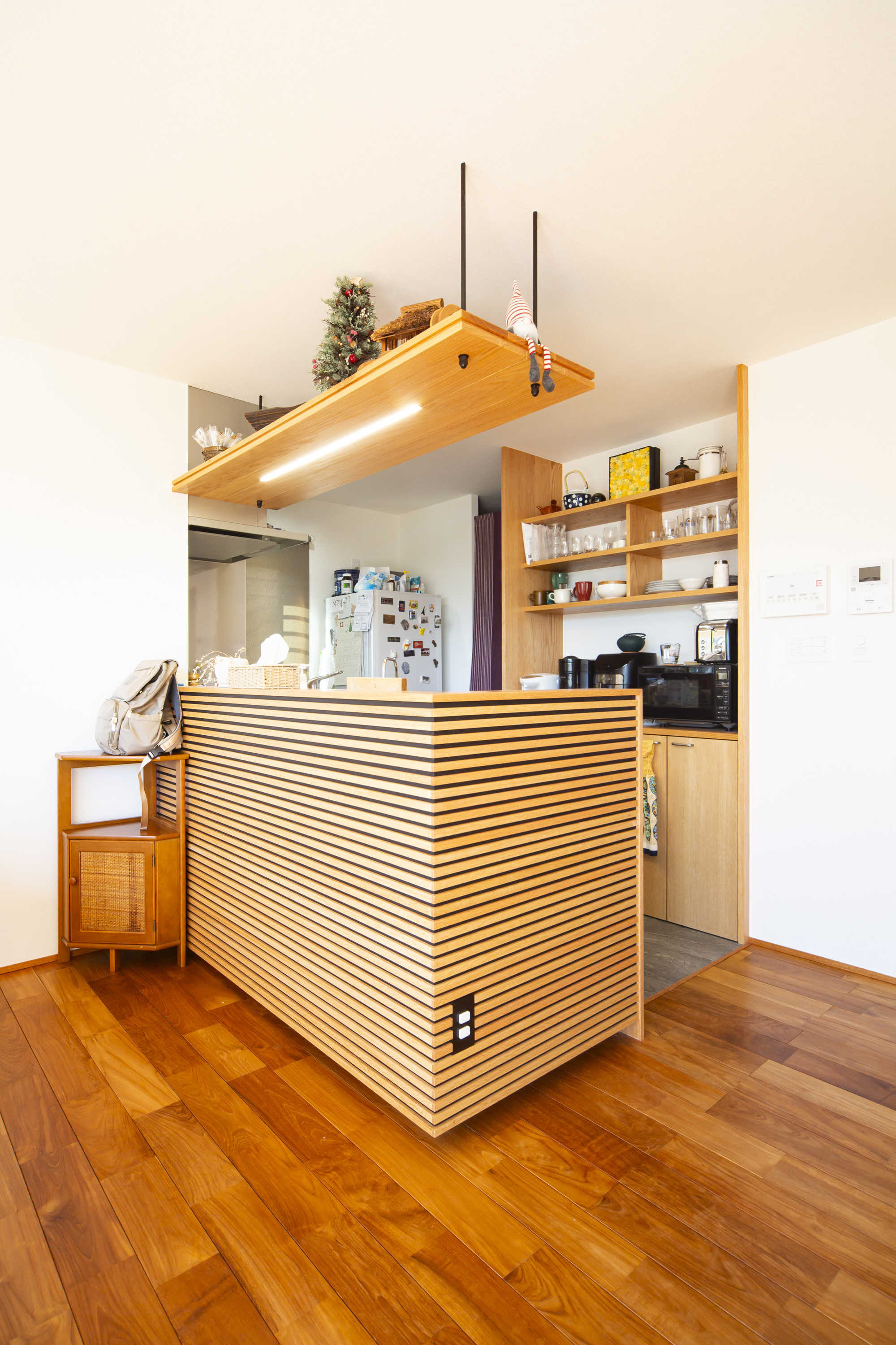 キッチンは使い易さやコストメリットを考慮し、既成のシステムキッチンを採用しながらもリビング側からの意匠性を考え横格子デザインの腰壁でカバー。
