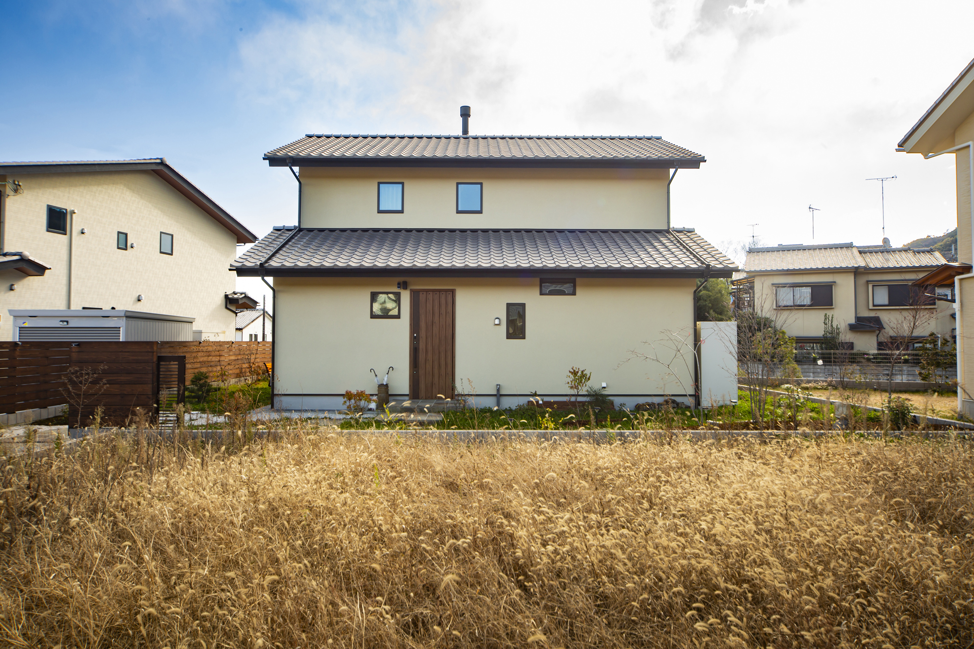敷地面積に対して建築面積が20%までという風致地区の中でも制限の厳しいエリアに建つ2階建ての住まい。その分、庭が広く活用できたり、隣家が離れて建つため住環境は恵まれています。