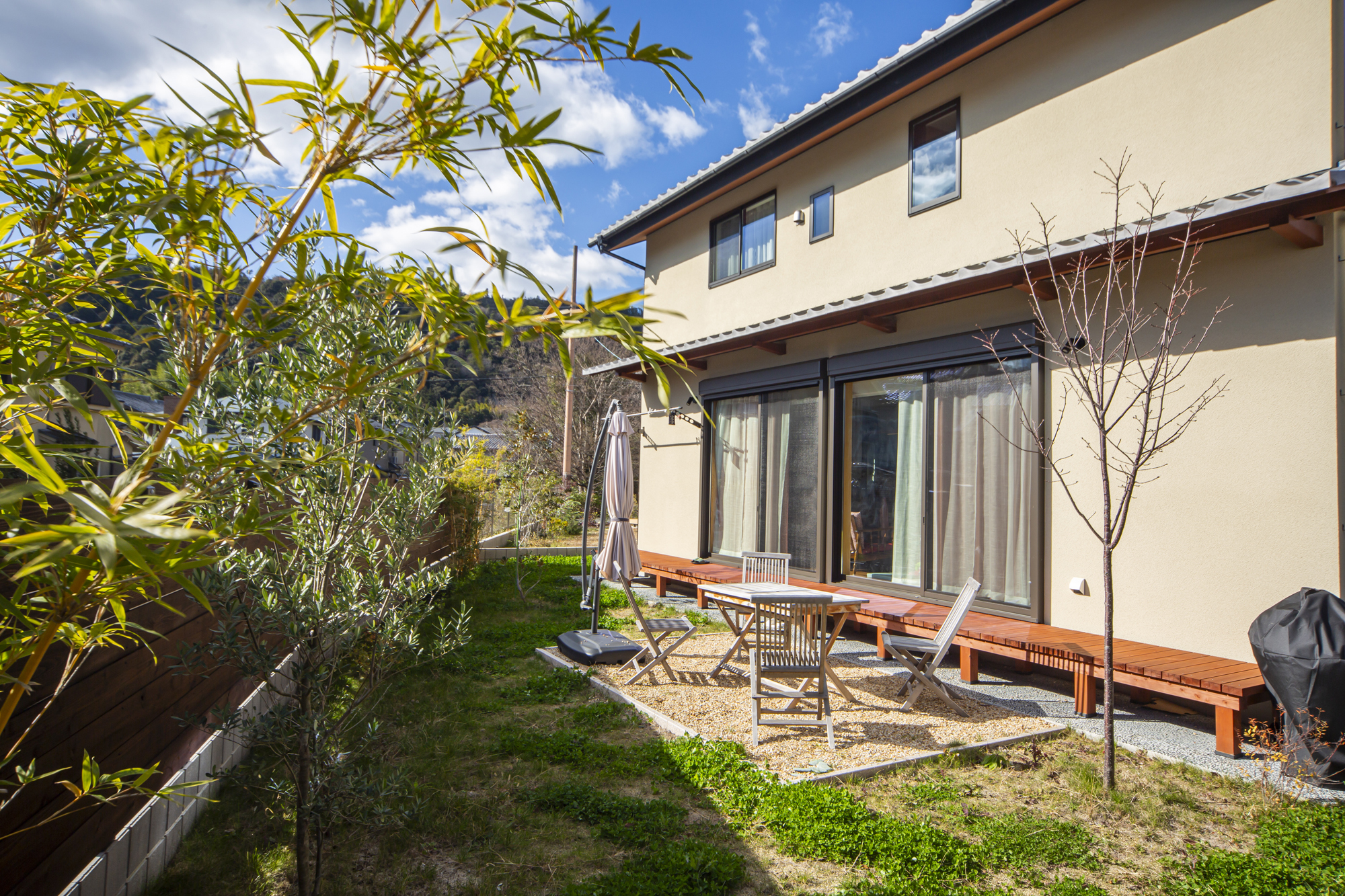 引っ越し時には最低限生活に必要な動線の外構や、大きな庭木を造園屋さんにお願いし、クローバーや石敷の小路はお施主様自身が住まいながら愉しんでコツコツ造り進めています。