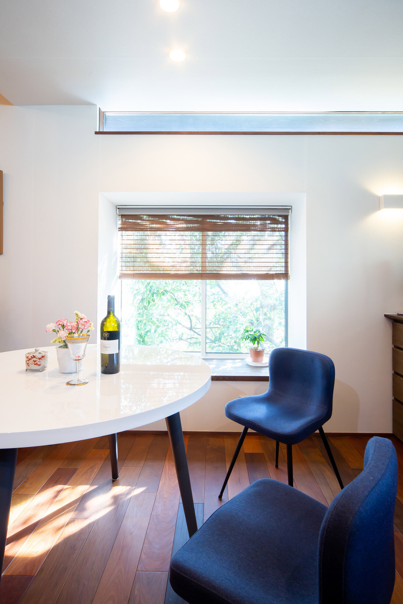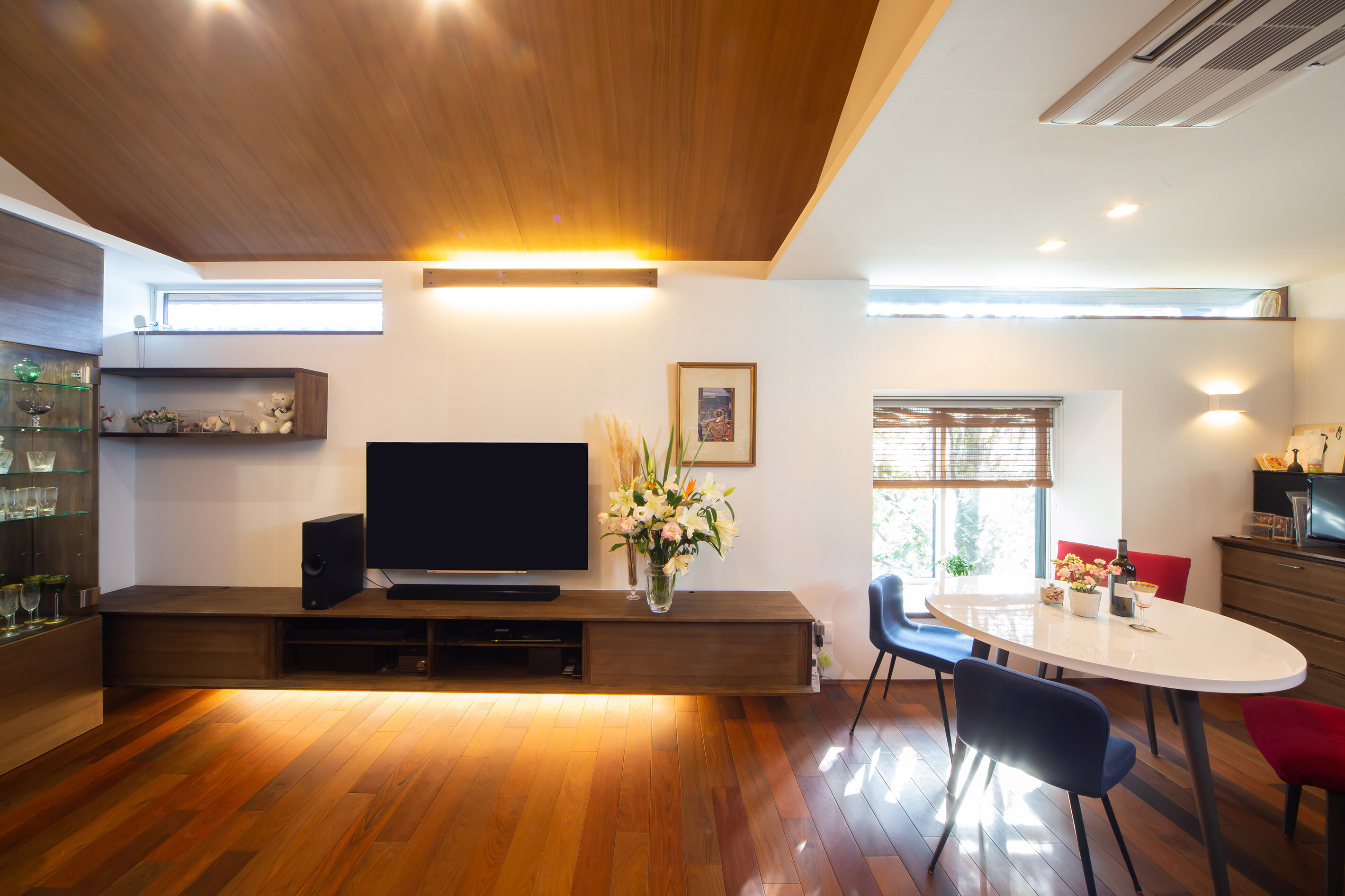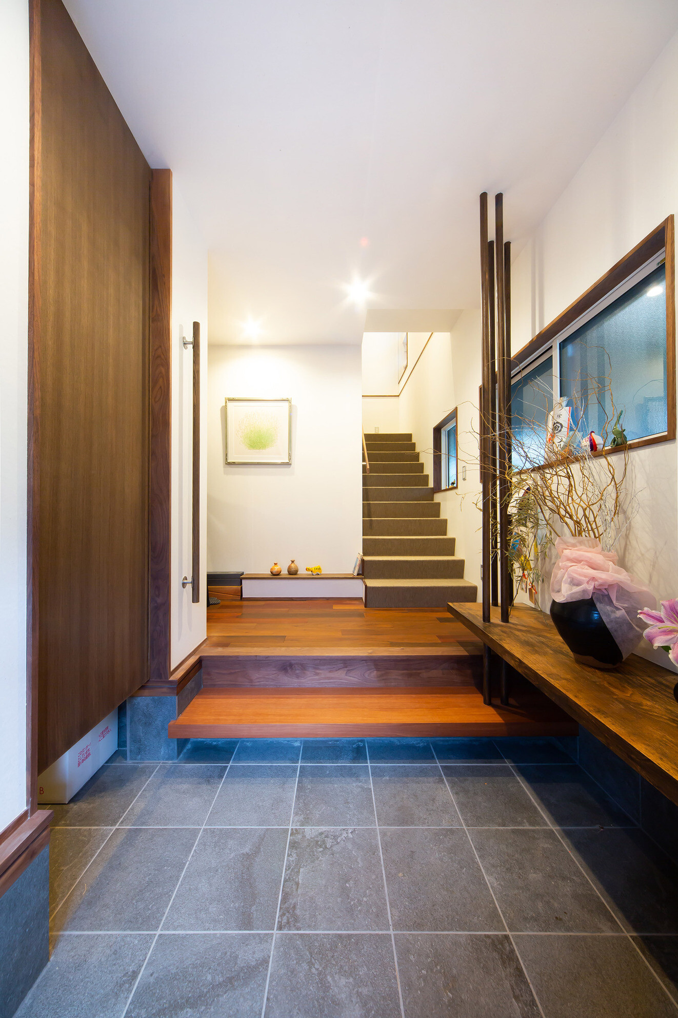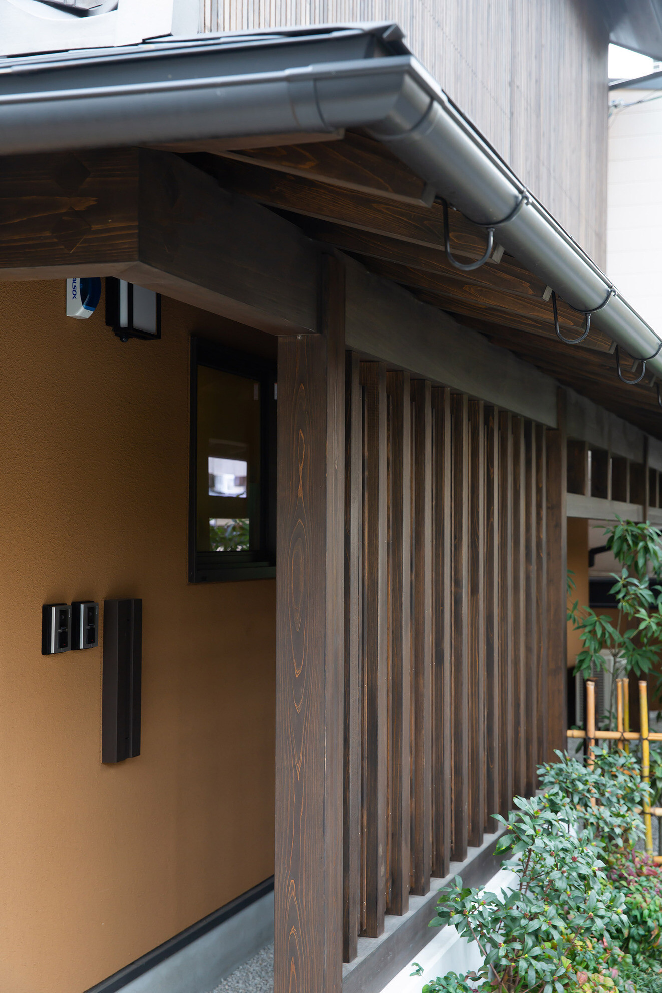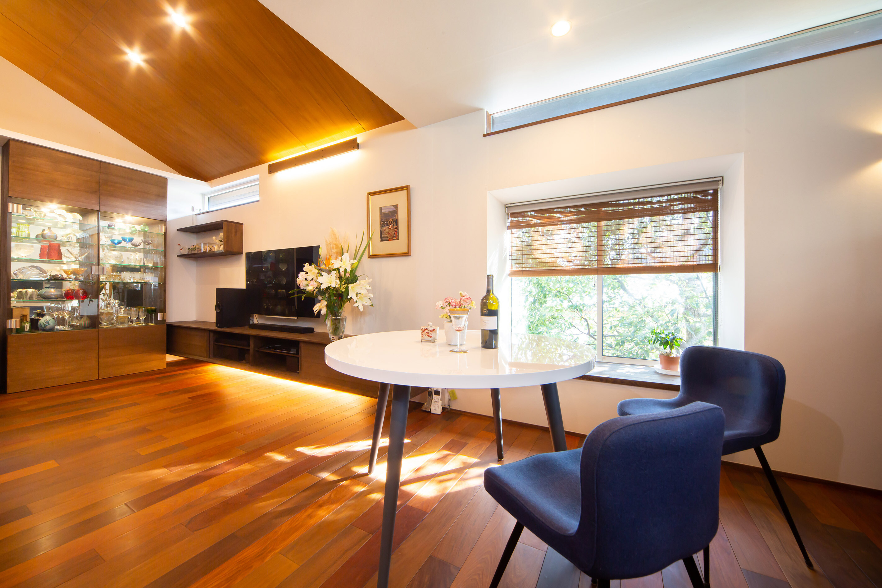 嵐山の観光地にある戸建て住宅。外観は景観に溶け込むように和風意匠。内部空間は落ち着いた色味のイペの床材と和紙で仕上げた壁を基調とし落ち着きある空間にまとめました。ホームエレベーターで2階に上がれば出窓越しにそそぐ柔らかな光と緑が食卓に華を添えています。
