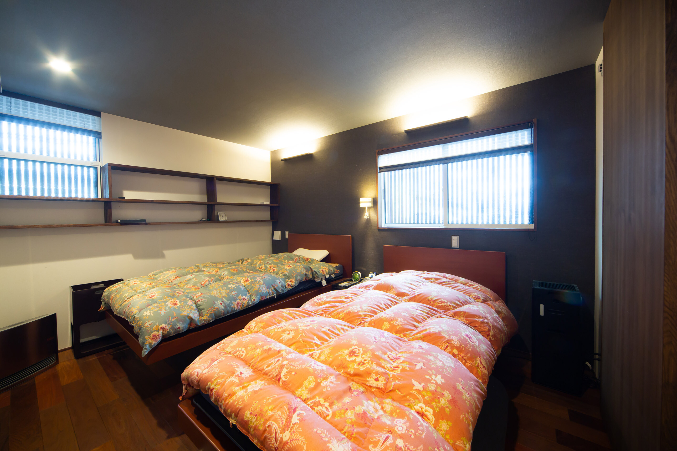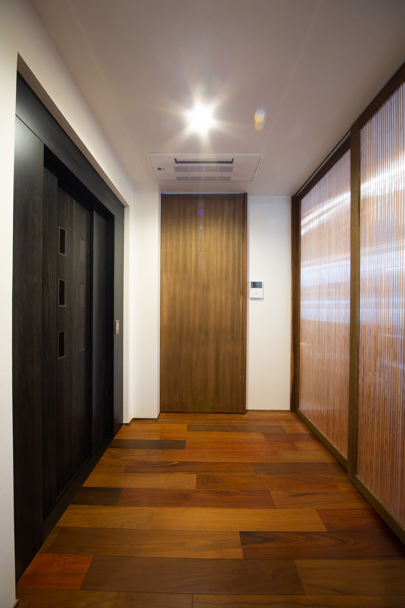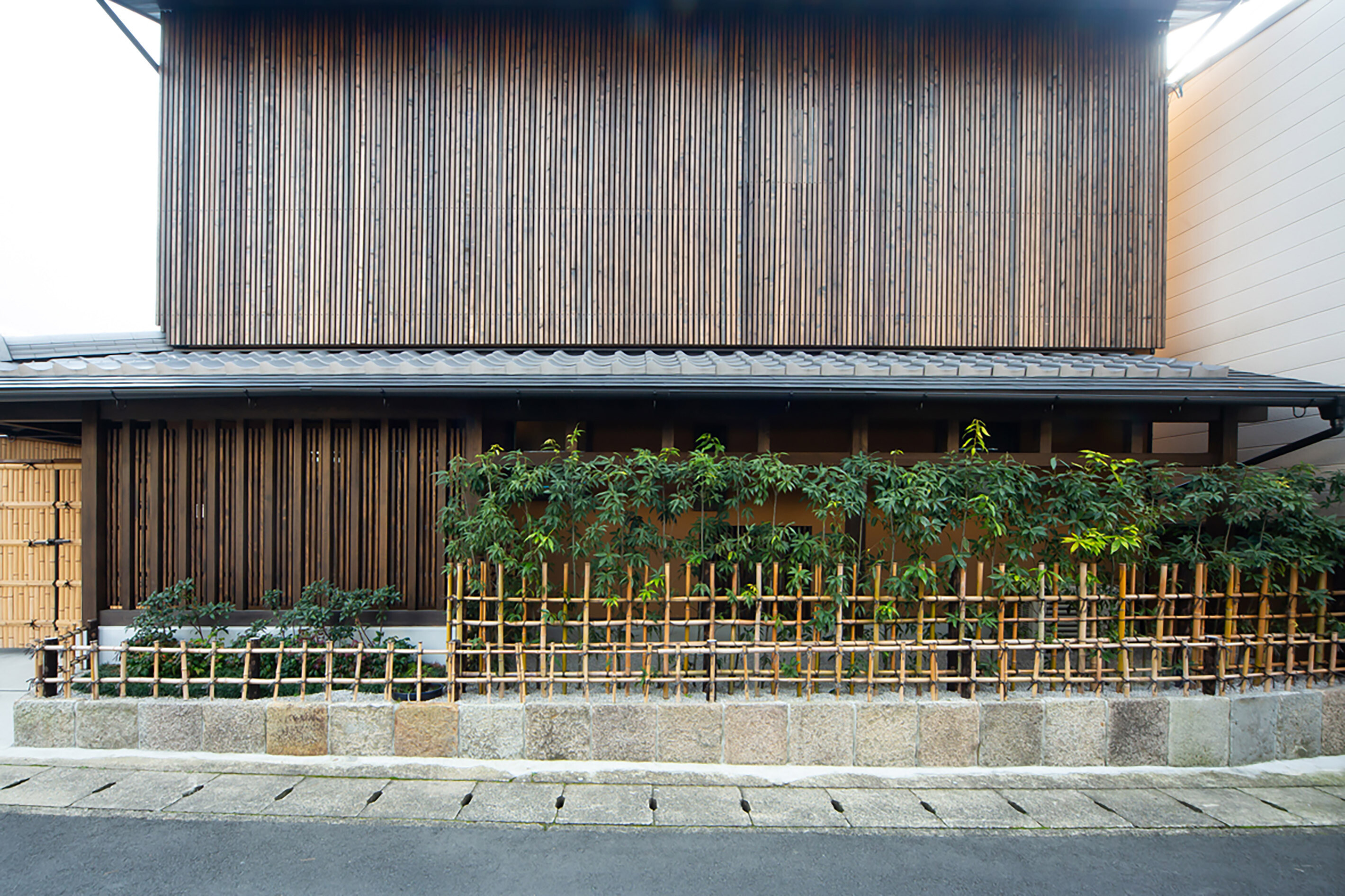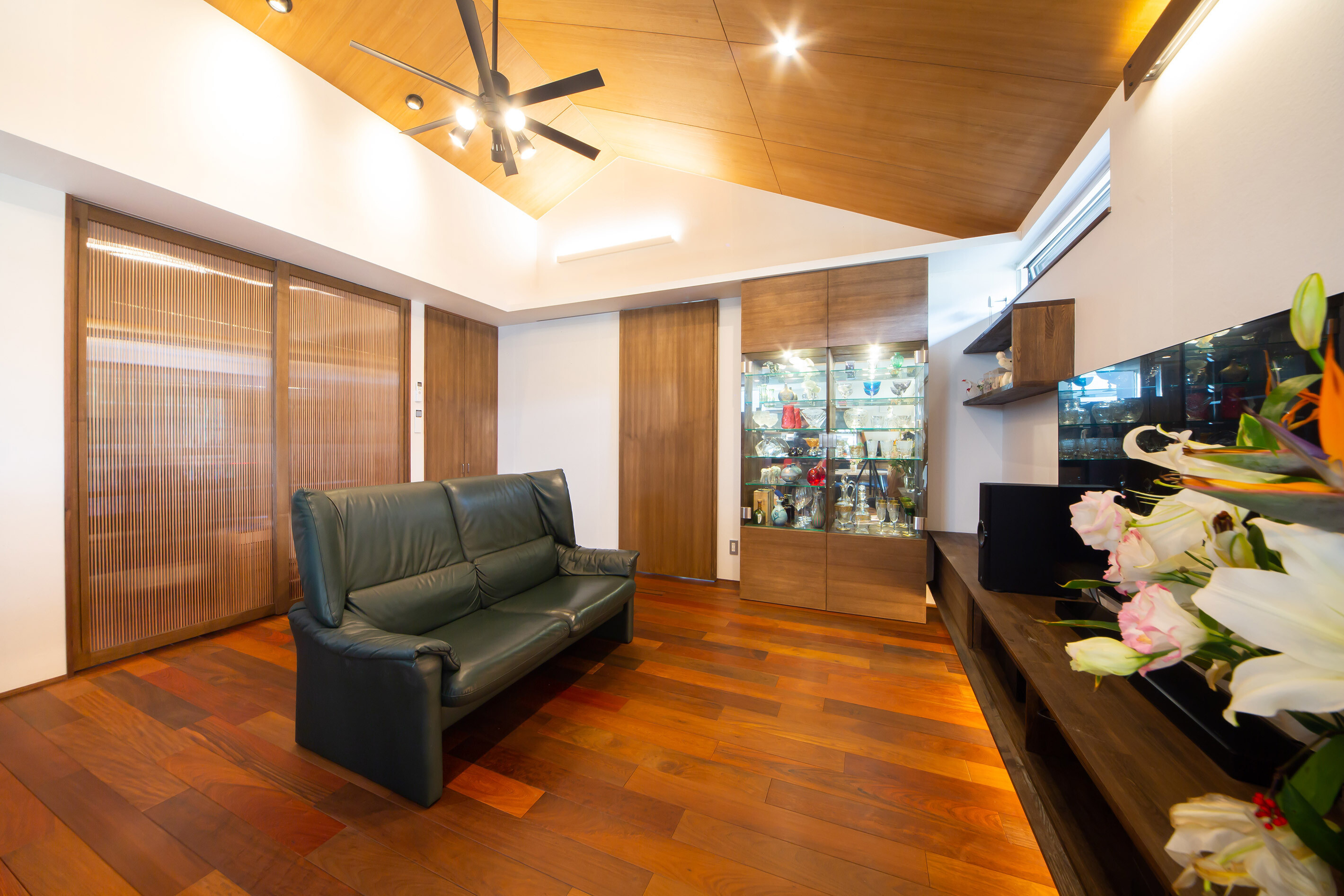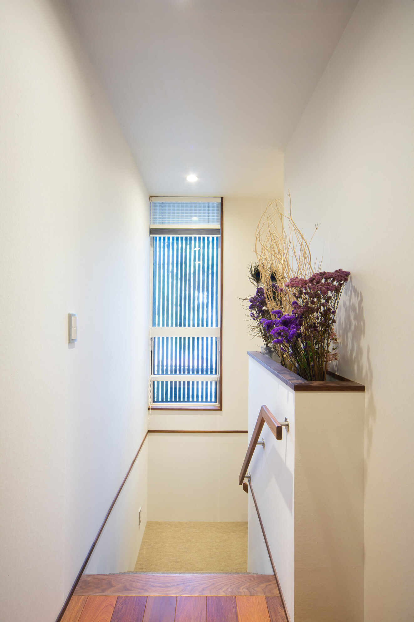 嵐山の観光地にある戸建て住宅。外観は景観に溶け込むように和風意匠。内部空間は落ち着いた色味のイペの床材と和紙で仕上げた壁を基調とし落ち着きある空間にまとめました。ホームエレベーターで2階に上がれば出窓越しにそそぐ柔らかな光と緑が食卓に華を添えています。