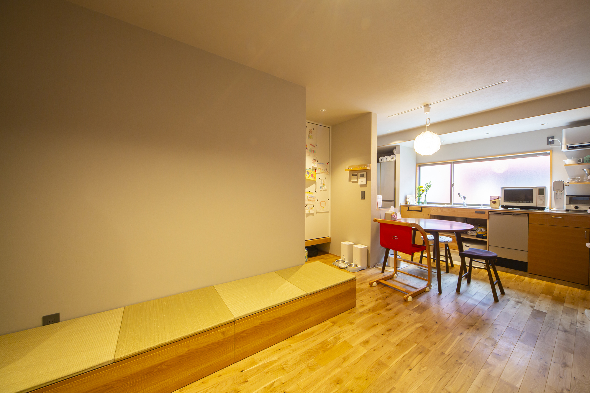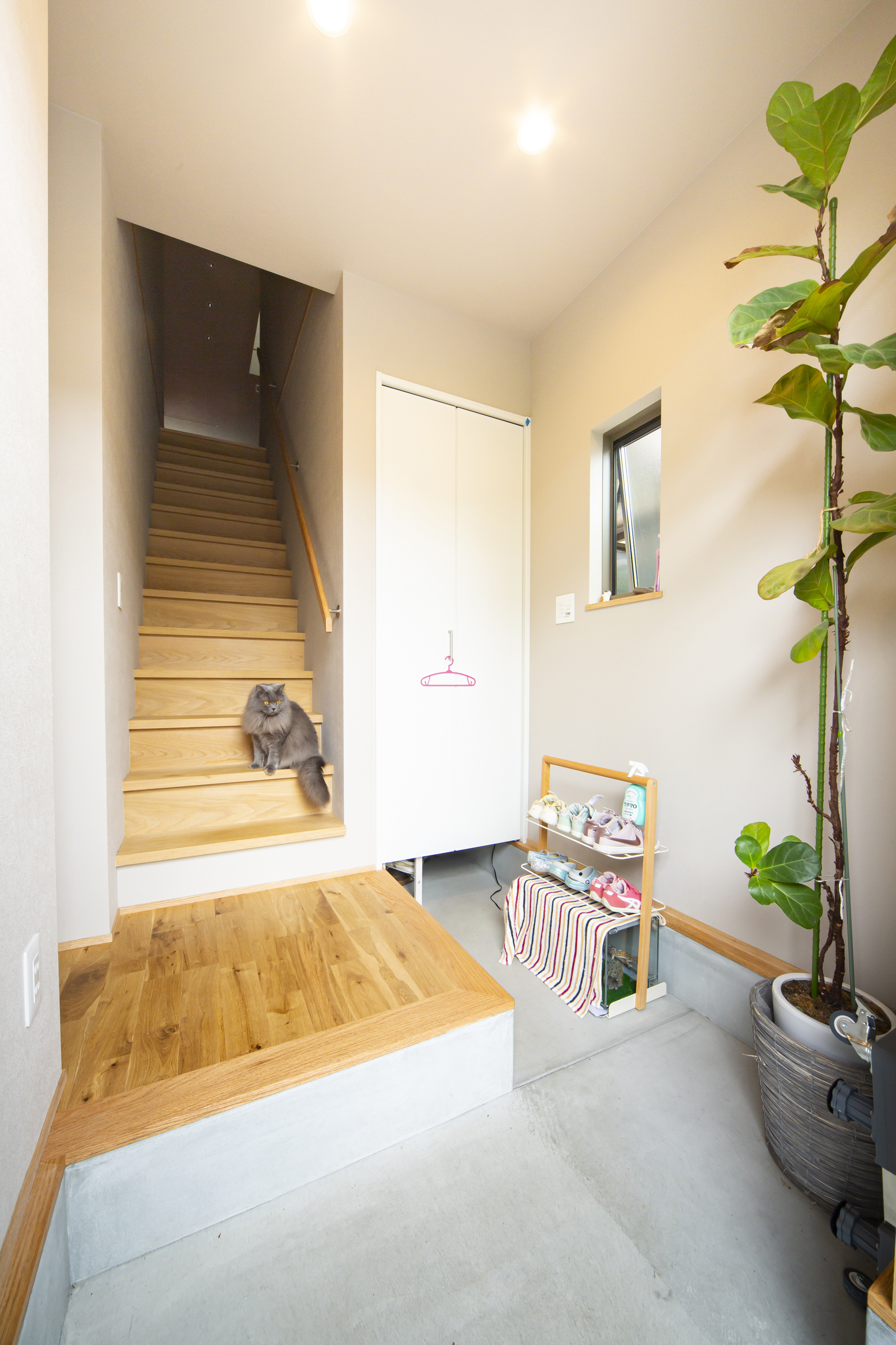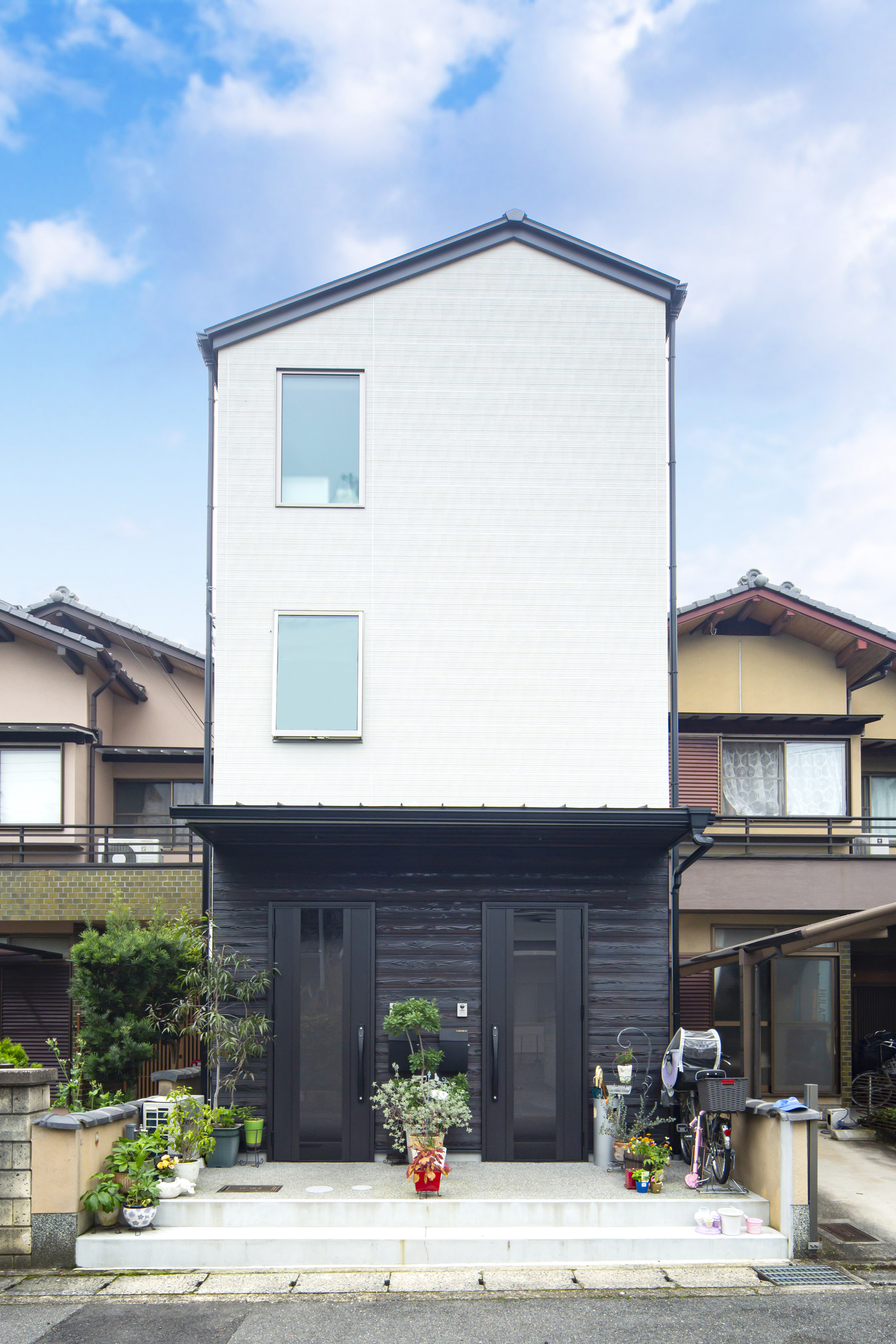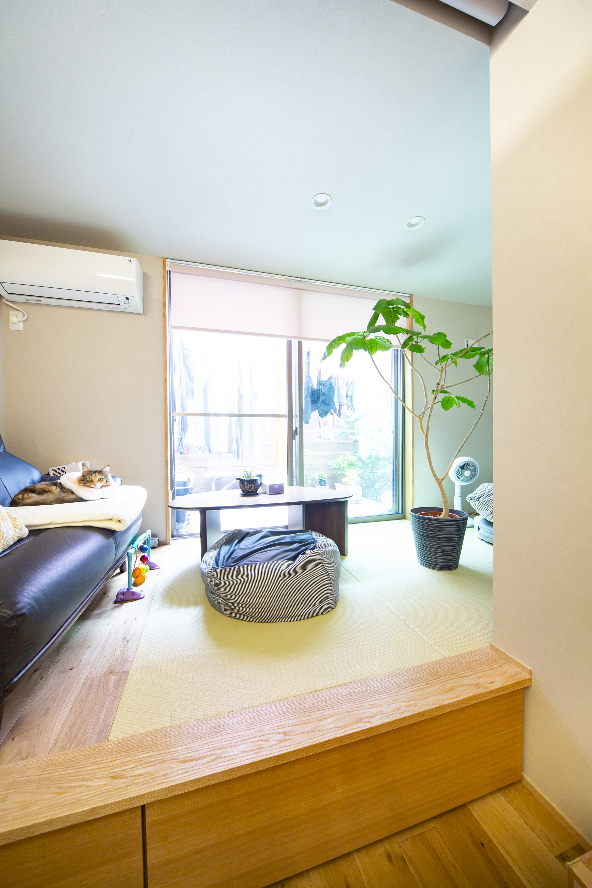 22坪ほどの敷地に親世帯(父母+猫)と子世帯(夫婦・子供2人・猫2匹)が暮らす2世帯住宅をつくりました。建物間口が4mに対して、玄関や水廻りを別にした完全二世帯住宅としながら各世帯が快適に暮らすための明るさや広さの確保が課題でした。そこで階段を2基計画し親世帯:1F+2F、子世帯:2F+3Fとしてそれぞれの階段の下を収納やトイレとすることで有効な空間を生み出しました。このようにして各世帯が外部に接してきちんと光の入る空間にするなど、緻密に設計を重ねました。また両世帯とも愛猫が家族の一員として一緒に暮らしています。猫ちゃんたちが快適に暮らせる工夫も随所に設けています。例えば子世帯の吹抜けには猫ちゃんのためのキャットウォークが設置されており、化粧梁の上を歩いて上階と下階を行き来できます。またレストルームを少し広めに作ることで猫ちゃんのトイレを設置するスペースを確保しました。このように猫ちゃんも家族の一員としてみんな快適に暮らせるようにデザインしているのです。二世帯住宅で大切なことは家族の距離感をどのようにカタチにするかということです。家族の距離感の在り方は暮らす人によってさまざまなので、丁寧にヒアリングして話し合いを重ねることでみんなが暮らしやすい家をつくることができます。