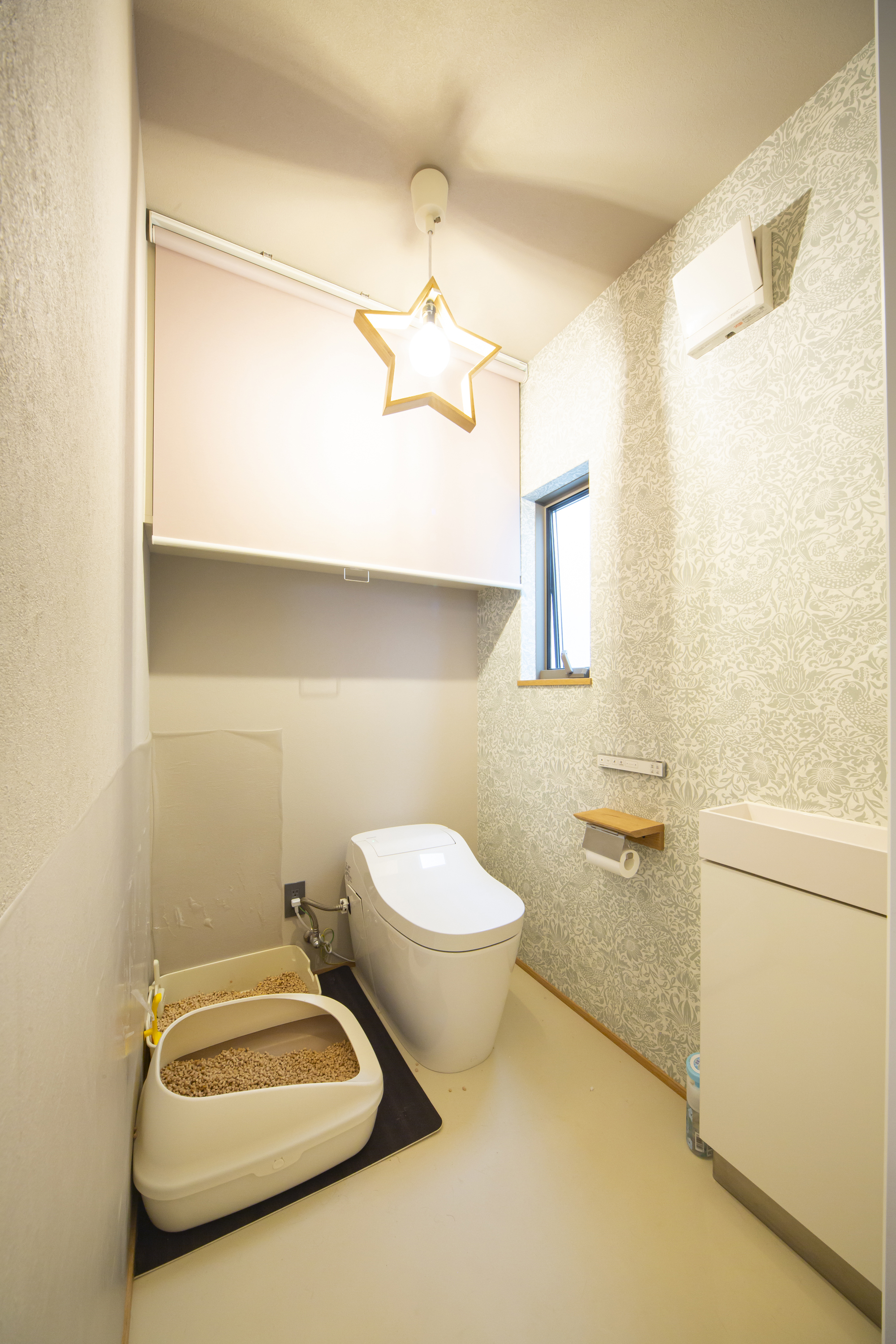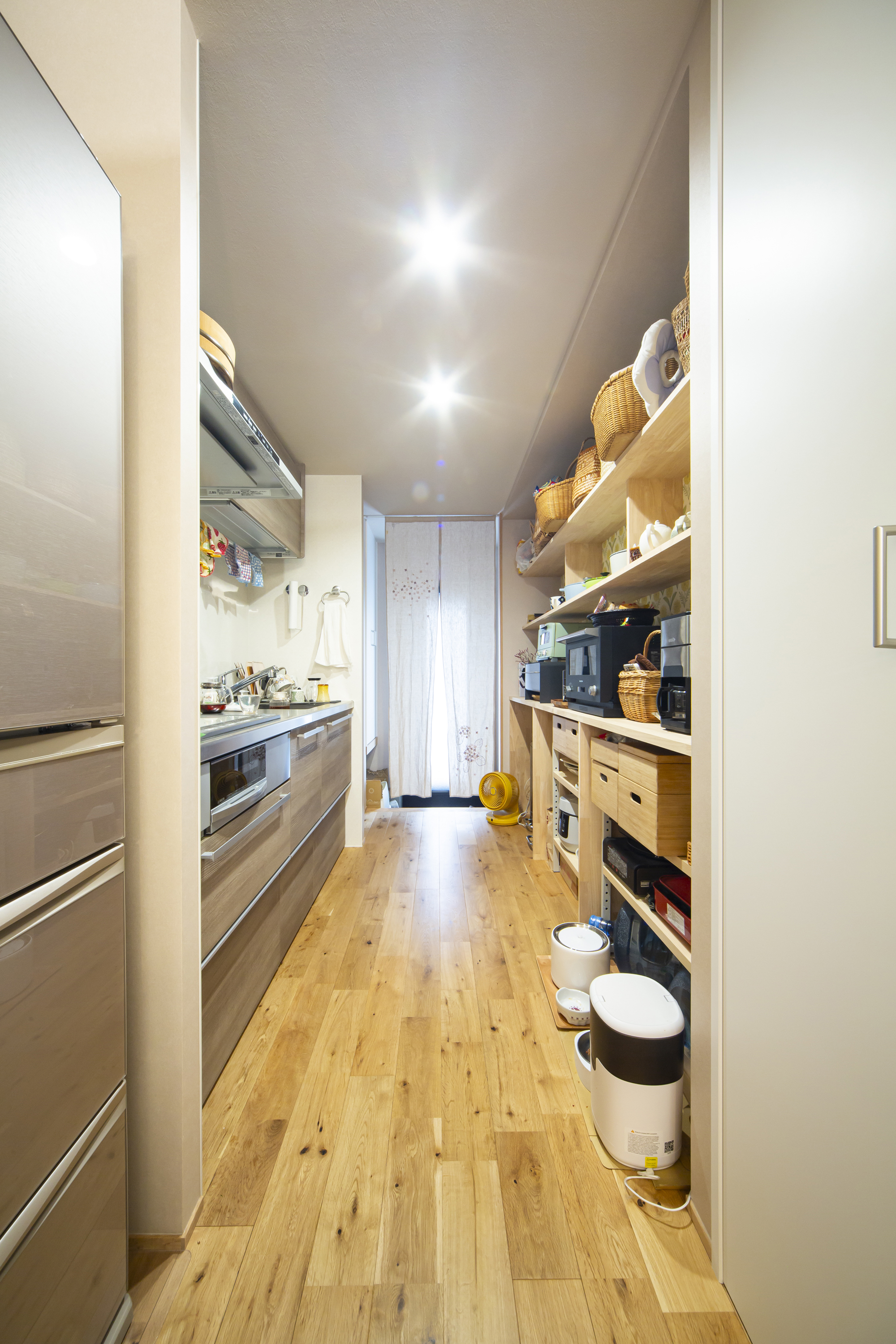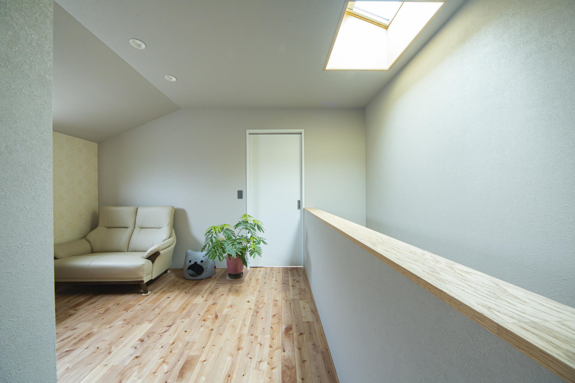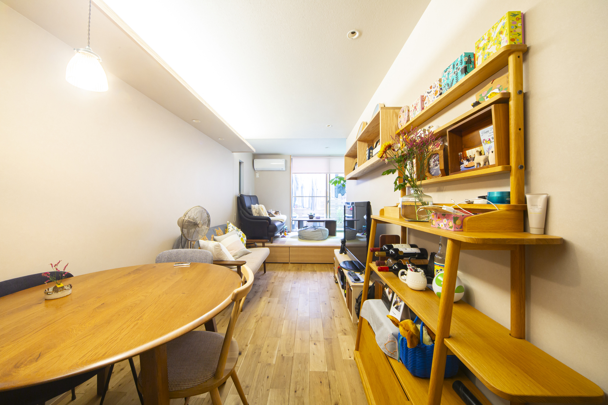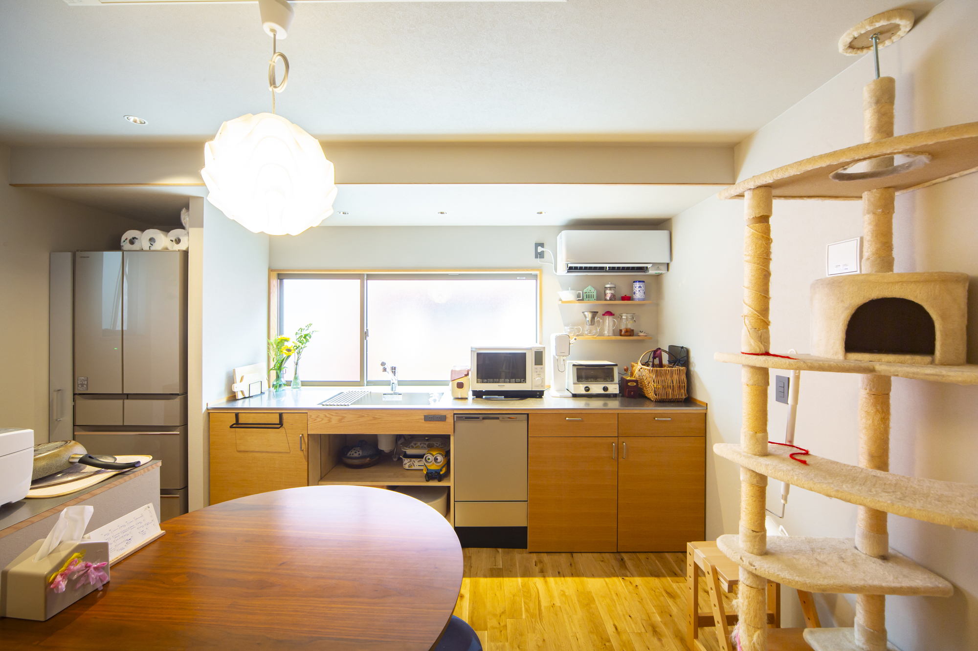 22坪ほどの敷地に親世帯(父母+猫)と子世帯(夫婦・子供2人・猫2匹)が暮らす2世帯住宅をつくりました。建物間口が4mに対して、玄関や水廻りを別にした完全二世帯住宅としながら各世帯が快適に暮らすための明るさや広さの確保が課題でした。そこで階段を2基計画し親世帯:1F+2F、子世帯:2F+3Fとしてそれぞれの階段の下を収納やトイレとすることで有効な空間を生み出しました。このようにして各世帯が外部に接してきちんと光の入る空間にするなど、緻密に設計を重ねました。また両世帯とも愛猫が家族の一員として一緒に暮らしています。猫ちゃんたちが快適に暮らせる工夫も随所に設けています。例えば子世帯の吹抜けには猫ちゃんのためのキャットウォークが設置されており、化粧梁の上を歩いて上階と下階を行き来できます。またレストルームを少し広めに作ることで猫ちゃんのトイレを設置するスペースを確保しました。このように猫ちゃんも家族の一員としてみんな快適に暮らせるようにデザインしているのです。二世帯住宅で大切なことは家族の距離感をどのようにカタチにするかということです。家族の距離感の在り方は暮らす人によってさまざまなので、丁寧にヒアリングして話し合いを重ねることでみんなが暮らしやすい家をつくることができます。