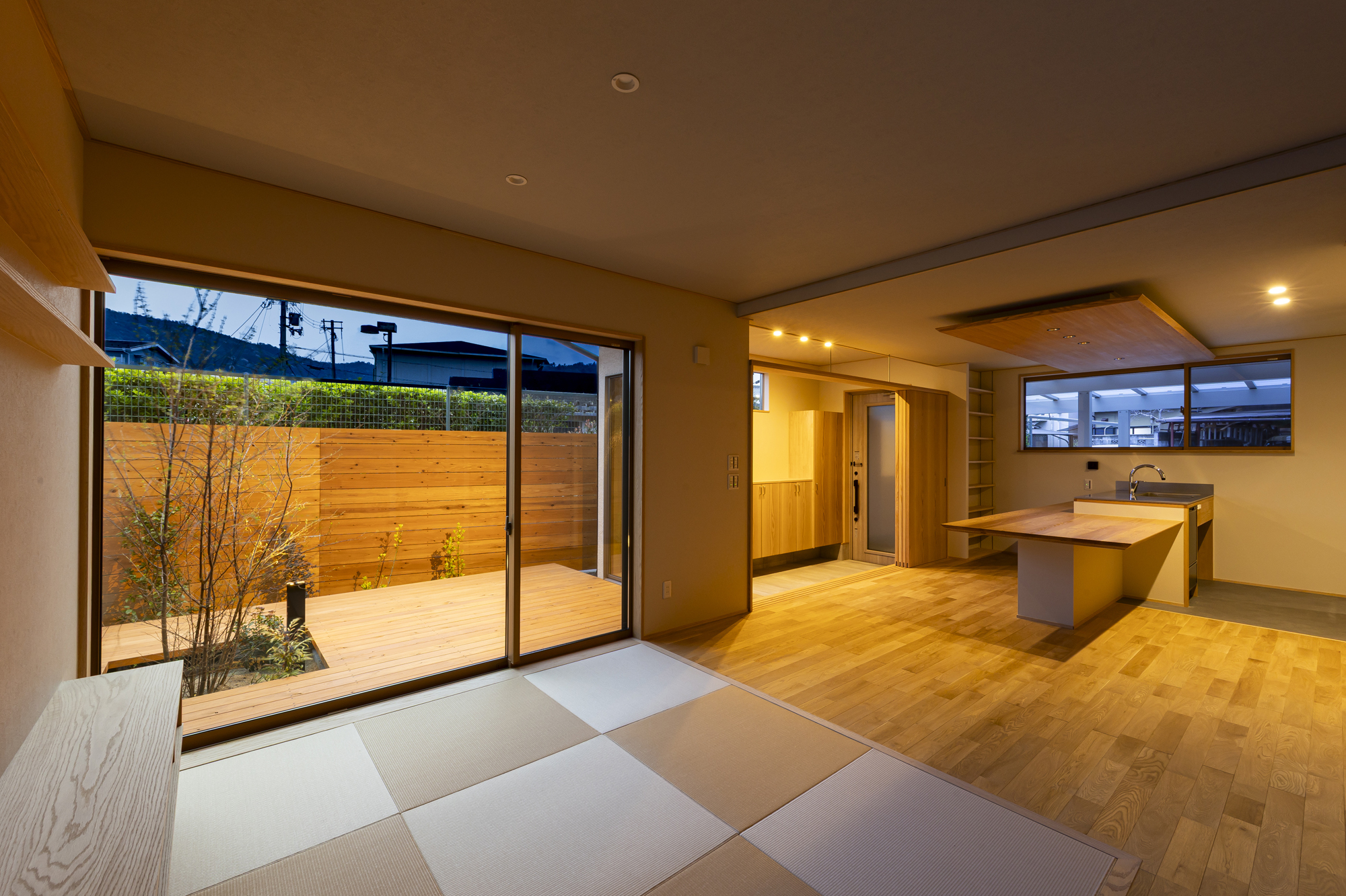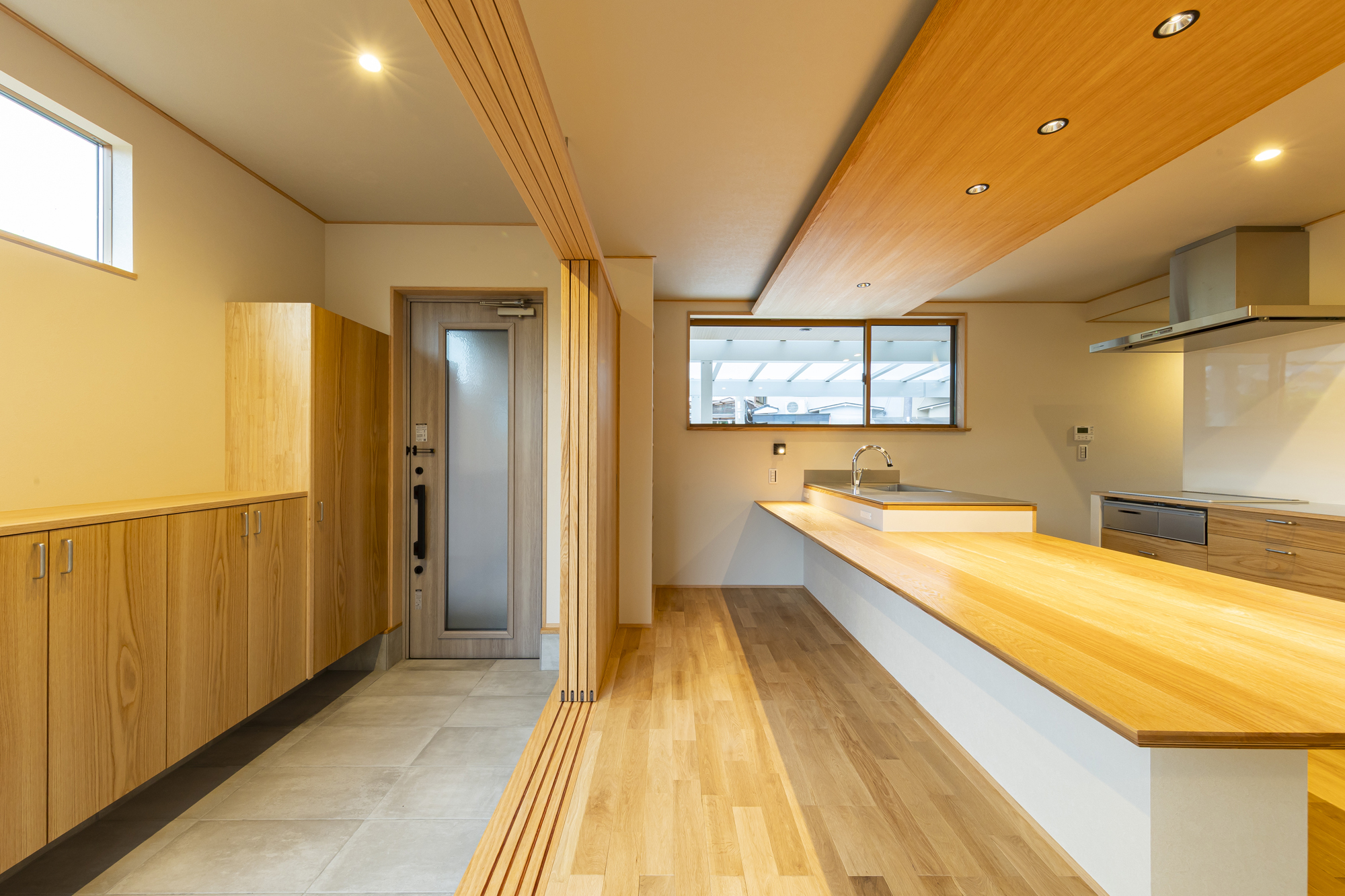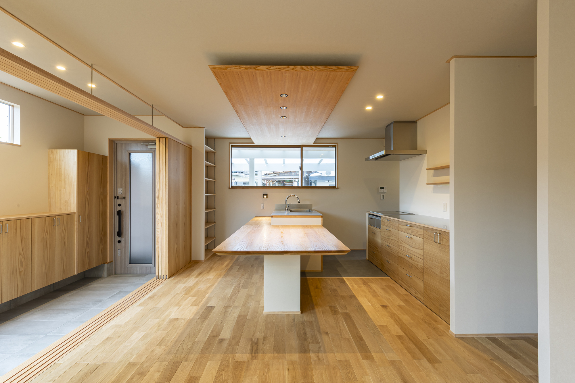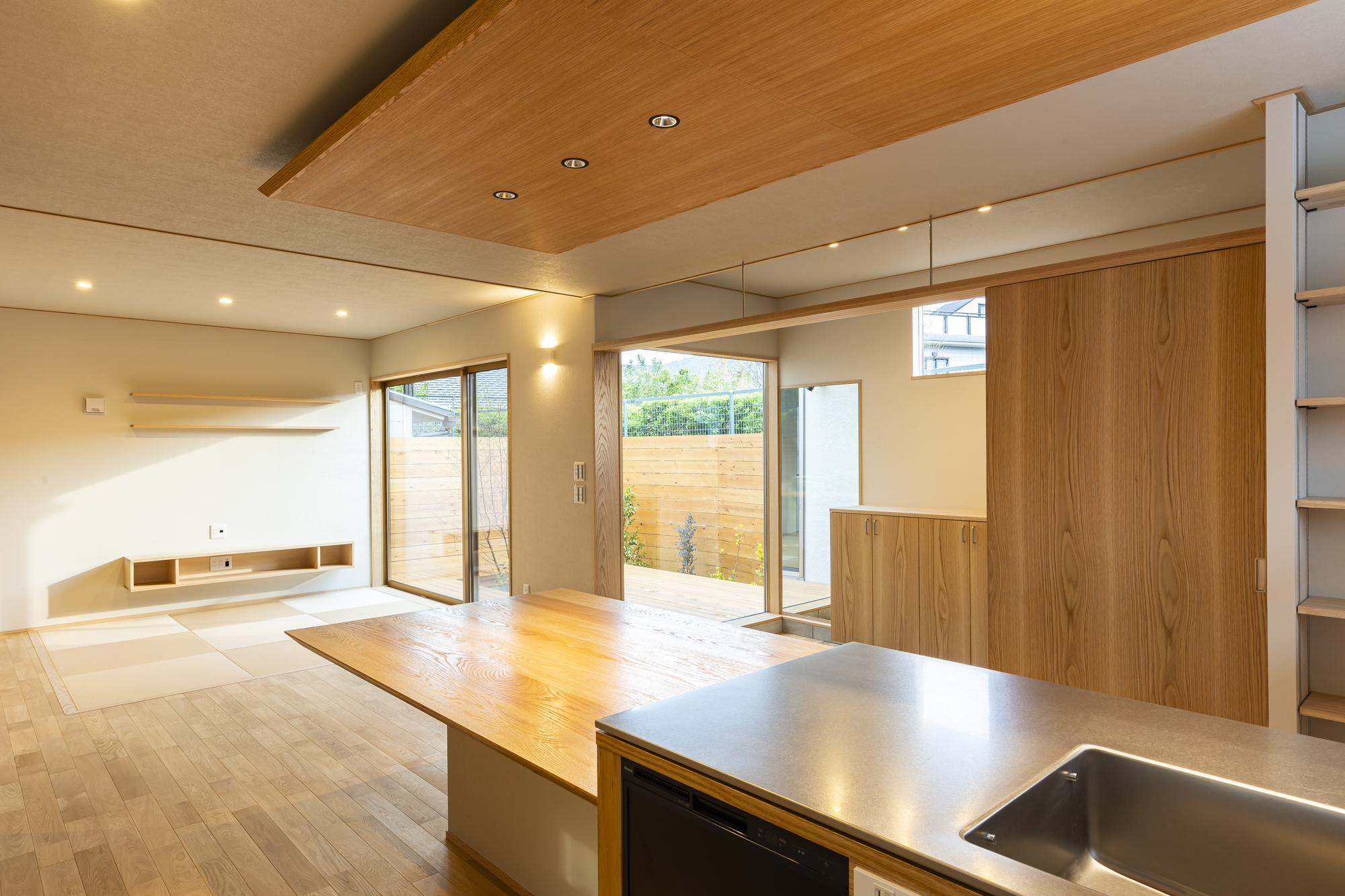 西側に公園のある2階建てのお家。公園からの視線を遮りつつ光を十分に取り込むためにテラスを設けました。玄関の大きなFIX窓はテラスと内部の空間を視覚的に接続し、豊かな空間をつくり出します。また玄関は造作の4枚建具でLDKと仕切られており、前回すると一体的でワンフロア的な広々とした空間構成となっています。ダイニングテーブルと一体になったキッチンは家具のようにデザインされ、木の温もりを感じられる素材感によってLDKの一体感を増すように作り込まれています。また家事動線では物干しテラスで洗濯物を取り込み、畳スペースでテレビを見ながらたためるような位置関係でその後、洗面所の収納に最短距離でしまえるように考えました。生活の中にデザインが溶け込み暮らしを形作る。そんな木の温もりと暮らす住まいになりました。