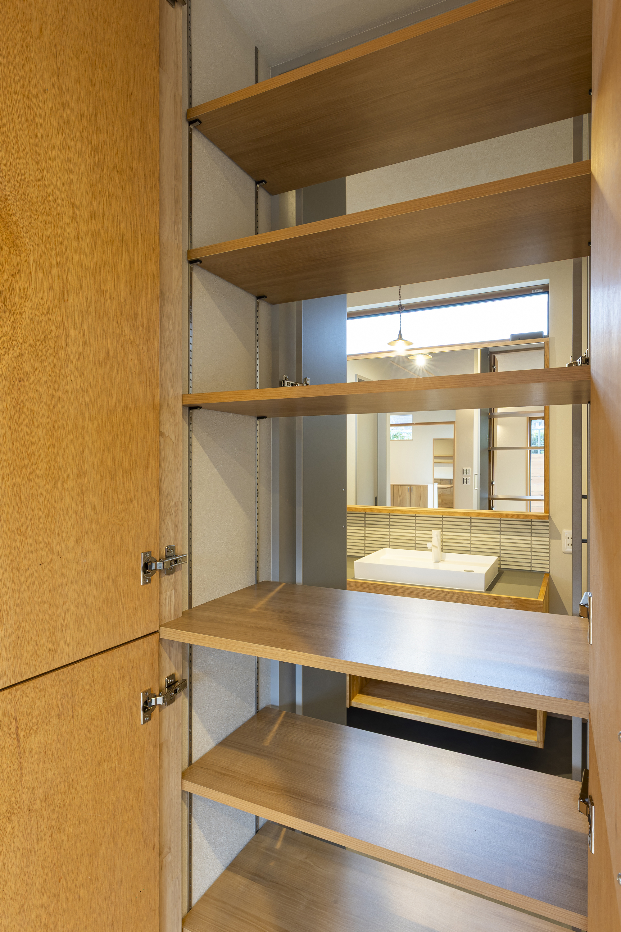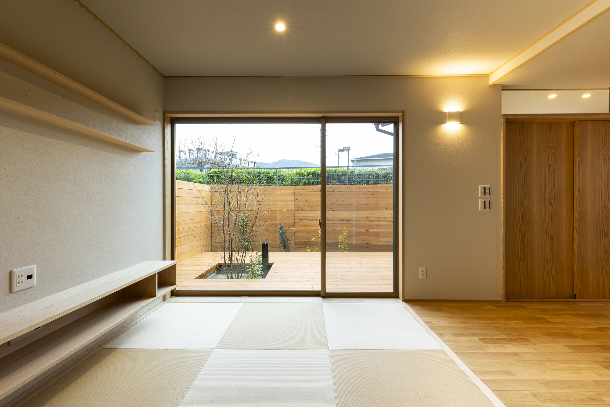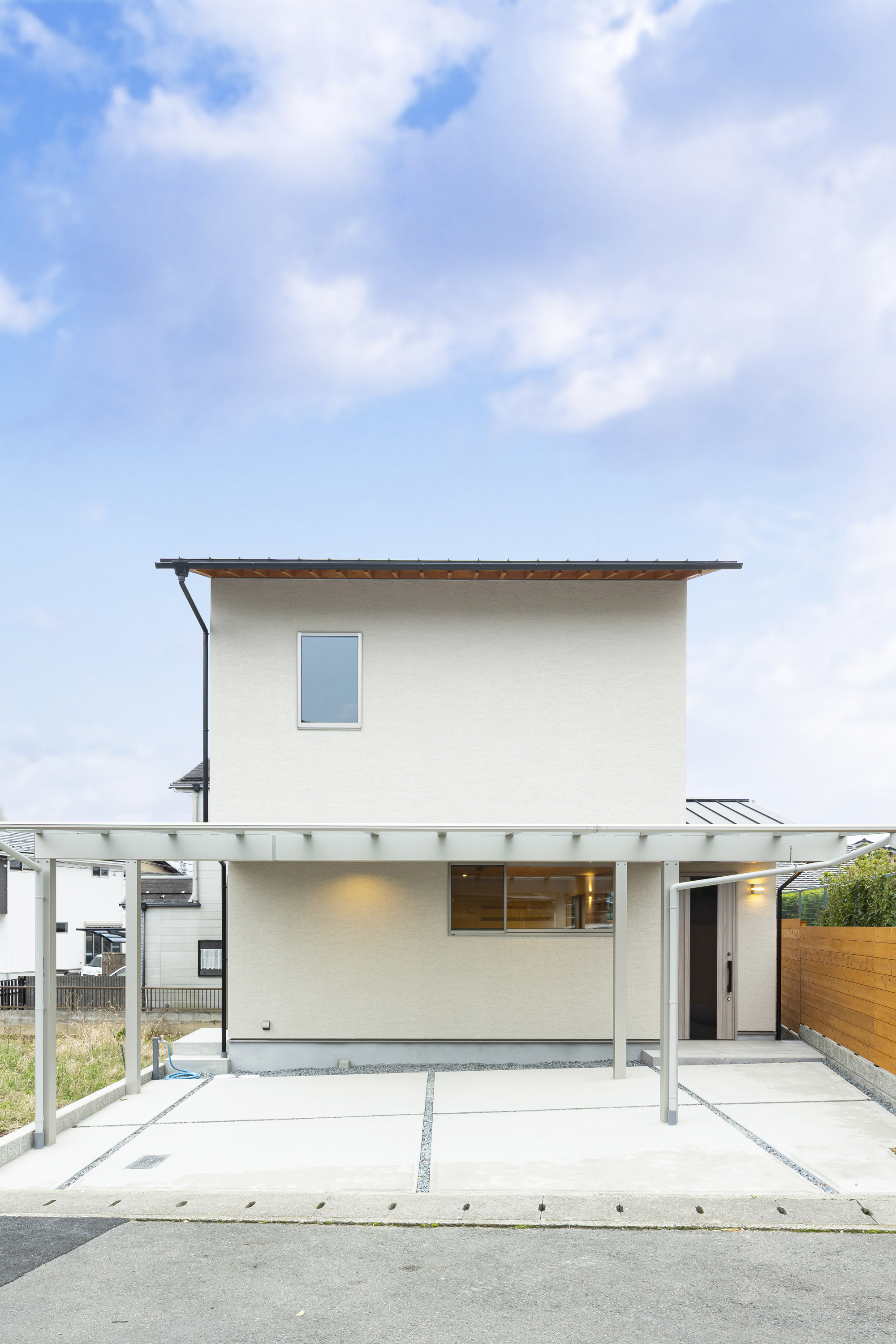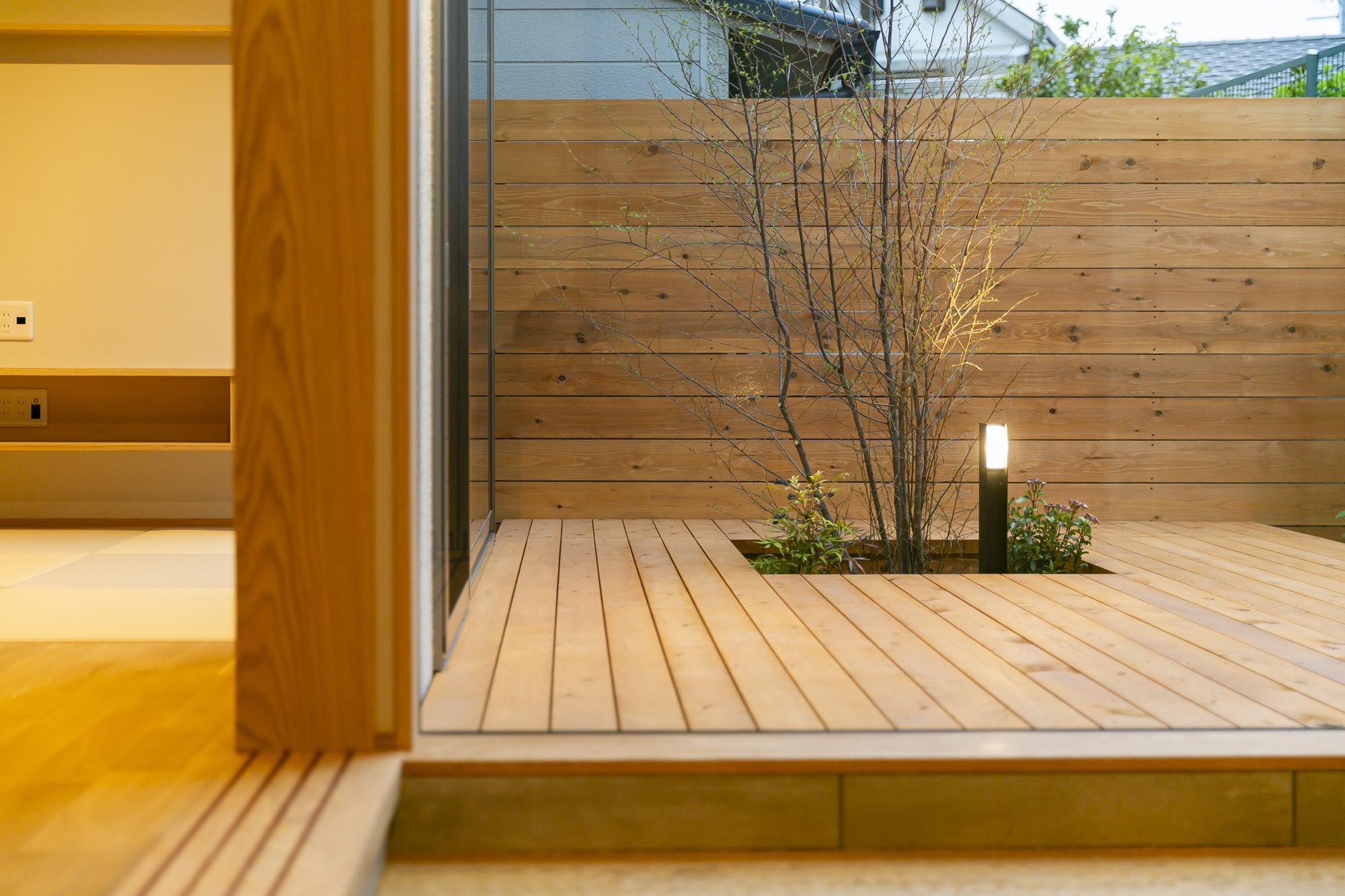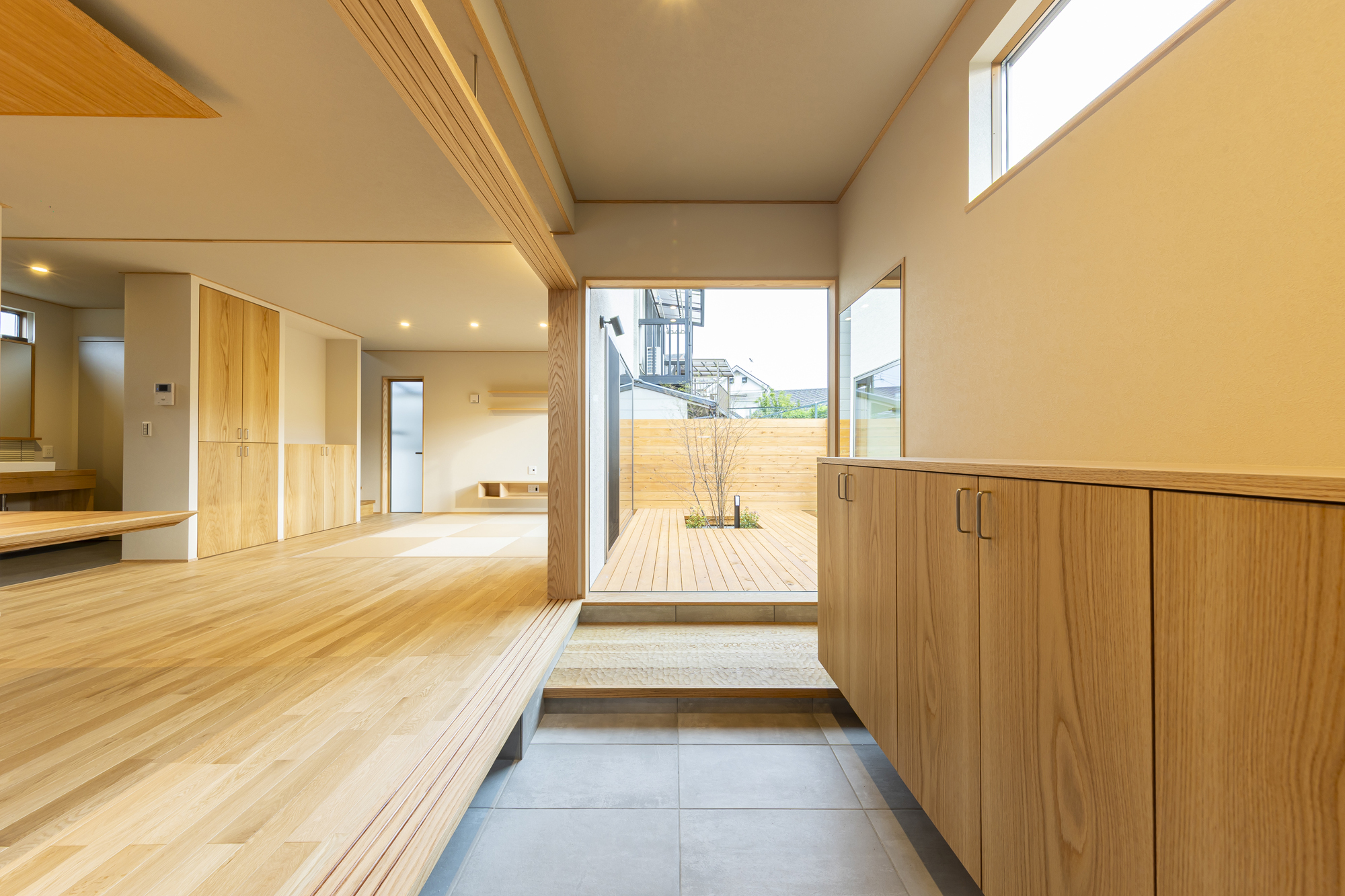 西側に公園のある2階建てのお家。公園からの視線を遮りつつ光を十分に取り込むためにテラスを設けました。玄関の大きなFIX窓はテラスと内部の空間を視覚的に接続し、豊かな空間をつくり出します。また玄関は造作の4枚建具でLDKと仕切られており、前回すると一体的でワンフロア的な広々とした空間構成となっています。ダイニングテーブルと一体になったキッチンは家具のようにデザインされ、木の温もりを感じられる素材感によってLDKの一体感を増すように作り込まれています。また家事動線では物干しテラスで洗濯物を取り込み、畳スペースでテレビを見ながらたためるような位置関係でその後、洗面所の収納に最短距離でしまえるように考えました。生活の中にデザインが溶け込み暮らしを形作る。そんな木の温もりと暮らす住まいになりました。