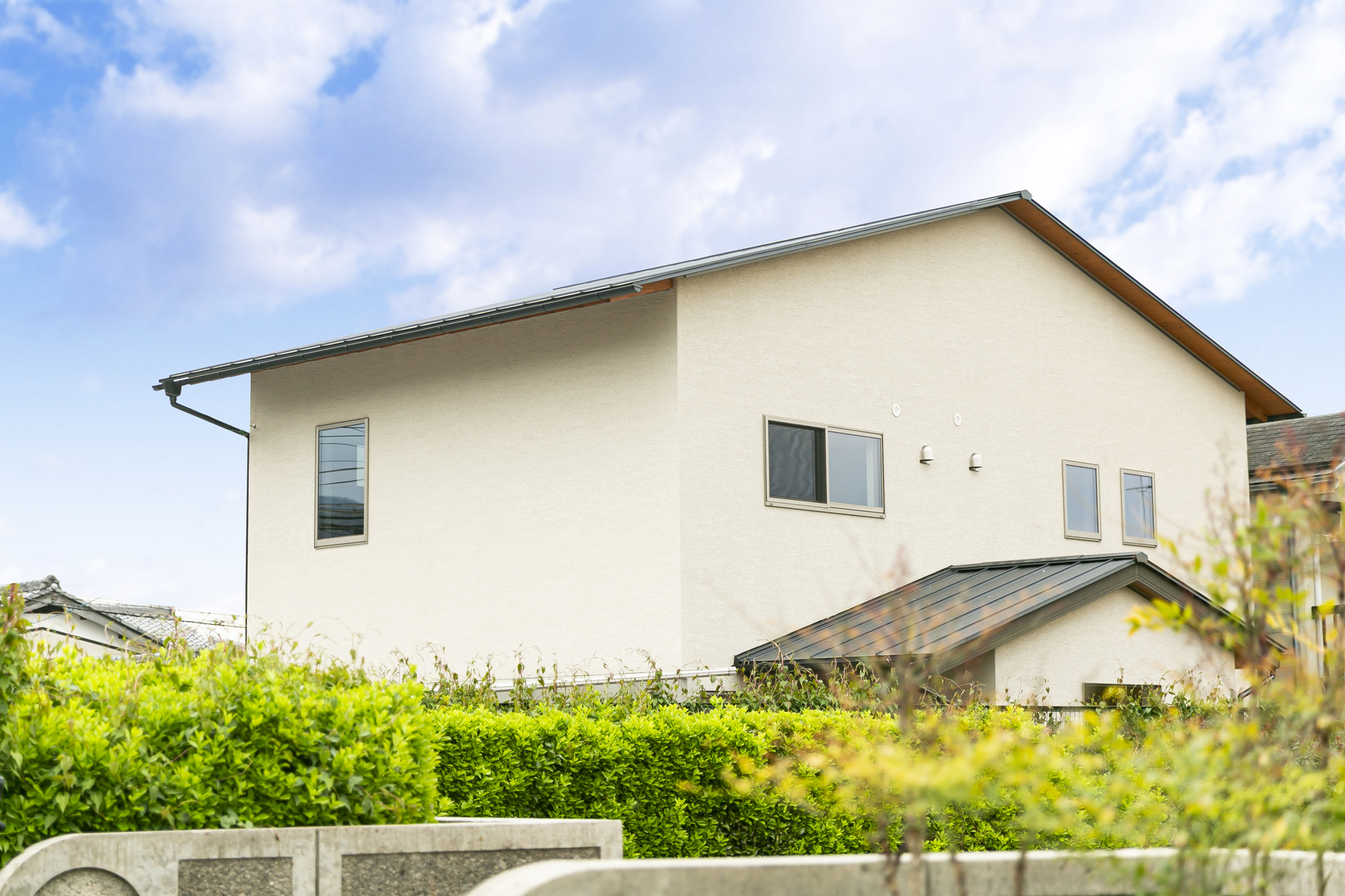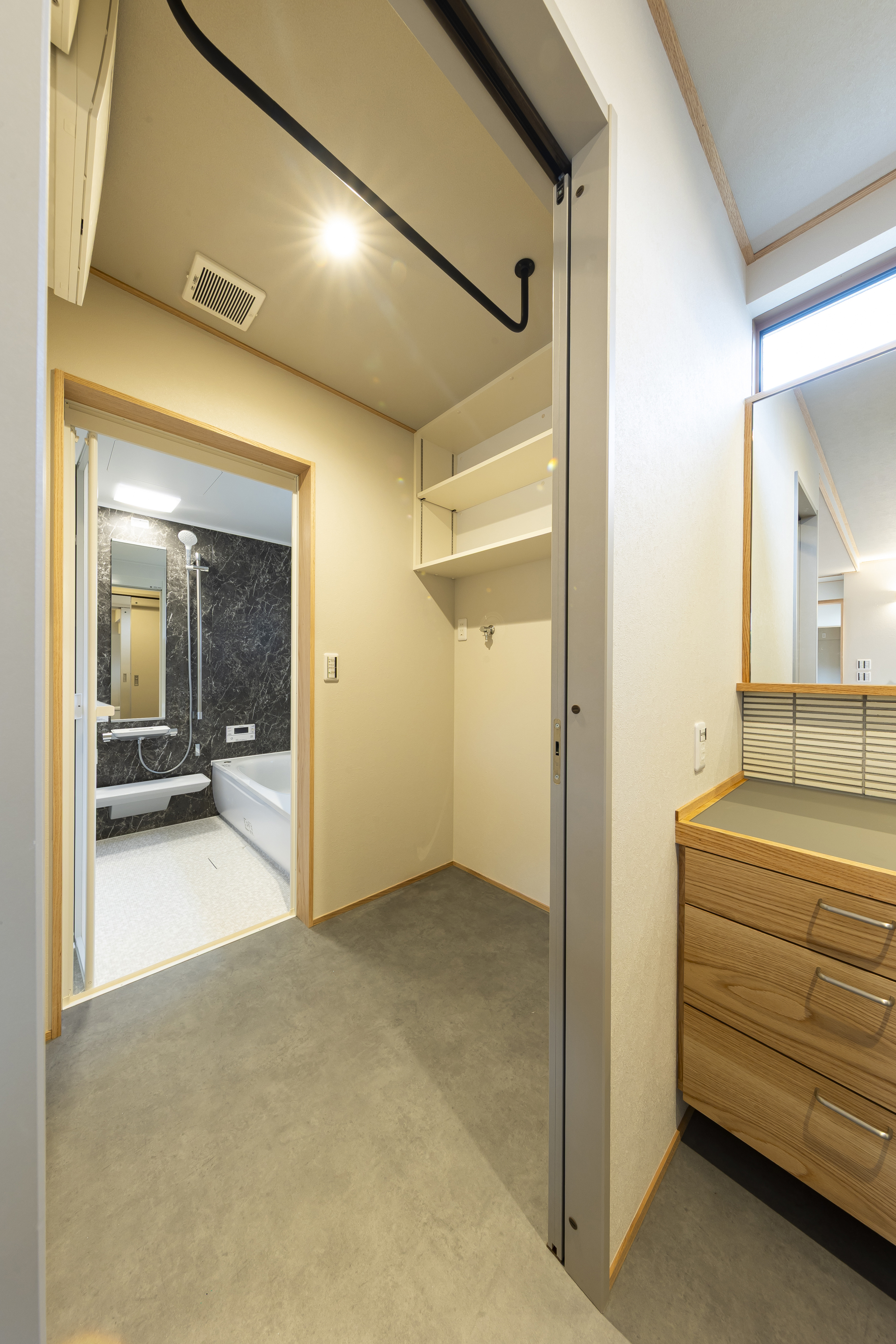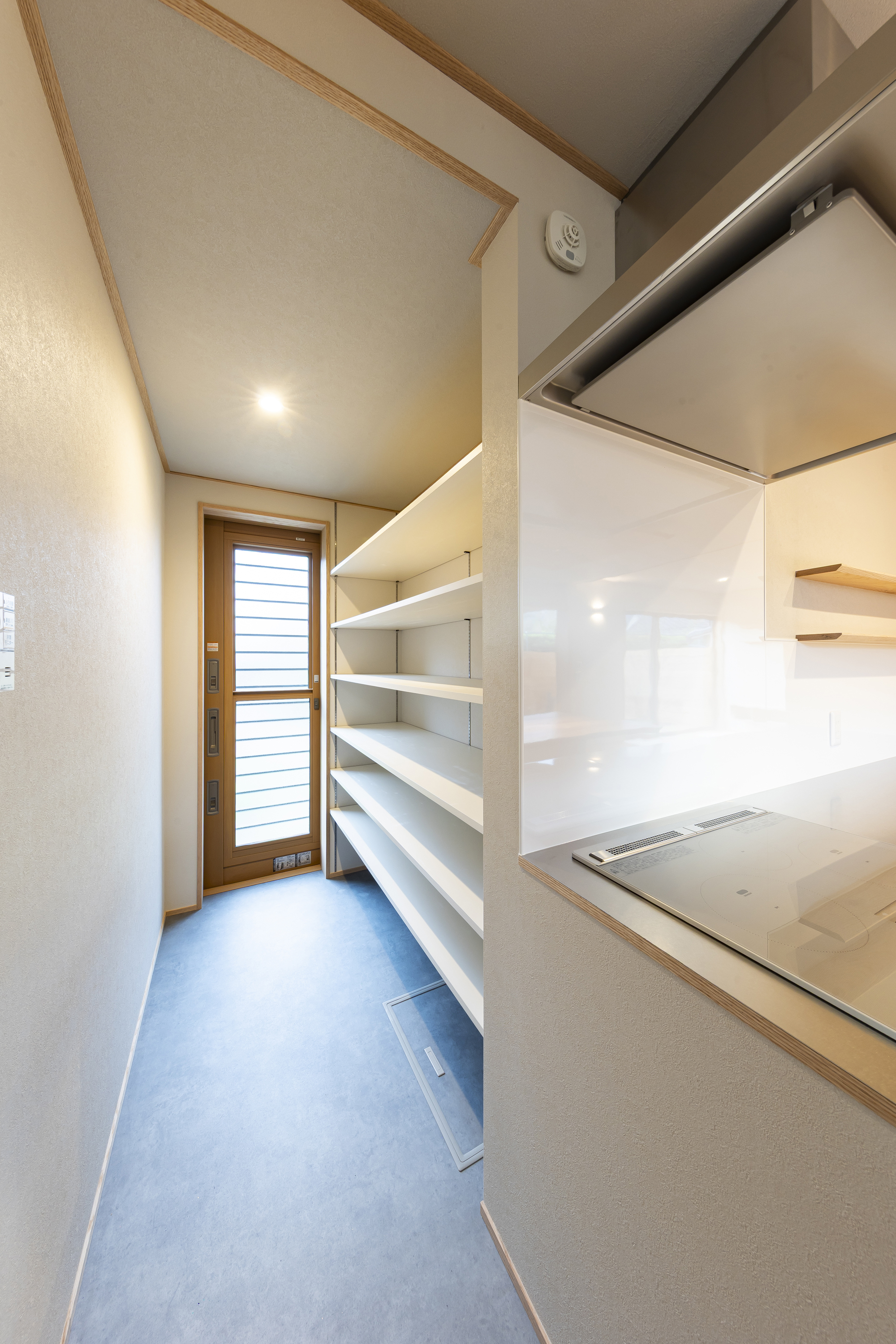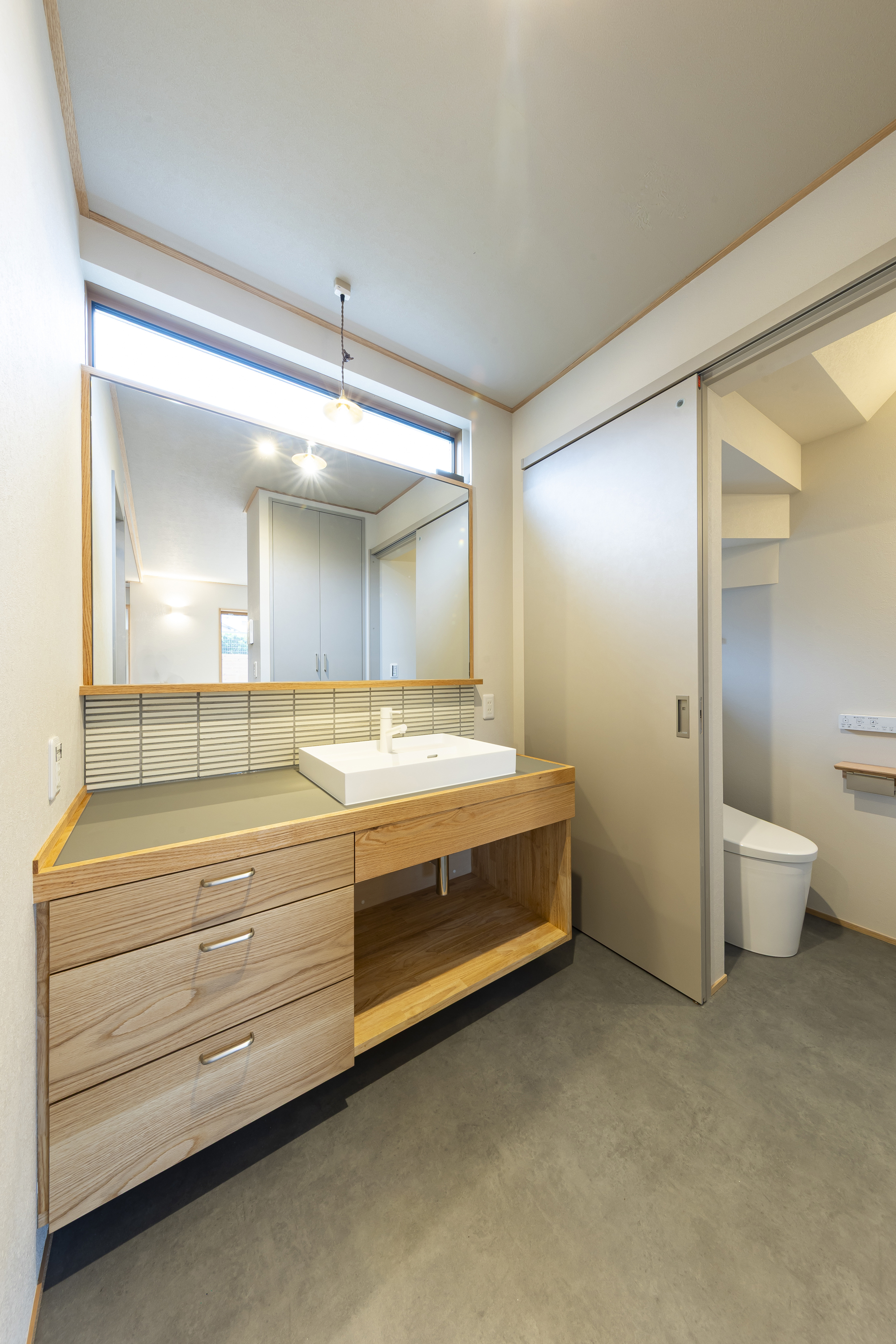 西側に公園のある2階建てのお家。公園からの視線を遮りつつ光を十分に取り込むためにテラスを設けました。玄関の大きなFIX窓はテラスと内部の空間を視覚的に接続し、豊かな空間をつくり出します。また玄関は造作の4枚建具でLDKと仕切られており、前回すると一体的でワンフロア的な広々とした空間構成となっています。ダイニングテーブルと一体になったキッチンは家具のようにデザインされ、木の温もりを感じられる素材感によってLDKの一体感を増すように作り込まれています。また家事動線では物干しテラスで洗濯物を取り込み、畳スペースでテレビを見ながらたためるような位置関係でその後、洗面所の収納に最短距離でしまえるように考えました。生活の中にデザインが溶け込み暮らしを形作る。そんな木の温もりと暮らす住まいになりました。