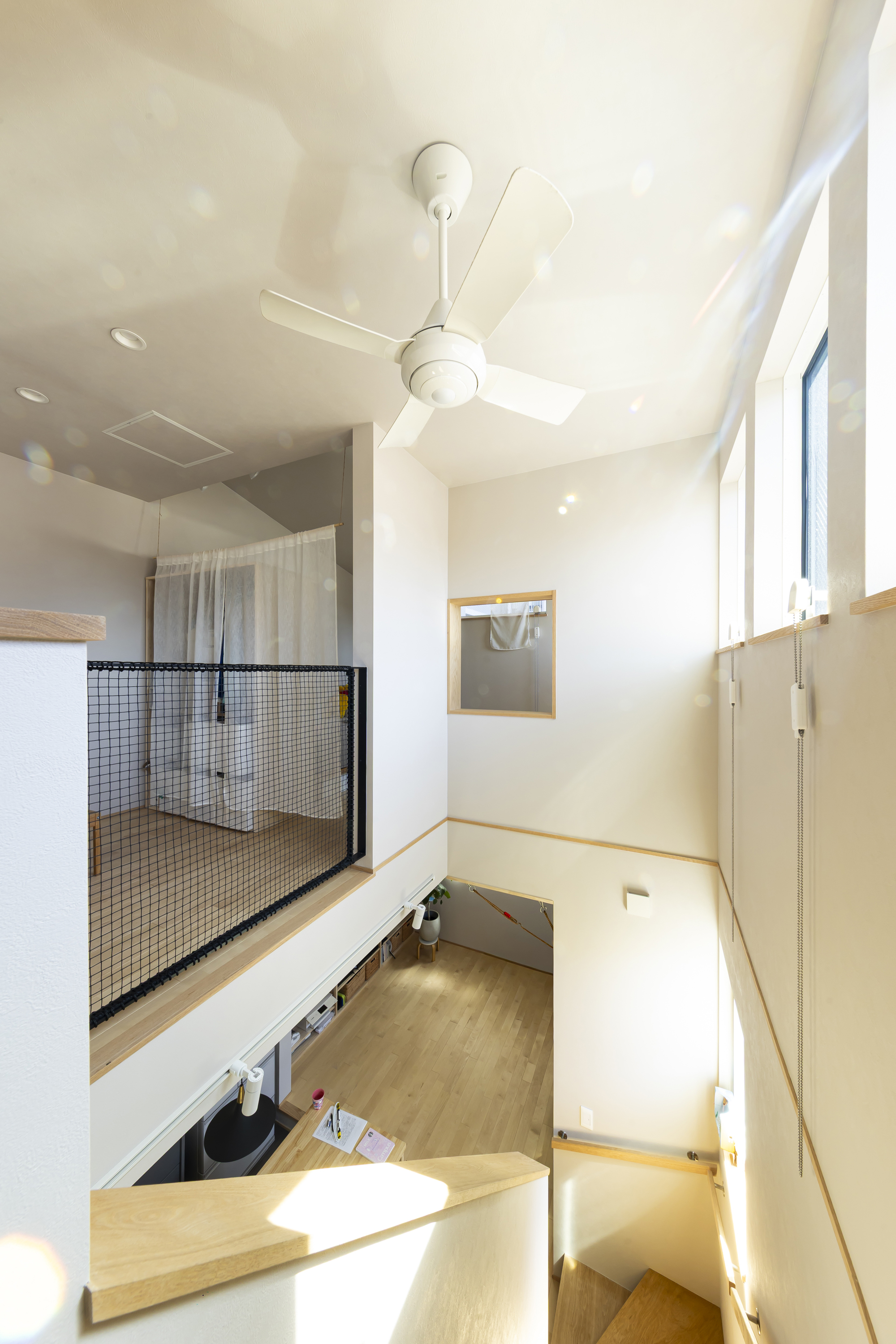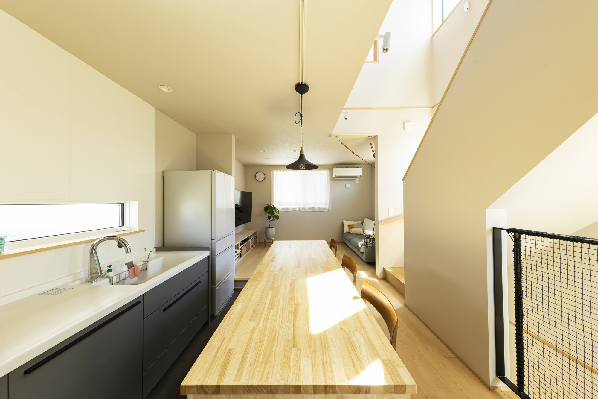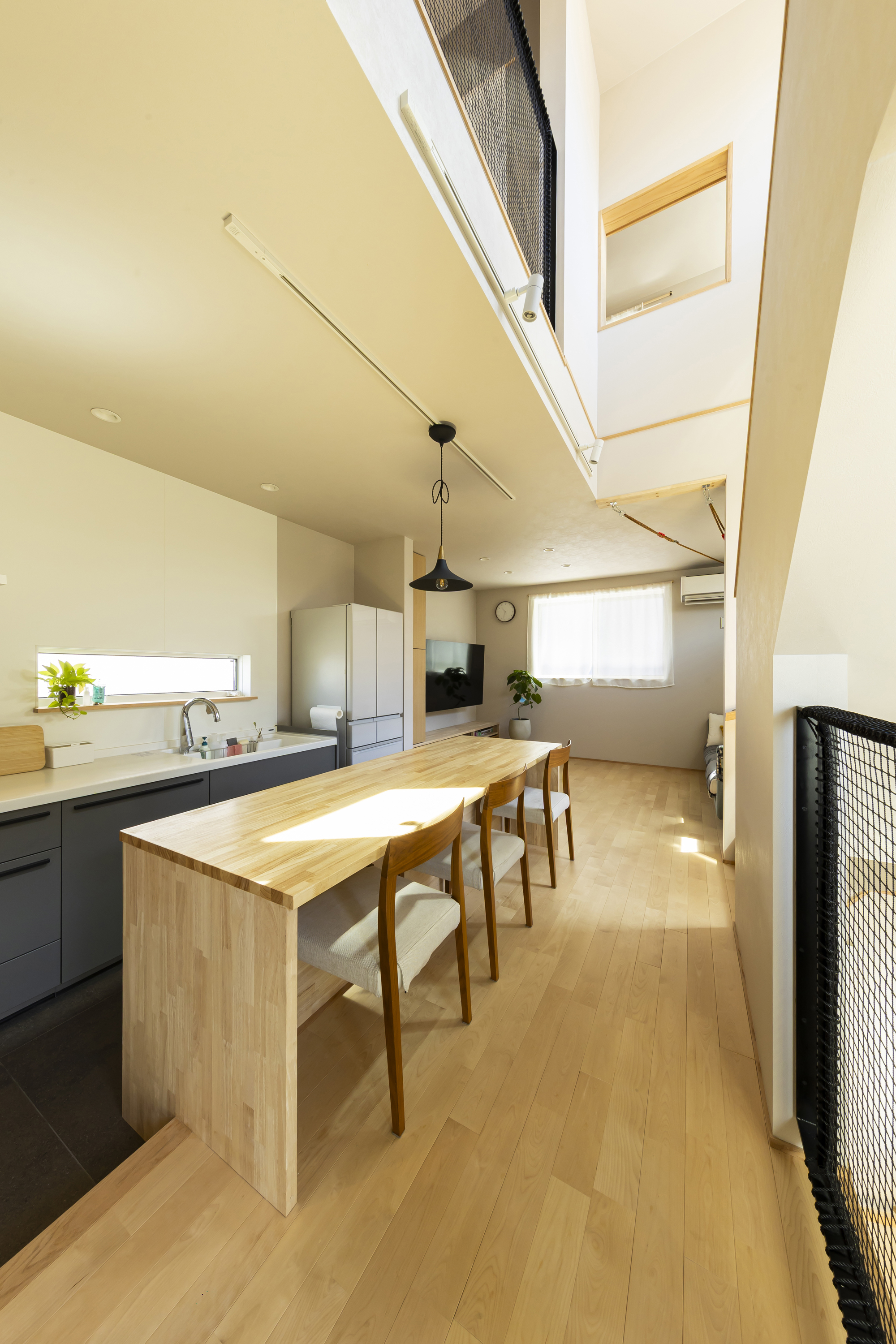 間口5m、奥行18mの細長い敷地に3階建ての住まいを計画しました。住宅密集地のため周囲からの視線を遮りながら光を取り込むため、南側の空の見えるところに2階のLDKと3階のフリースペースをつなぐ吹抜を設けました。吹抜があることにより家族の気配を感じることができ、光や風の通りみちとなり居心地の良い空間を作り出してくれます。