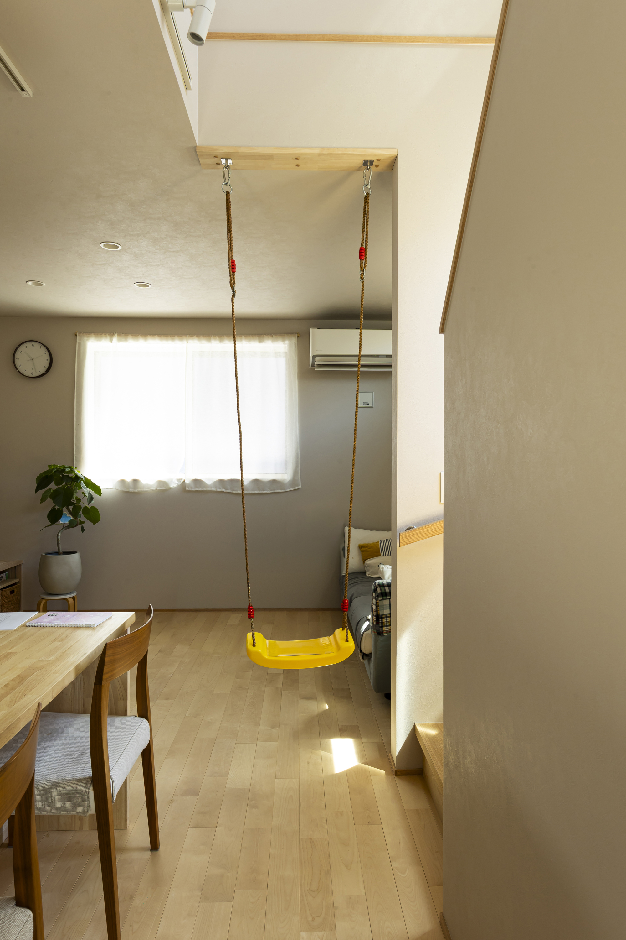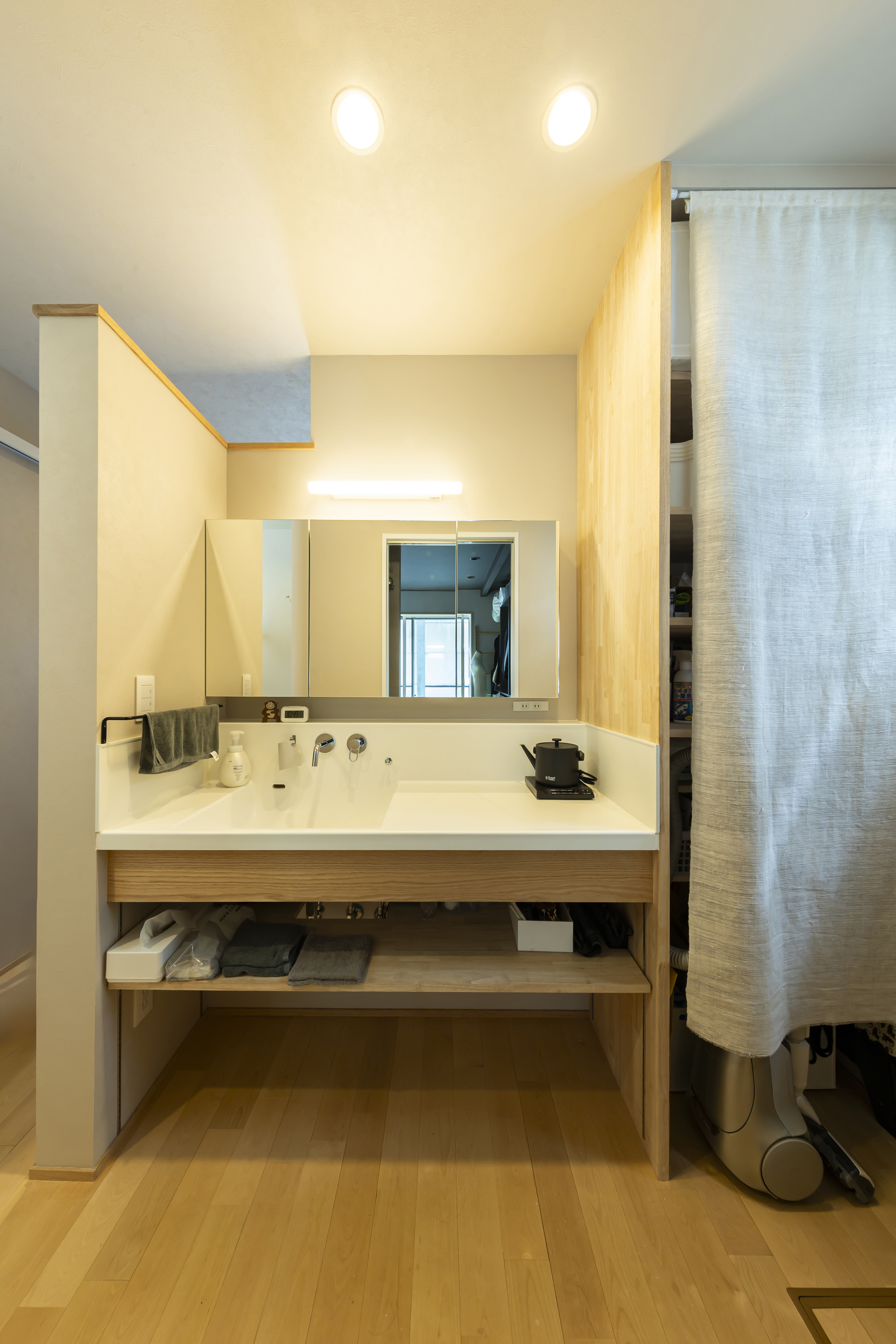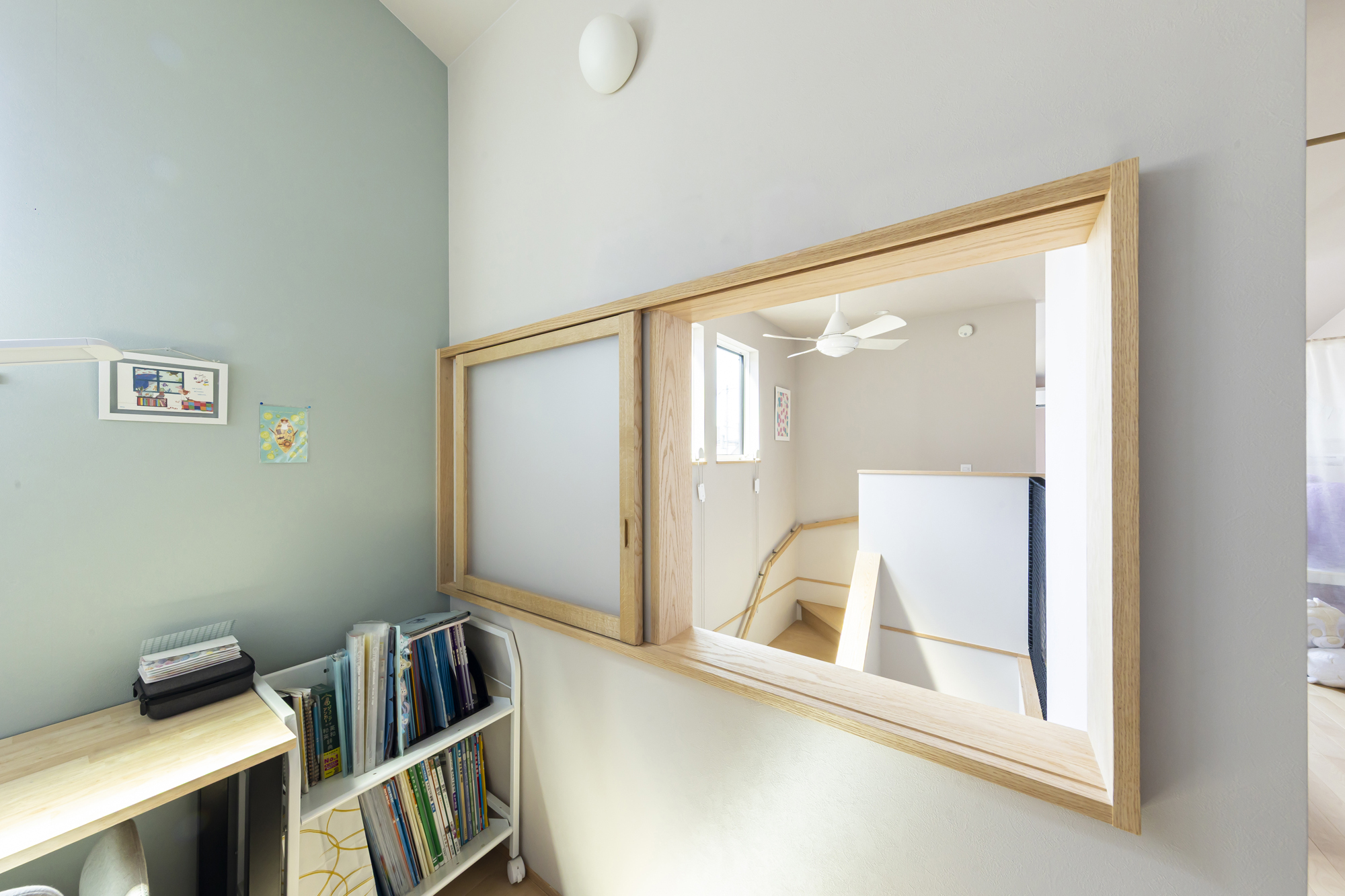間口5m、奥行18mの細長い敷地に3階建ての住まいを計画しました。住宅密集地のため周囲からの視線を遮りながら光を取り込むため、南側の空の見えるところに2階のLDKと3階のフリースペースをつなぐ吹抜を設けました。吹抜があることにより家族の気配を感じることができ、光や風の通りみちとなり居心地の良い空間を作り出してくれます。