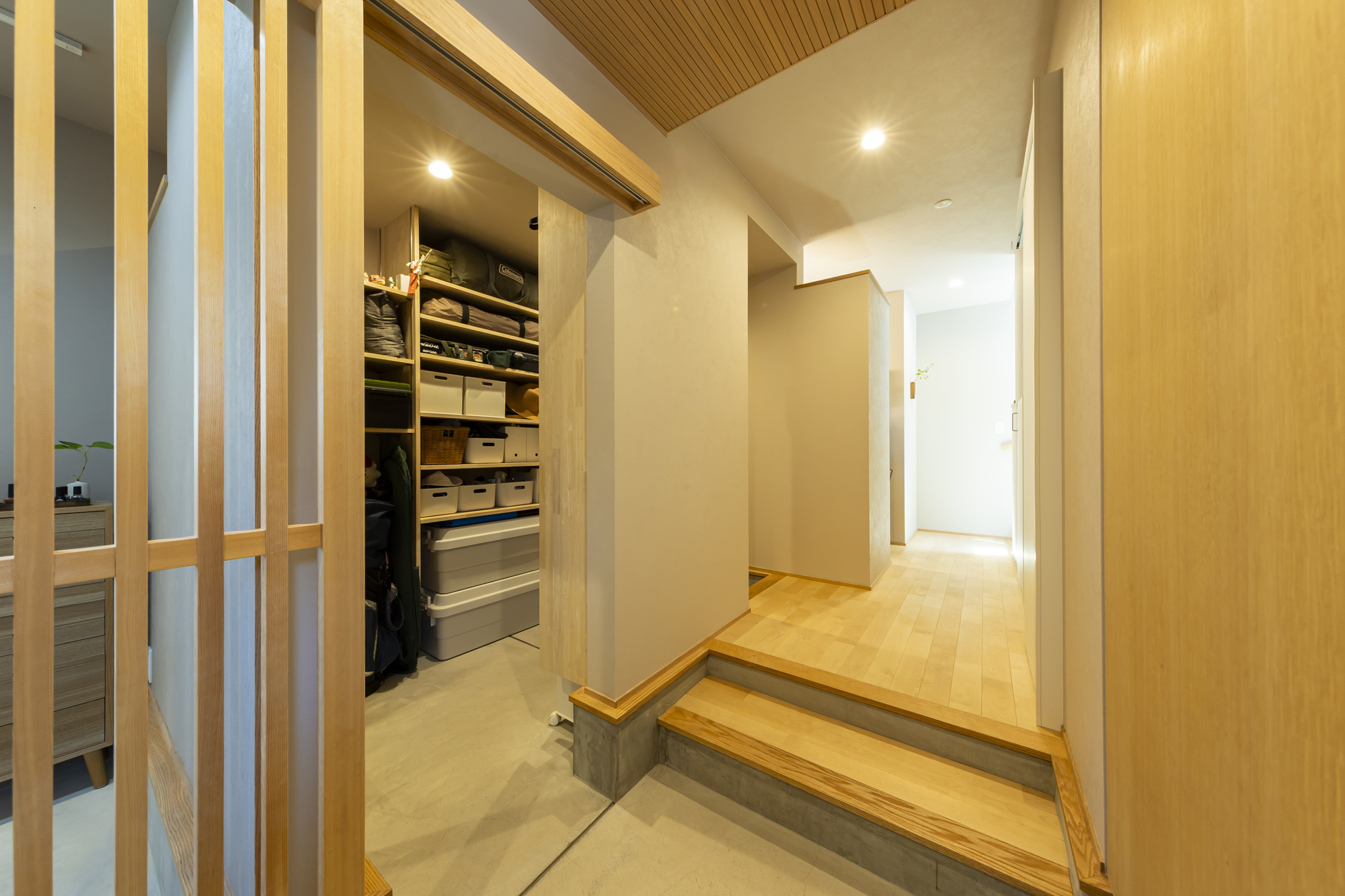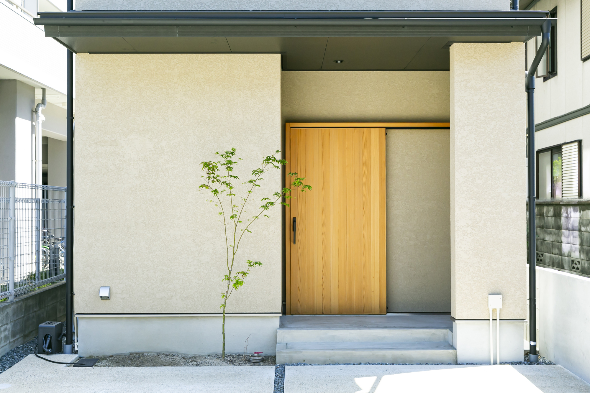 玄関の引戸は木製でありながら気密性・断熱性の高いものを使用しました。高性能でありながら、見た目は木のやさしさや温もりを感じさせてくれます。他に床や天井、格子戸など木を取り入れることにより、木の温もりを感じる事の出来る優しい空間となっています。