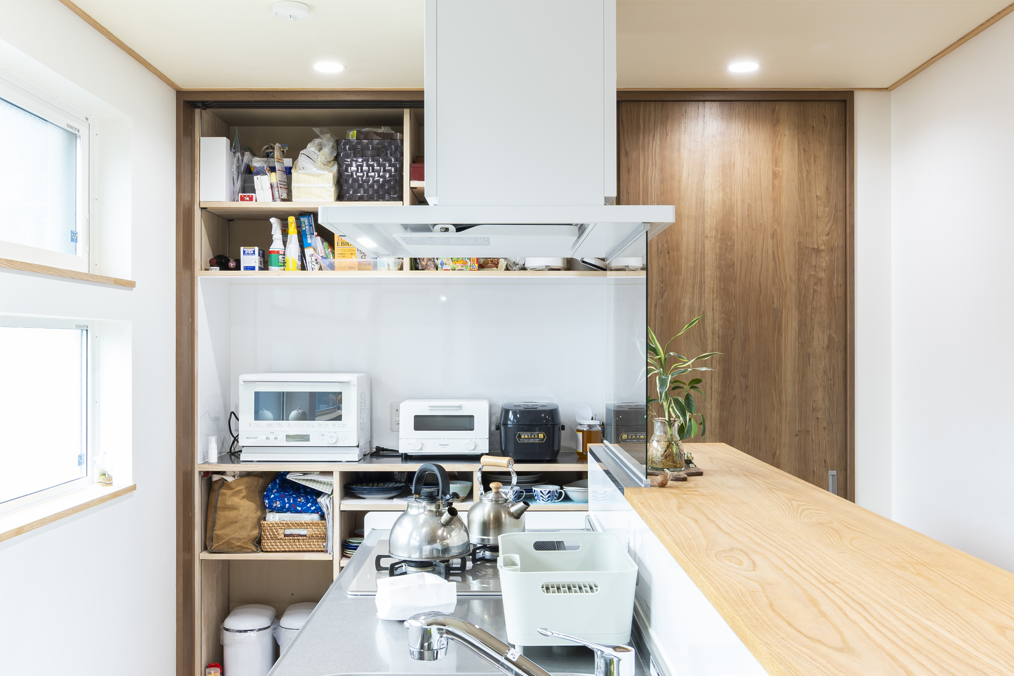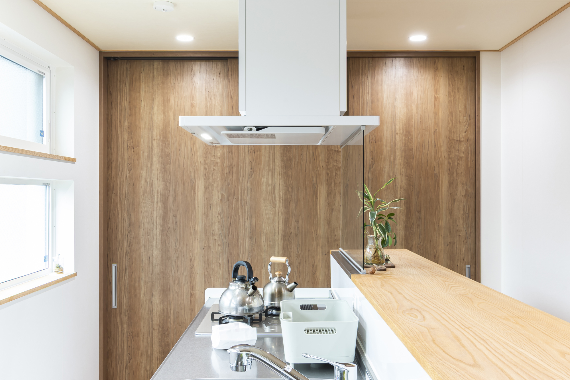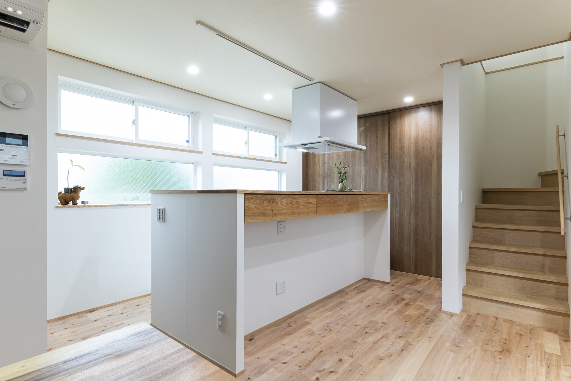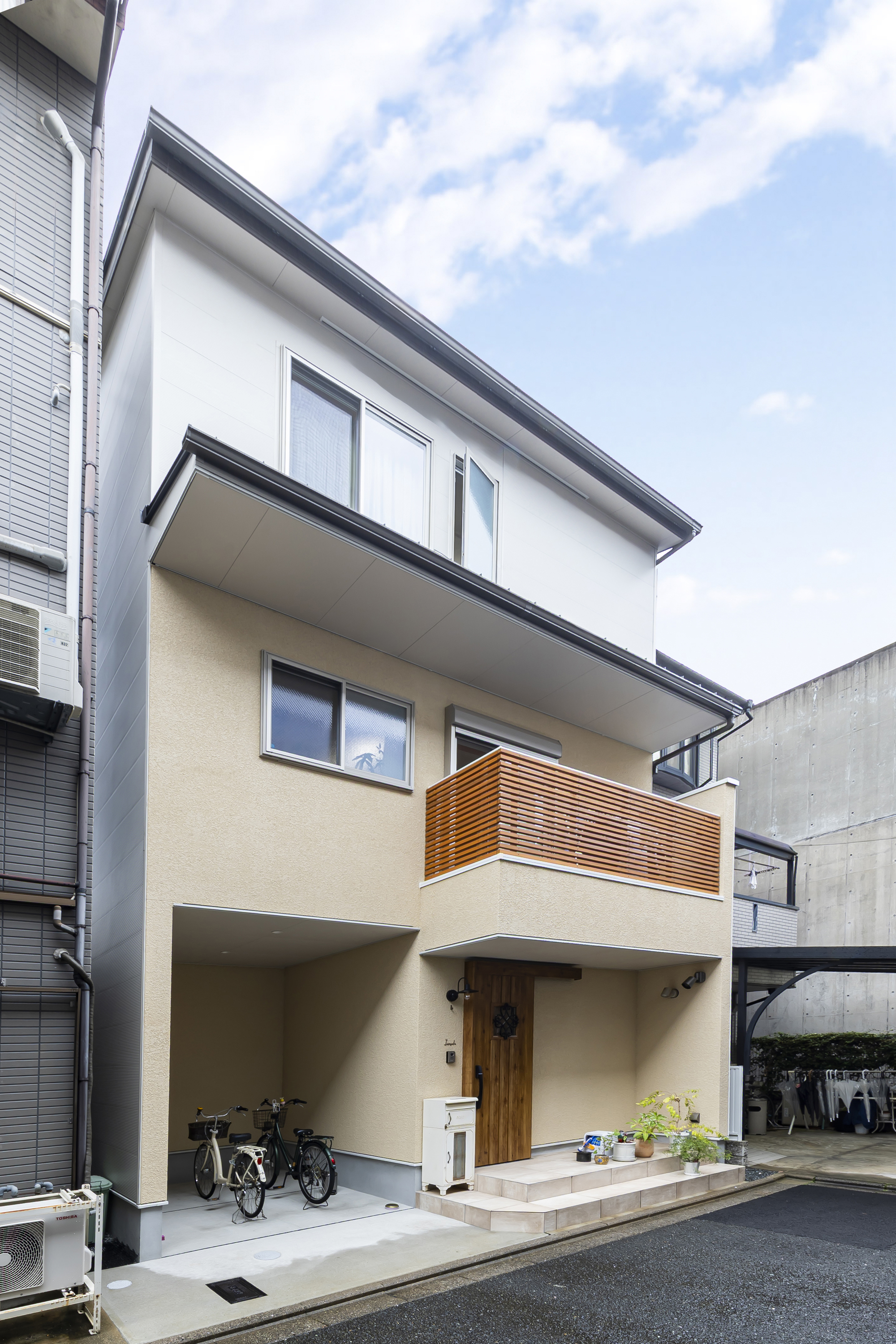 14.8坪の街中狭小地に建つ二人暮らしの為の住まい。素材、性能、デザインにとことんこだわり抜いた一邸になりました。密集した立地ながらも周囲からの視線を気にすることなく配慮しながらも明るい室内空間に。コンパクトながら夫婦二人とワンちゃんが快適に過ごせる分の大きさで設計された家ですが、室内の床は無垢フローリング、壁天井は和紙で仕上げ、木材を用いた造作家具で質感のある上品な住まいになりました。非常にコンパクトな敷地の中で、建物周囲に足場を建てられるように空間を開けているので将来のメンテナンスも行いやすく、長く愛着をもって過ごせるお家です。