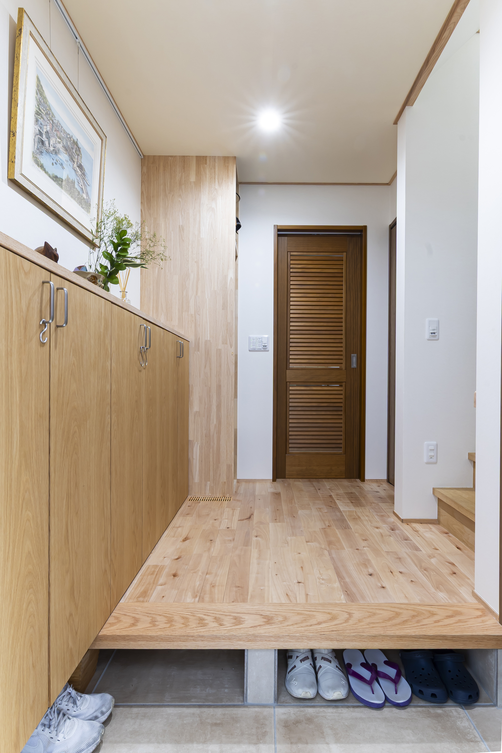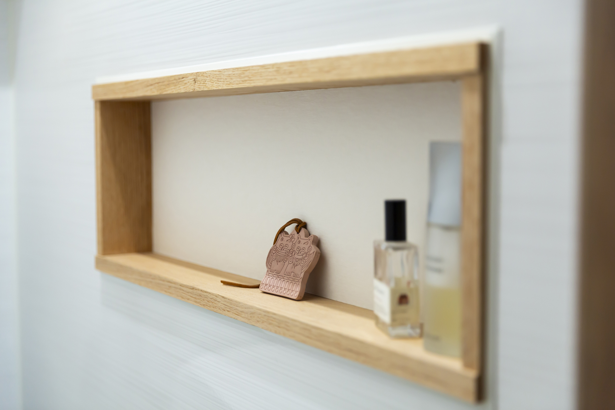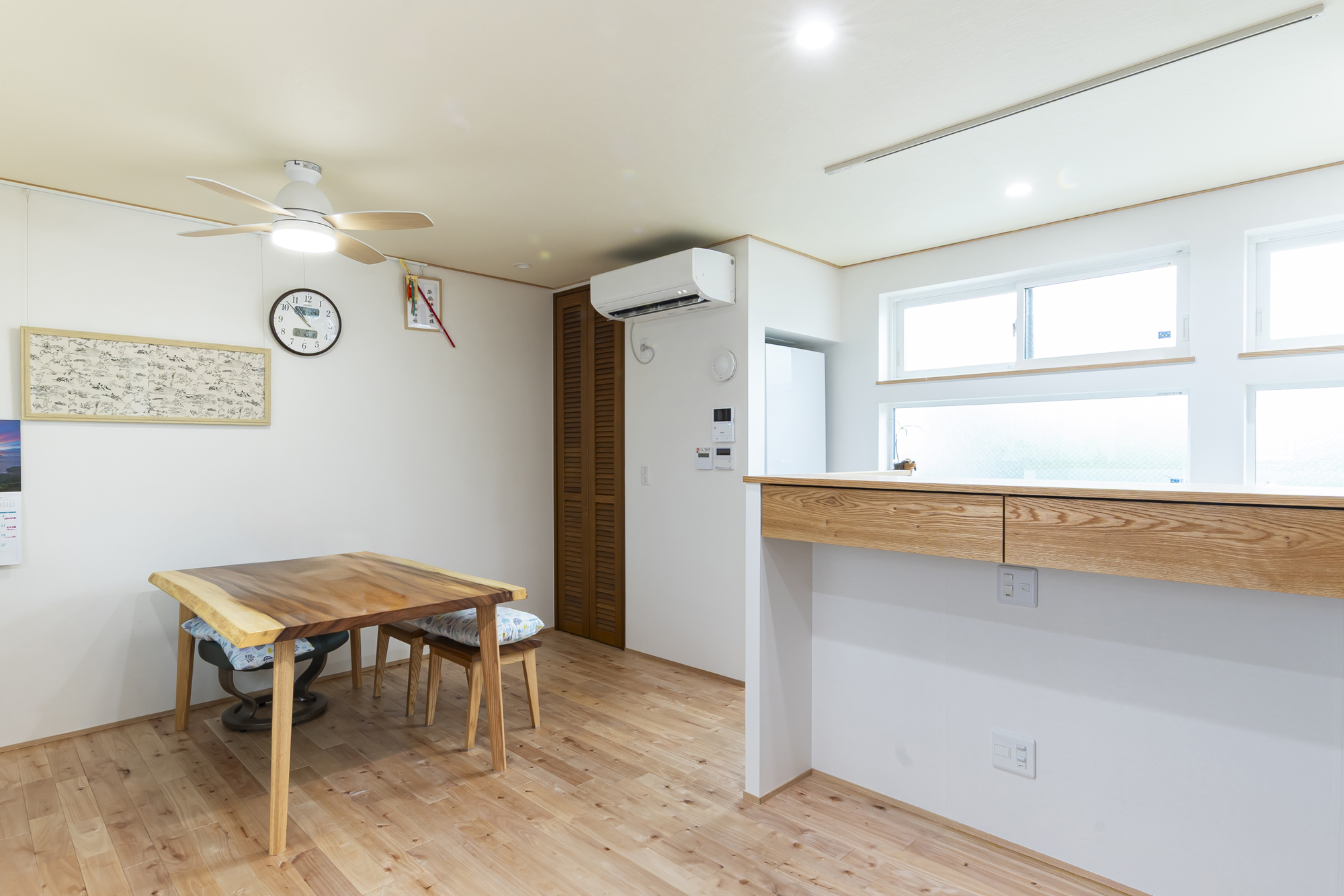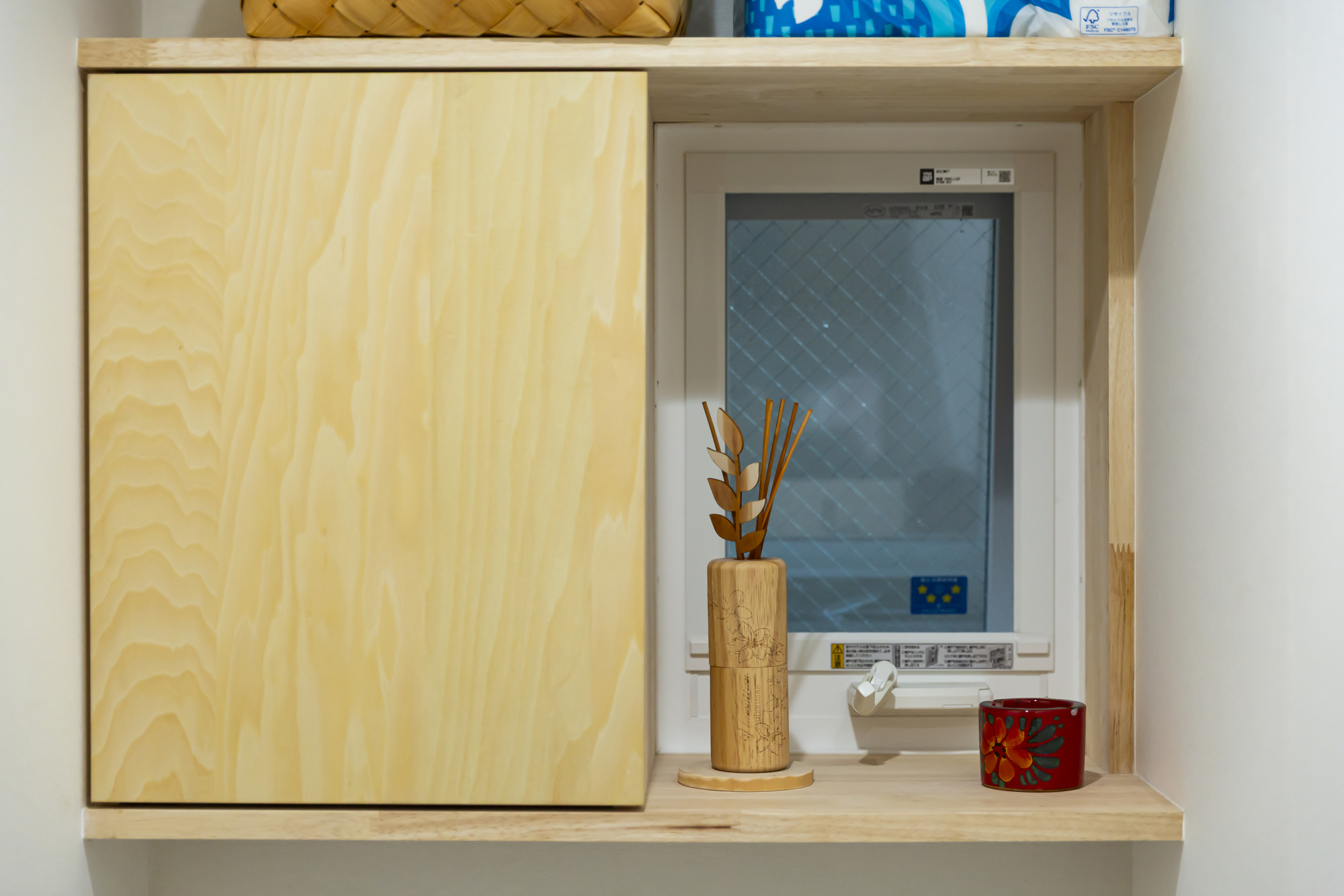 14.8坪の街中狭小地に建つ二人暮らしの為の住まい。素材、性能、デザインにとことんこだわり抜いた一邸になりました。密集した立地ながらも周囲からの視線を気にすることなく配慮しながらも明るい室内空間に。コンパクトながら夫婦二人とワンちゃんが快適に過ごせる分の大きさで設計された家ですが、室内の床は無垢フローリング、壁天井は和紙で仕上げ、木材を用いた造作家具で質感のある上品な住まいになりました。非常にコンパクトな敷地の中で、建物周囲に足場を建てられるように空間を開けているので将来のメンテナンスも行いやすく、長く愛着をもって過ごせるお家です。