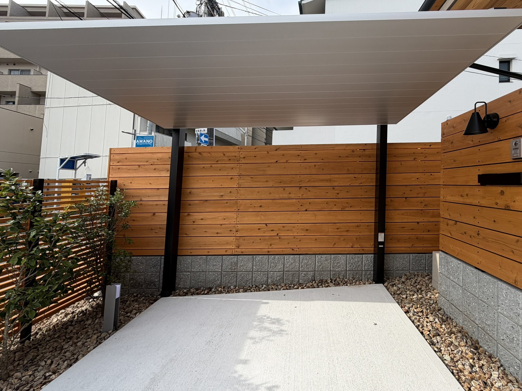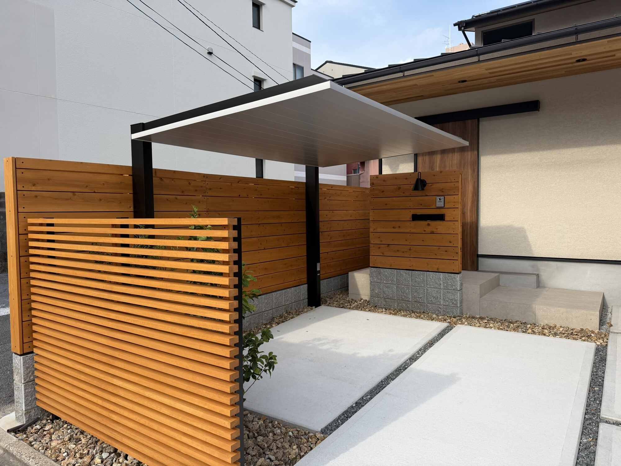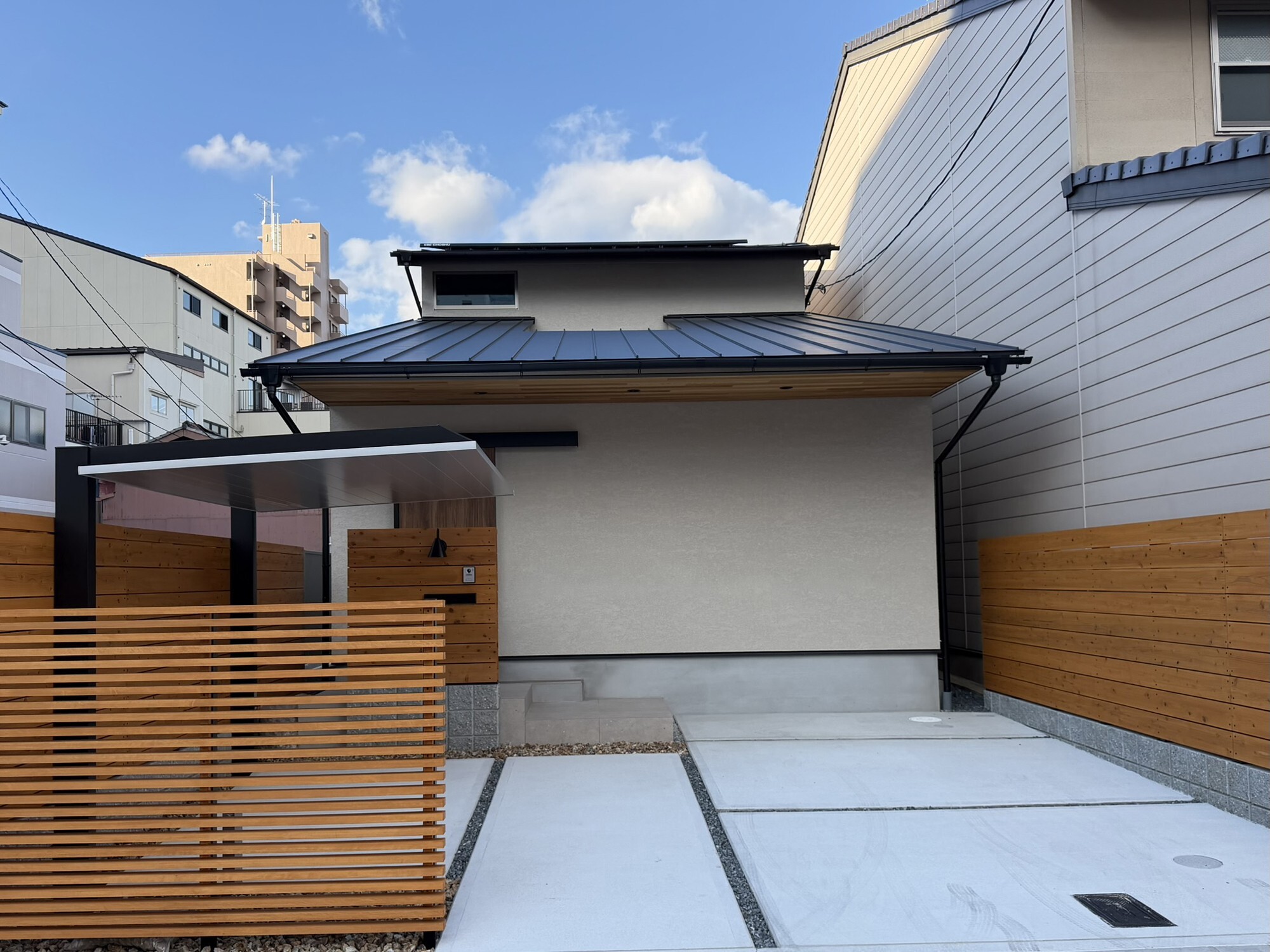 上京区の街中に建つ一邸。大通りに近く、近隣にはマンションなど大きな建物が建ち並びます。そのような環境の中で比較的ゆとりのある敷地面積を生かして中庭を設けました。中庭を囲む四方のうち三方は1階建にして南面の一方だけ2階建にすることで、プライバシーを保ちながらも、明るく開放的な空間になります。中庭に面したリビングからは吹抜けを介して空を見ることができ、周囲の高い建物が目に入らないように工夫しました。この家のもう一つの特徴は、長さが9mもある大きな本棚です。玄関から中庭に面した廊下からLDKまで、一つの大きな本棚が印象的な空間を作り出します。LDK 部分の本棚は仕切りを減らして一部壁掛けのTVを設置できるようになっています。また造作のキッチンはシンクとコンロが分かれているⅡ型の形式です。シンク側の天板はモールテックスというコンクリートのような表情のある素材で仕上げています。モールテックスは木との相性がとても良いのでこの家の雰囲気を引き立てる要素になります。コンロ側の天板はバイブレーション仕上のステンレスとなっておりコンロの油はねなどに強い素材で仕上げました。格子壁のあるベンチはオーク材で作り、換気の窓とバランスをとって全体をデザインしました。ダイニングテーブルを置くと6人がけになります。さらに中庭に面した洗面スペースは鏡越しに中庭の紅葉が見えるようにデザインしました。段違いに配置した鏡のスペースを使って小物が配置できるように工夫しています。洗面スペースをリビングから仕切りなくパブリック側のスペースに設けているため来客時にプライベート空間に入らなくても手を洗ってもらえます。最後に吹抜けに面した2階の空間です。階段を上がってすぐのところにフリースペースを設けました。明るくてリビングを見下ろす位置にあるこの空間は本を読んだりちょっとくつろいだりできる空間です。吹抜けに面した主寝室には内窓があり中庭の光を間接的に取り込むことができるように工夫しています。中庭・吹抜け・本棚を軸に統一感のある心地よい空間を目指しました。