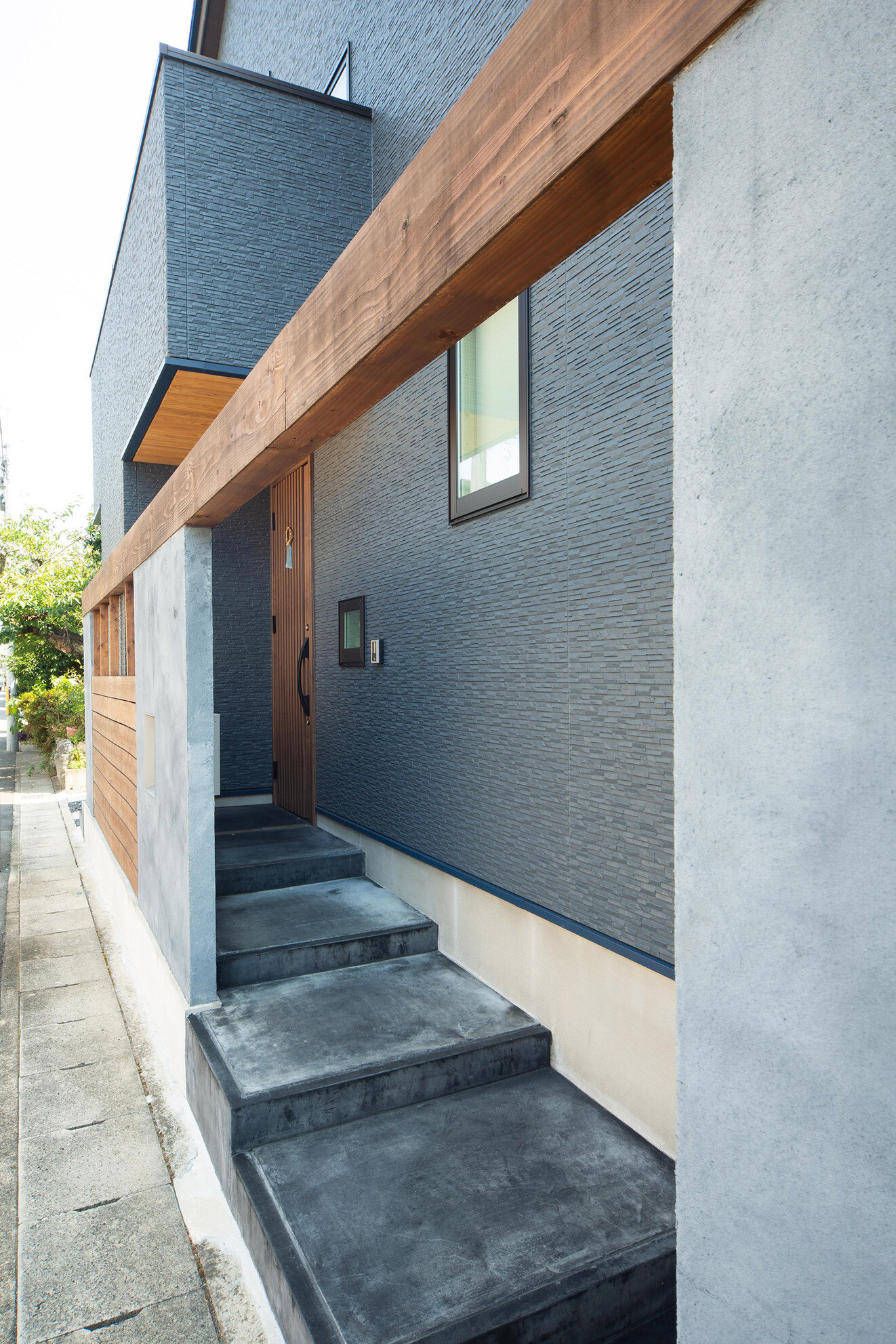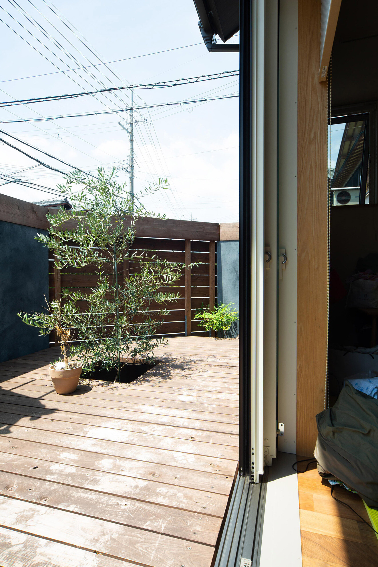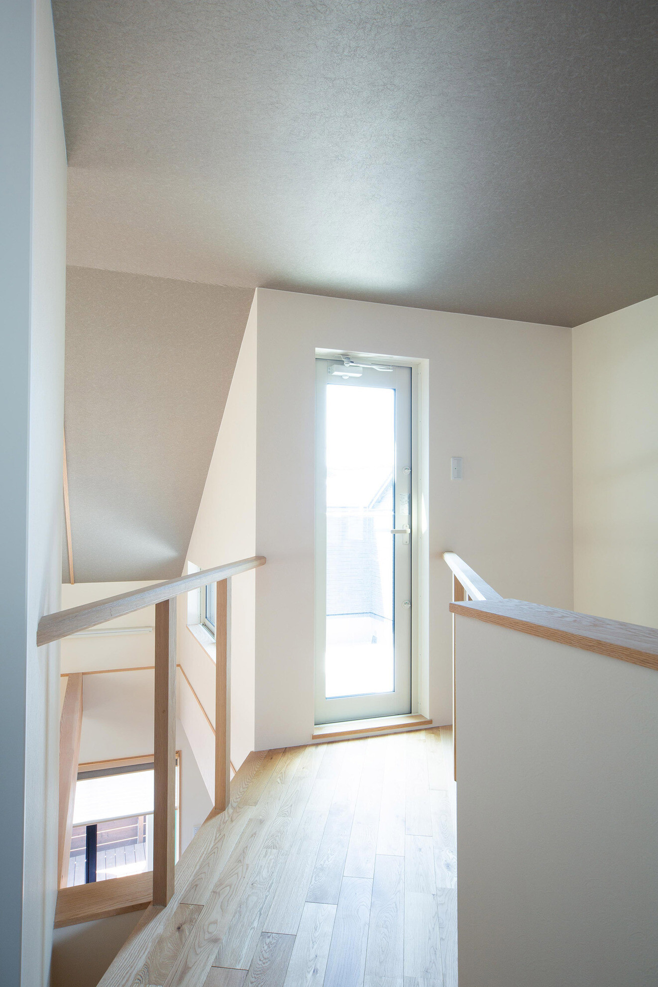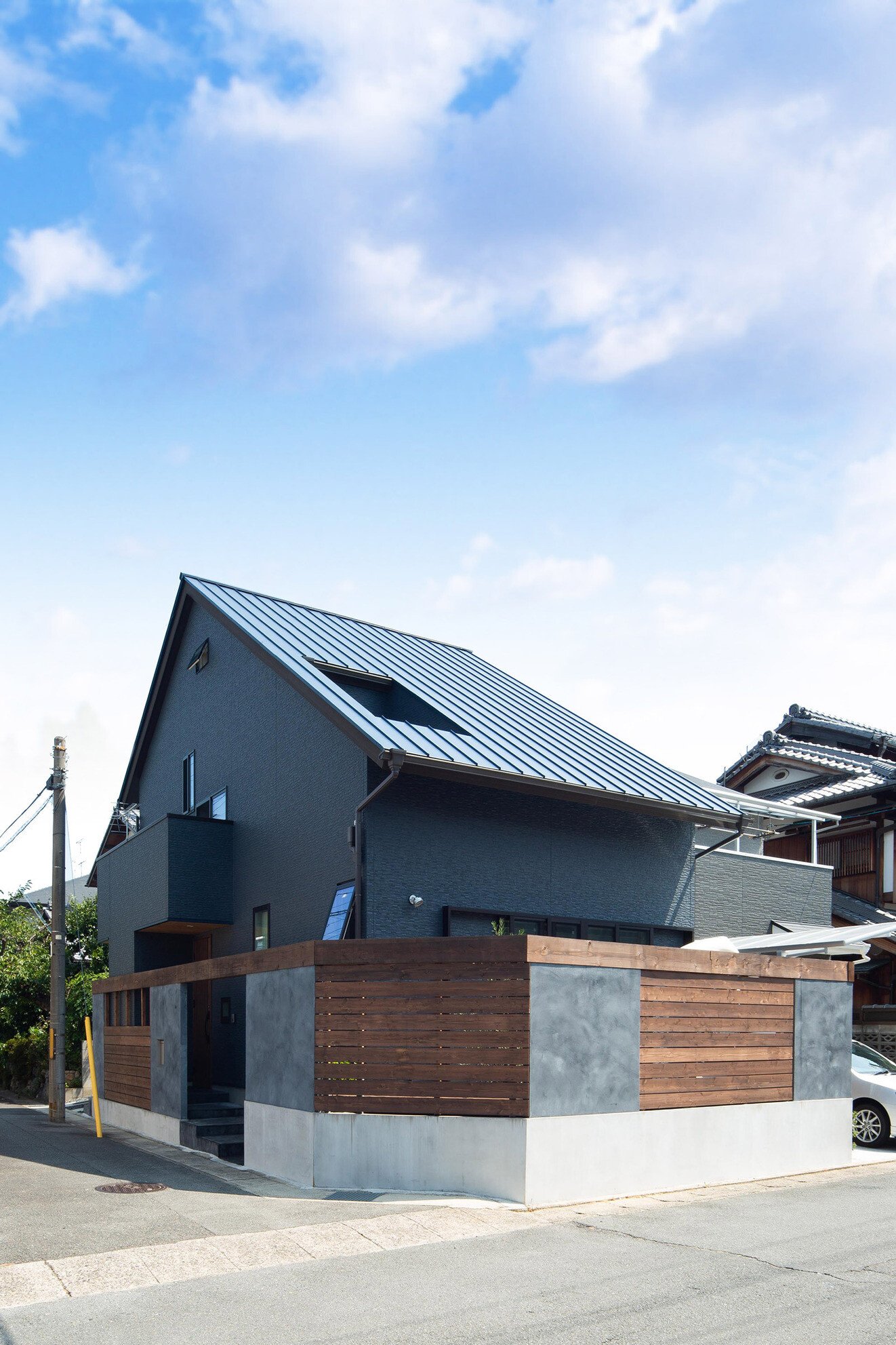 左官塀に囲まれた落ち着いた表情のお家。プライバシーを確保しつつ開放的なリビングを両立するデッキコートテラスを設けました。屋根形状を活かした勾配天井や屋根をくり抜いた形状のバルコニーと空中廊下。遊び心ある空間を質感のある素材で仕上げました。