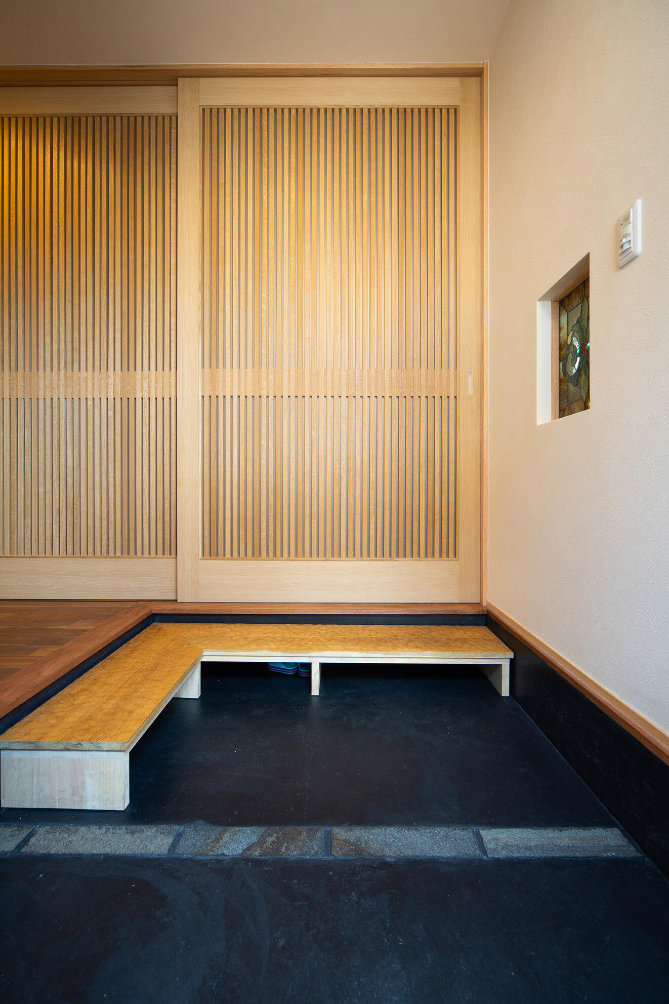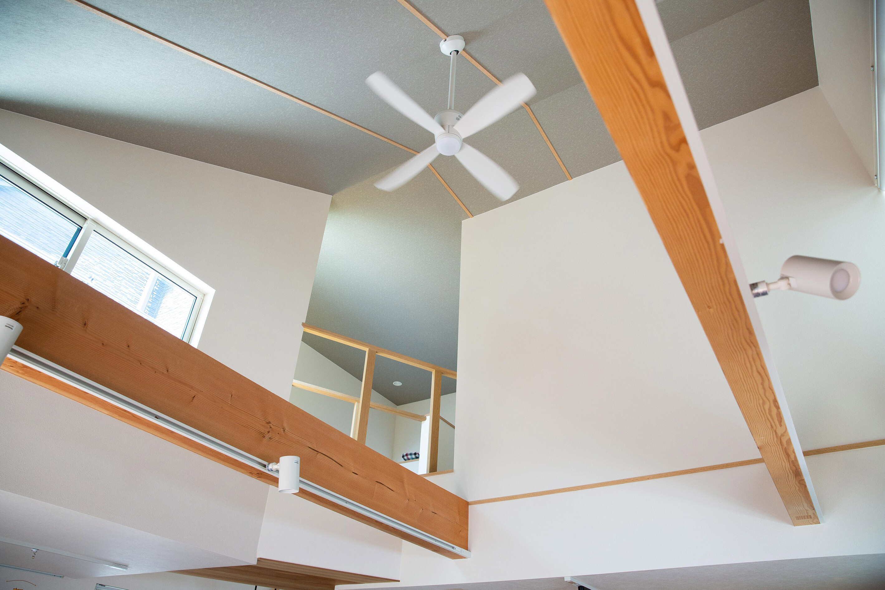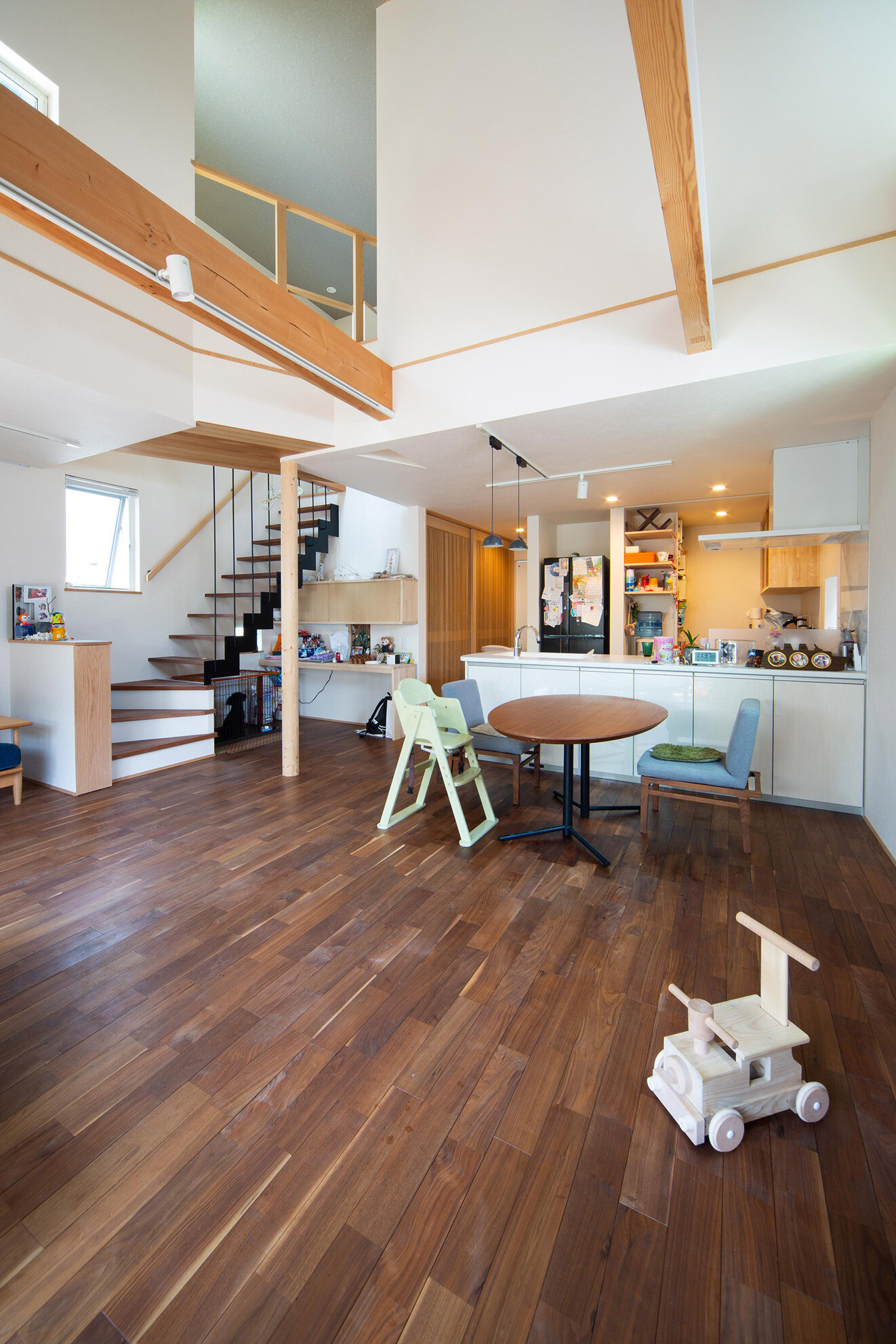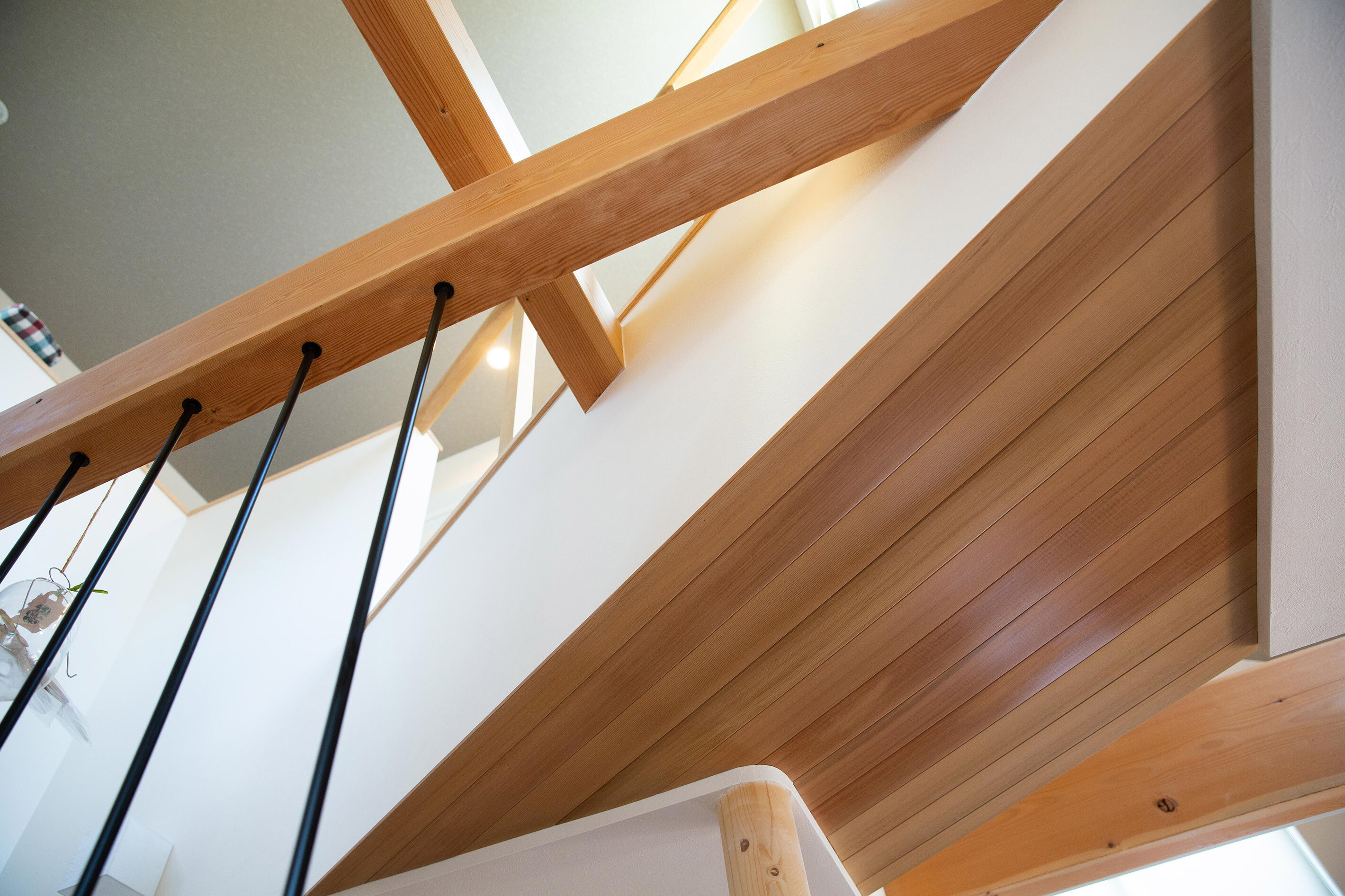 左官塀に囲まれた落ち着いた表情のお家。プライバシーを確保しつつ開放的なリビングを両立するデッキコートテラスを設けました。屋根形状を活かした勾配天井や屋根をくり抜いた形状のバルコニーと空中廊下。遊び心ある空間を質感のある素材で仕上げました。
