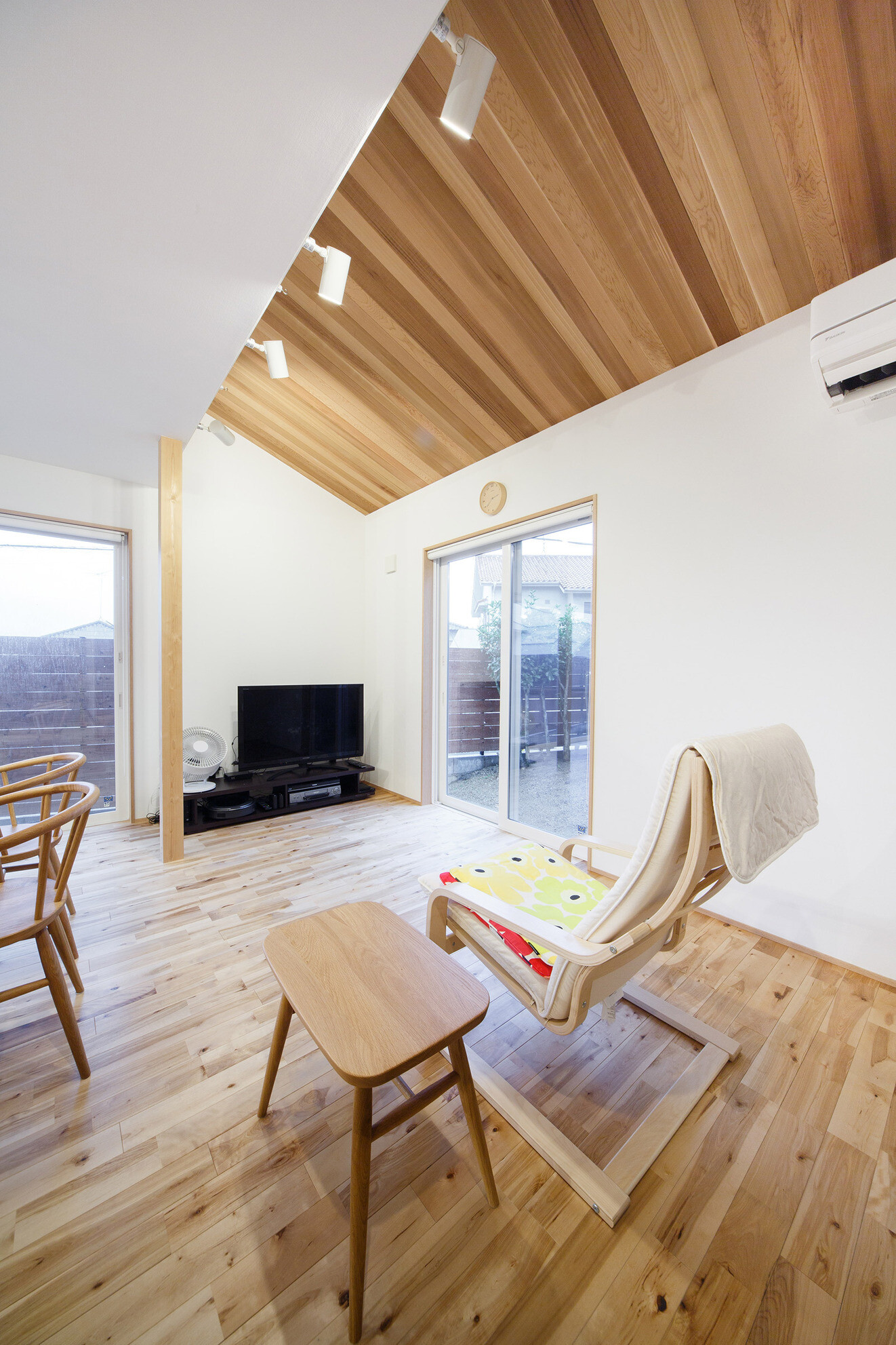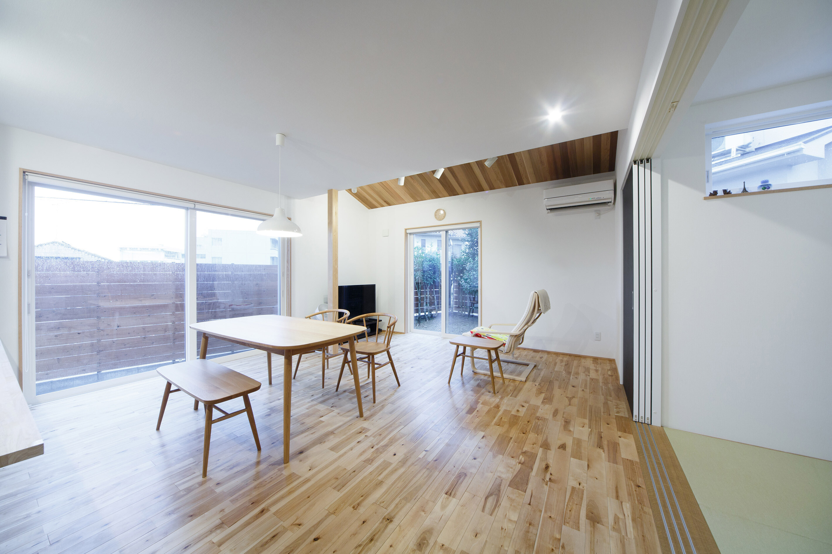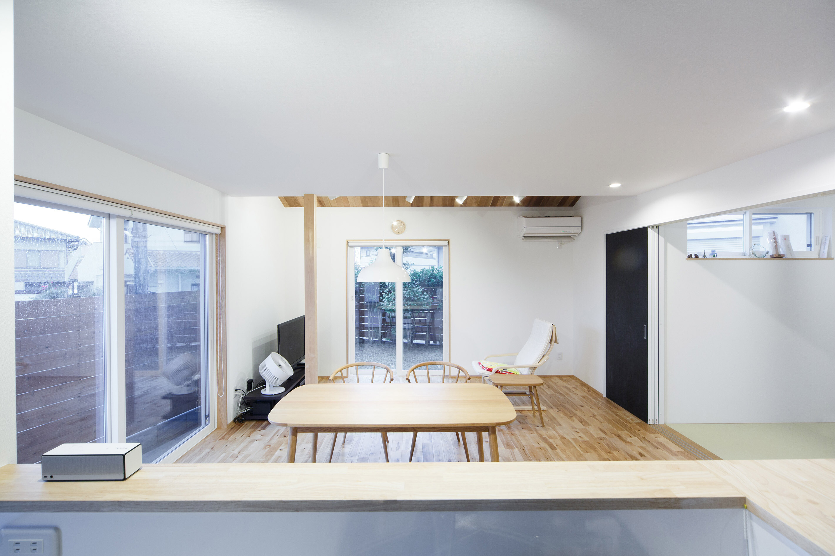 住宅地の高台に建つ一邸。シンプルな構成の中にどこか温かみを感じさせるようなフォルムや素材で設計されています。高台に臨むリビングは外部の視線に干渉されないようにしながらも明るく風の抜ける心地よい空間となっています。