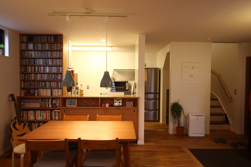 街中に建つ二世帯住宅。細長い敷地に部屋数の多い間取り、暗くなりがちな条件の中で光床を効果的に取り入れることで日中の快適さを確保しています。異なる世代が良い距離感をもって快適に過ごせる家となっています。
