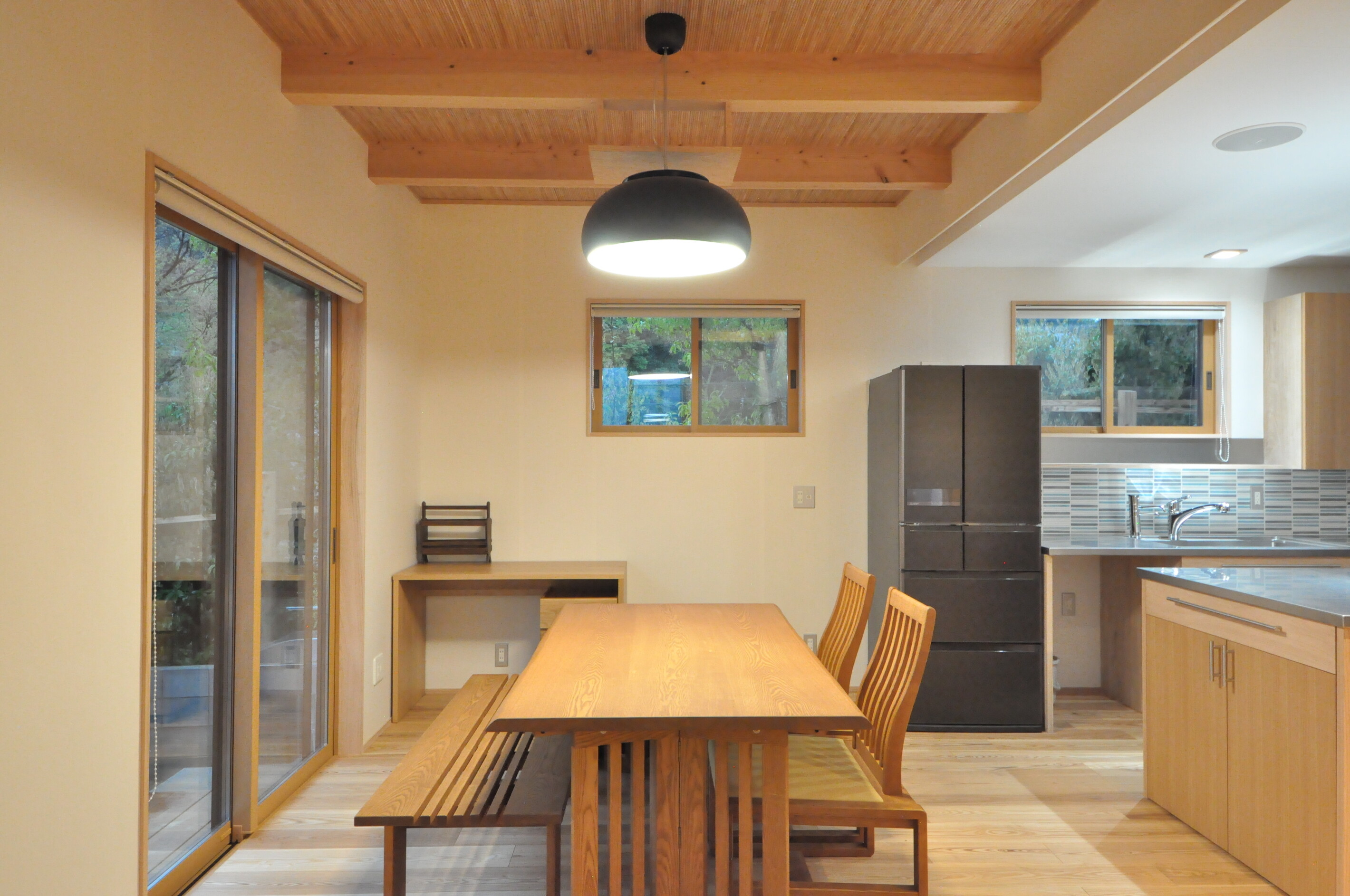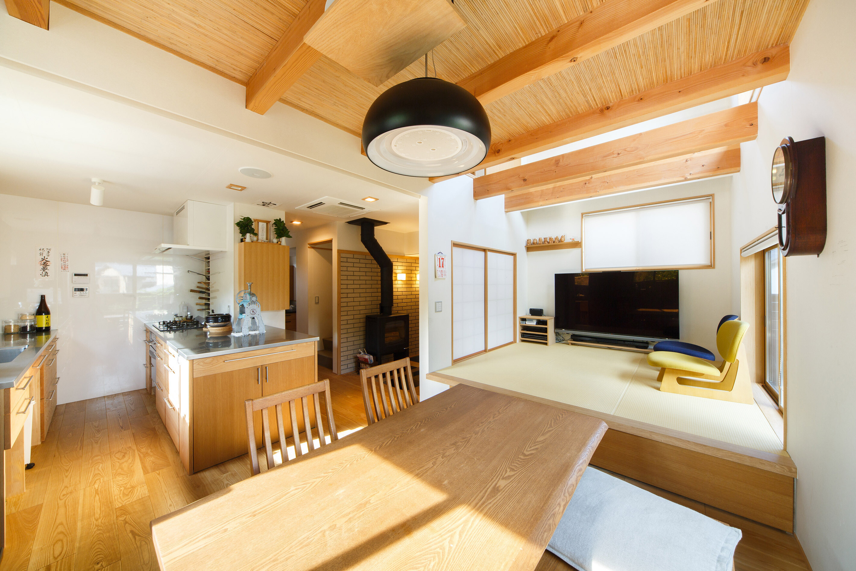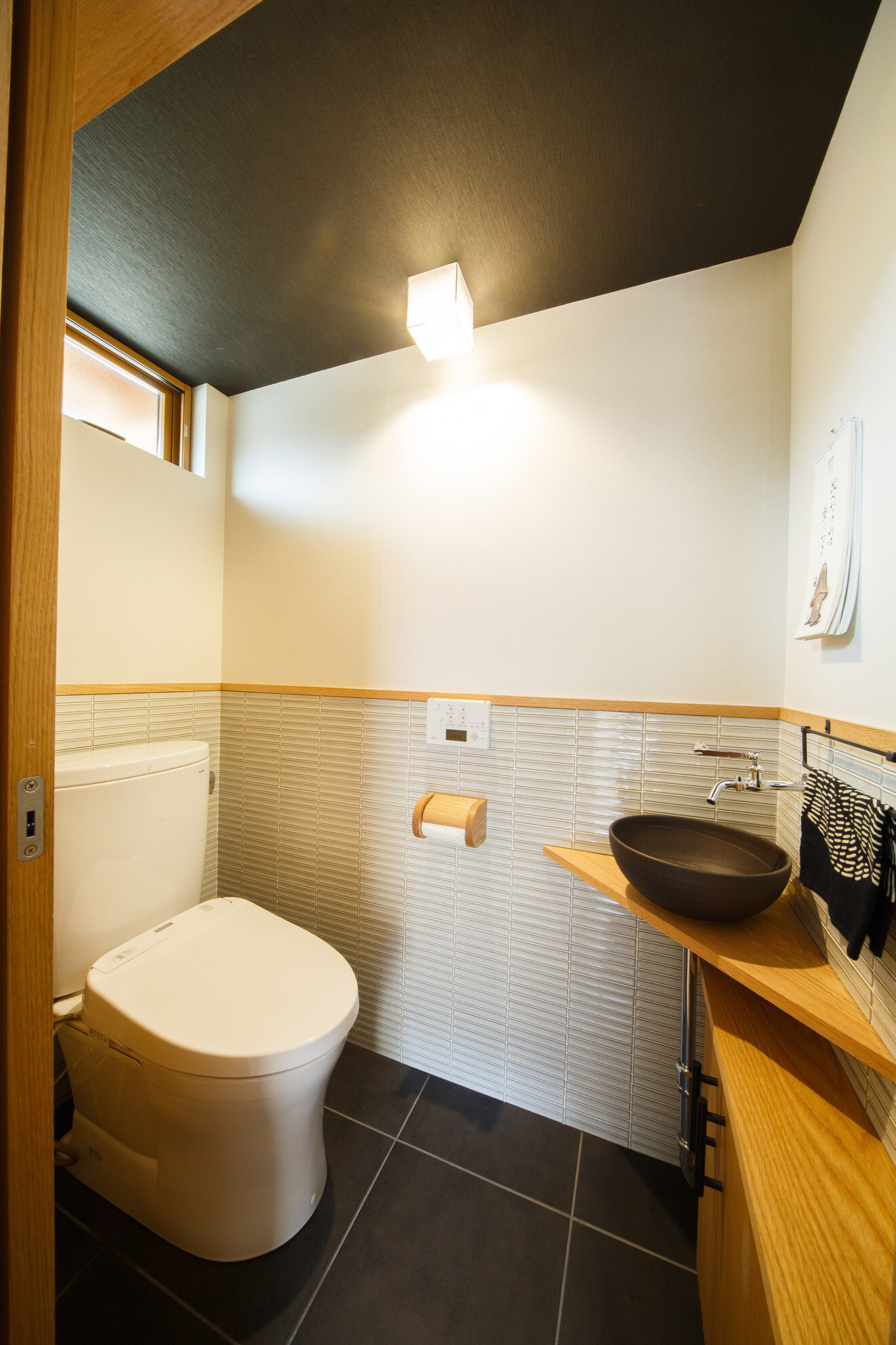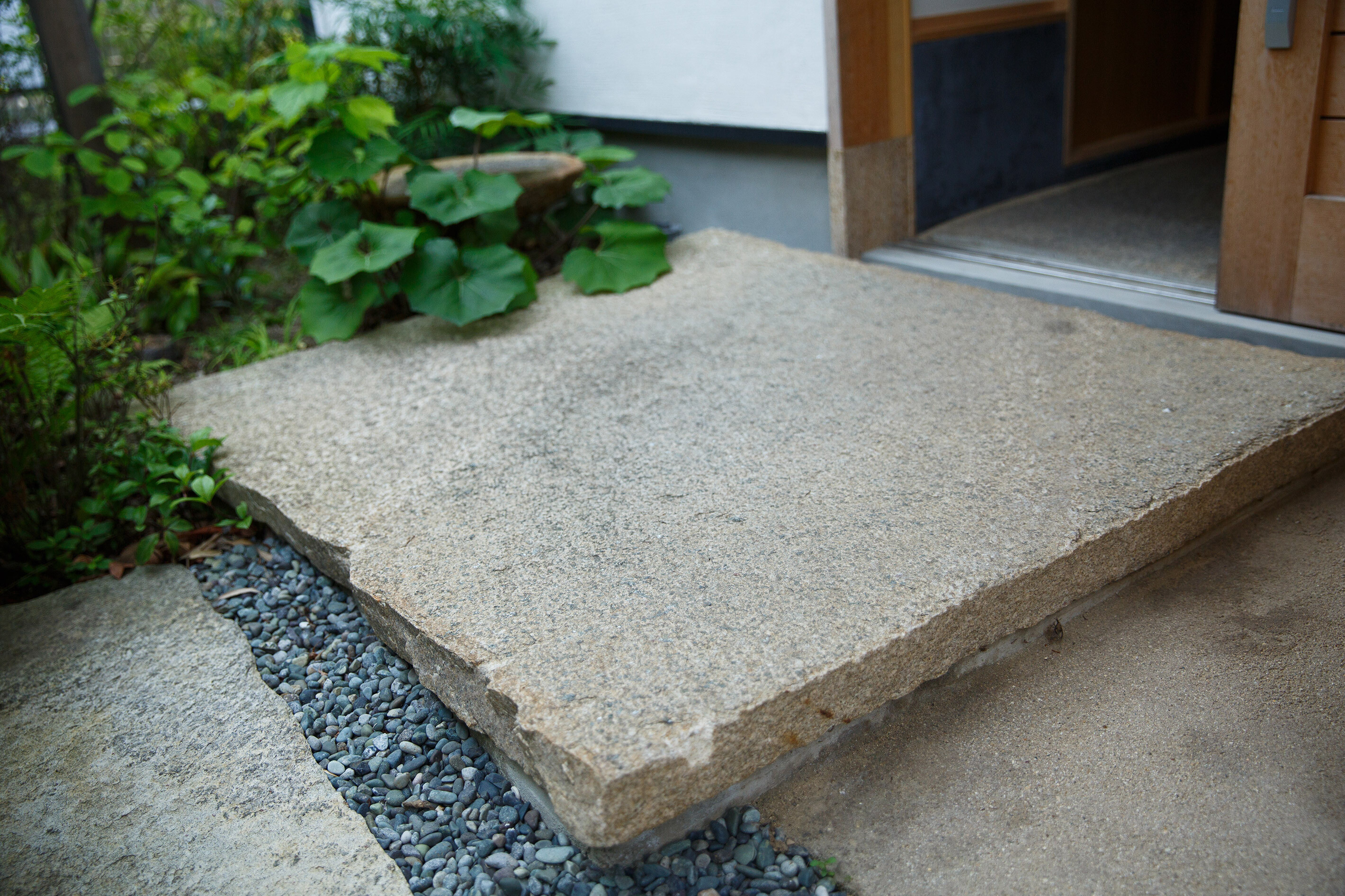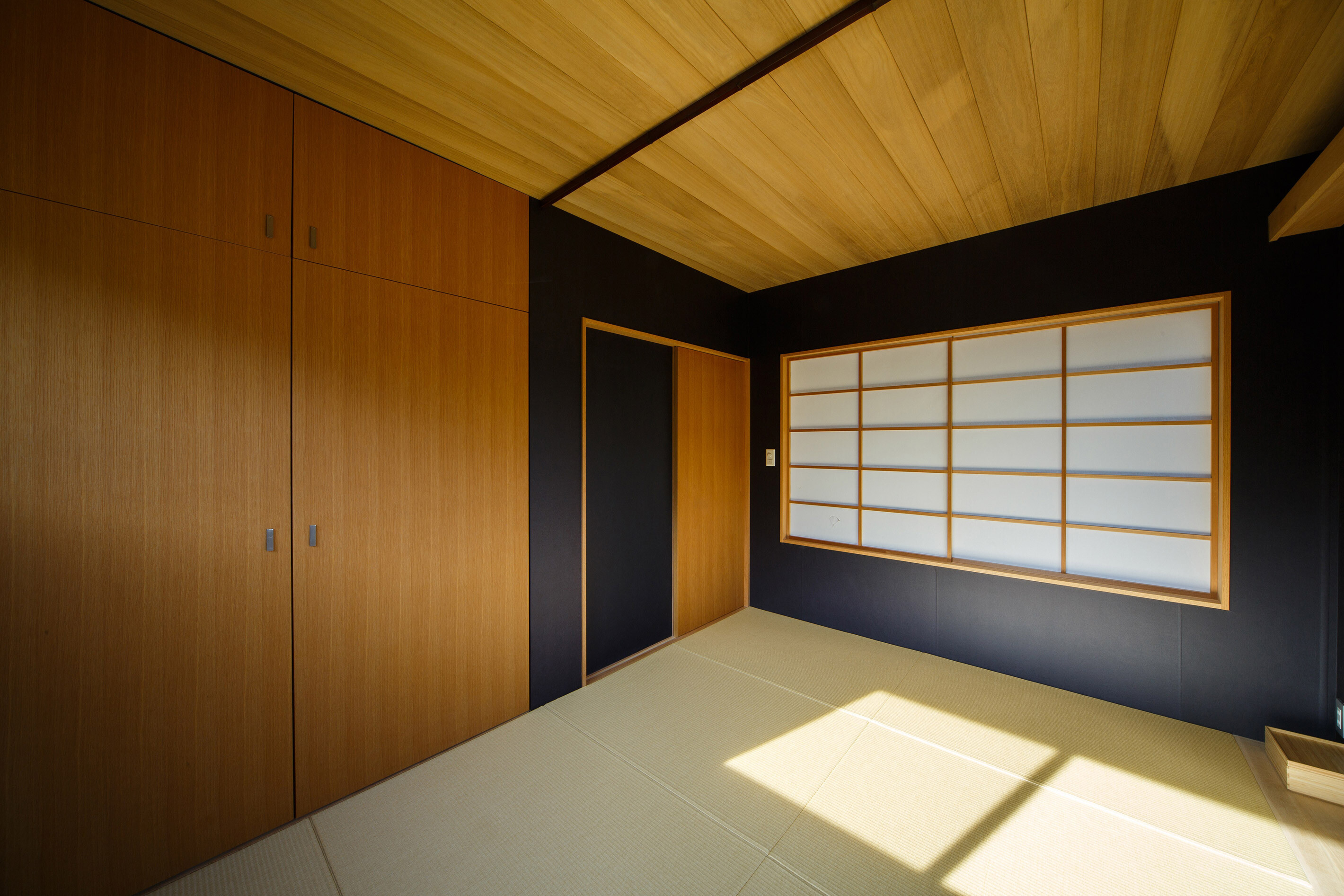 風致地区にたたずむ一邸。室内の間仕切りを可能な限り省略して、空気と光が回遊できるように配慮。その延長に人の動線を重ねて各部屋を配置しました。しっくいと和紙、木とタイルと石、経年変化のある物、ない物を混在させることで年季を感じることのできる贅沢な住まいです。
