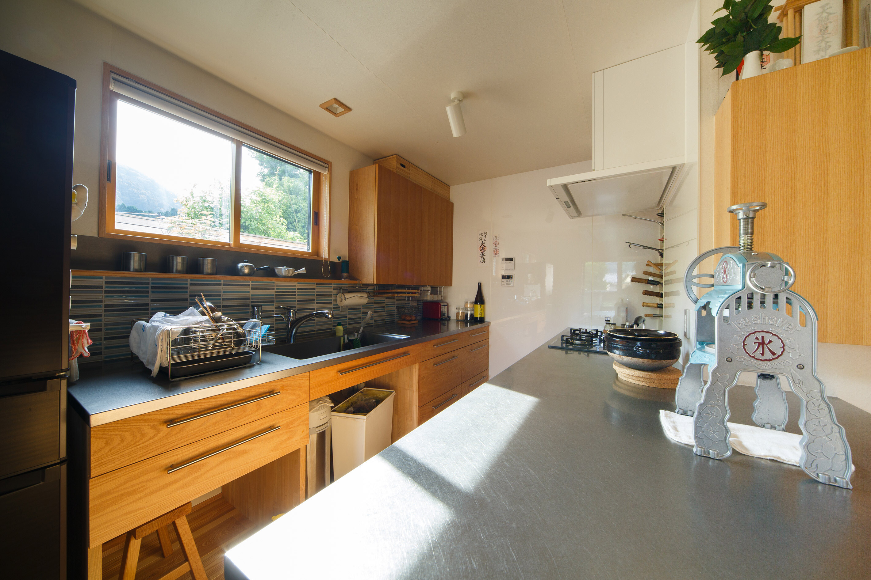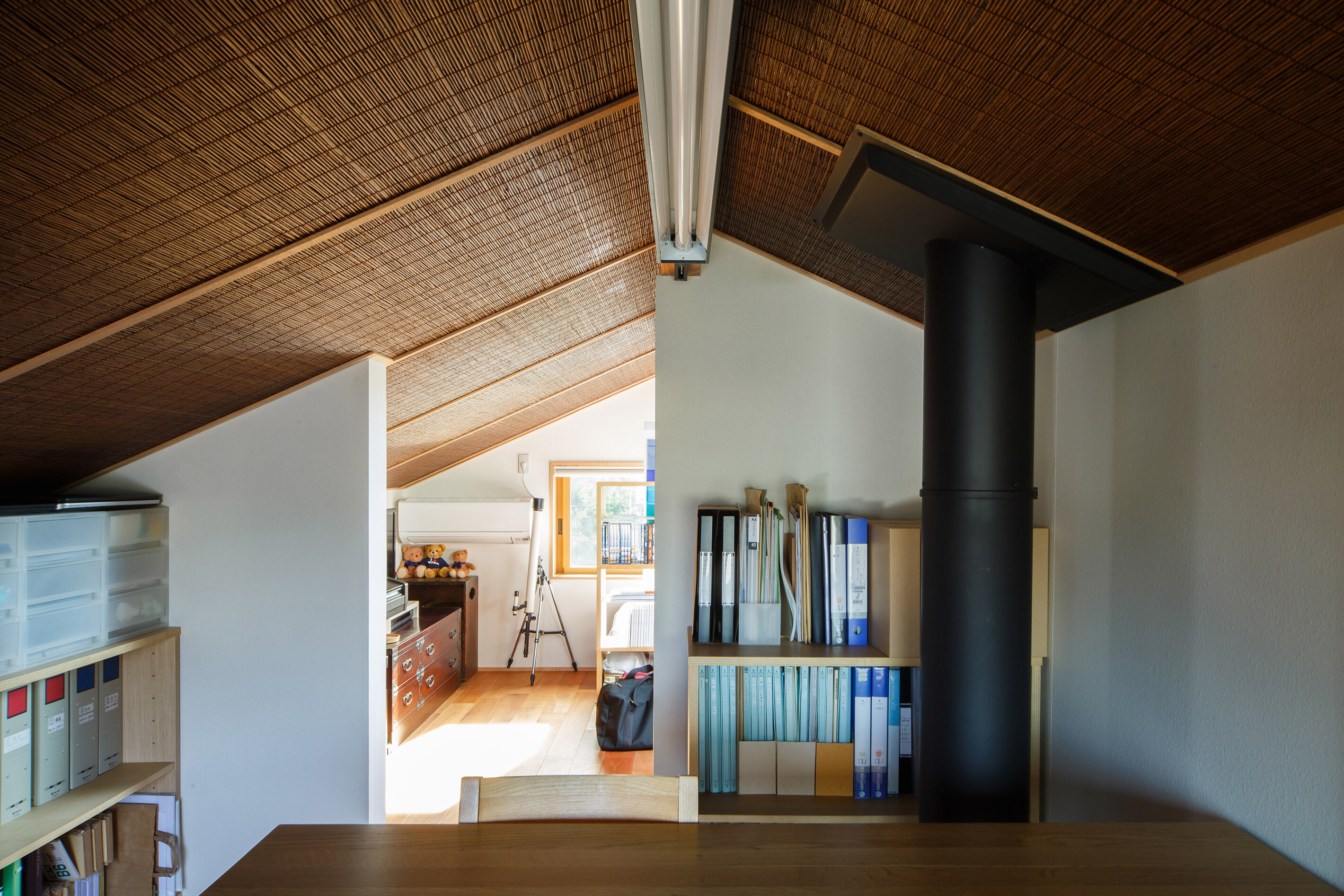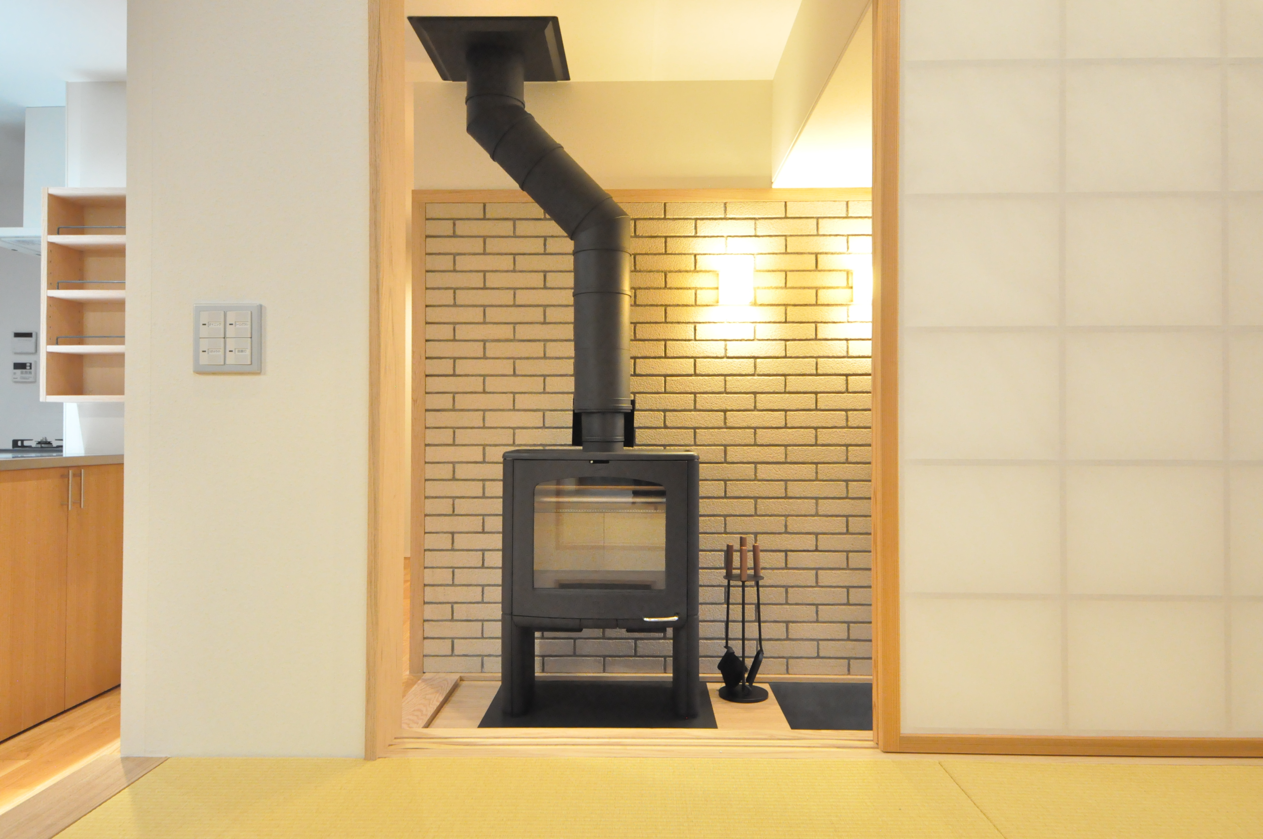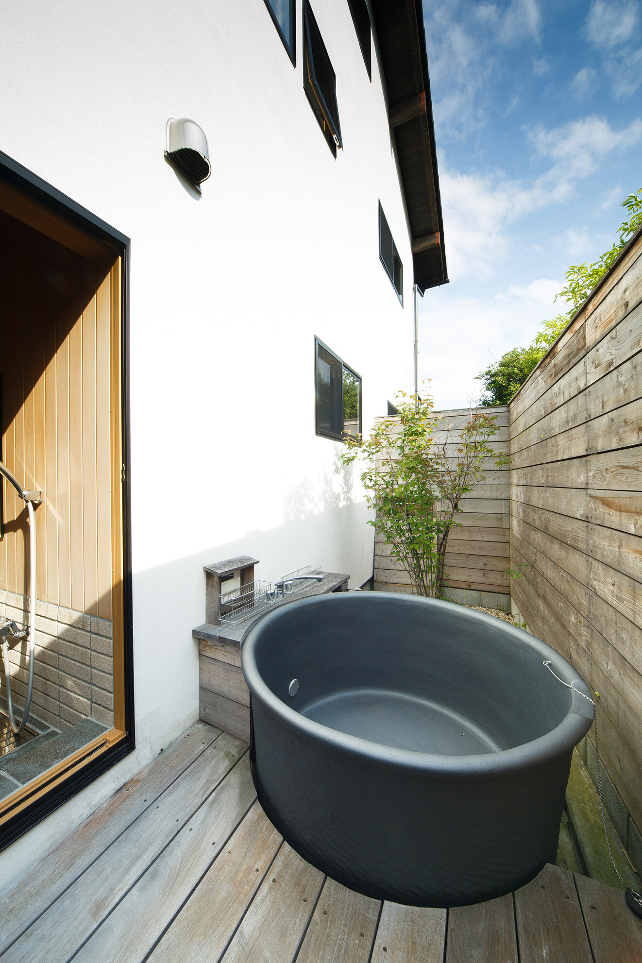 風致地区にたたずむ一邸。室内の間仕切りを可能な限り省略して、空気と光が回遊できるように配慮。その延長に人の動線を重ねて各部屋を配置しました。しっくいと和紙、木とタイルと石、経年変化のある物、ない物を混在させることで年季を感じることのできる贅沢な住まいです。