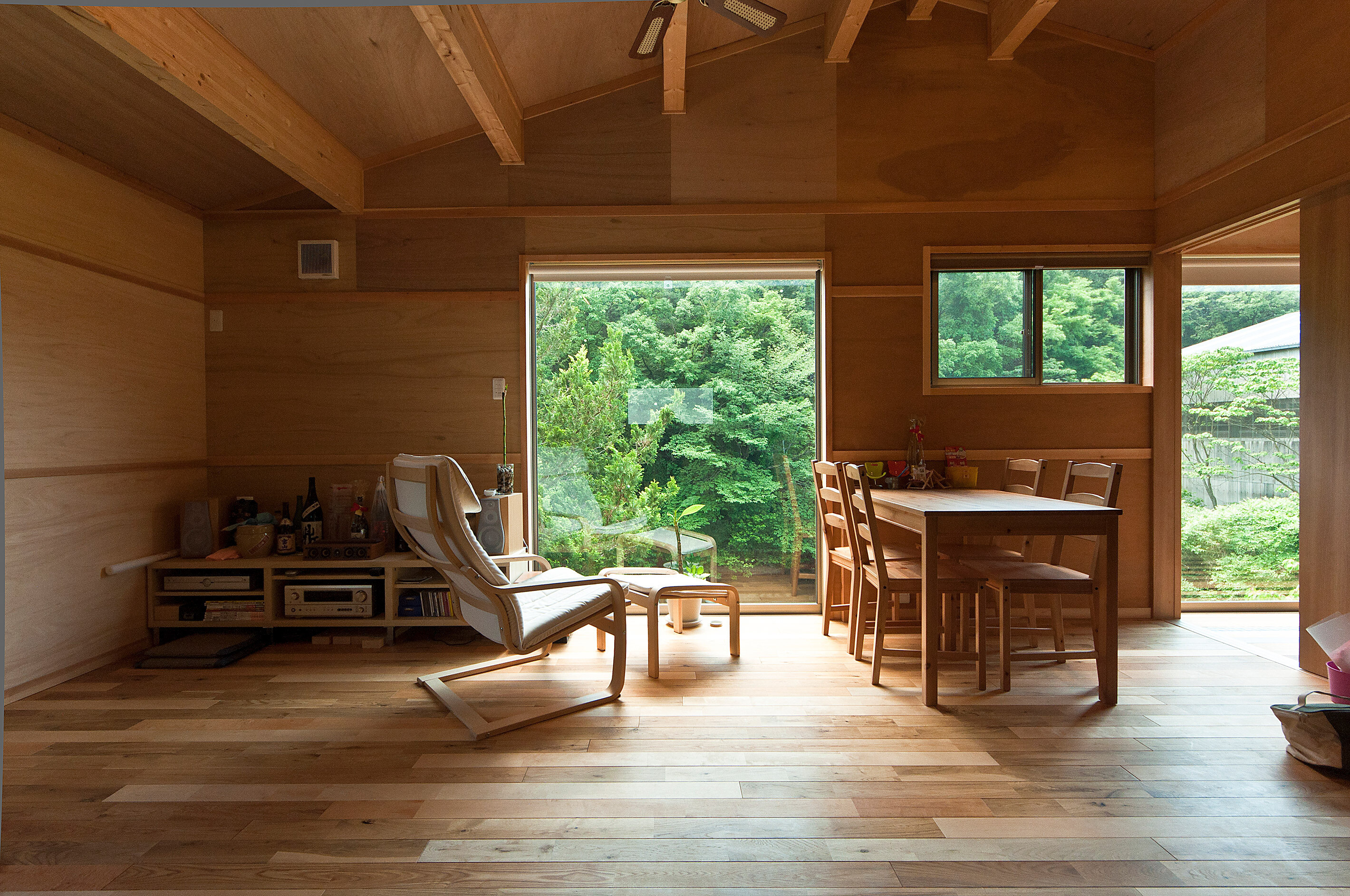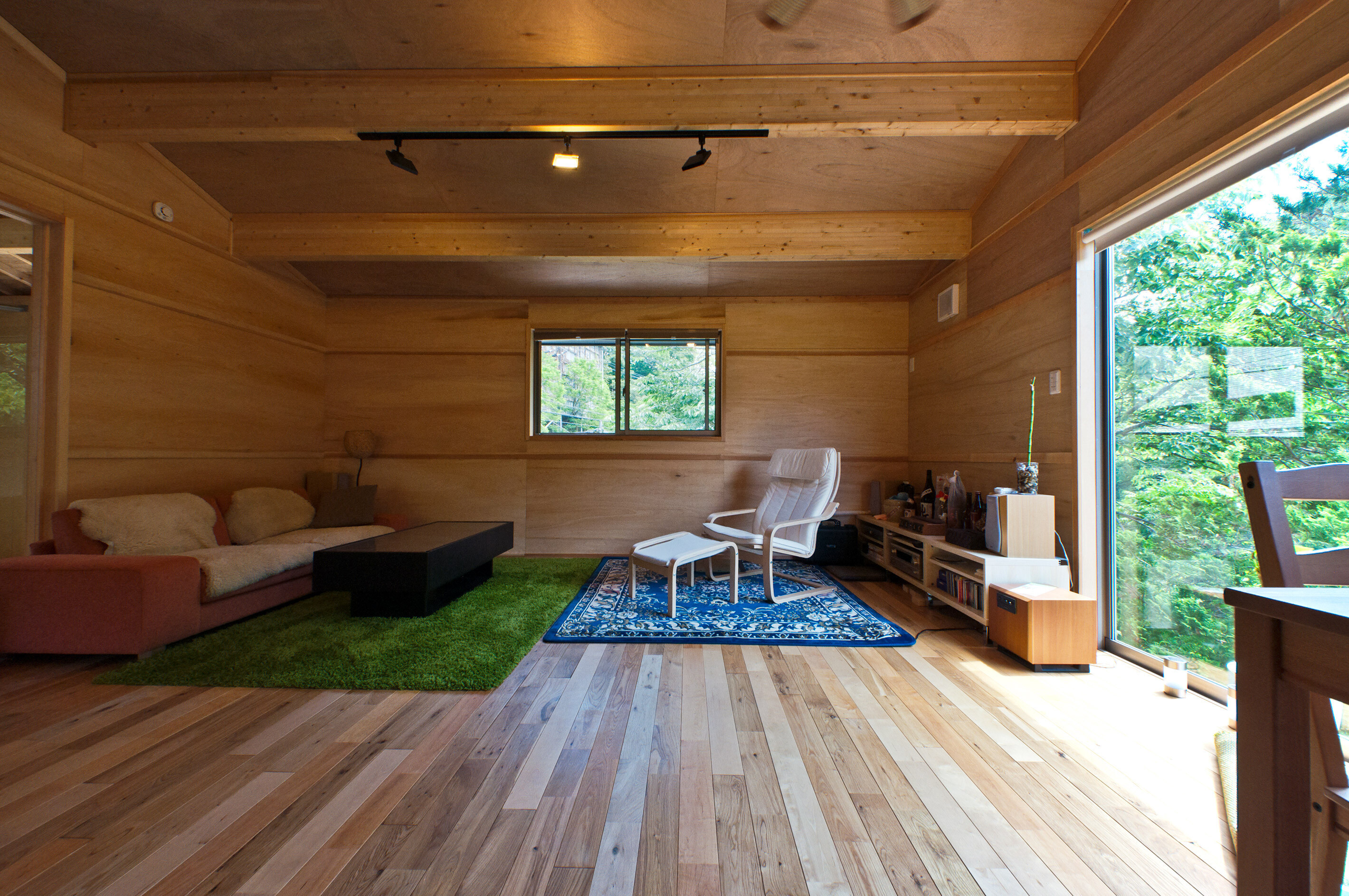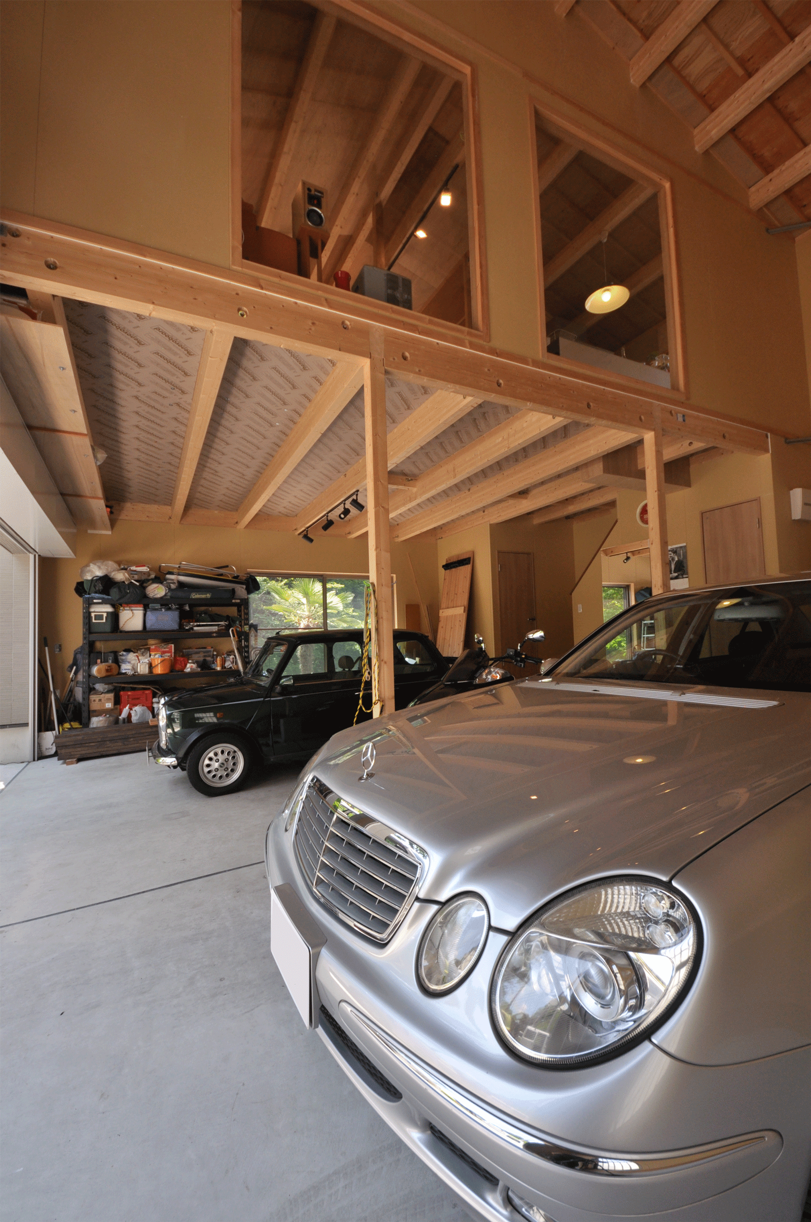 湖畔に建つセカンドハウス。1階には趣味の車を触れるリフト付きのガレージ。2階は簡易的に寝泊りや炊事ができるシンプルな空間を計画。外部にはバーベキューのできる湖に面した大きなウッドデッキもあり、週末を仲間と過ごせる落ち着いた空間となっています。