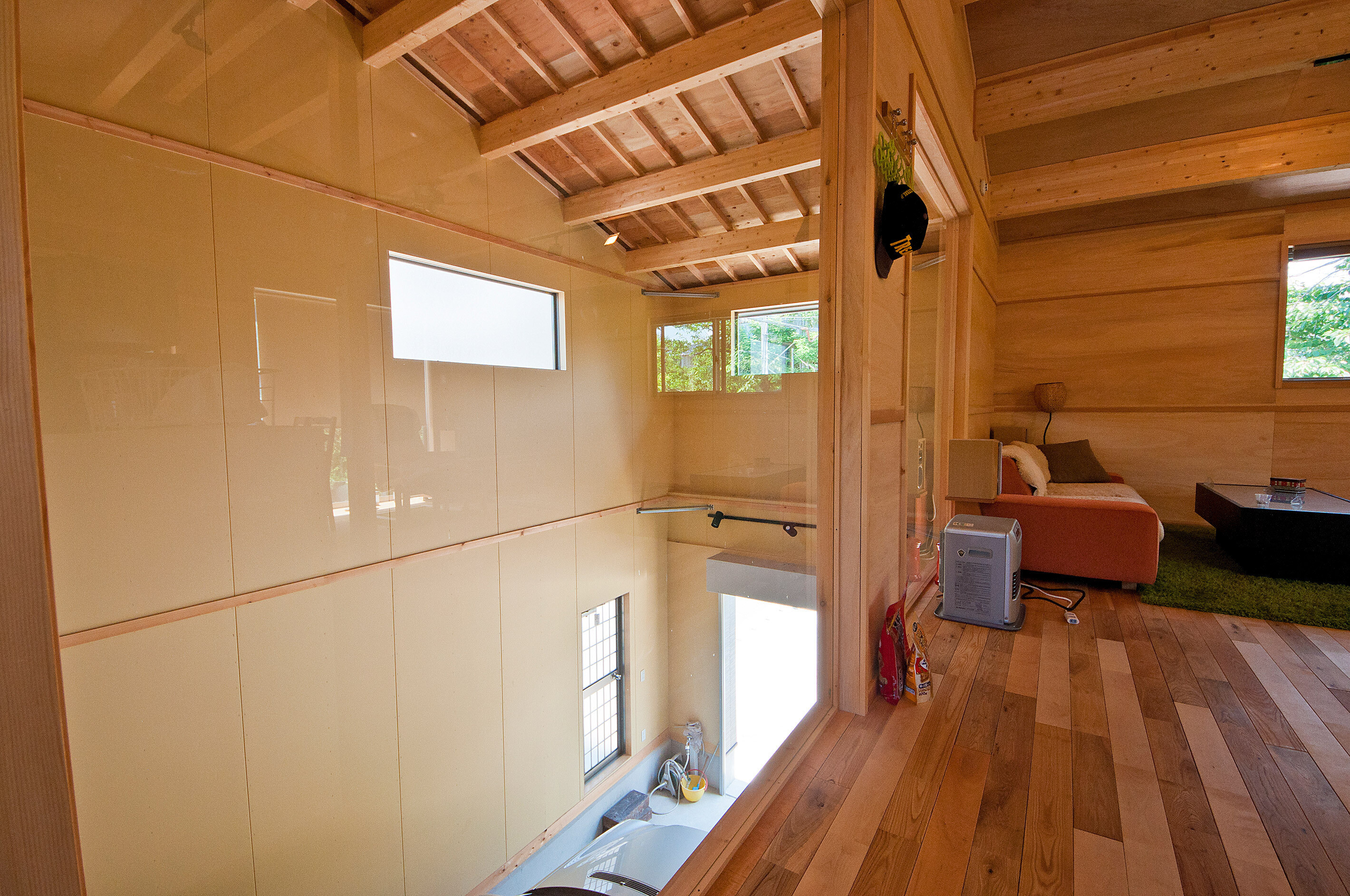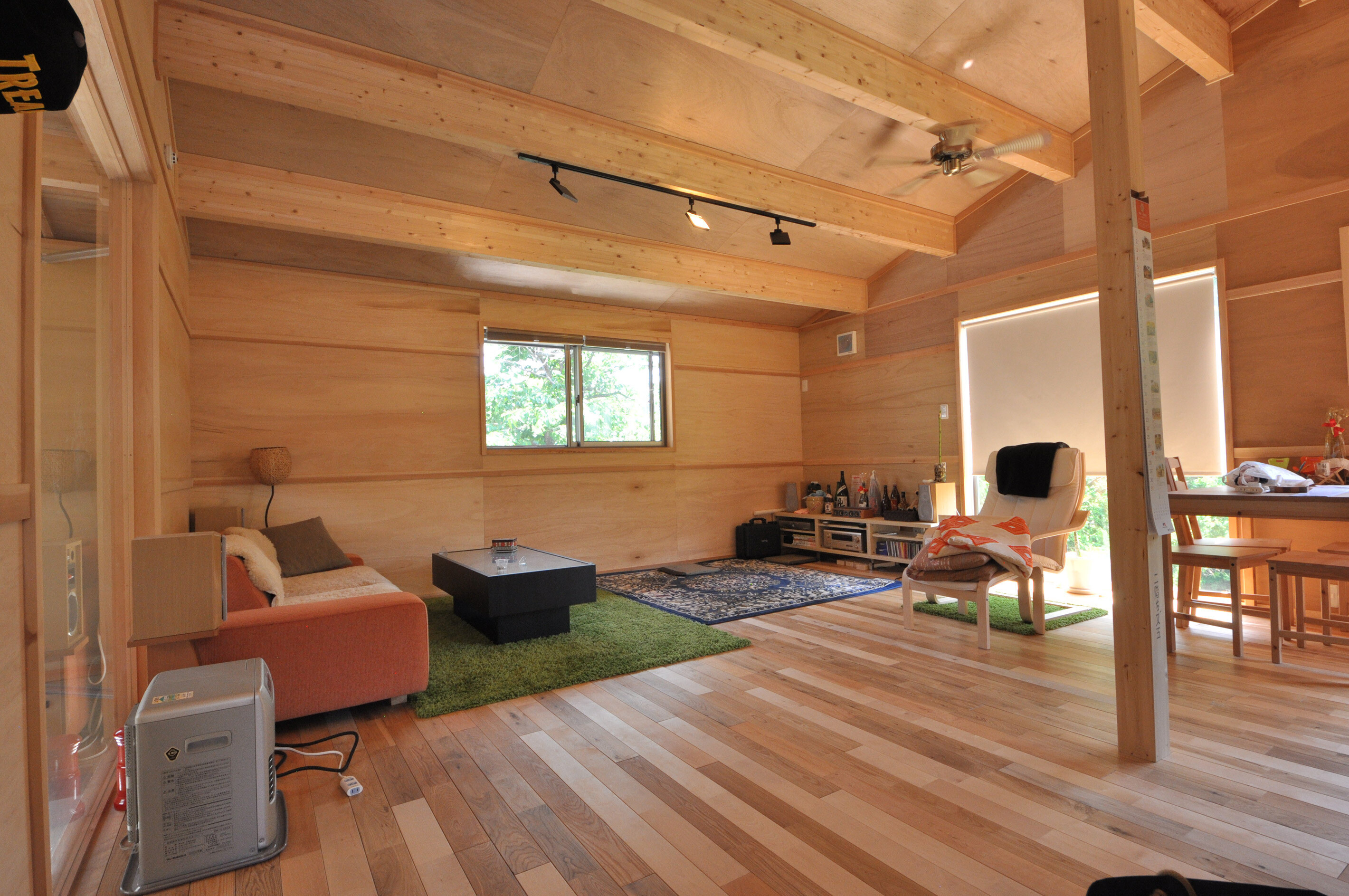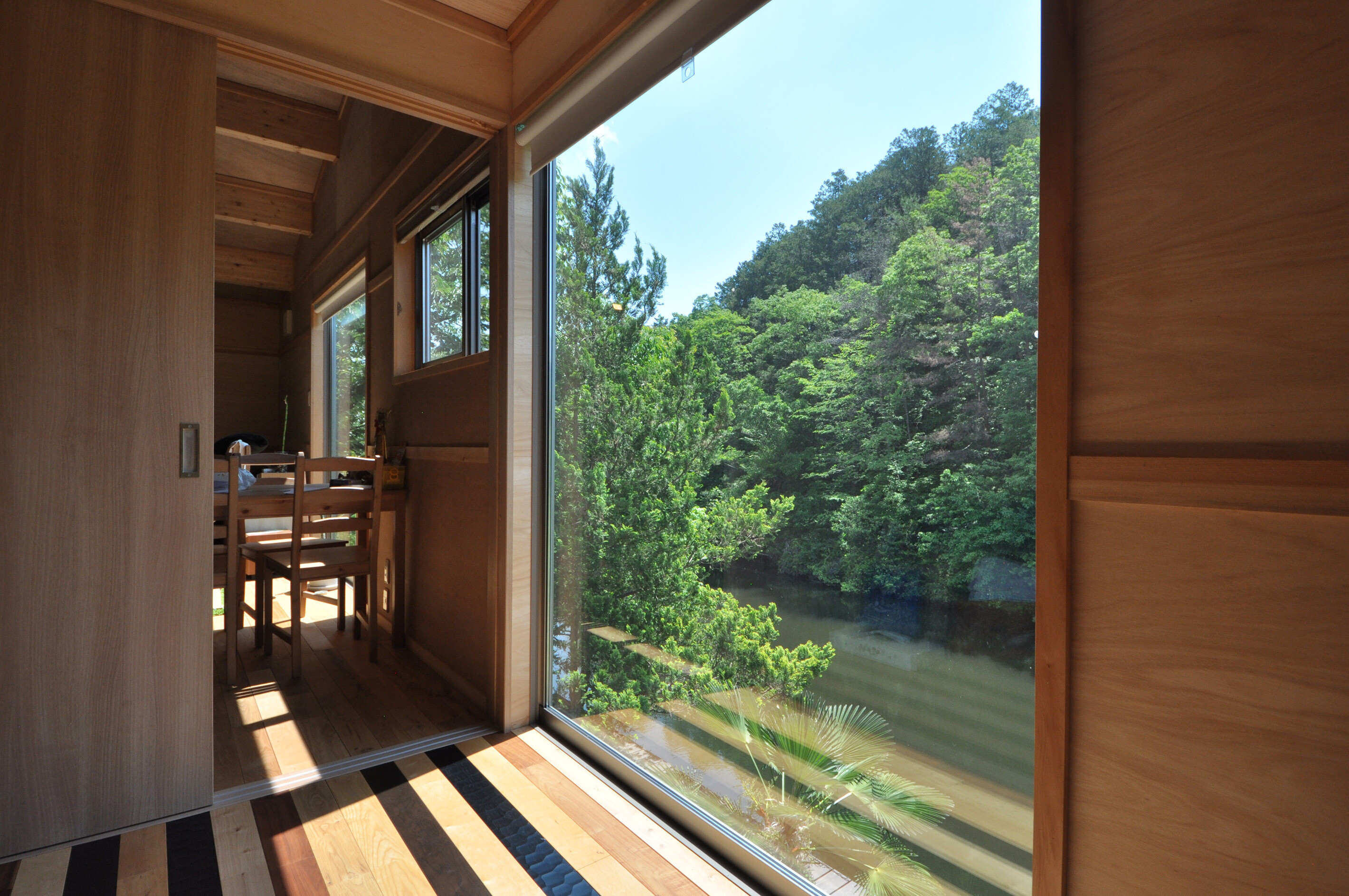 湖畔に建つセカンドハウス。1階には趣味の車を触れるリフト付きのガレージ。2階は簡易的に寝泊りや炊事ができるシンプルな空間を計画。外部にはバーベキューのできる湖に面した大きなウッドデッキもあり、週末を仲間と過ごせる落ち着いた空間となっています。