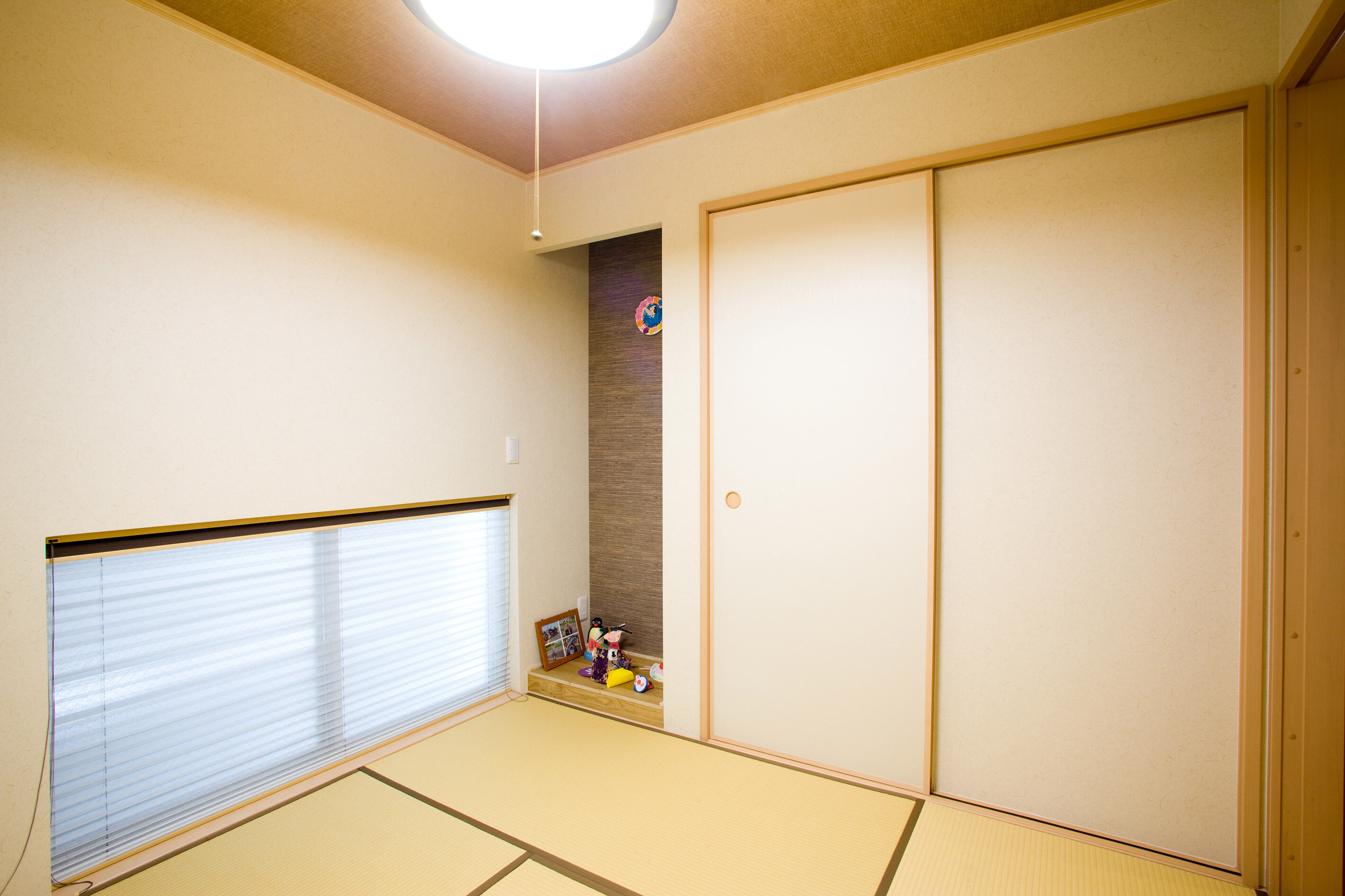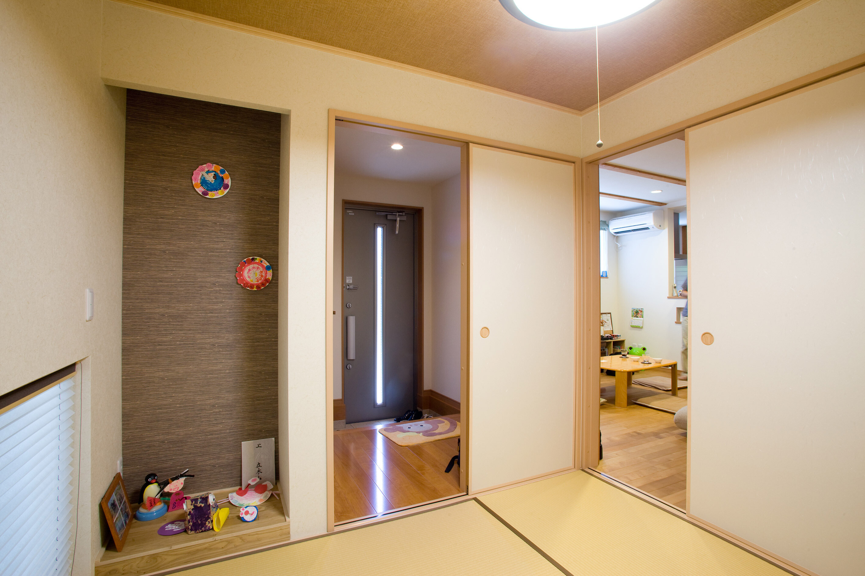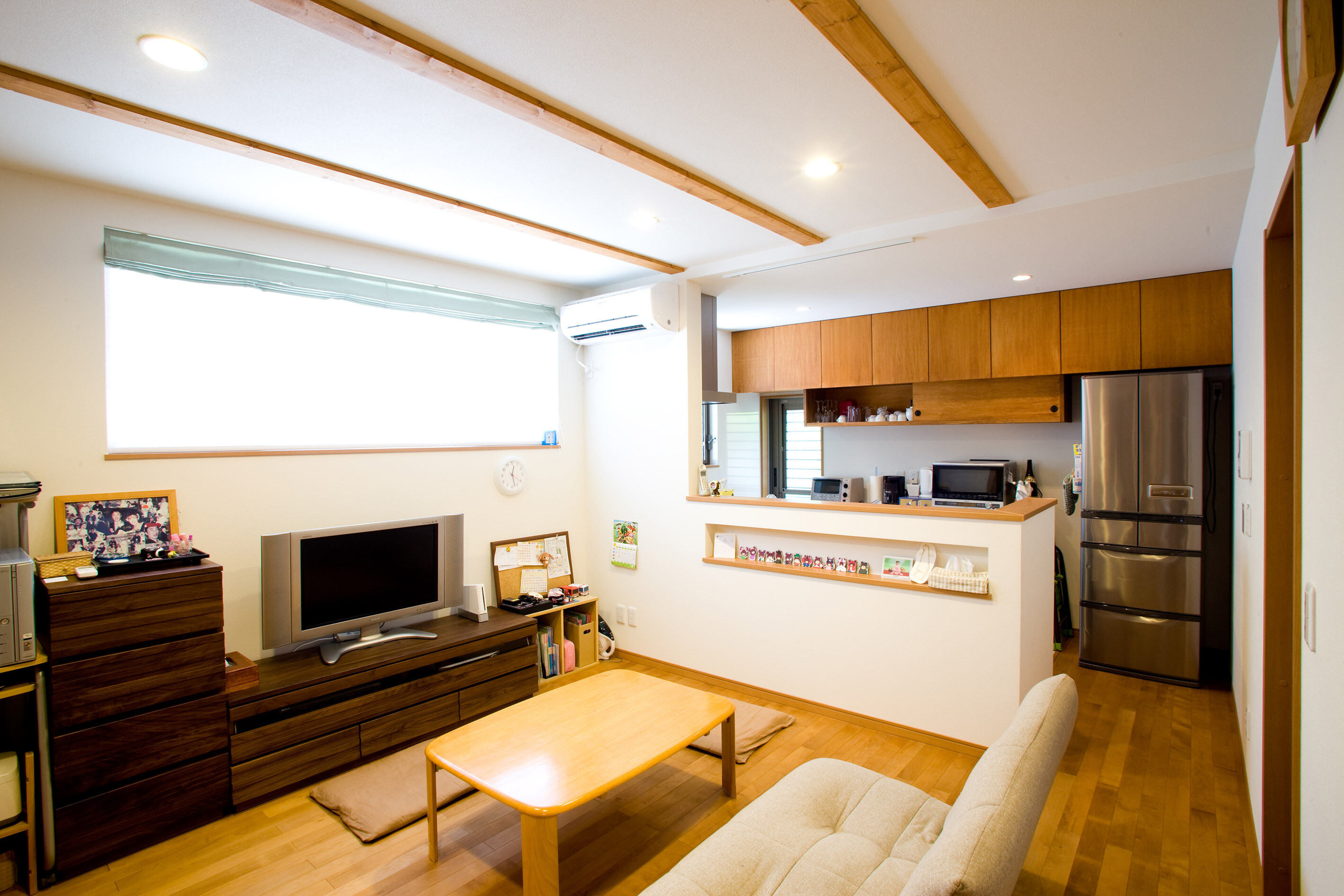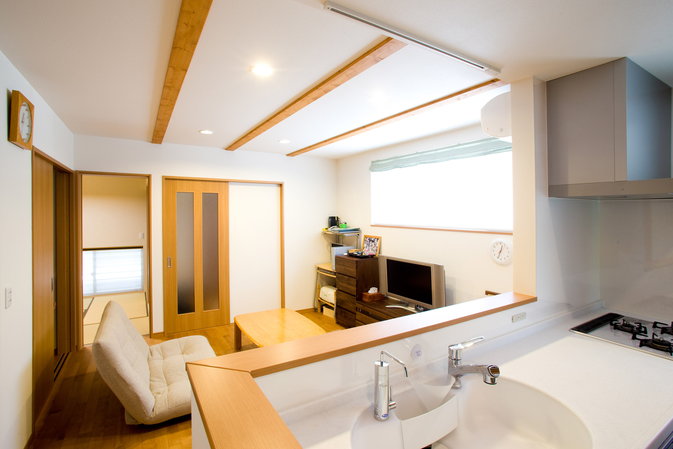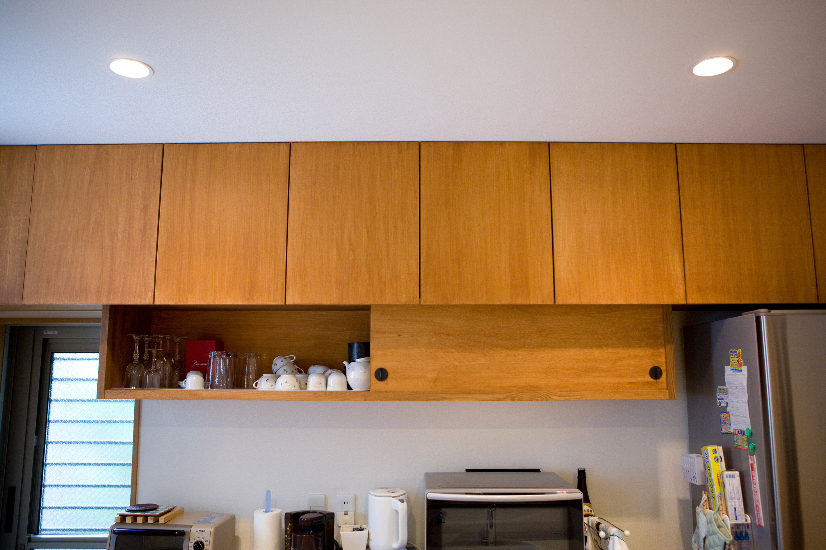 コンパクトな空間に、家族の様子を身近に感じることが出来るように部屋を配置。キッチンにはお気に入りの造作食器棚をベースに、視線の広がりが感じられるように配慮しました。