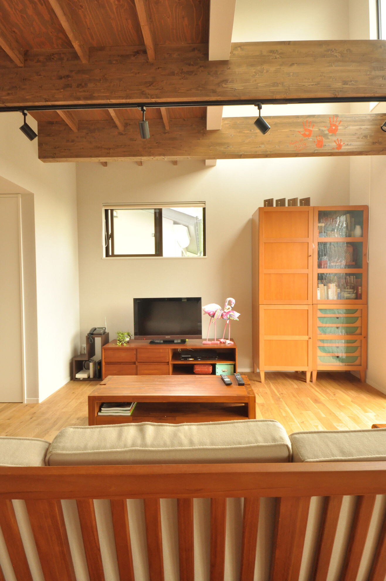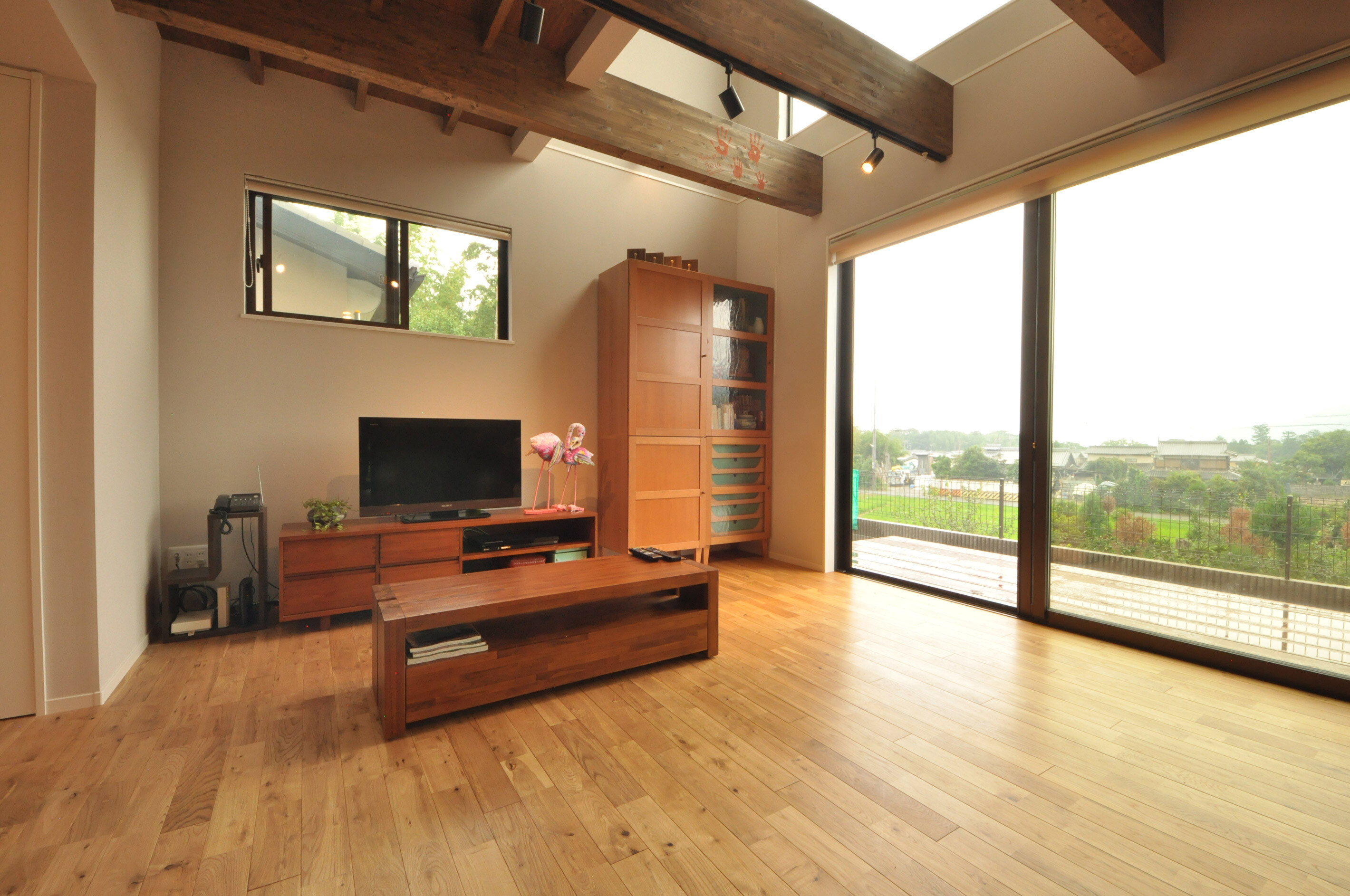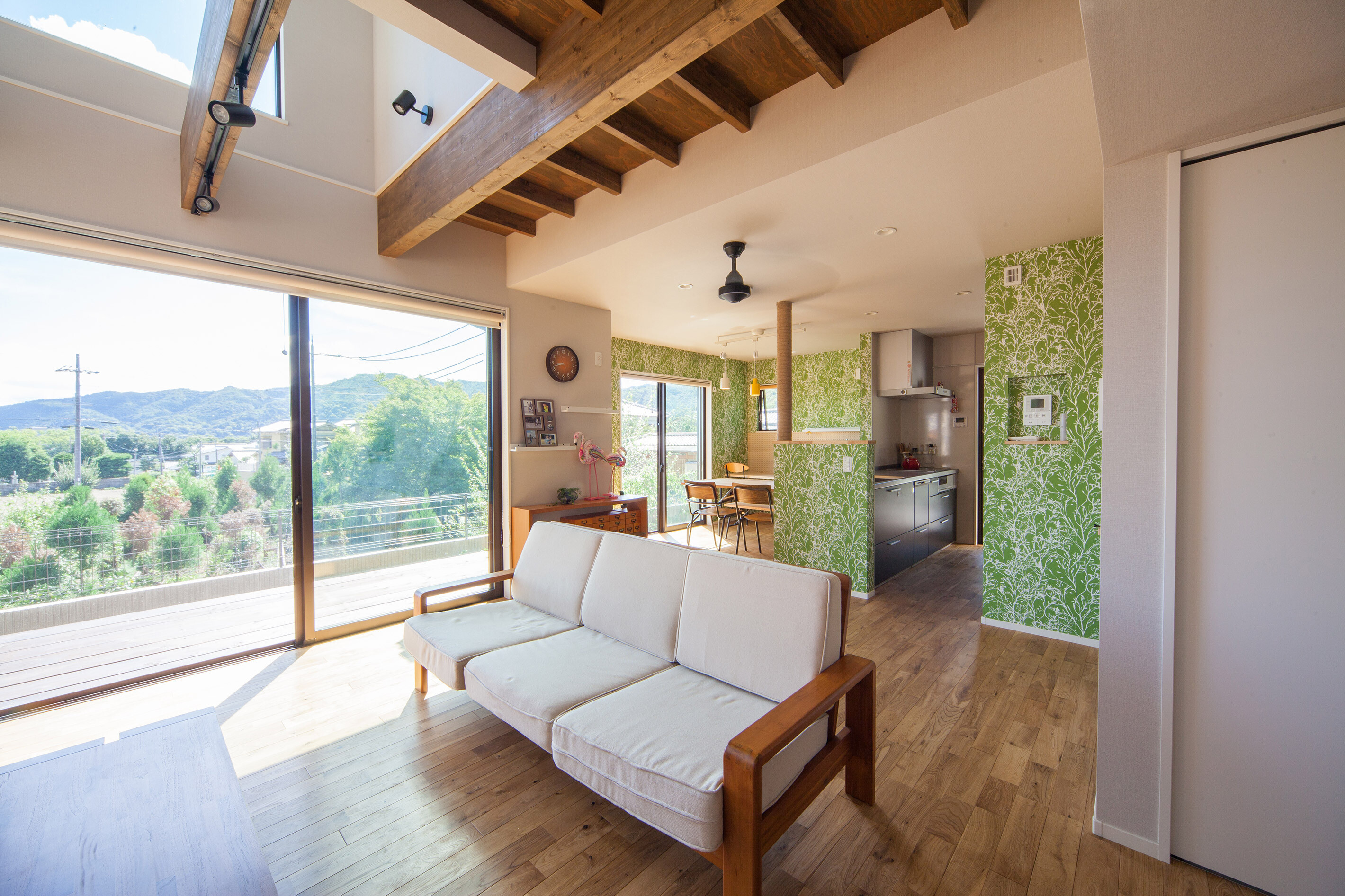 窓から広がる風景を十分に感じることが出来るように各部屋を適切に配置、光と風の流れる明るい家になりました。お気に入りの家具が空間に溶け込むように無駄なデザインを抑え、一部に造作の家具を製作し好きな小物と一体化しました。