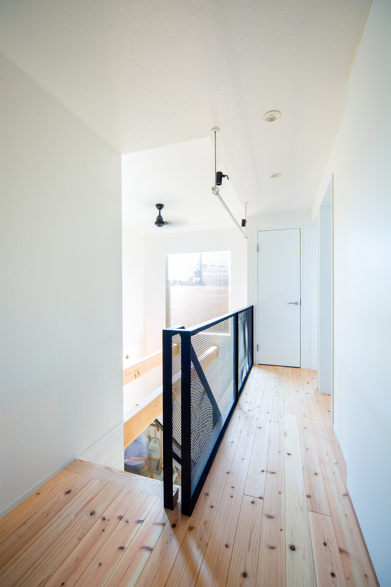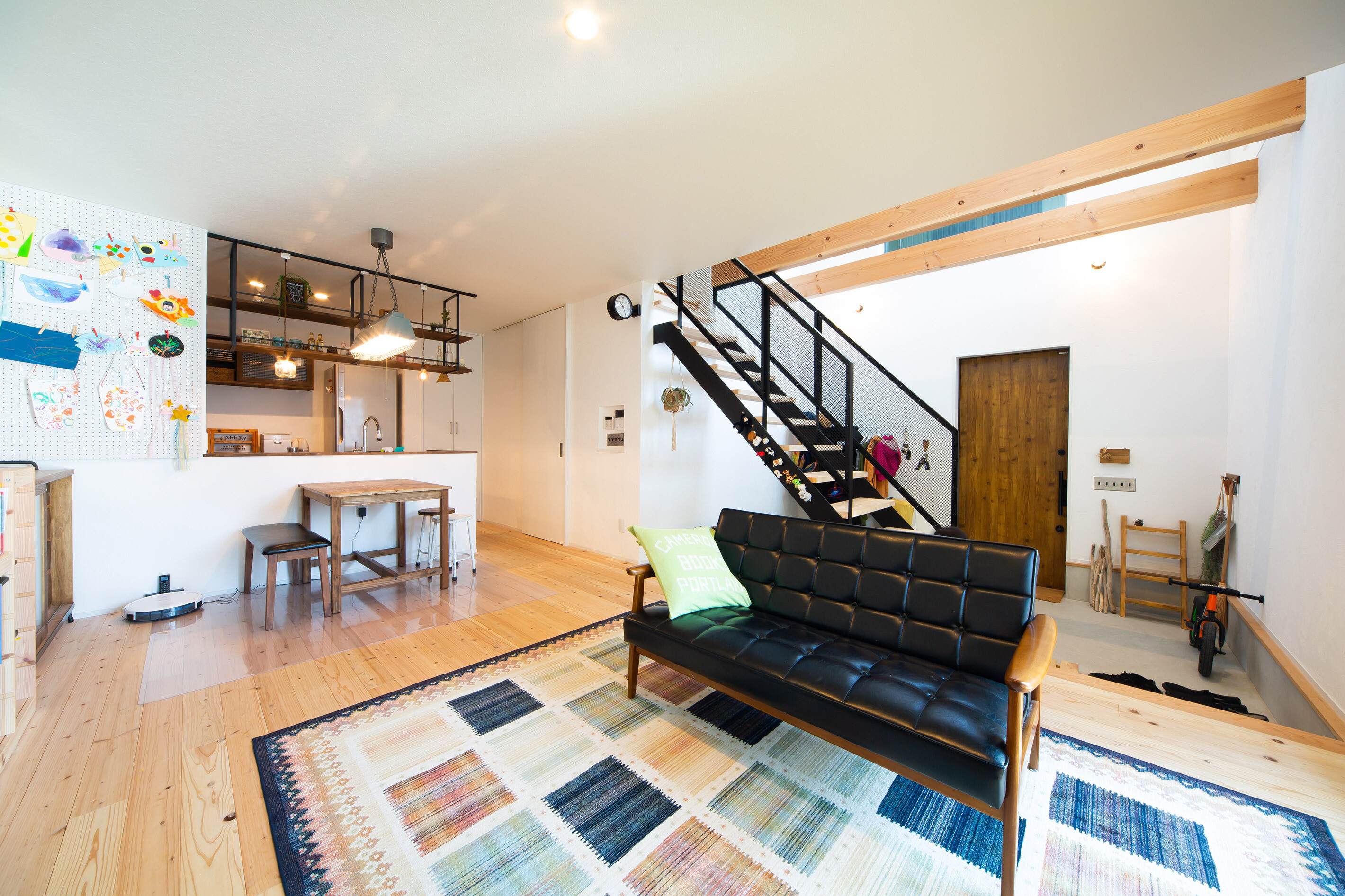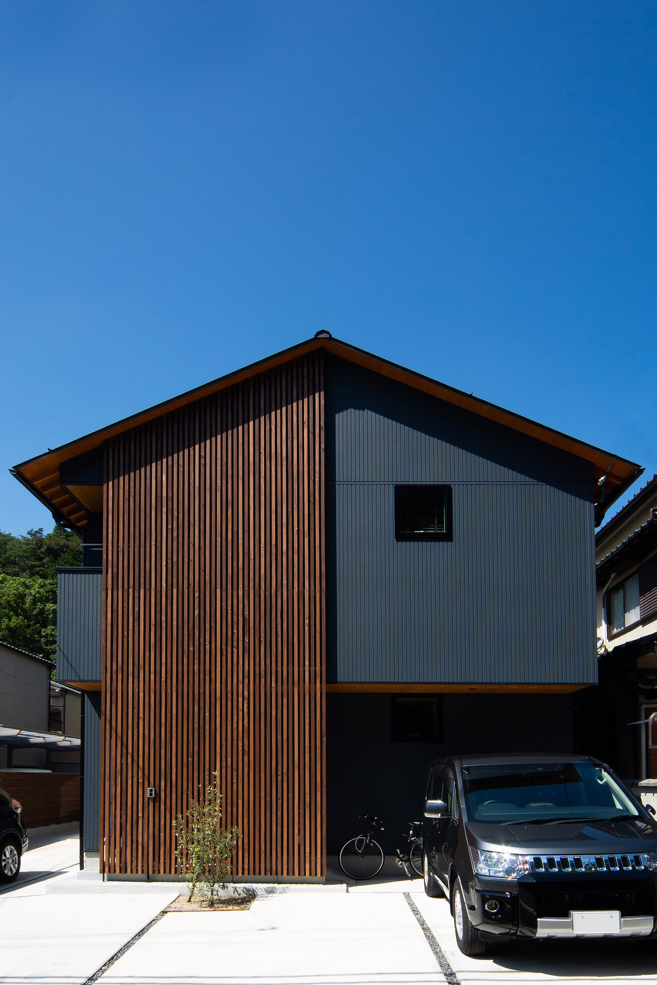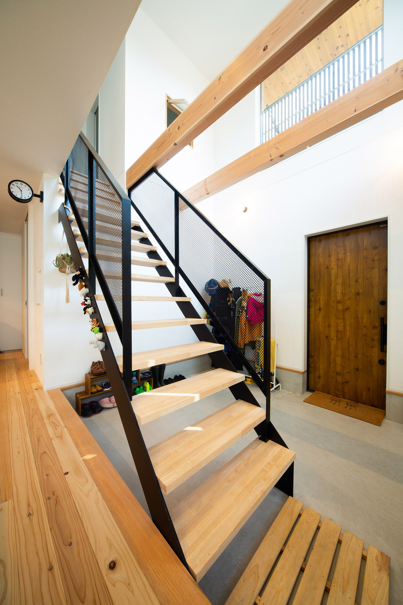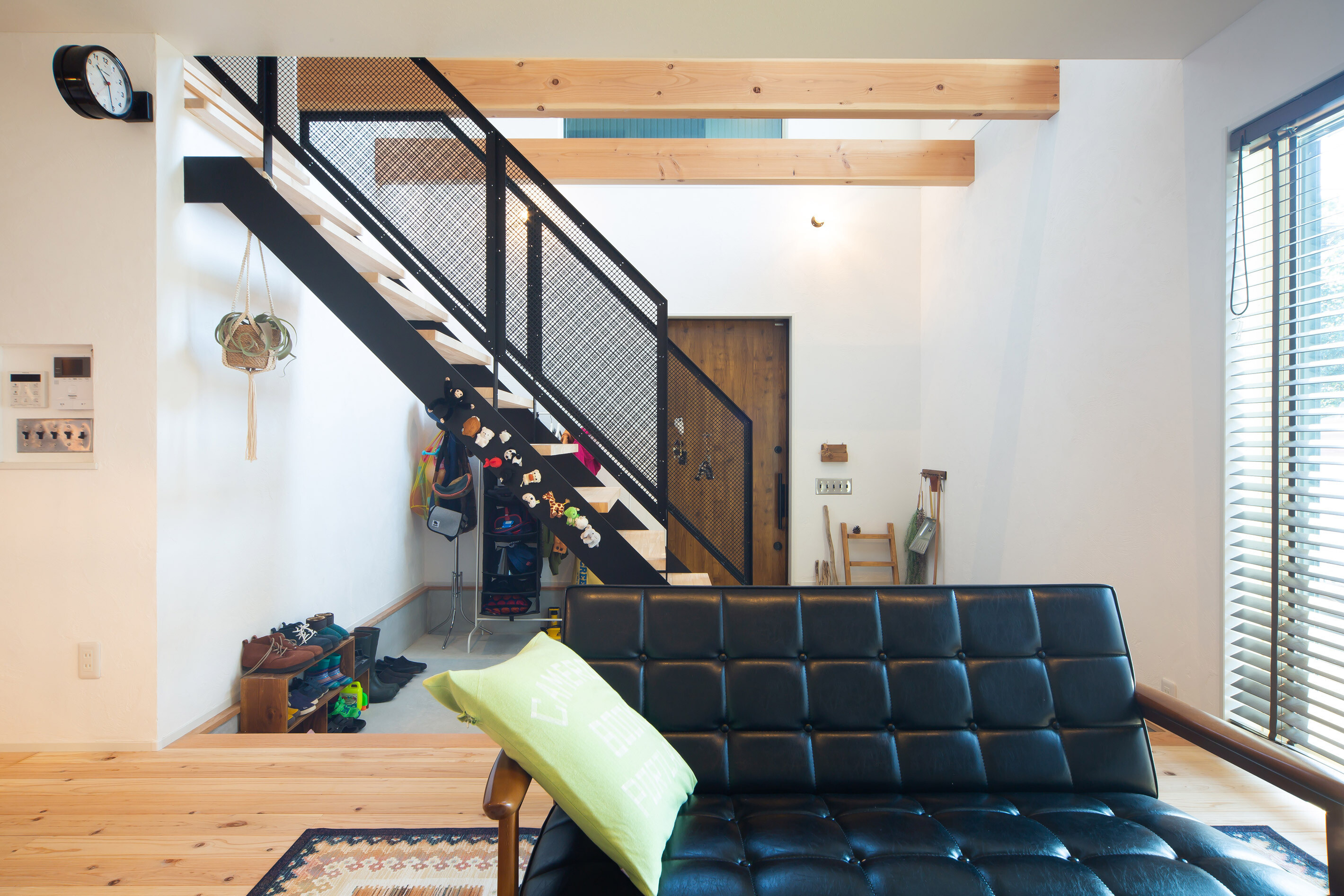 間口のある敷地に建つ住まい。道路に面する部分のプライバシー性に配慮しながらも明るく快適な空間に仕上げました。玄関土間とリビングの仕切りを無くし吹抜けの中にスケルトン階段を配置することで開放的でデザイン性のある内部構成となっています。