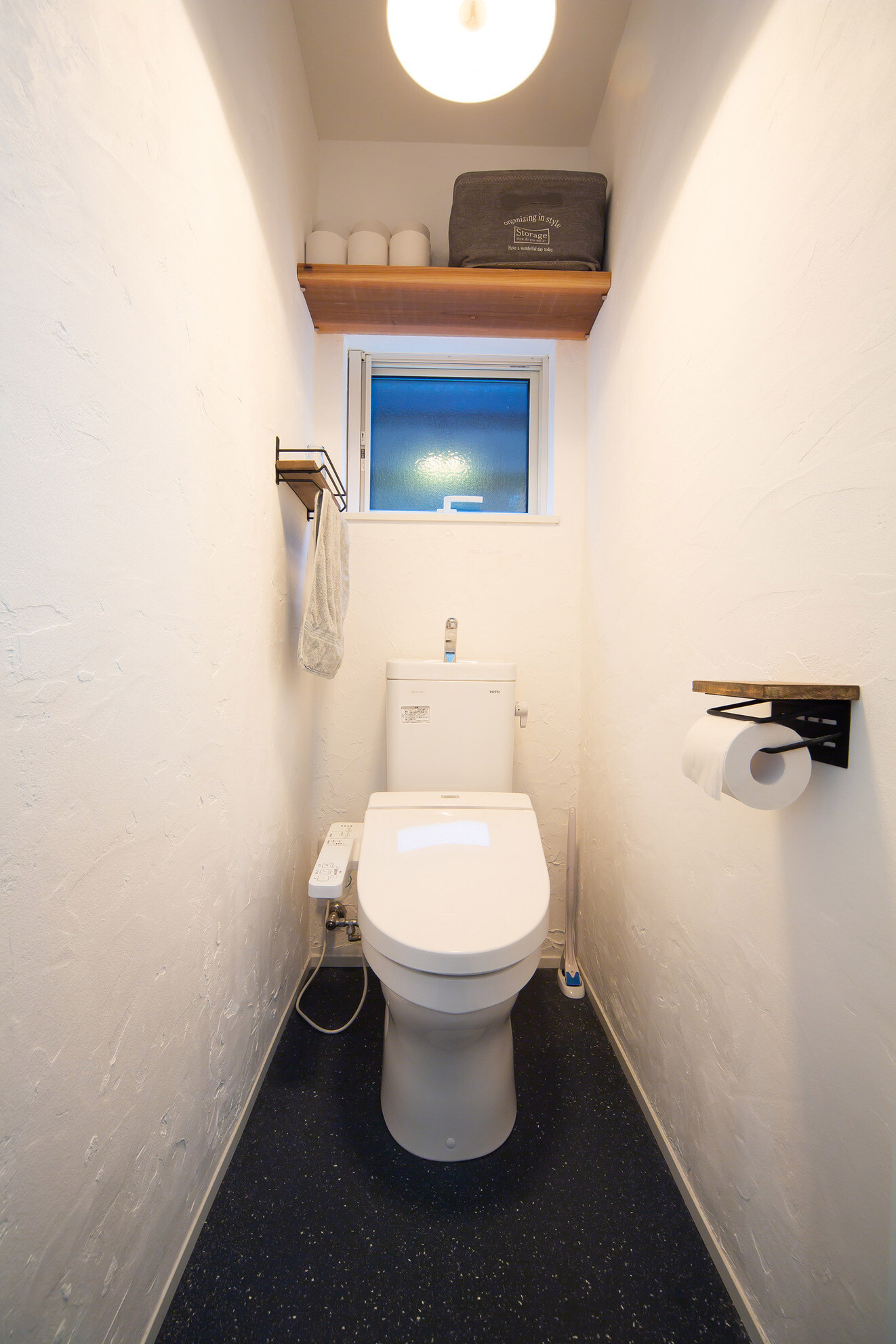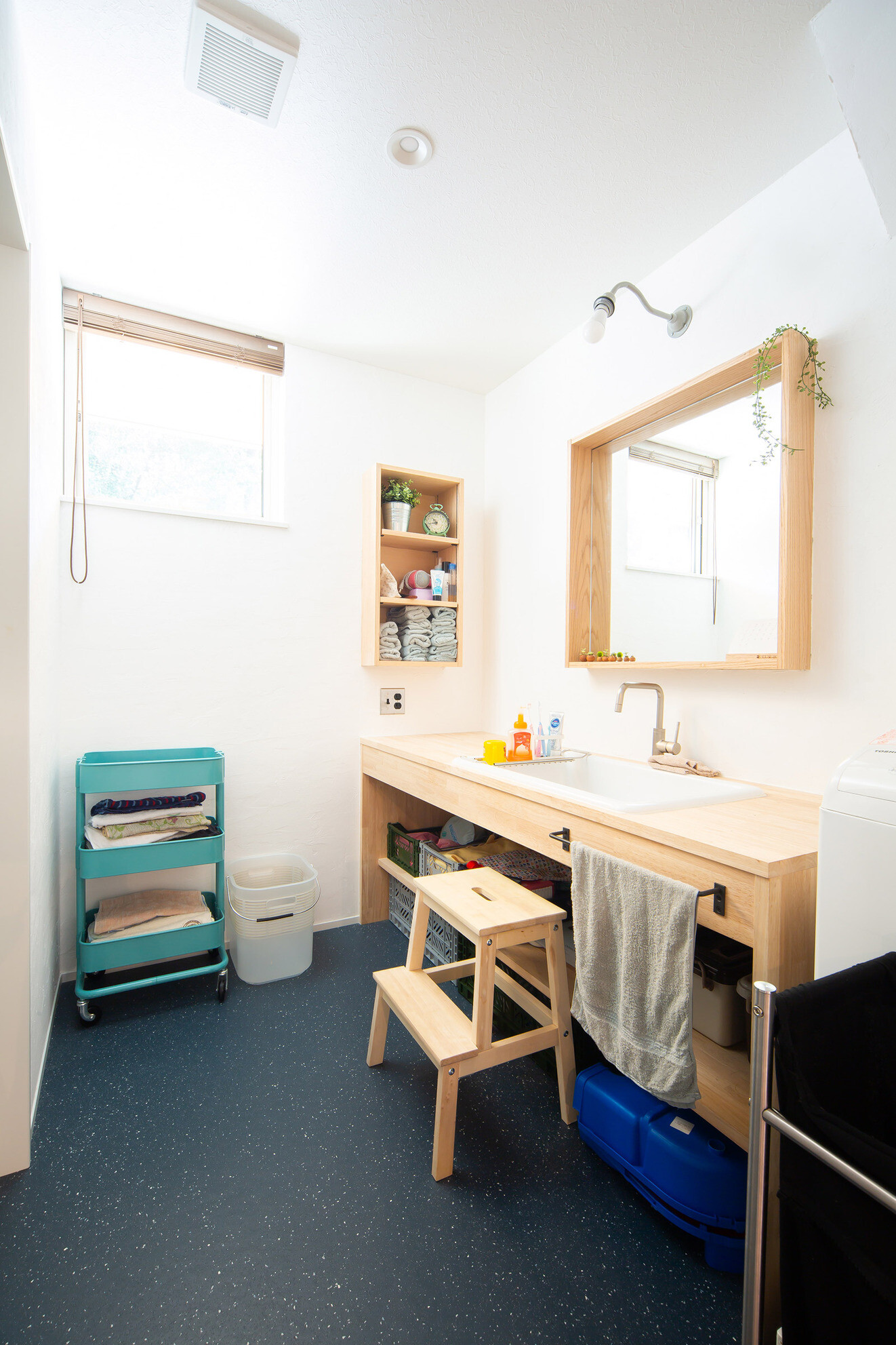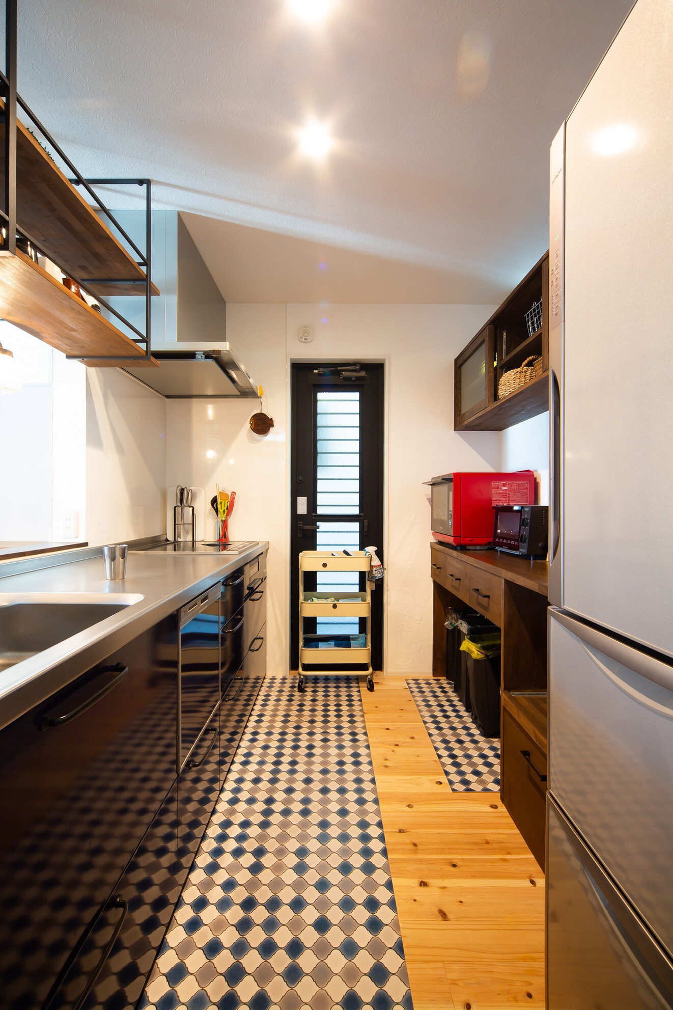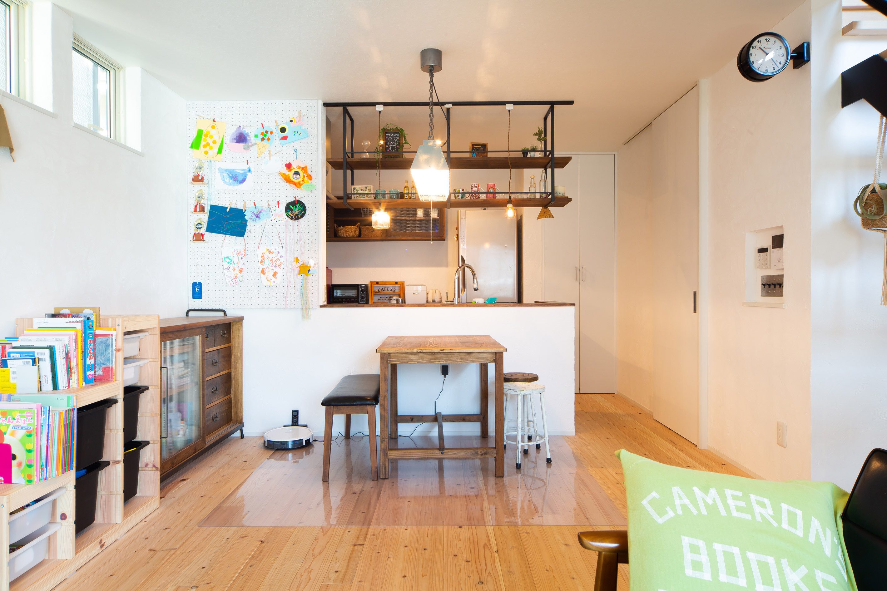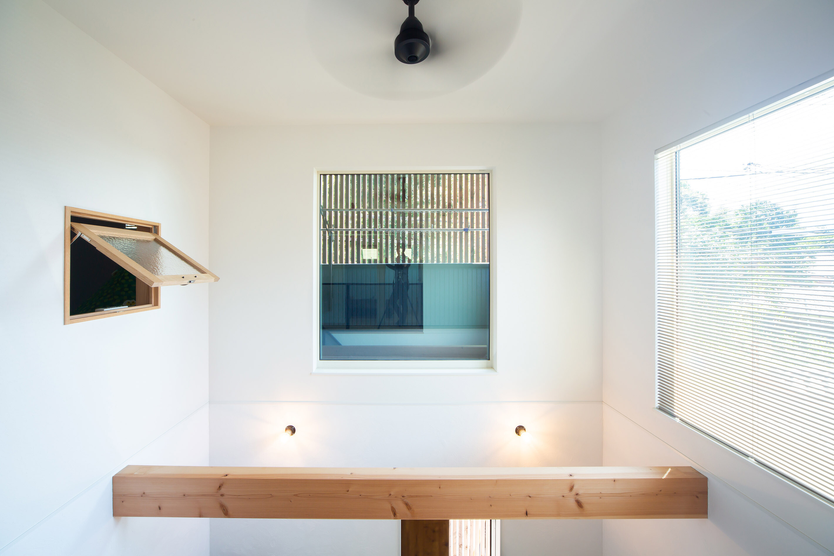 間口のある敷地に建つ住まい。道路に面する部分のプライバシー性に配慮しながらも明るく快適な空間に仕上げました。玄関土間とリビングの仕切りを無くし吹抜けの中にスケルトン階段を配置することで開放的でデザイン性のある内部構成となっています。